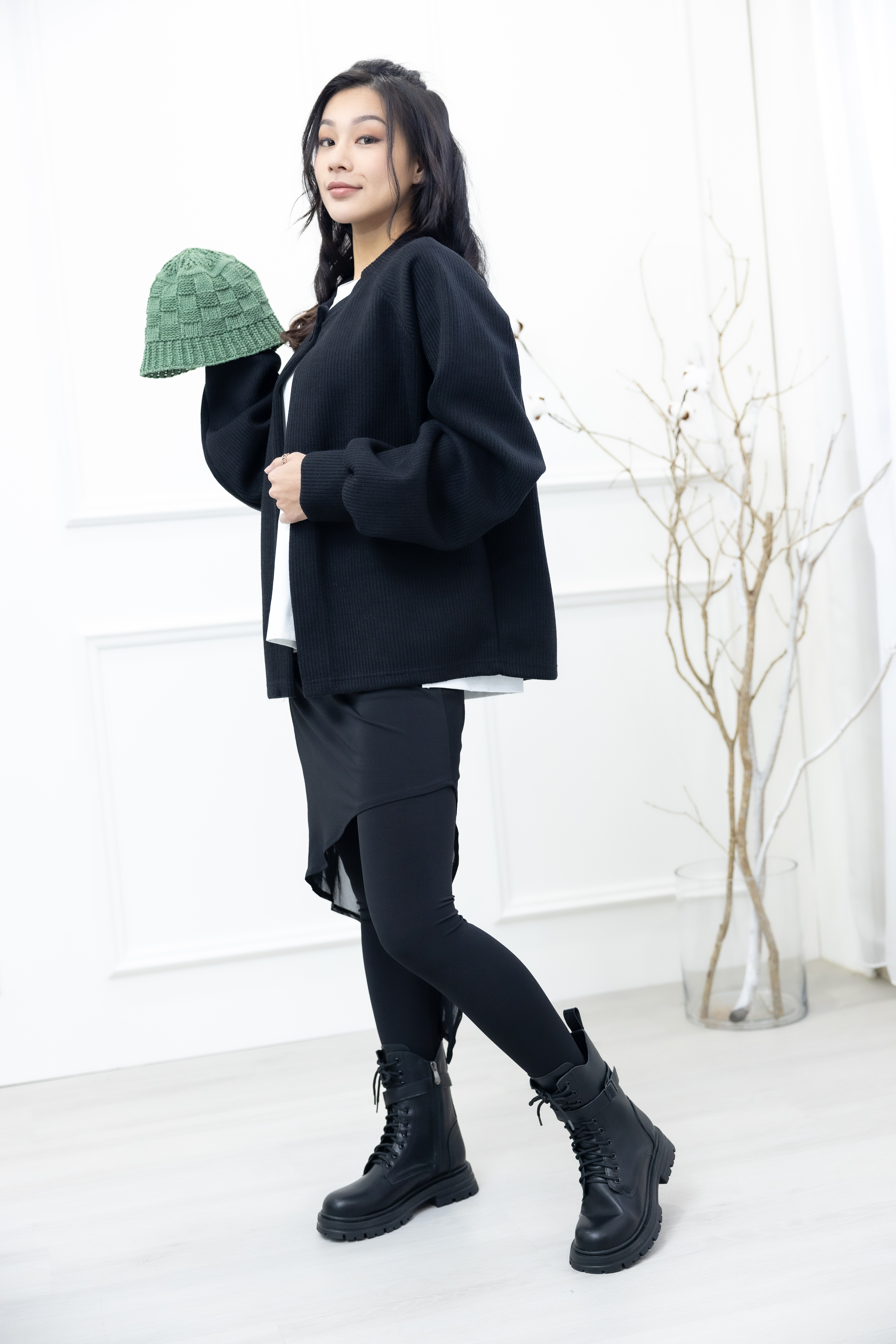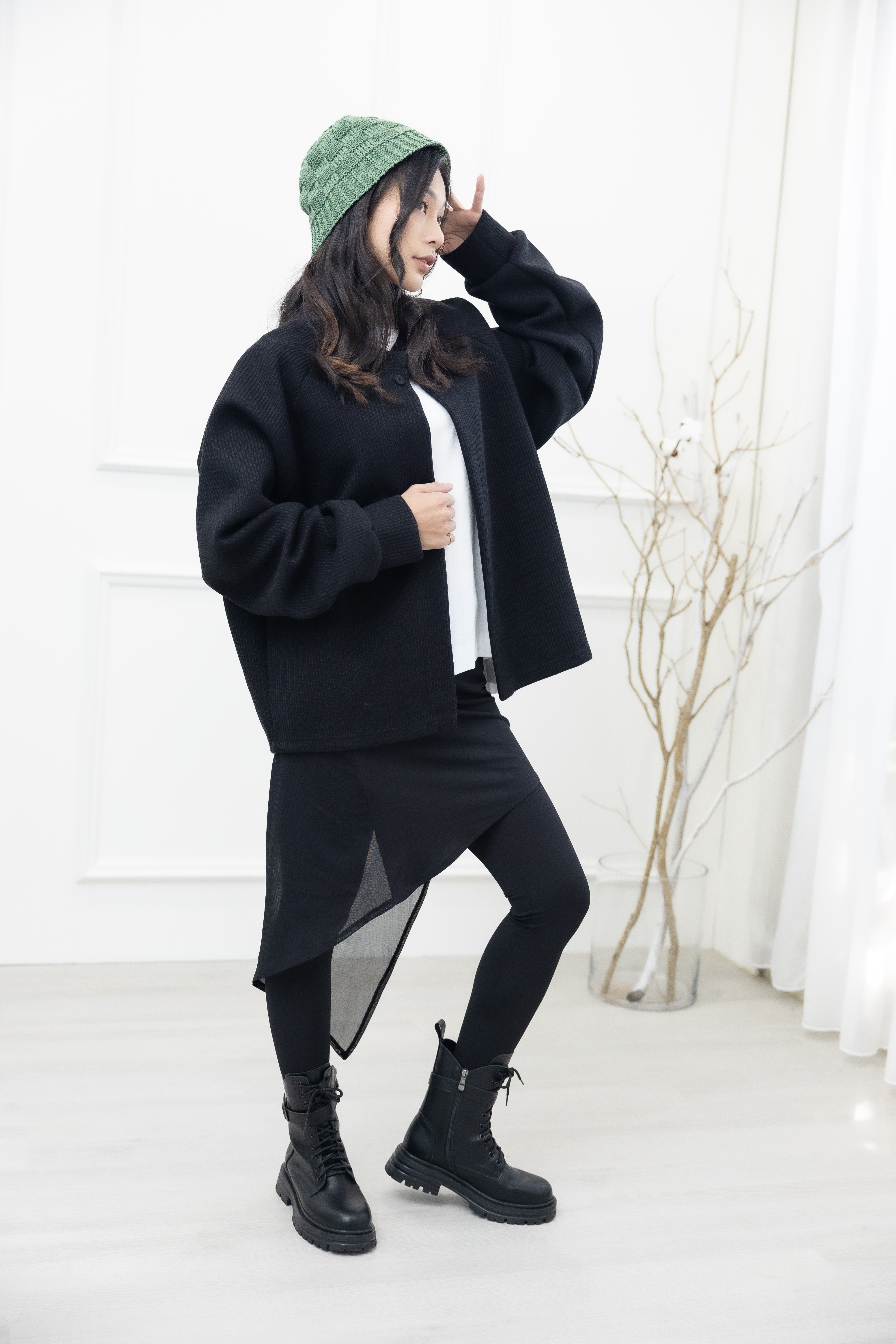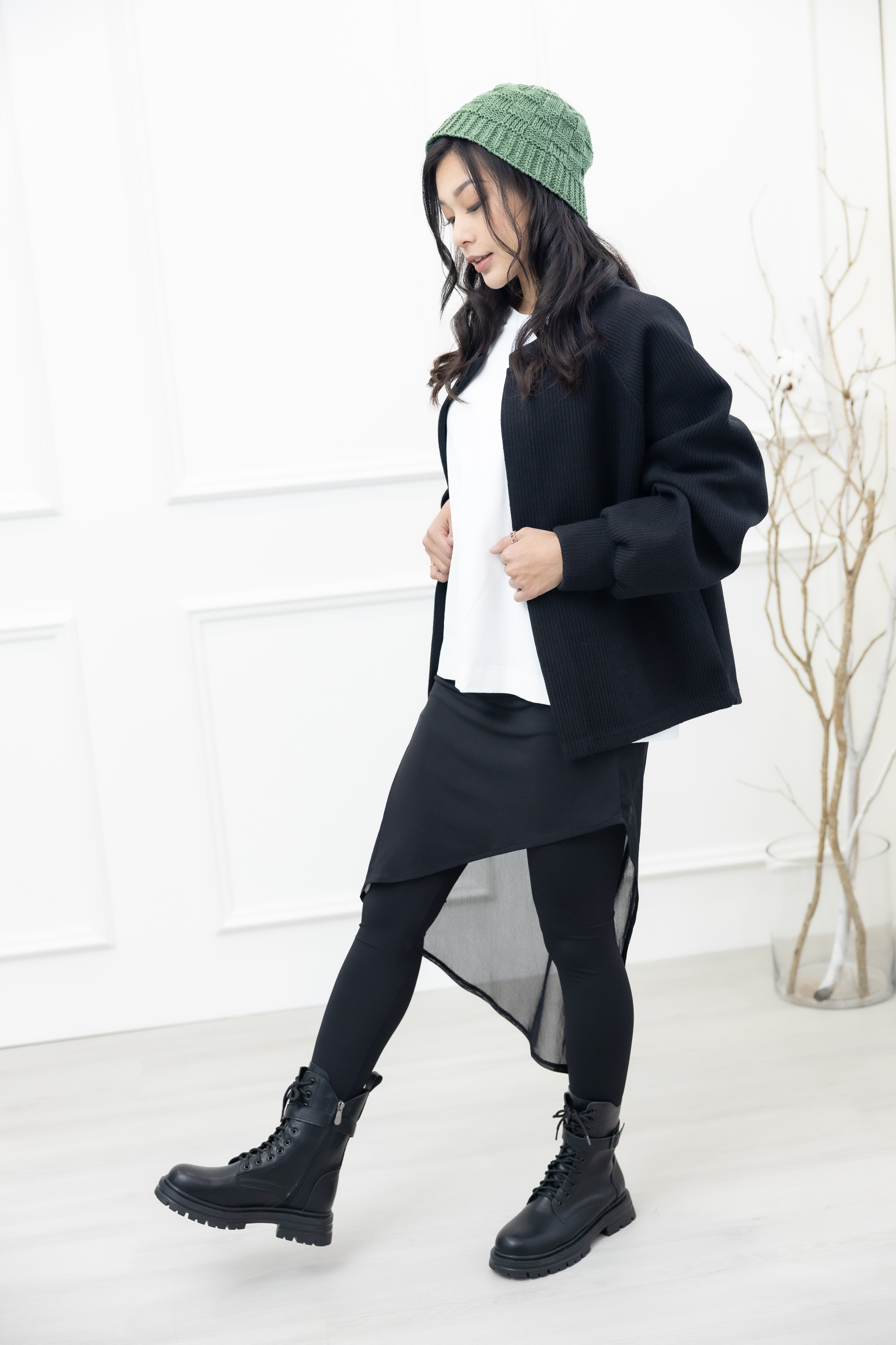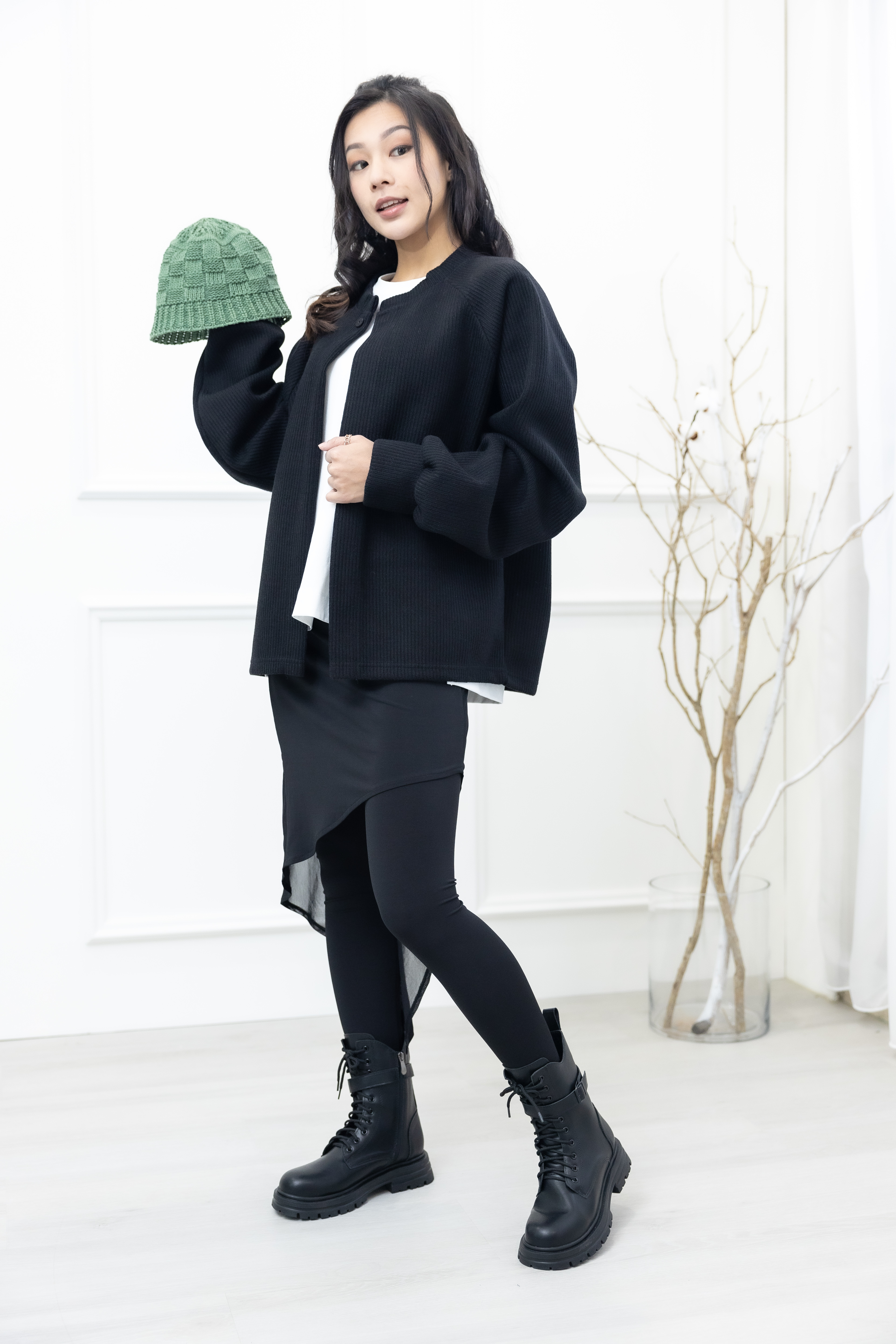 긴 바지 假2件不規則紗裙彈性褲 /黑色