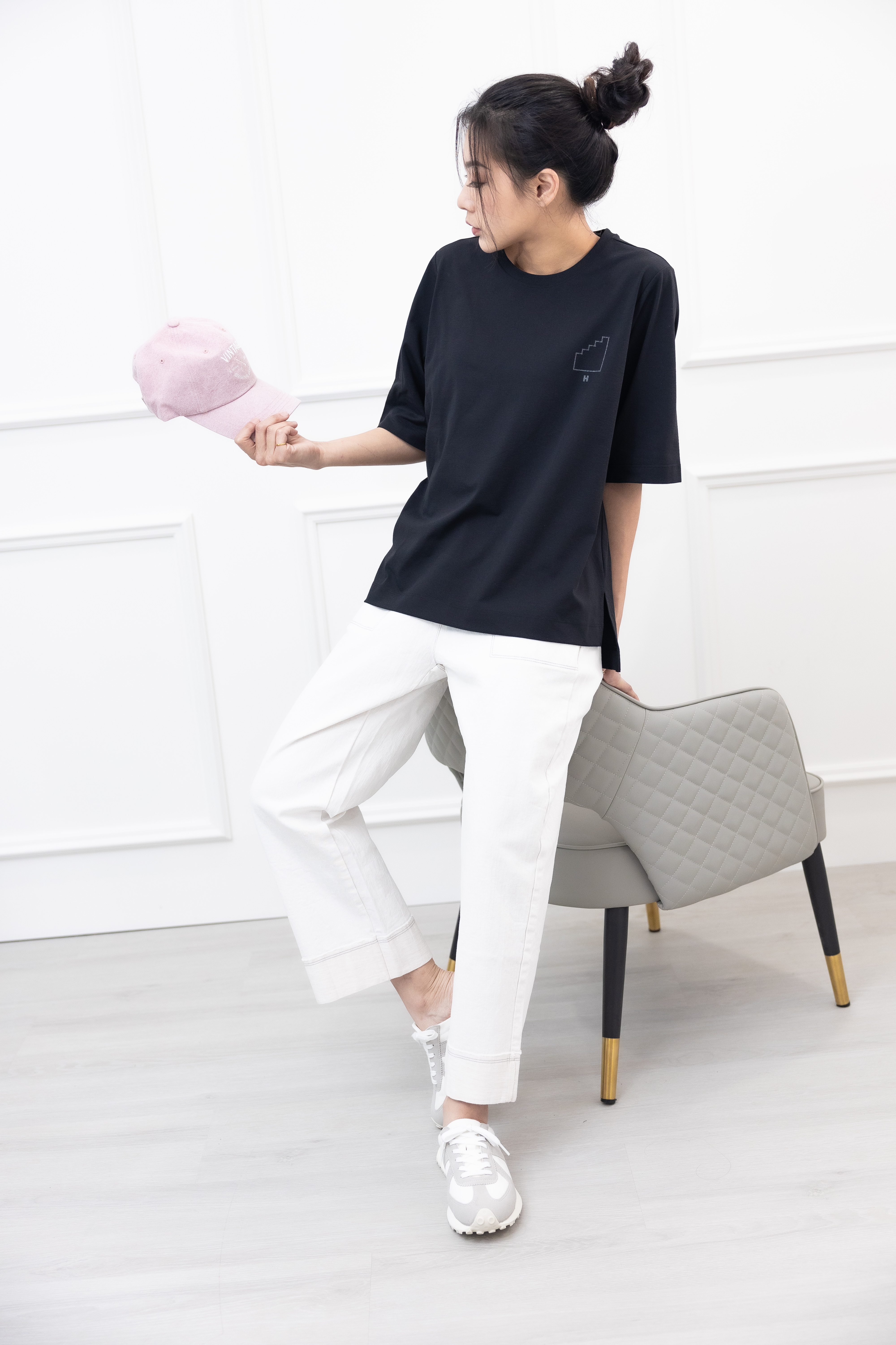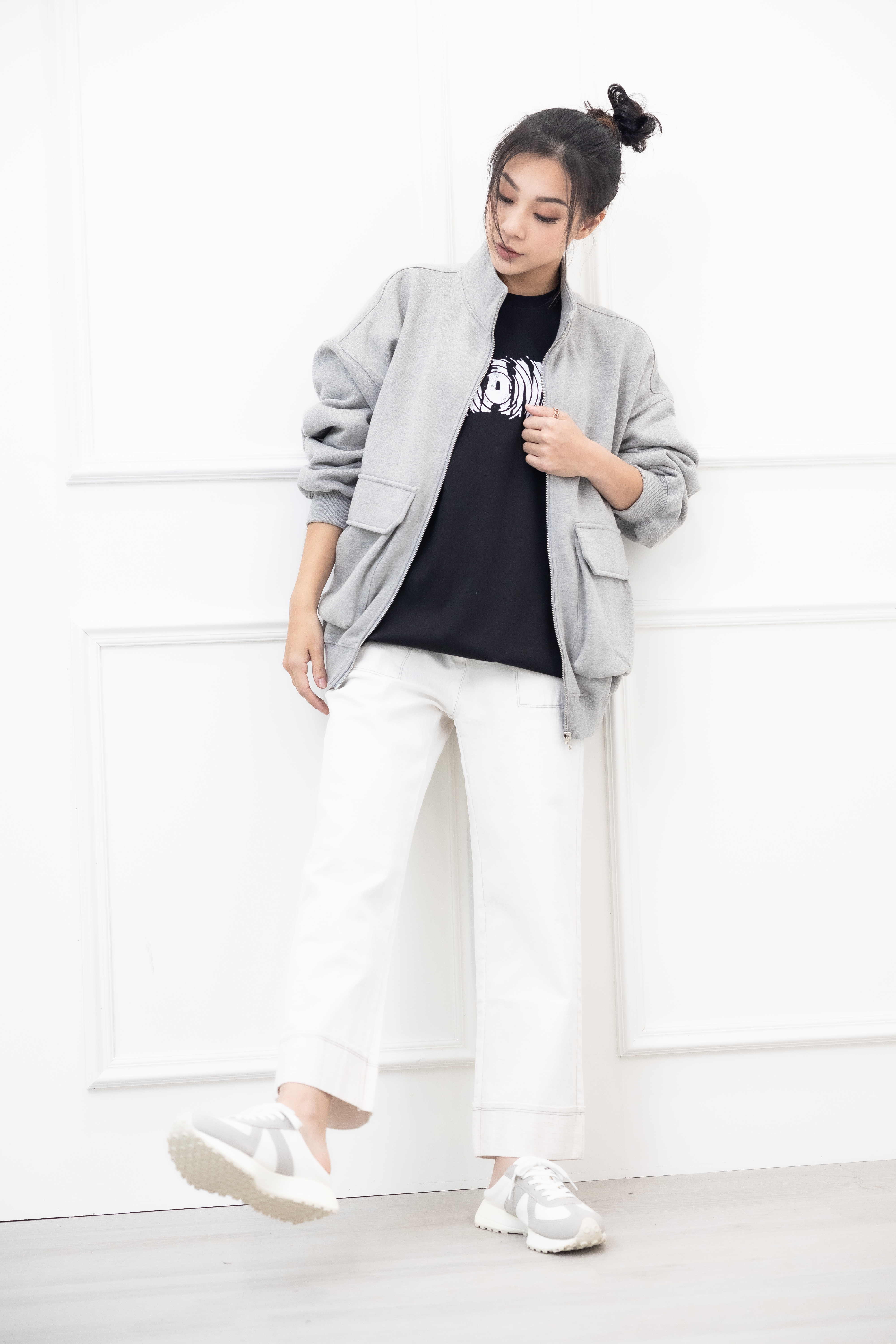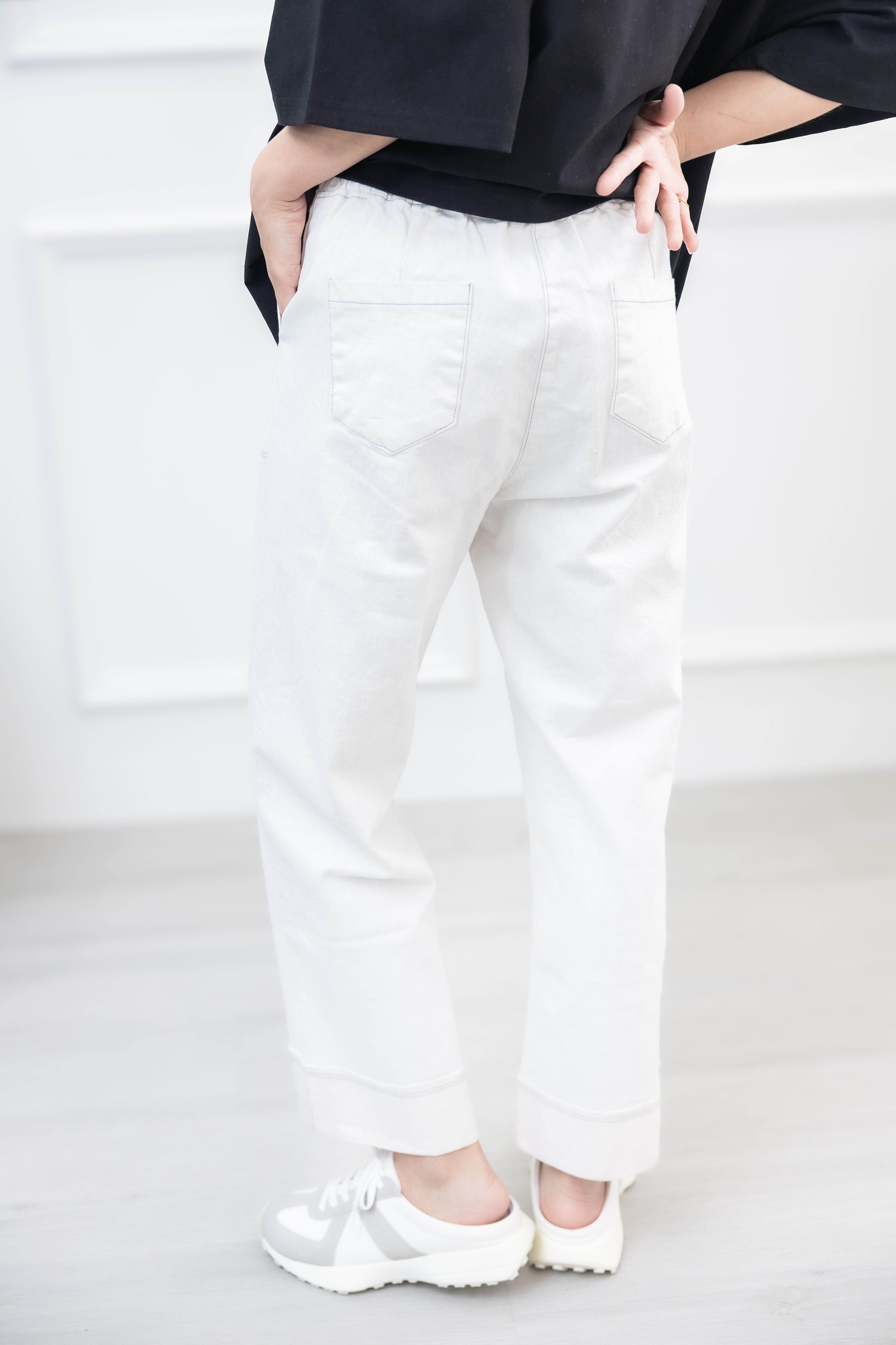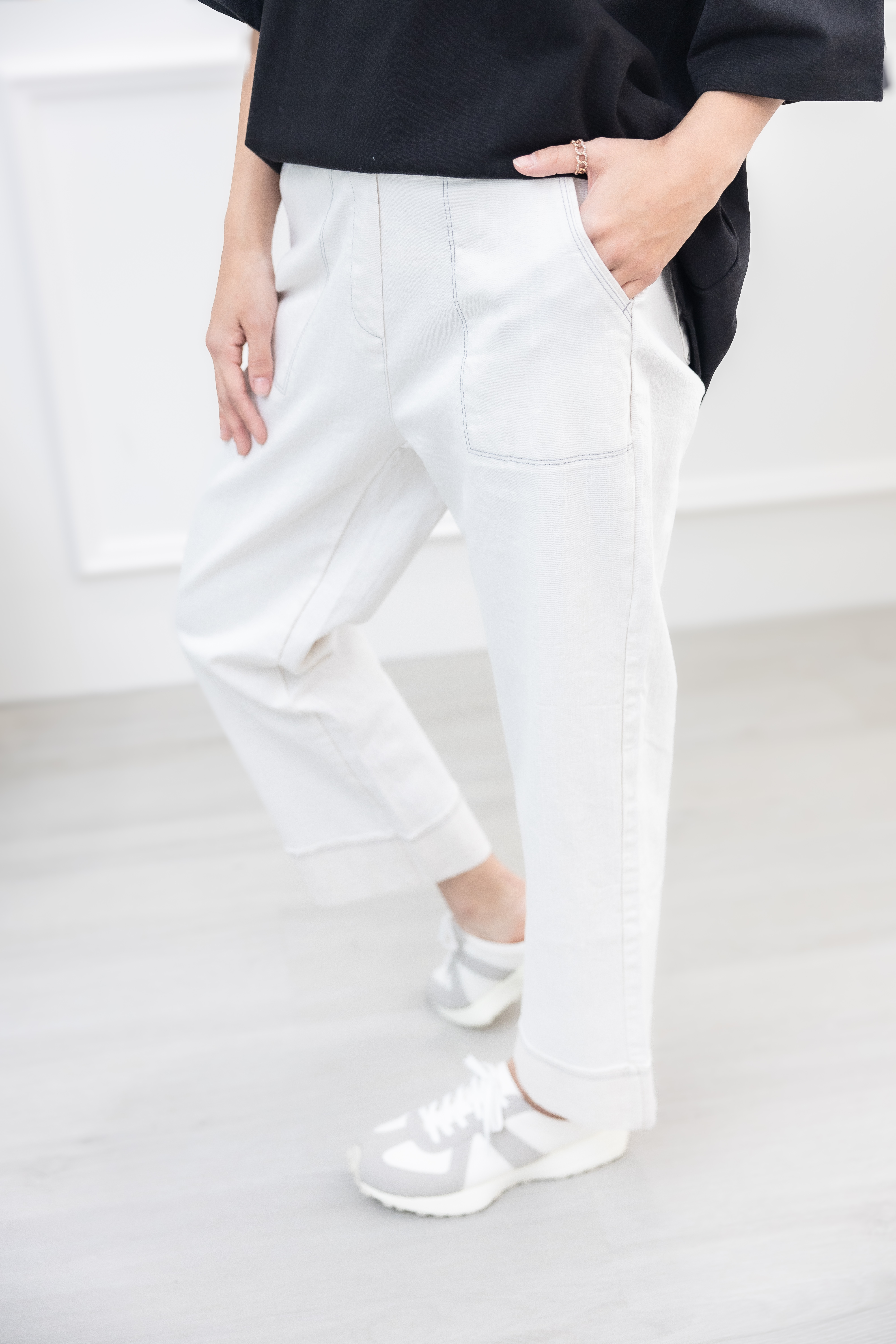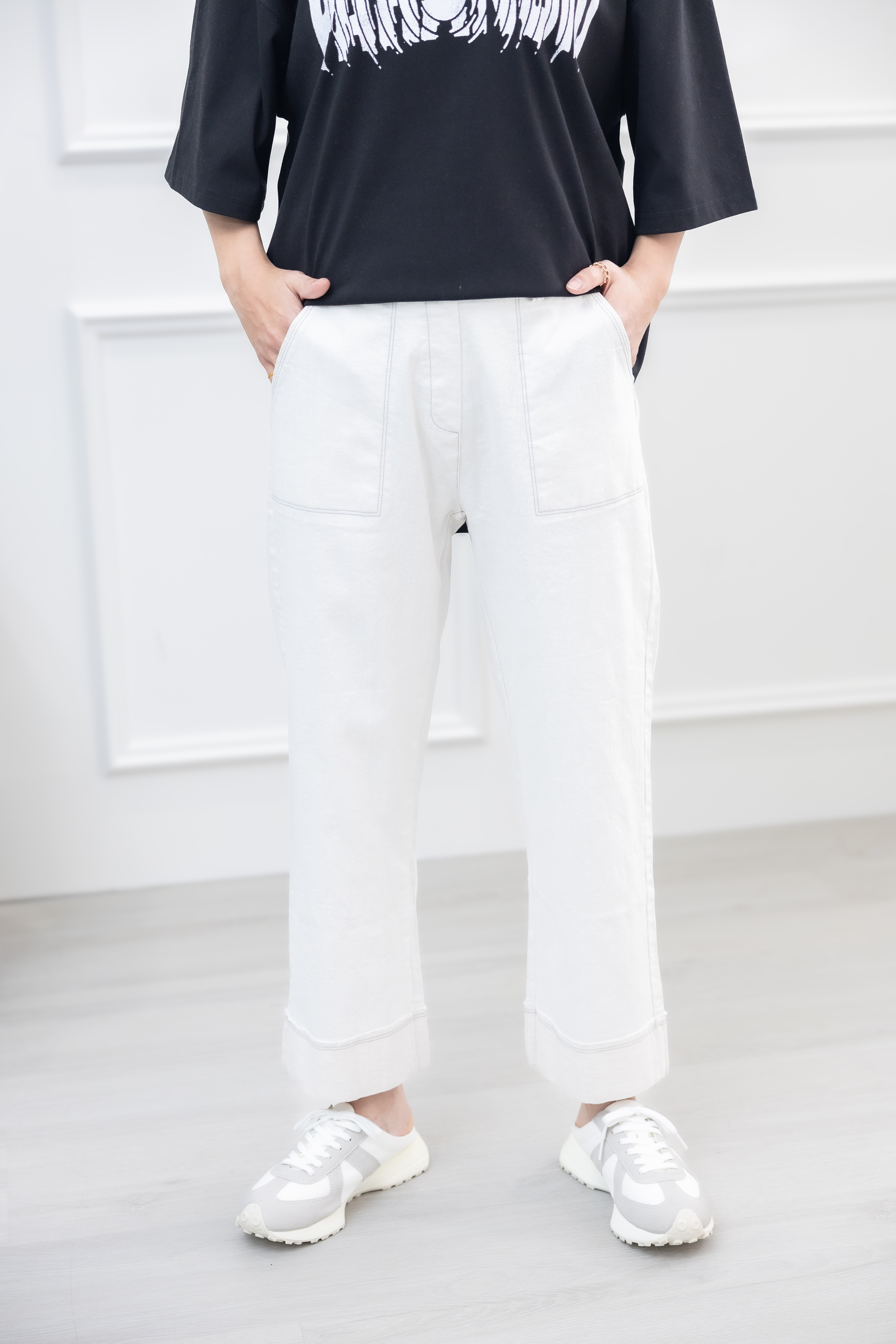 긴 바지 大口袋反摺褲腳牛仔長褲 / 水洗白