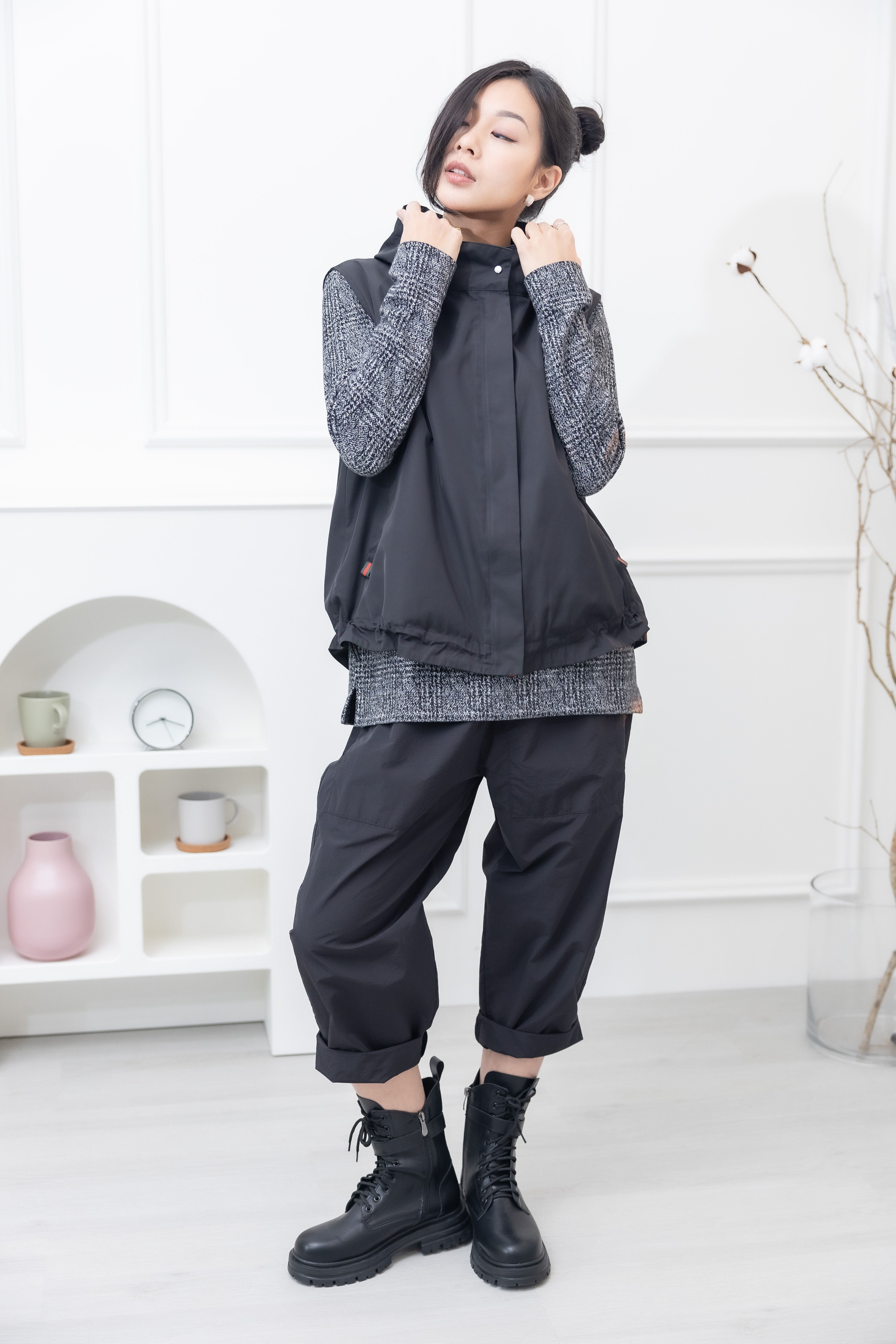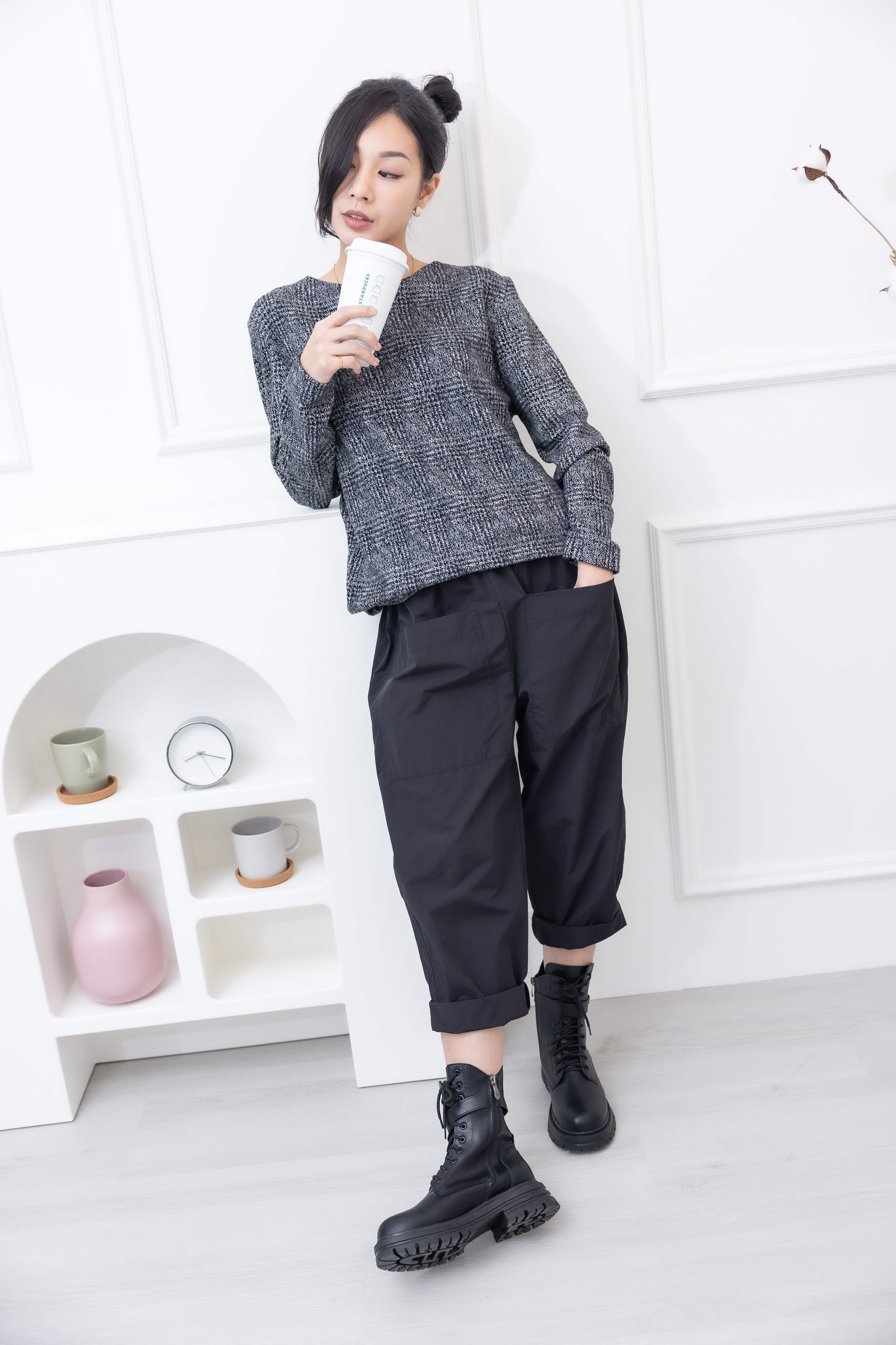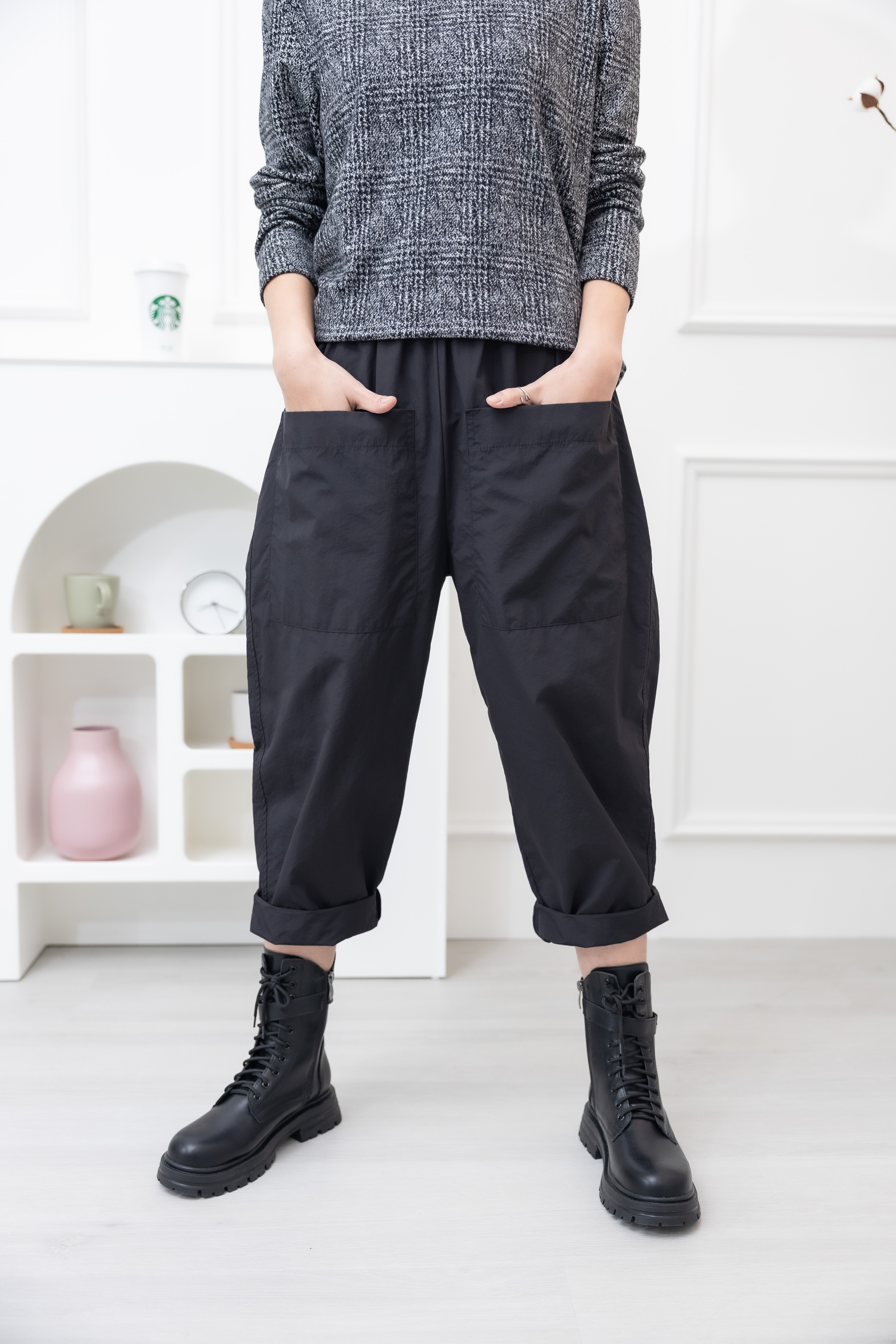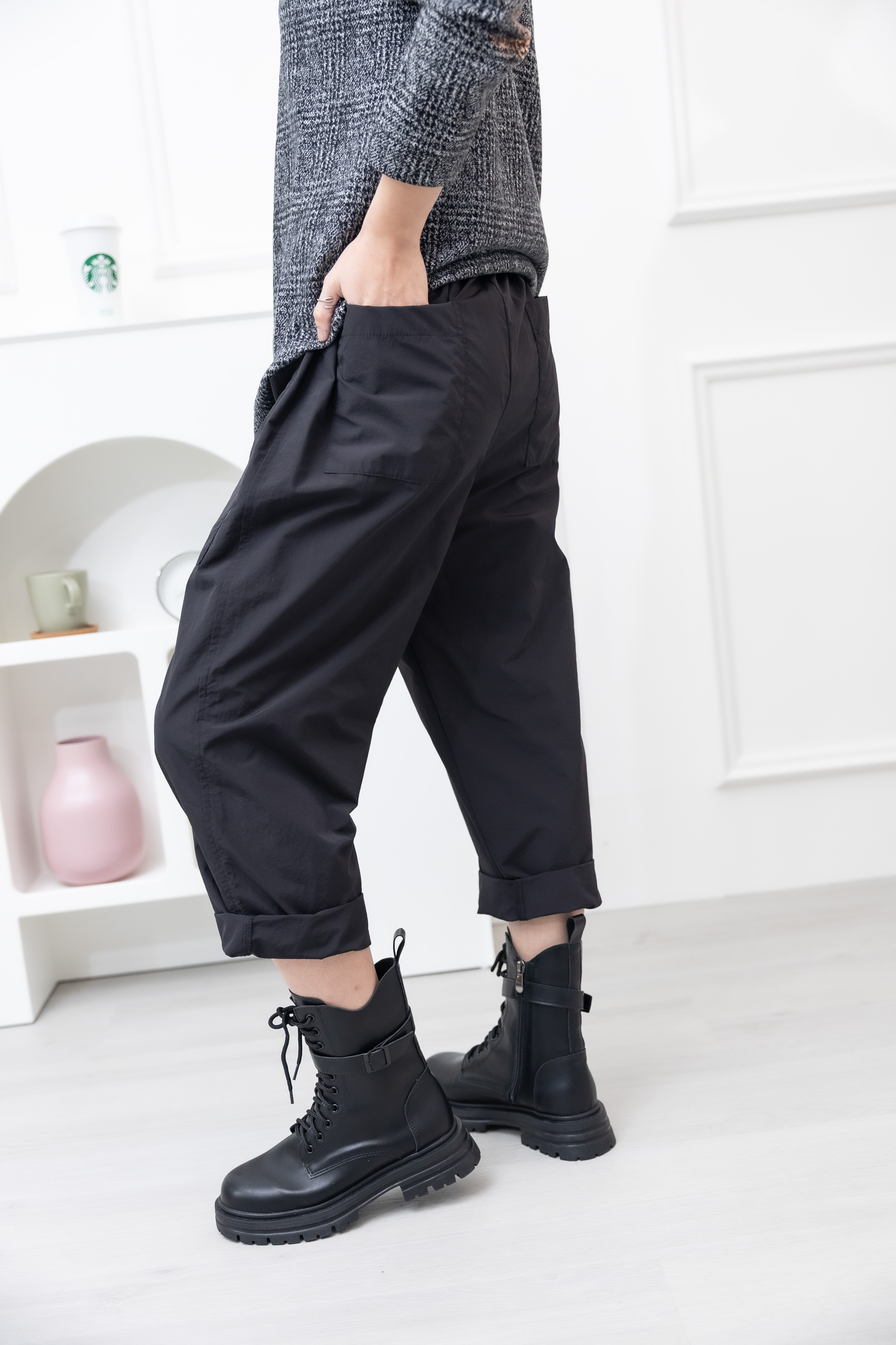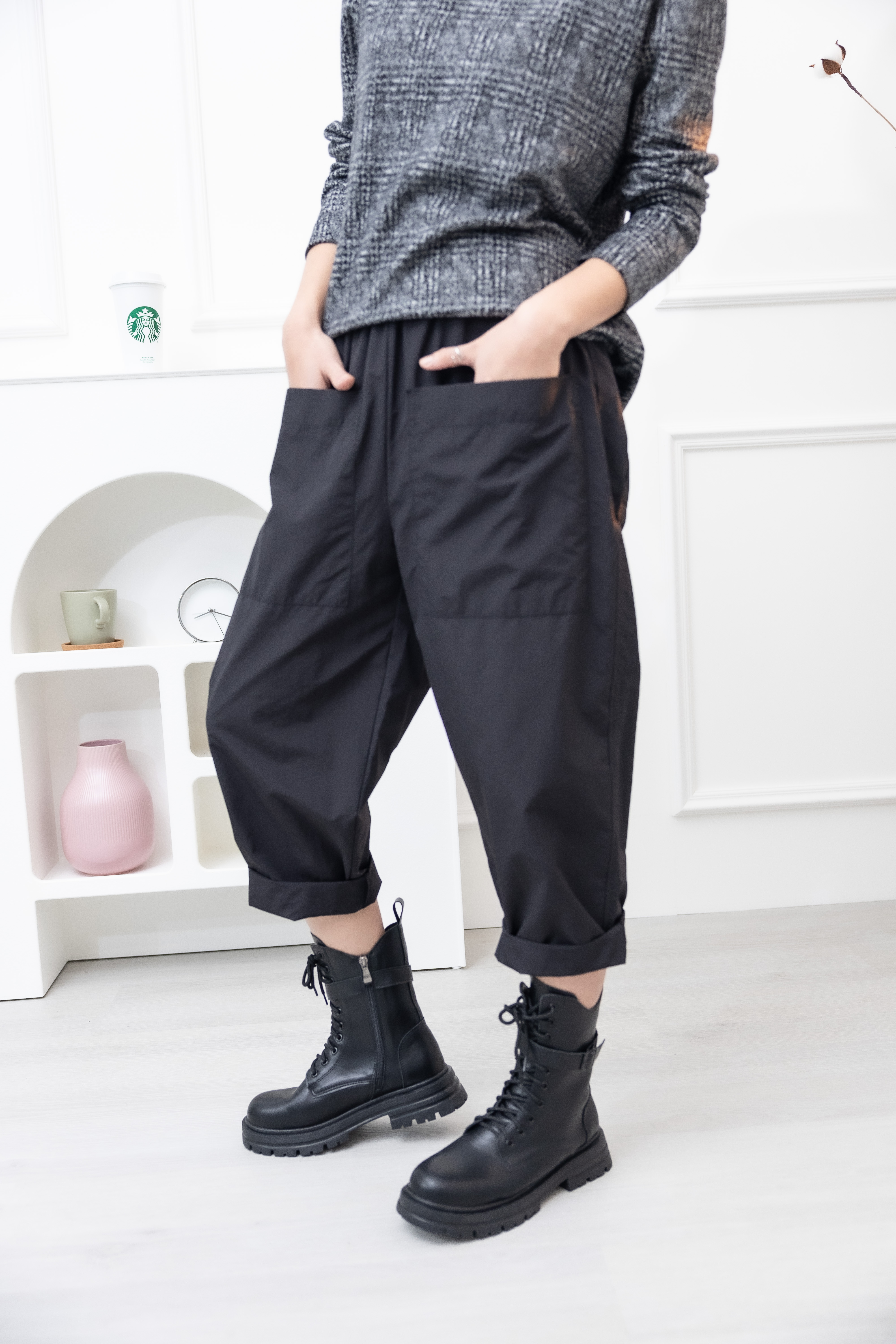 긴 바지 大口袋繭型寬鬆長褲 / 黑色