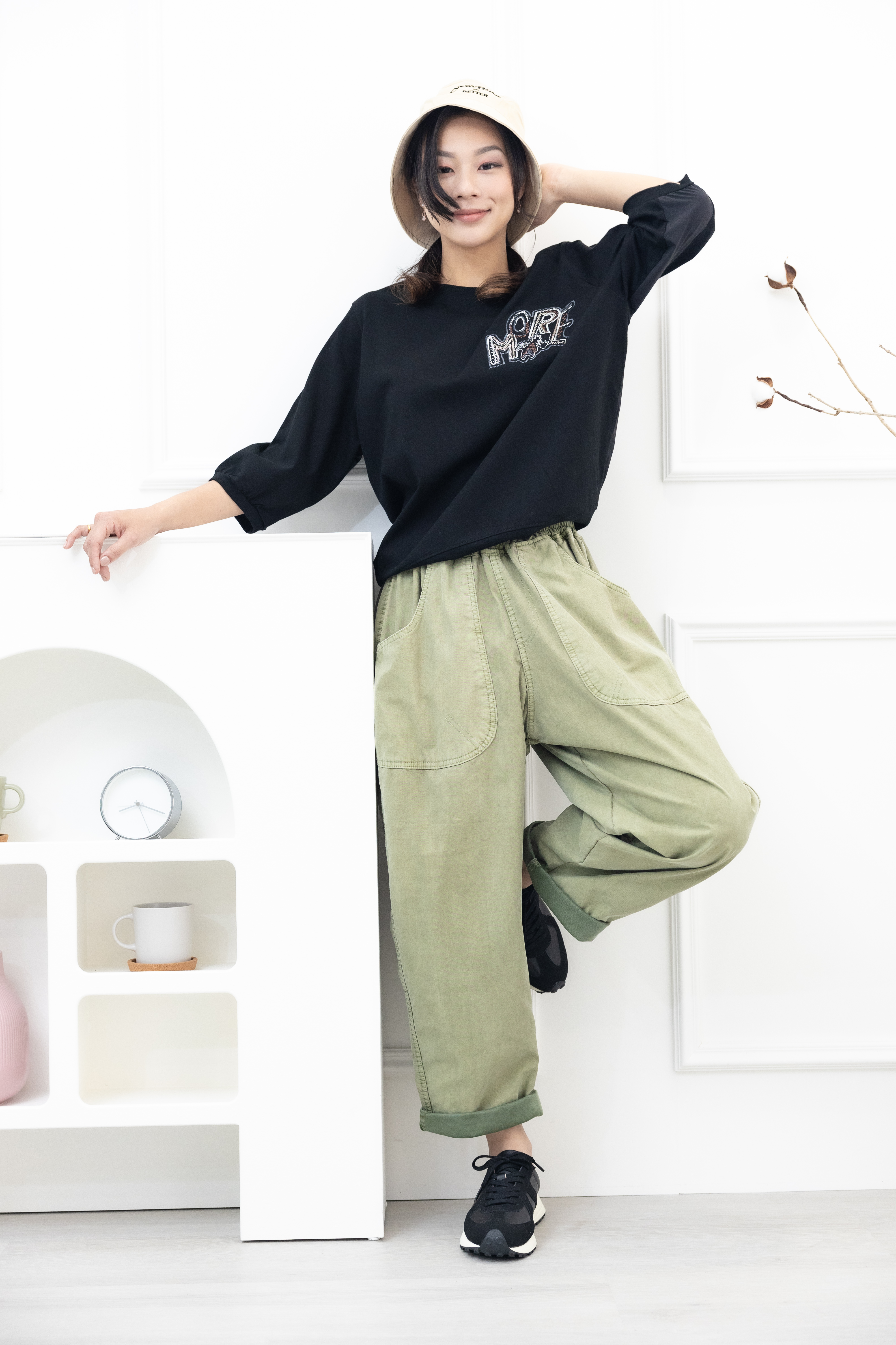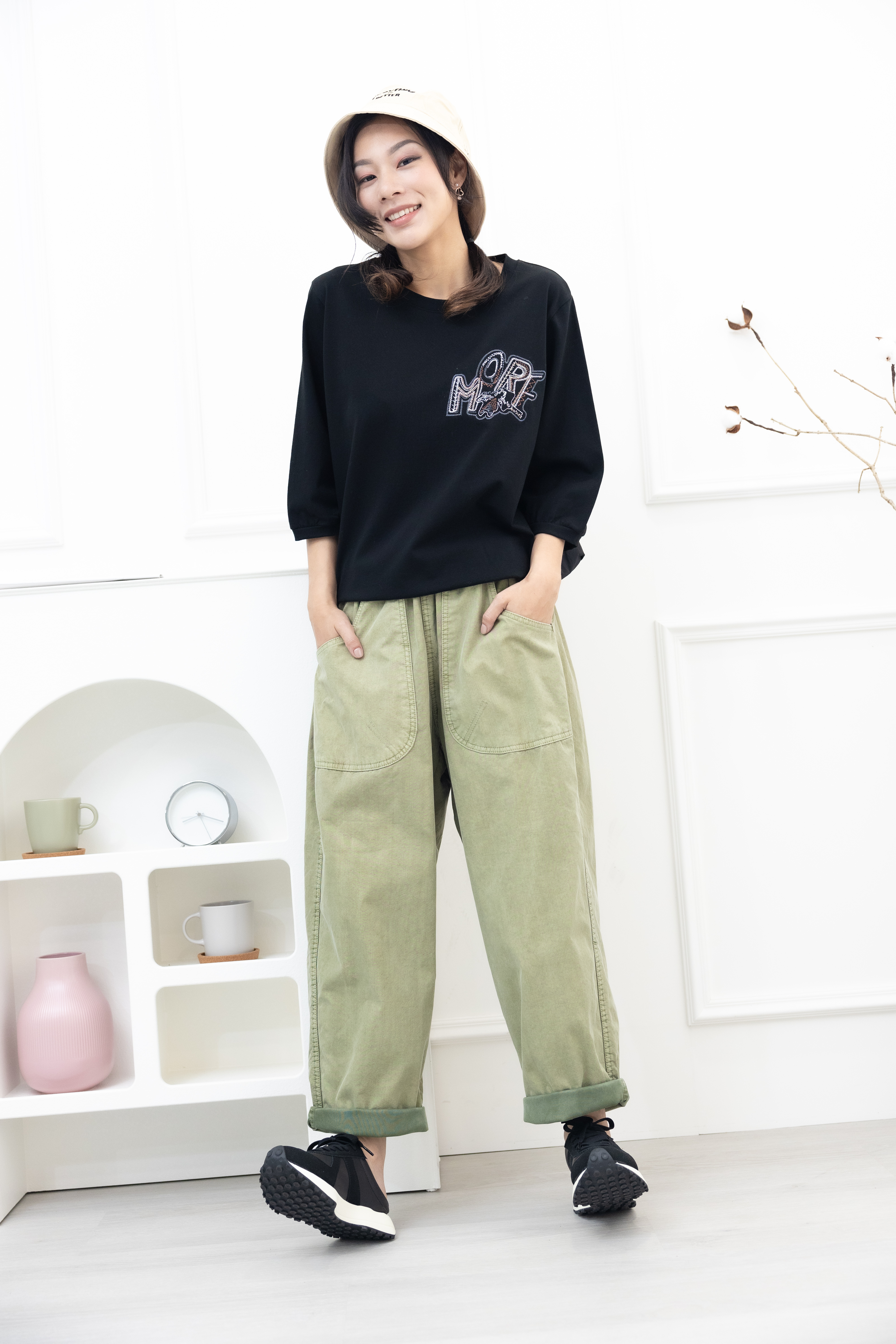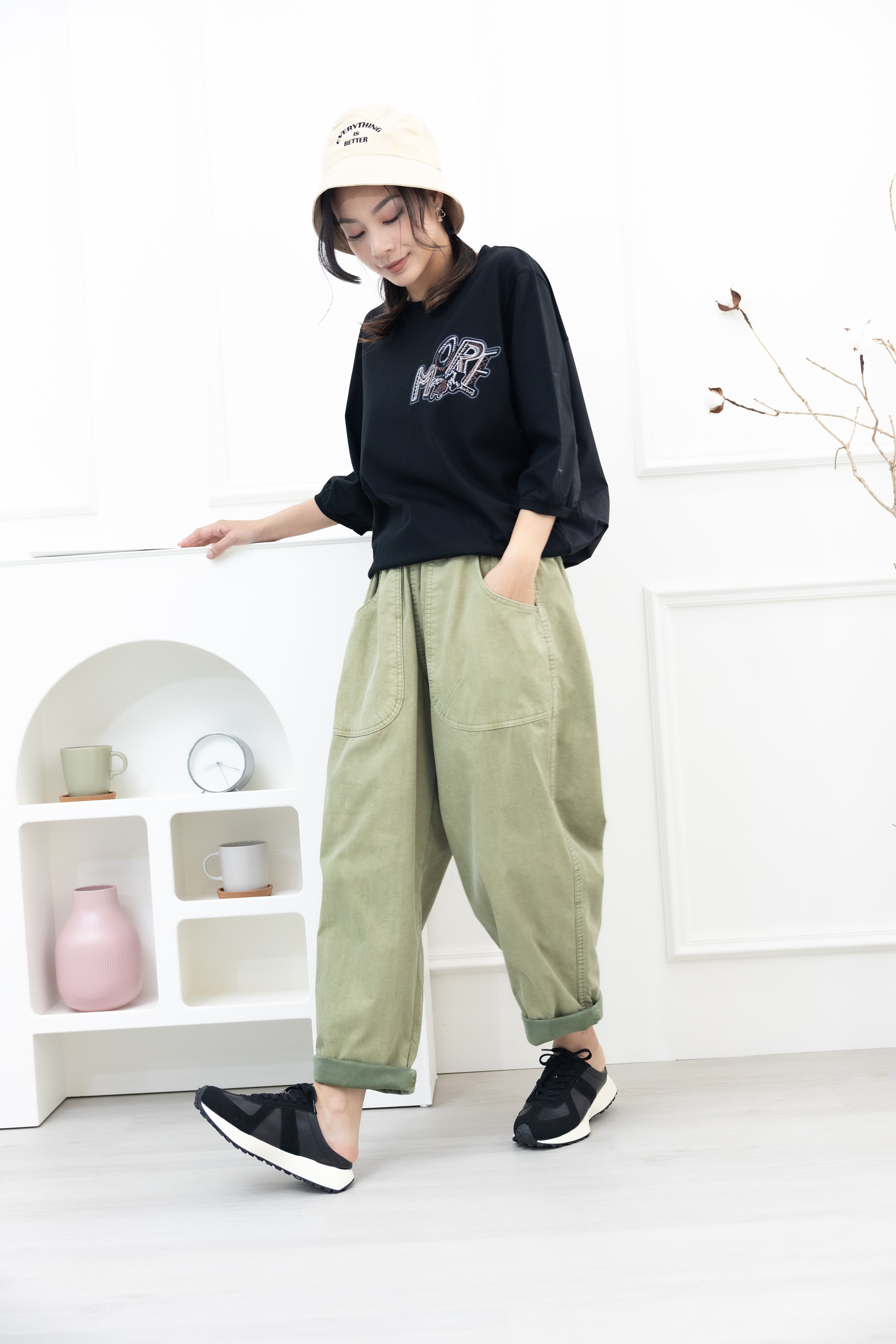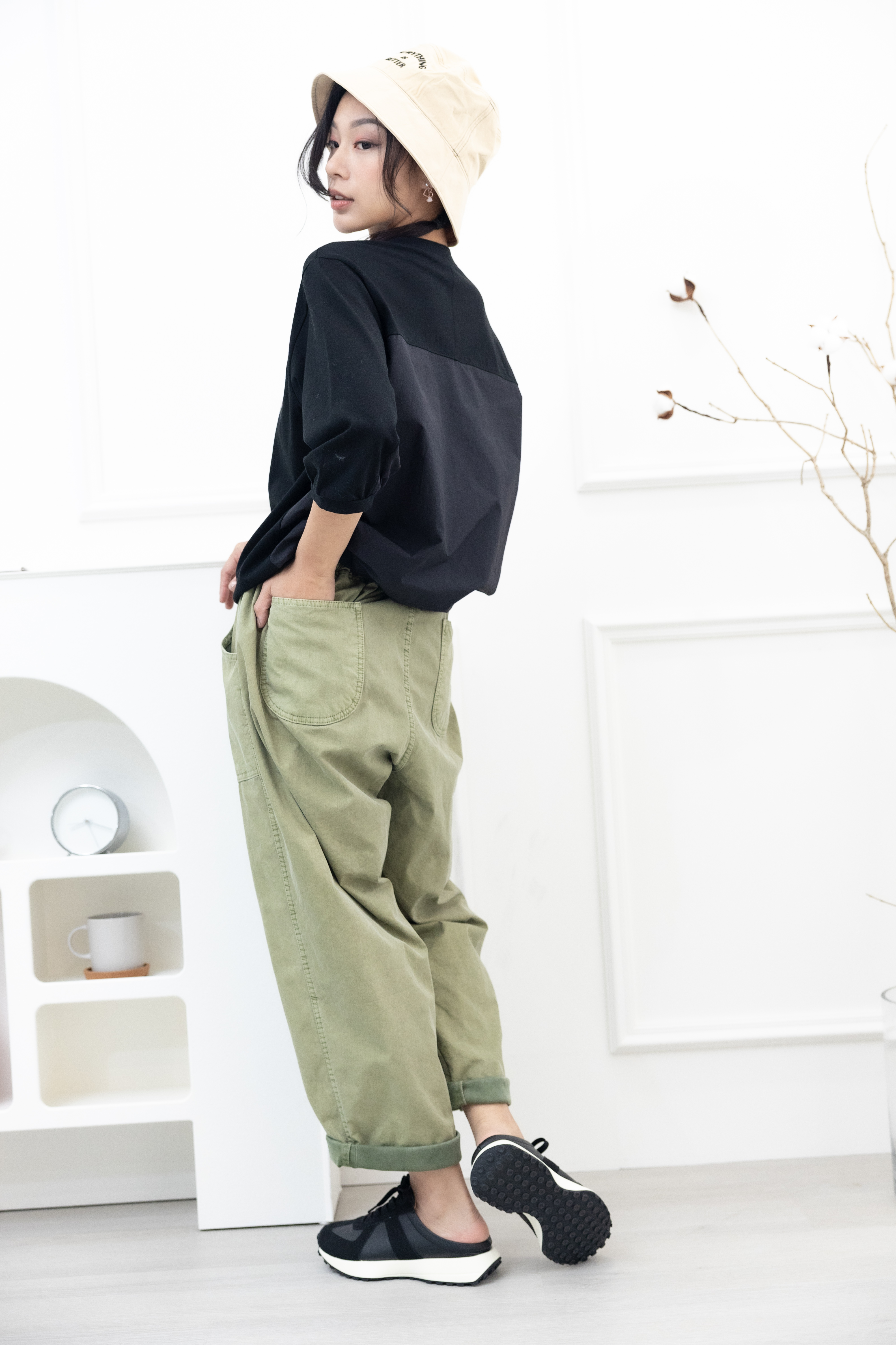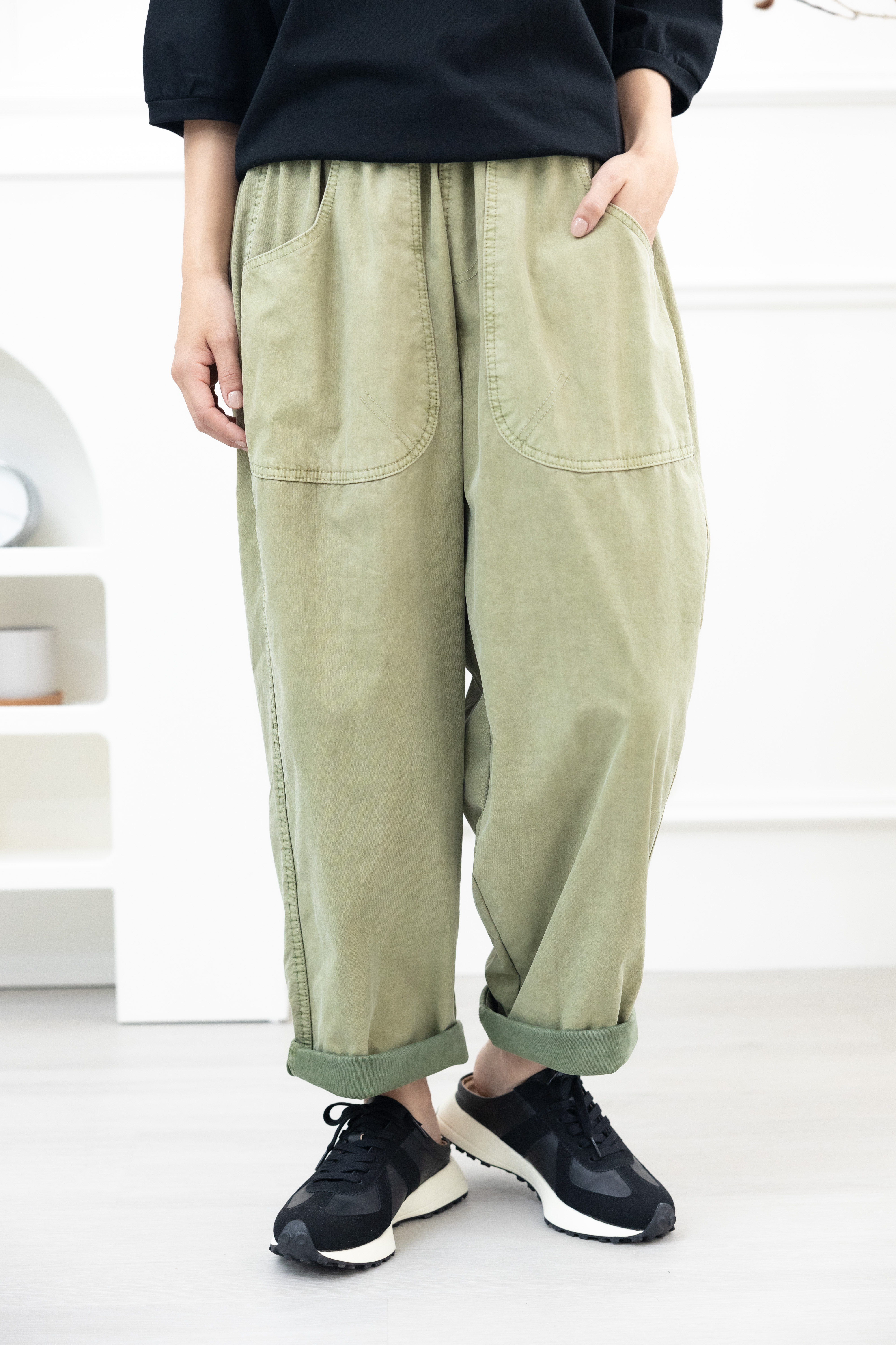 긴 바지 寬版直筒長褲/草綠色