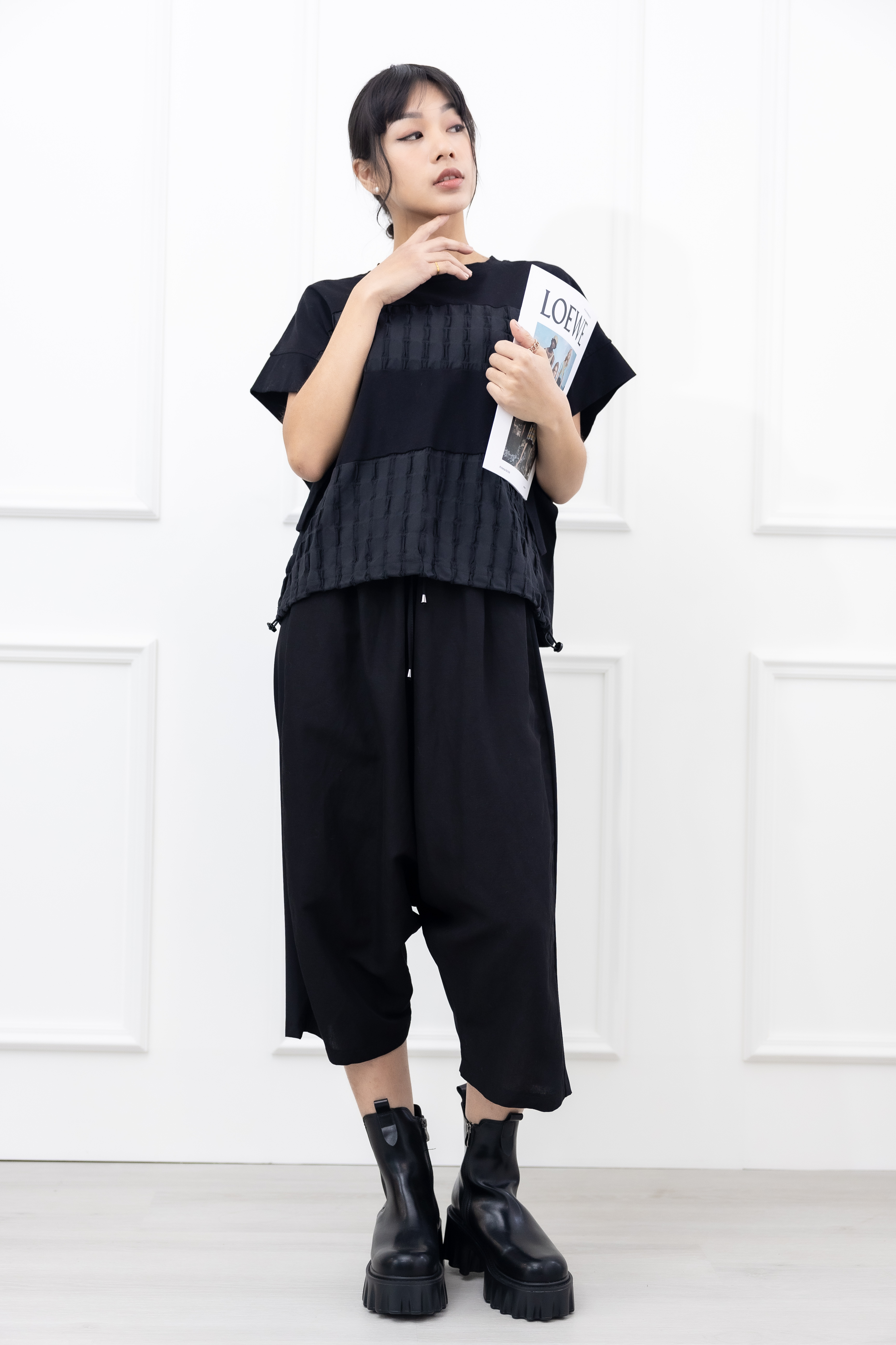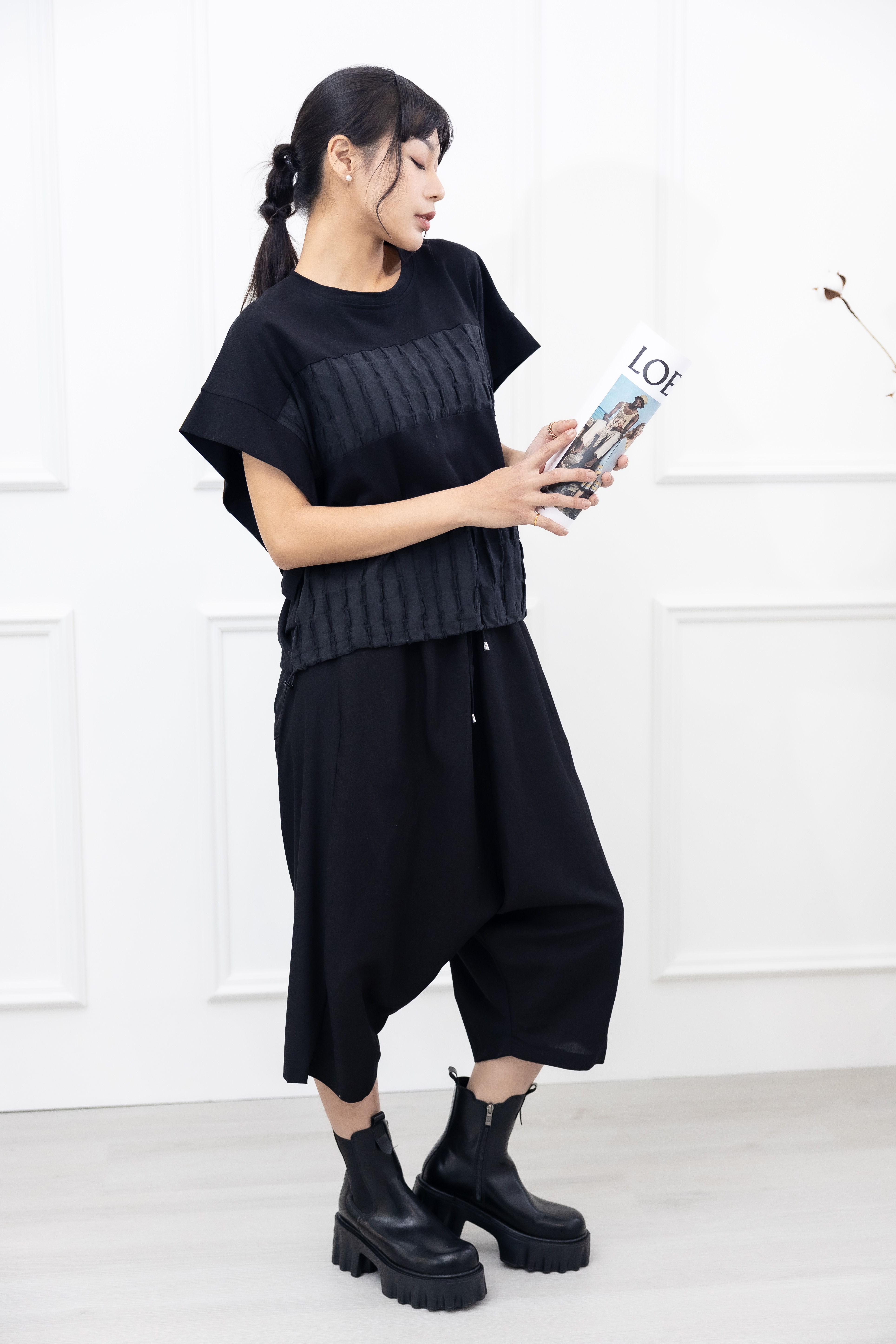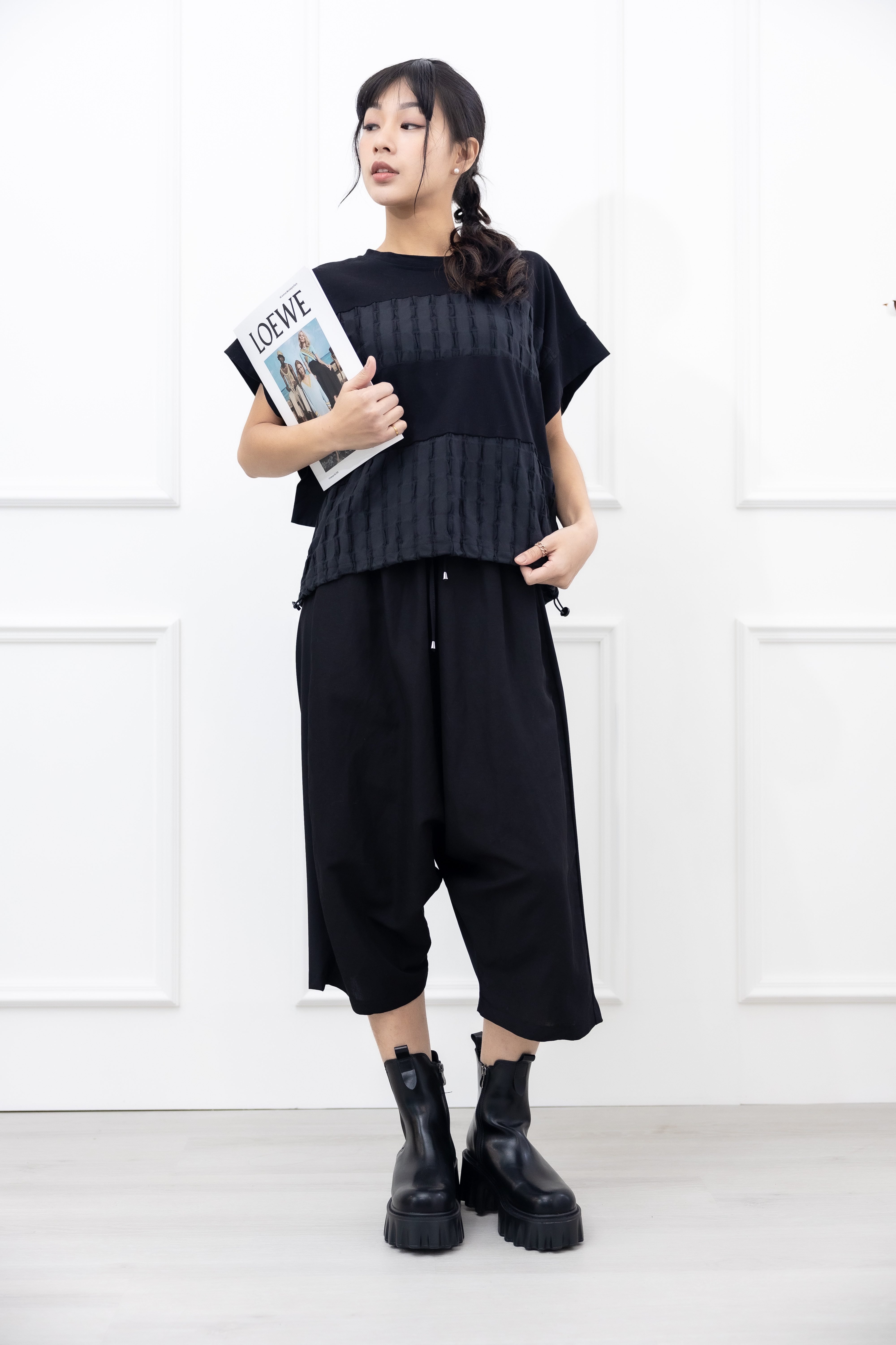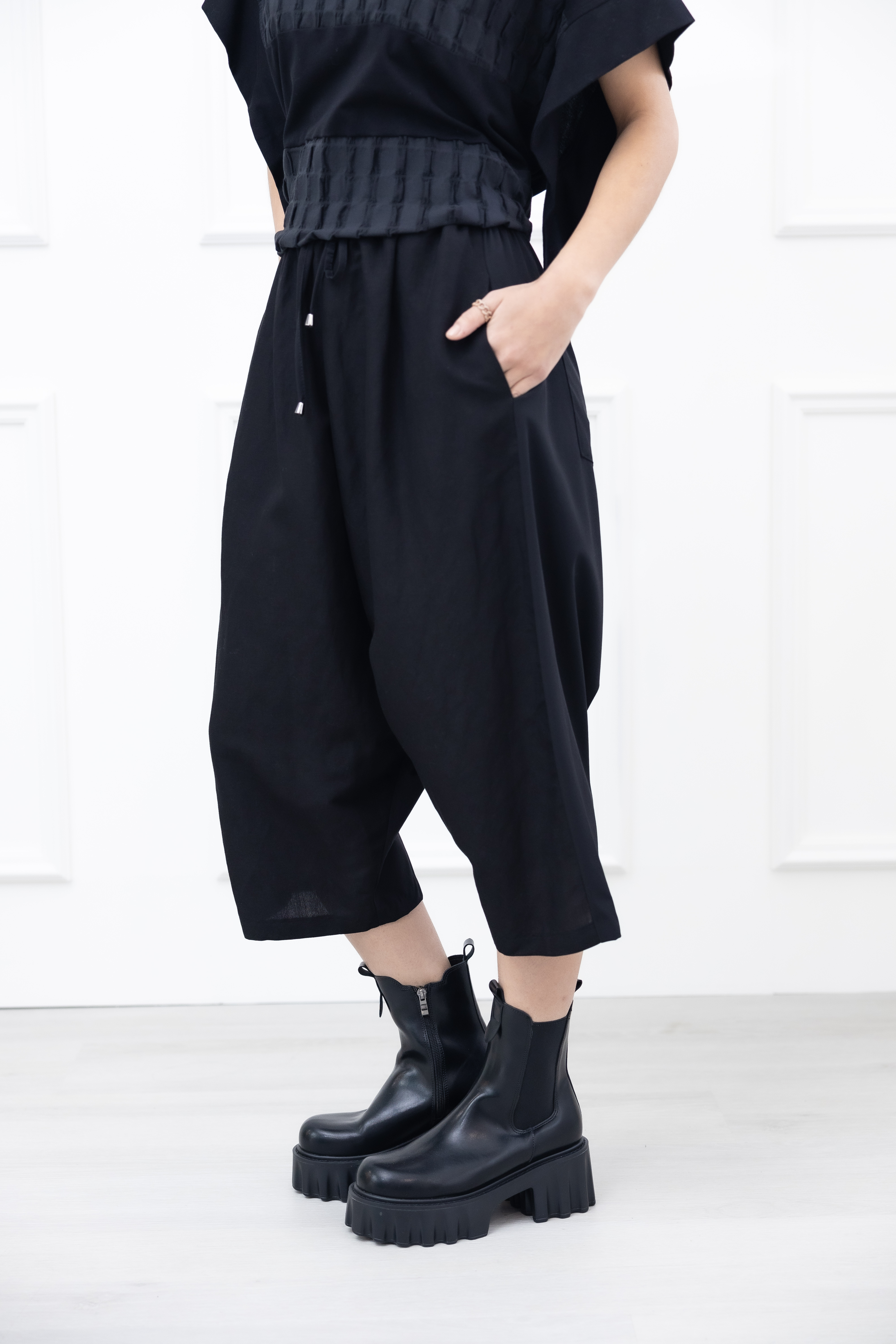 긴 바지 異材質拼接七分寬褲 / 黑色