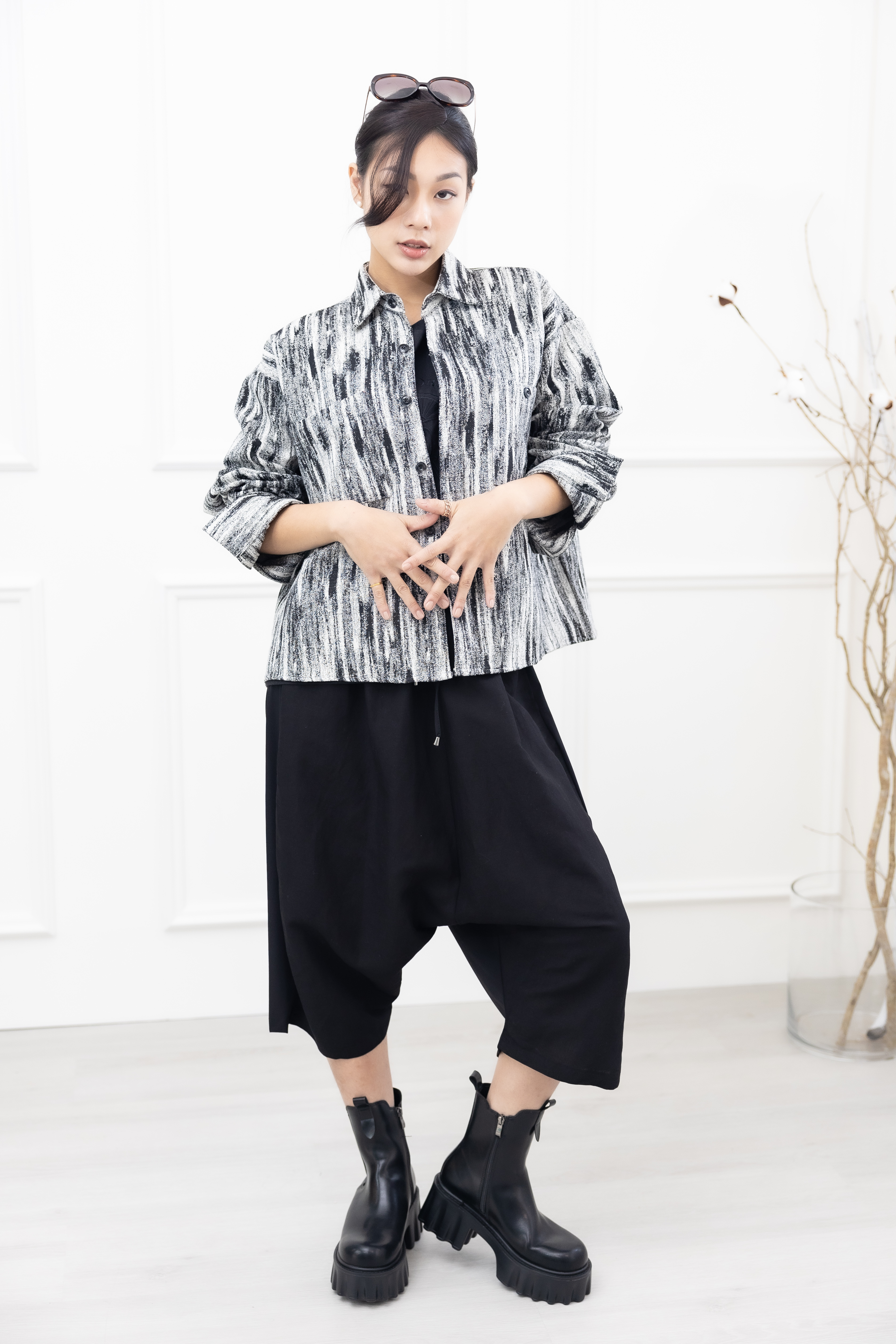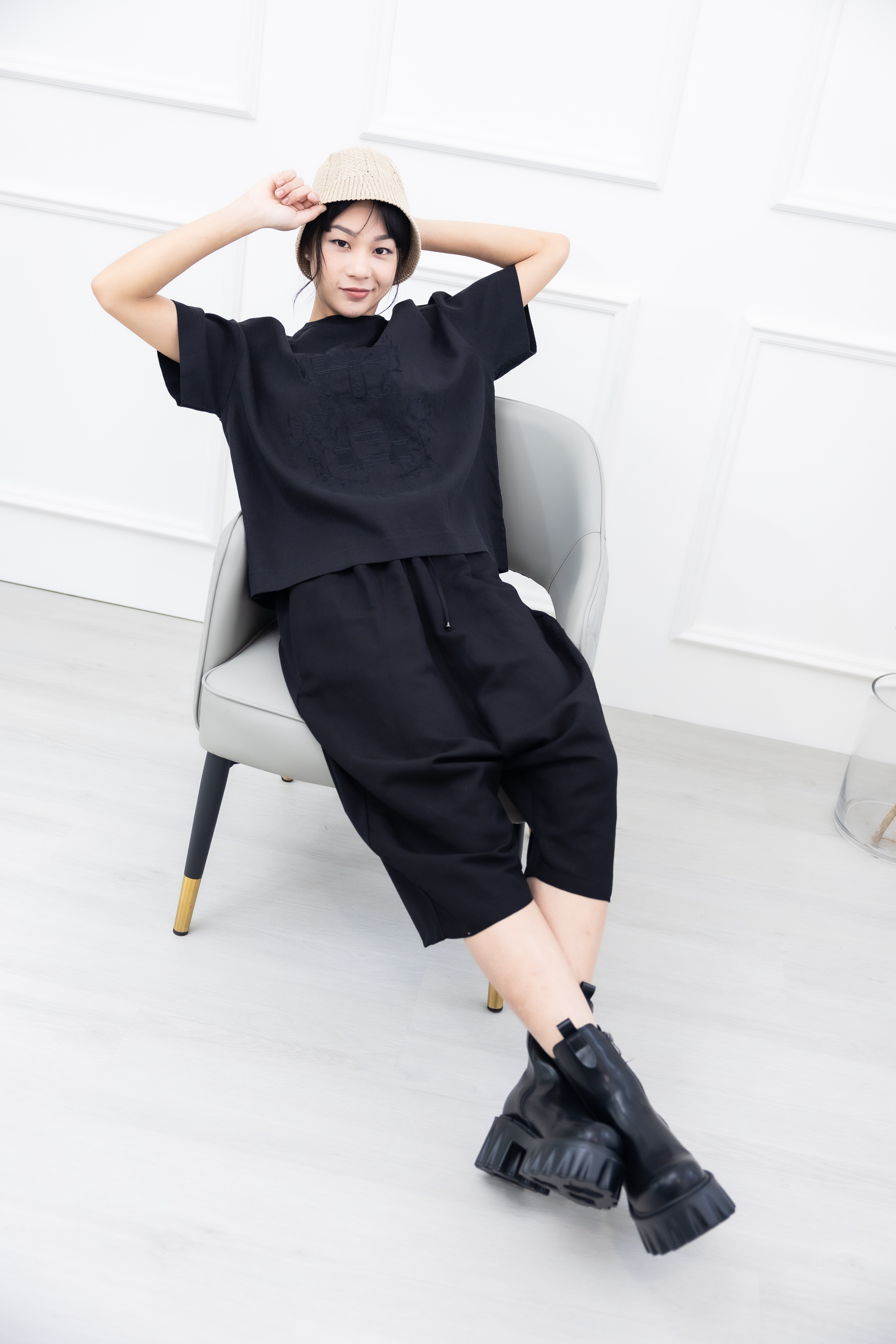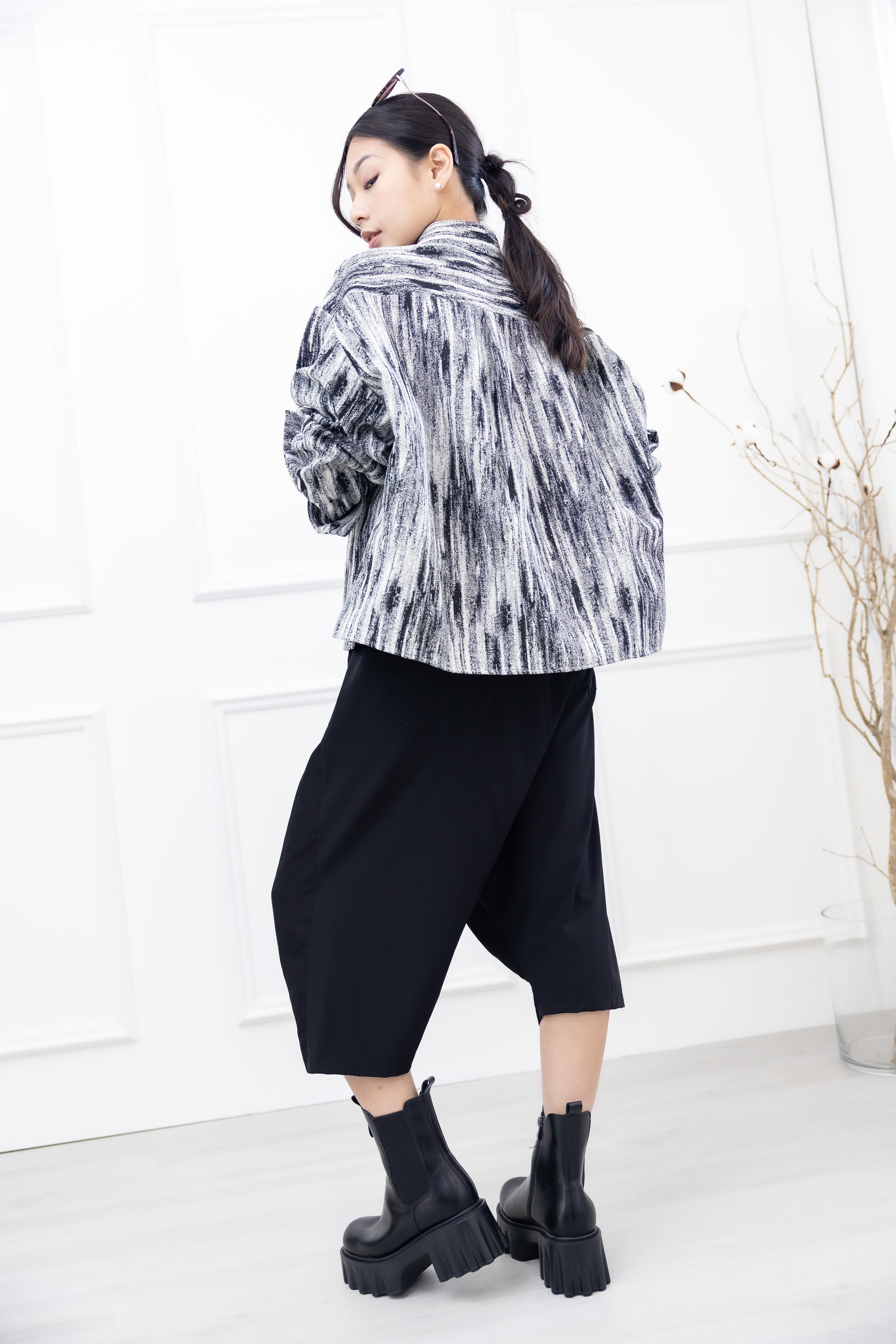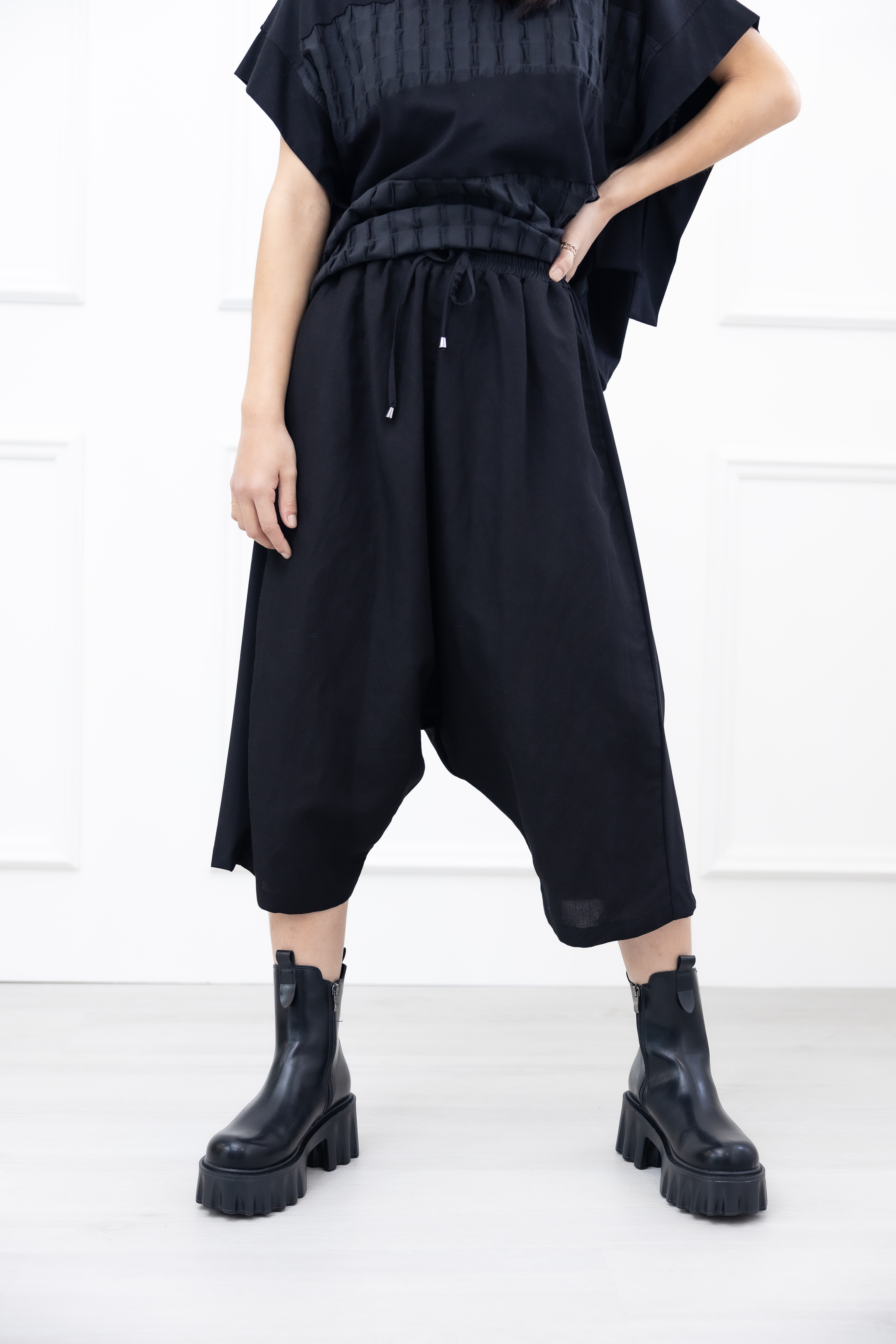 긴 바지 異材質拼接七分寬褲 / 黑色