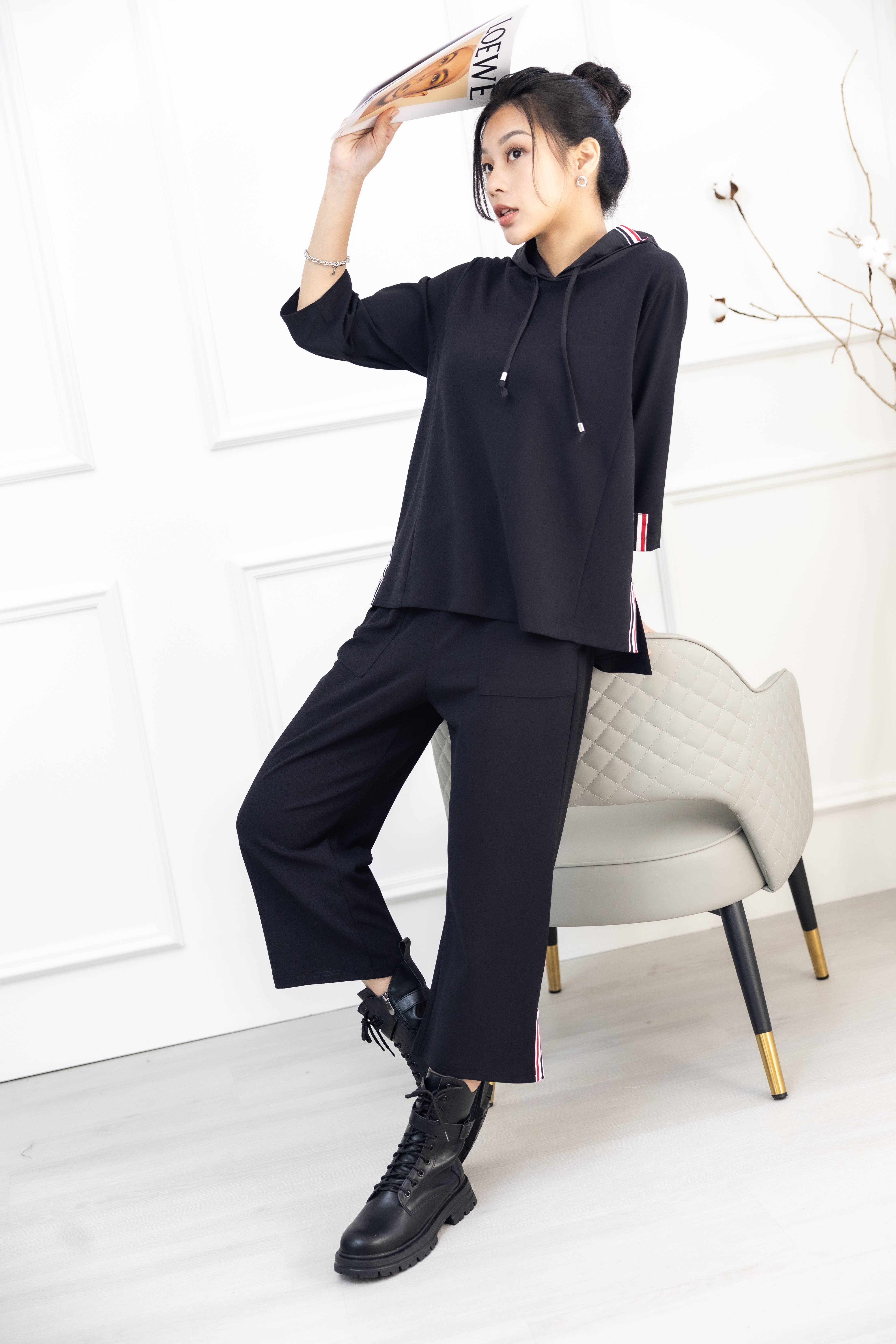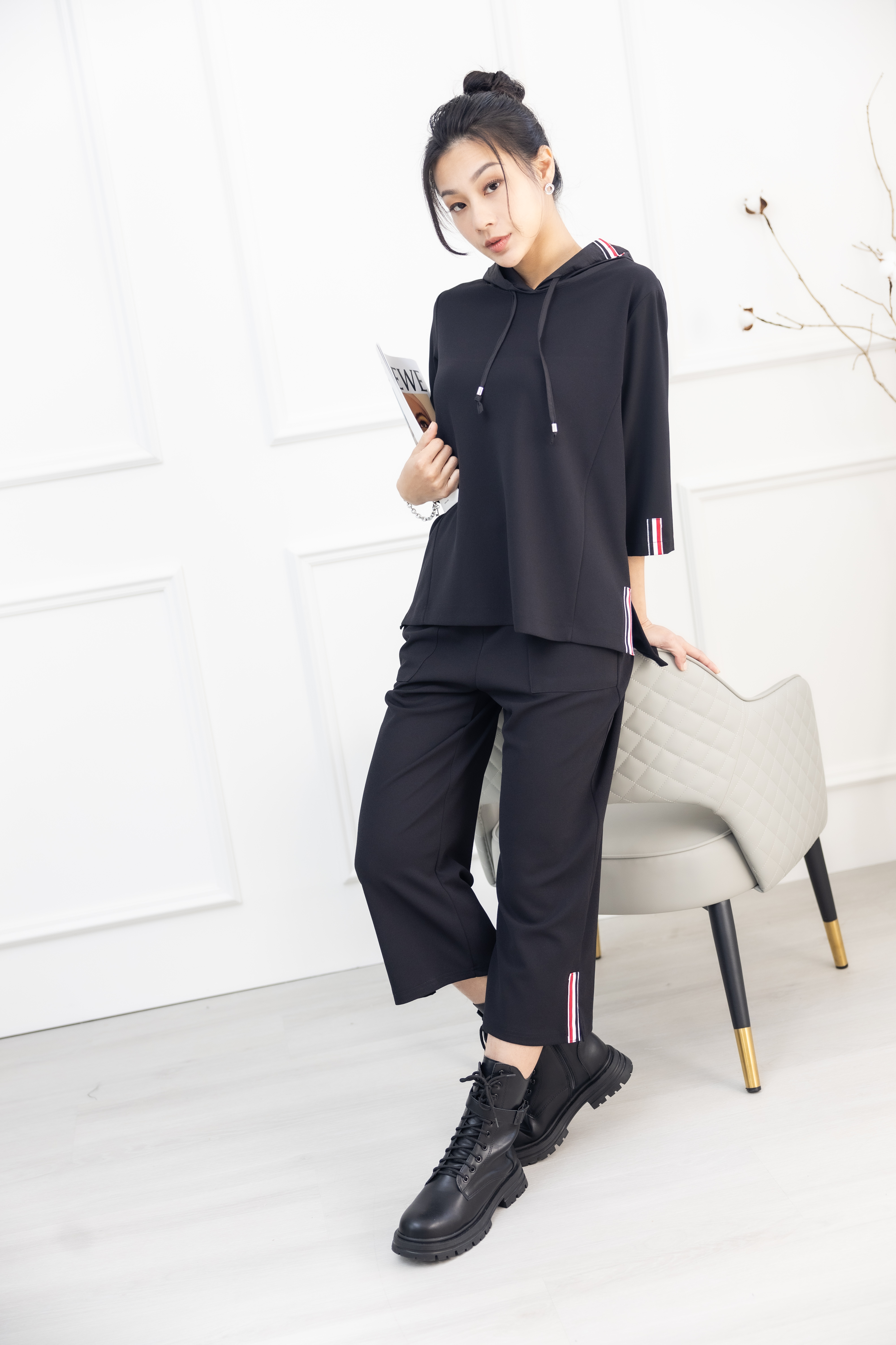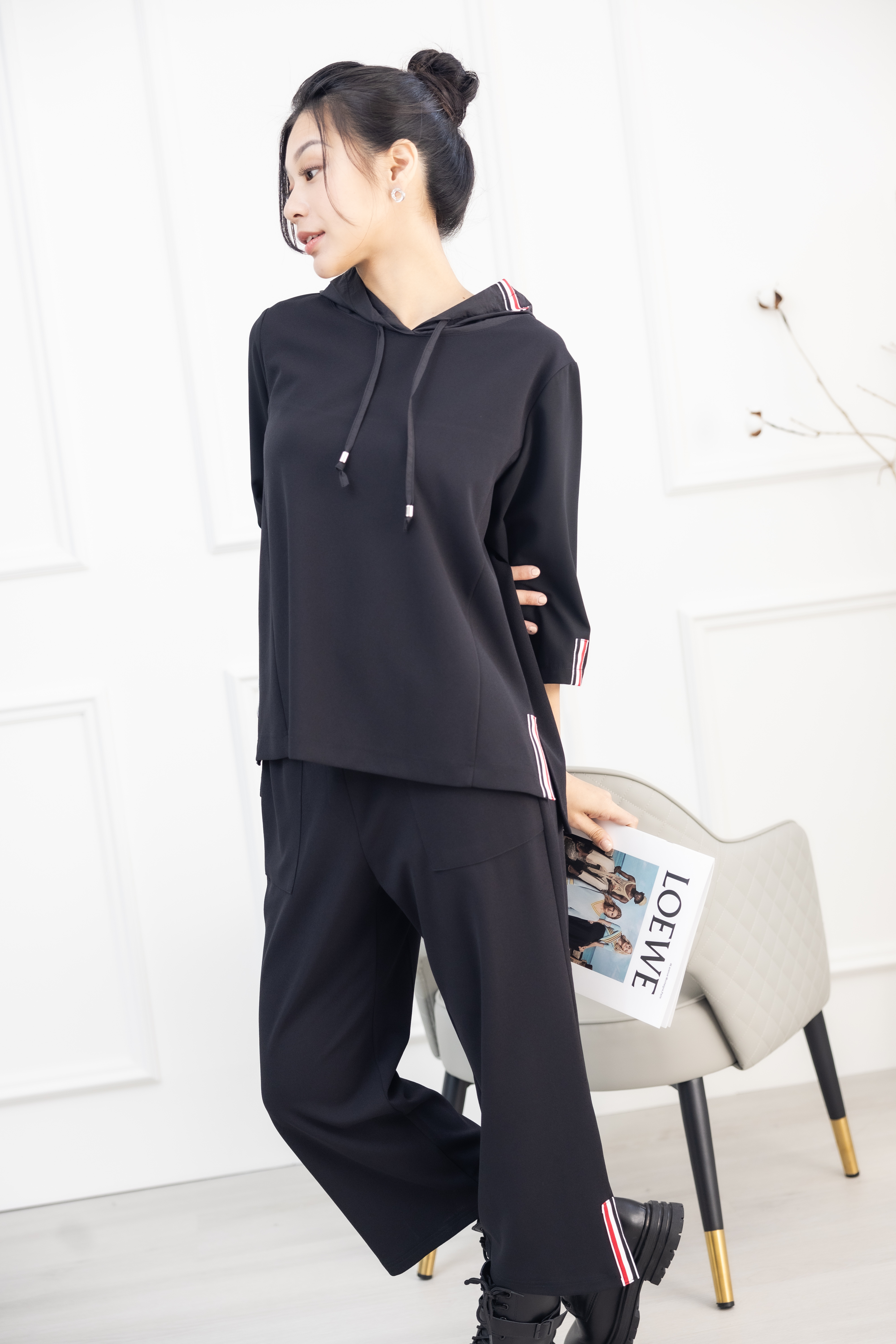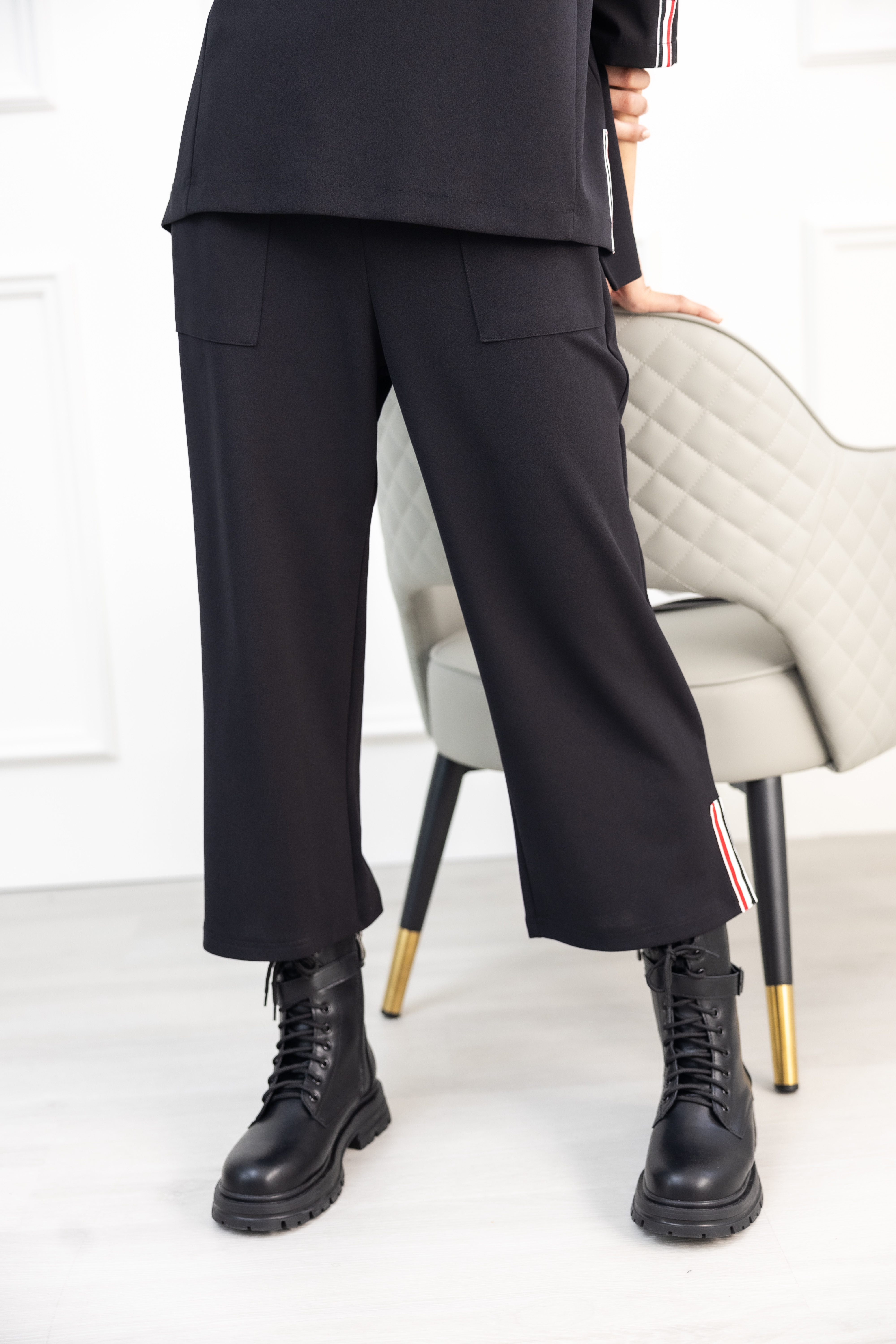 긴 바지 褲腳造型布標長褲 / 黑色