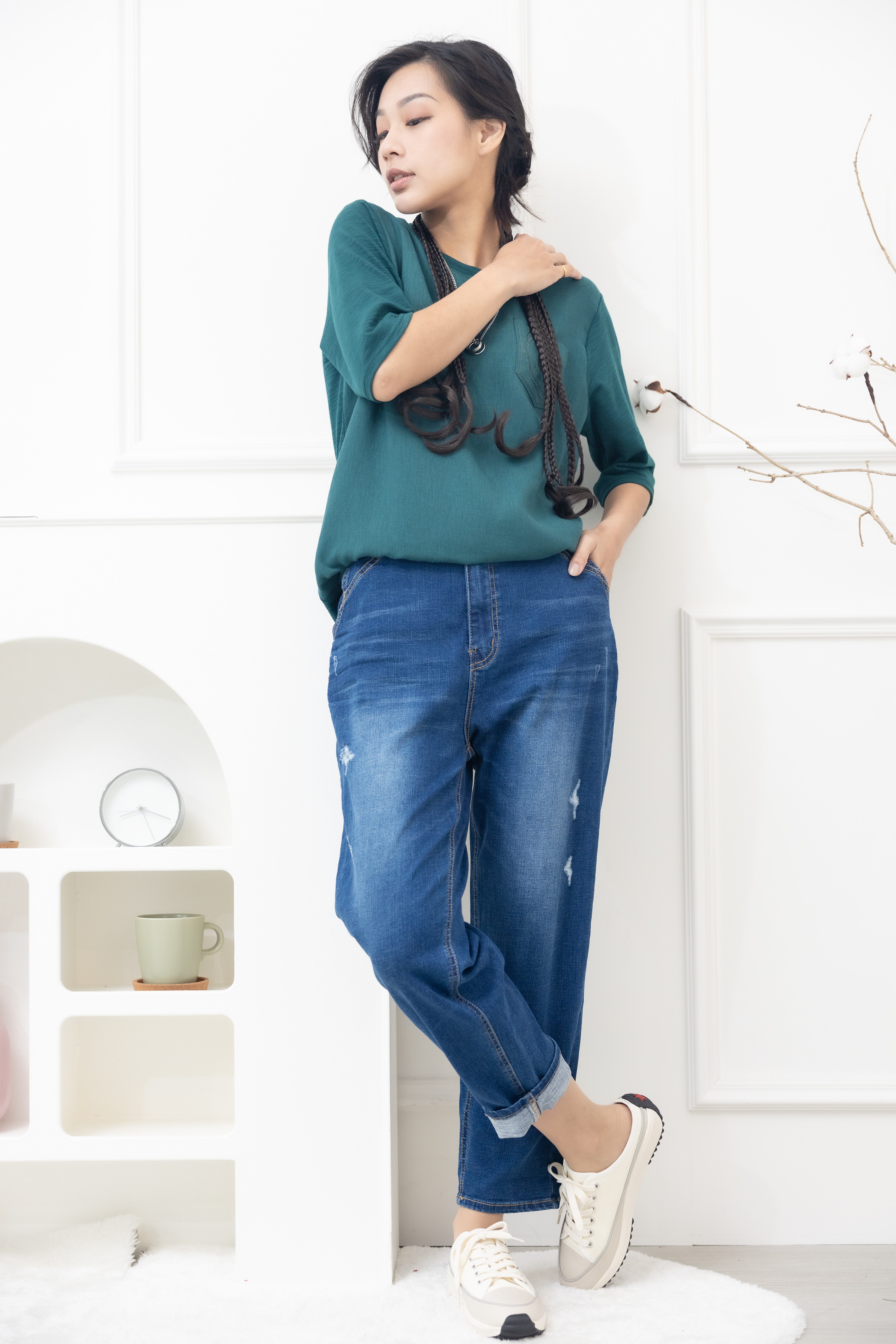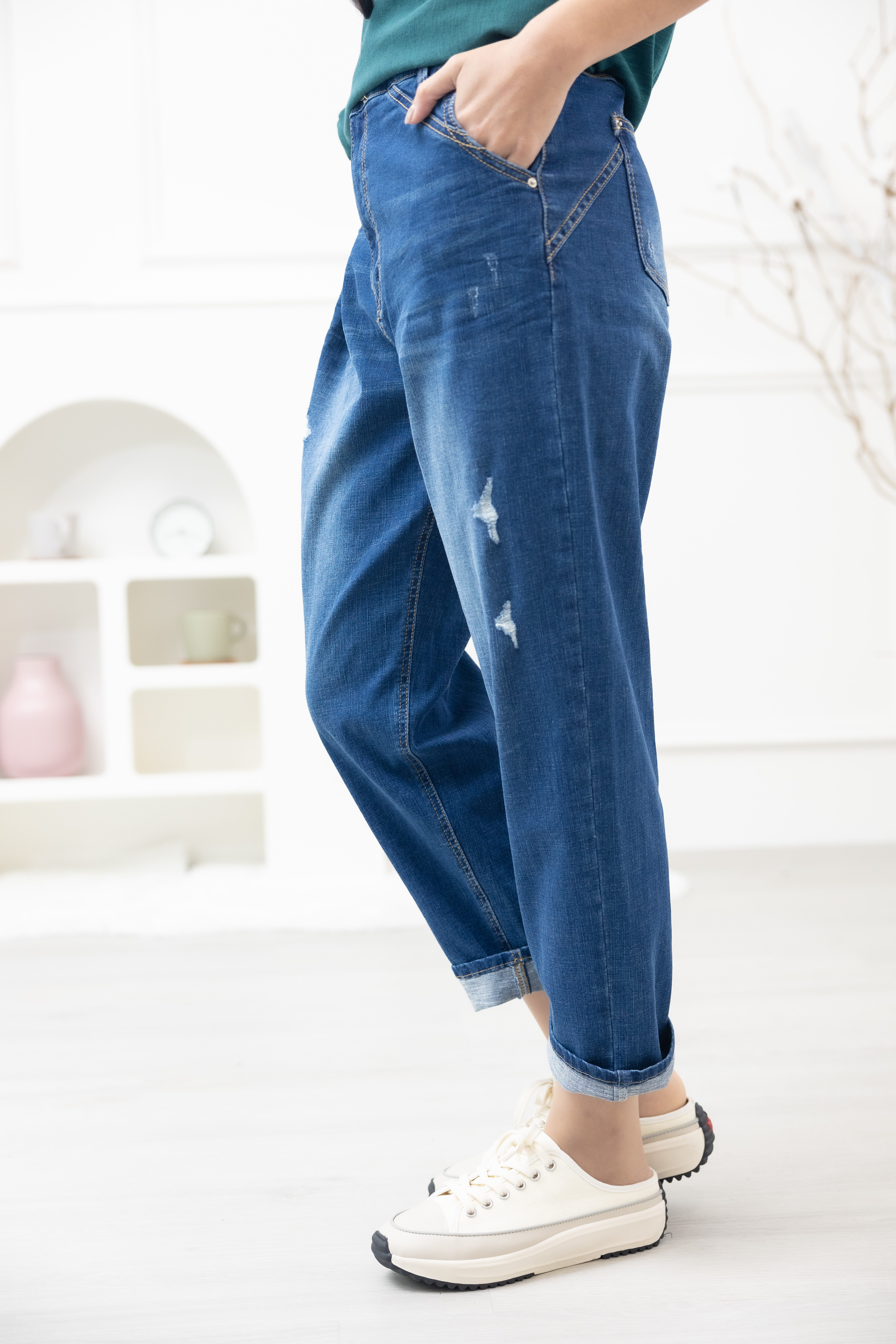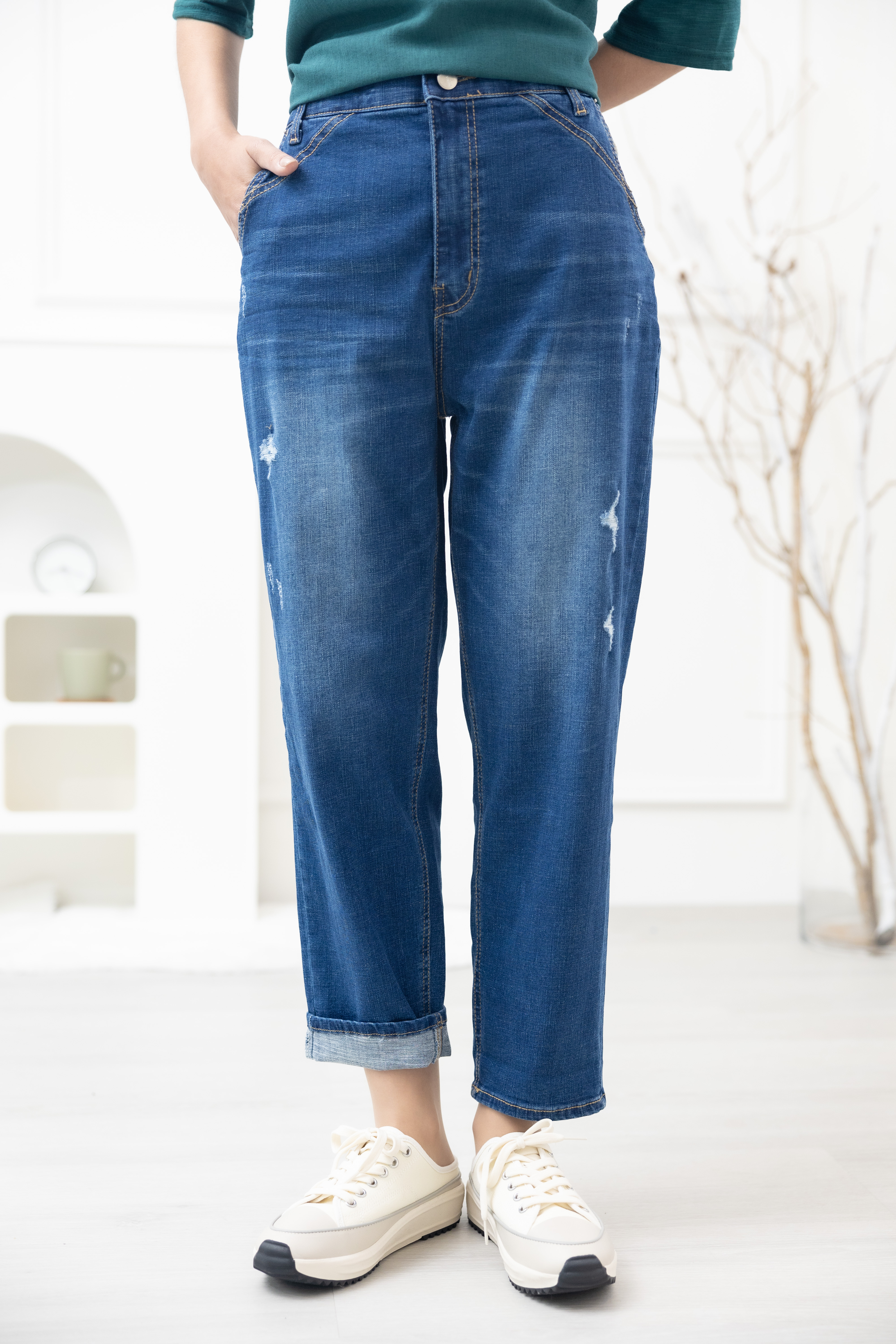 긴 바지 釘扣微刷破管牛仔褲 / 深藍色