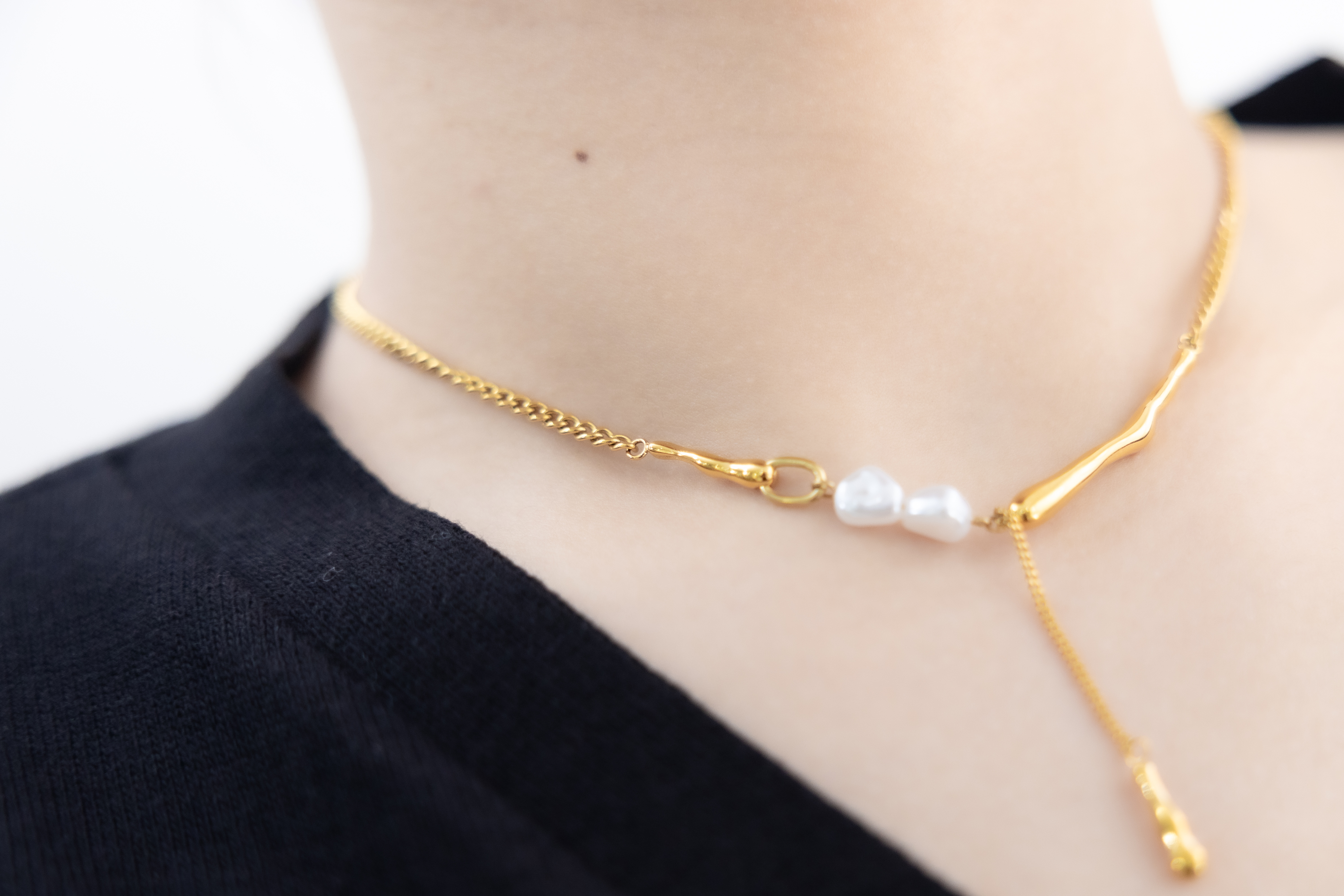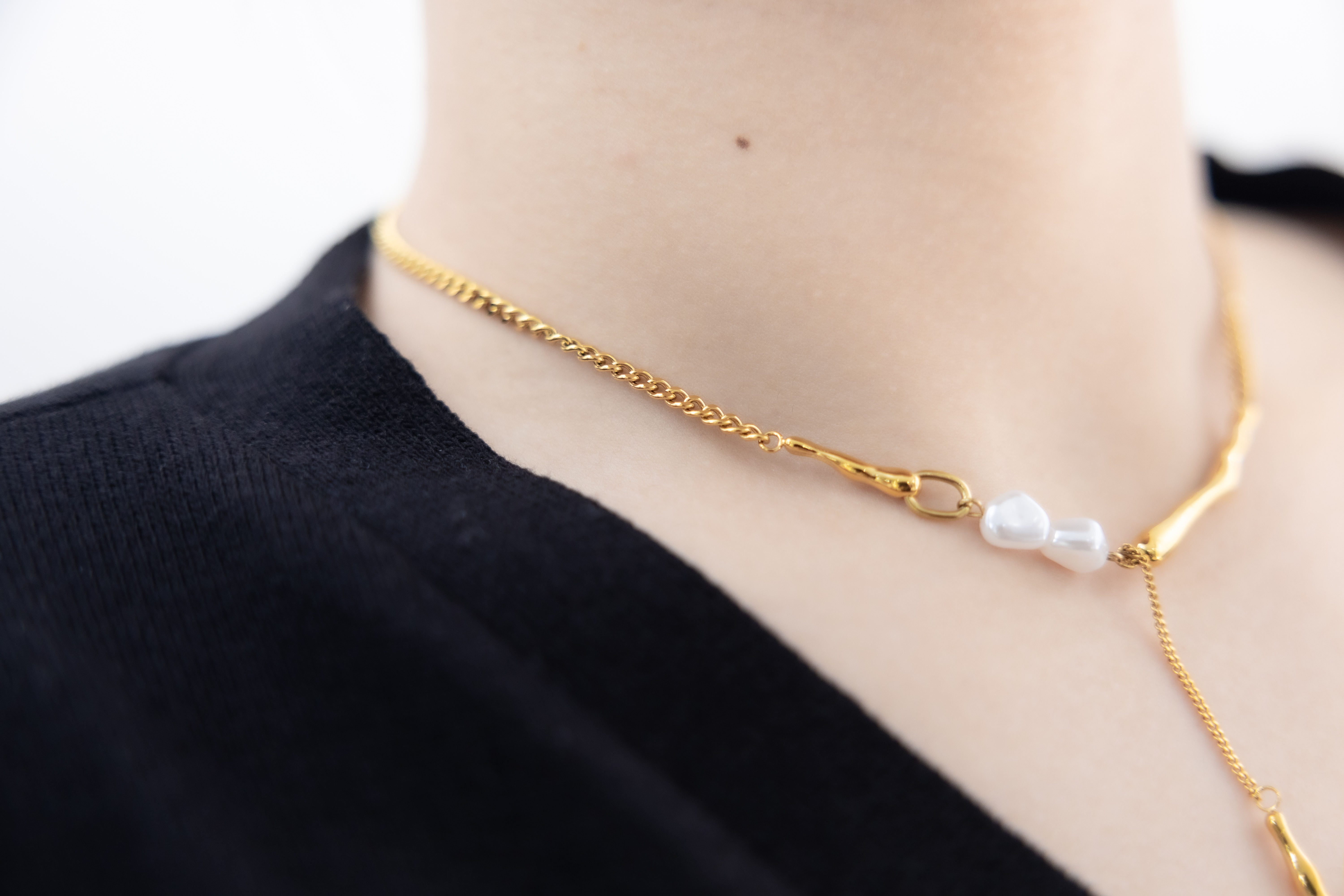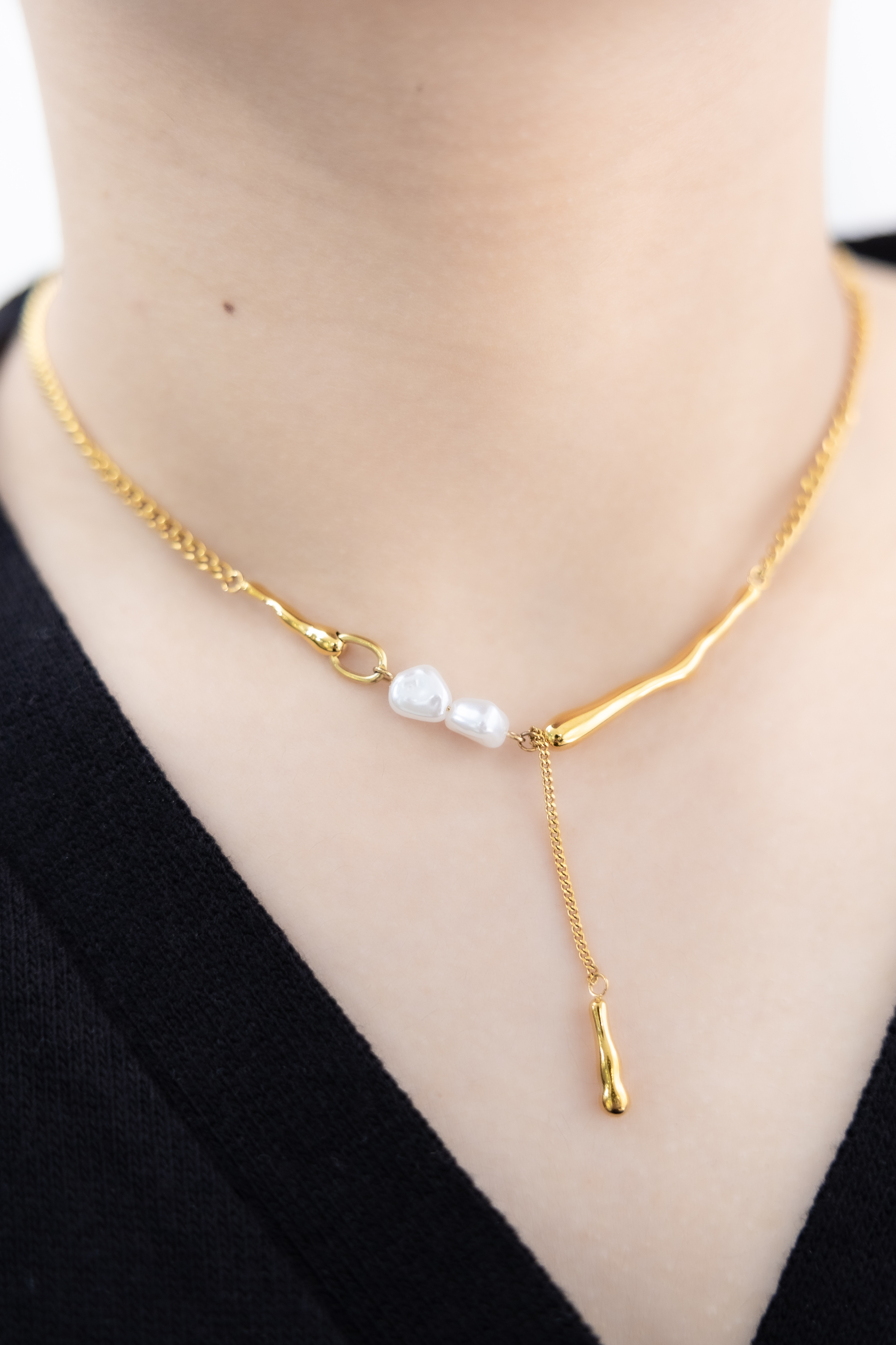 목걸이 小珍珠固定式短Y字鍊墜小柱體喜平鍊 / 金色