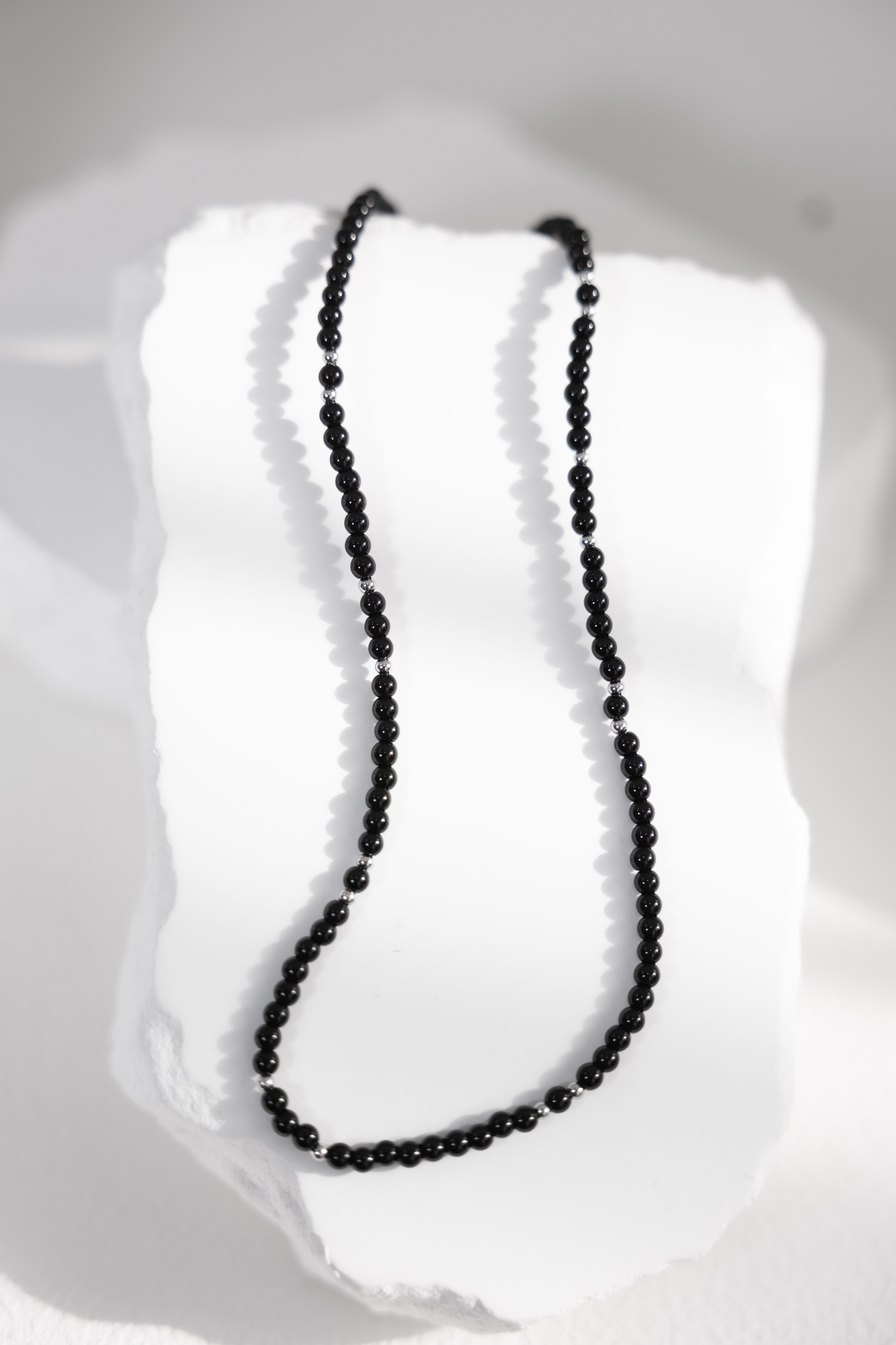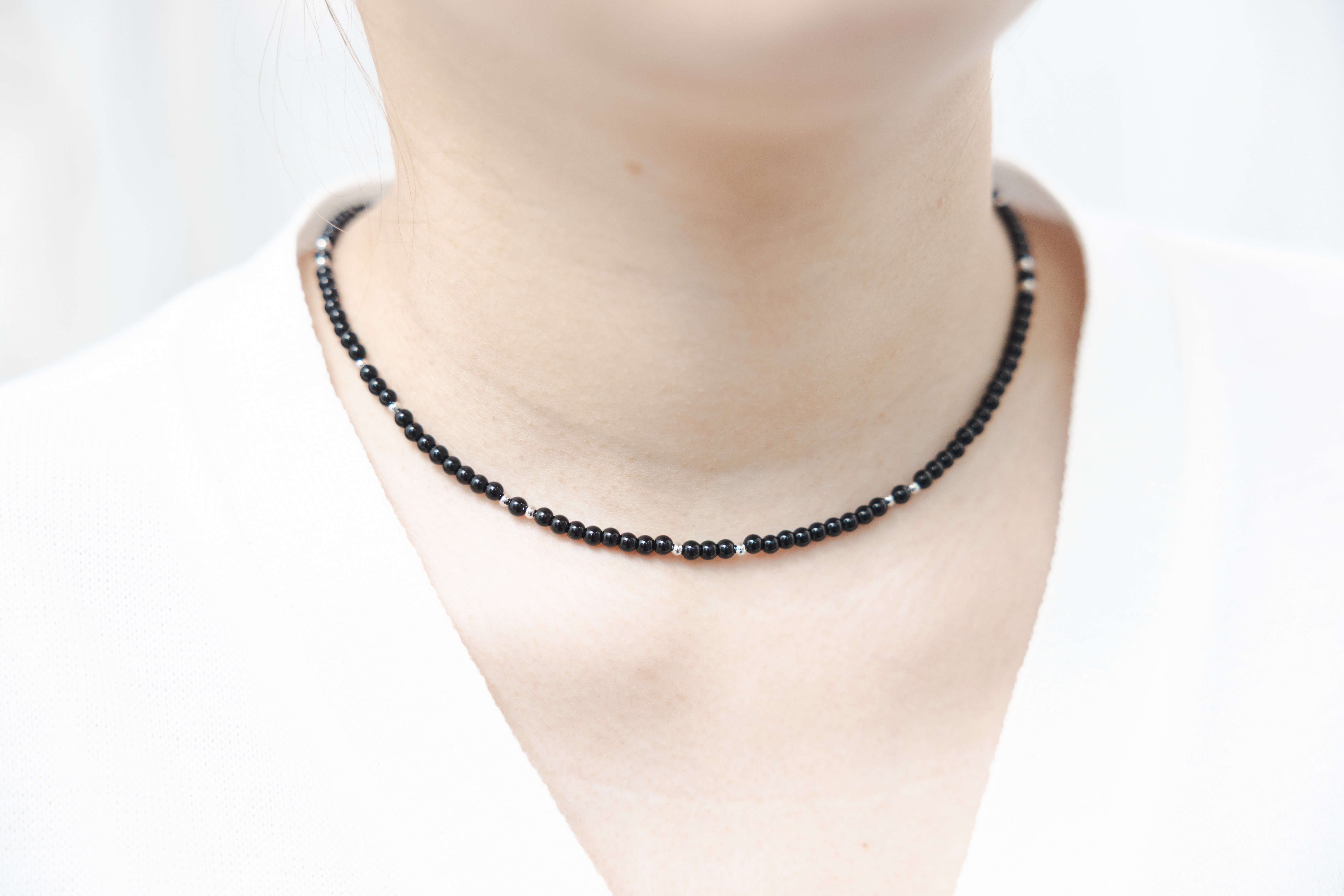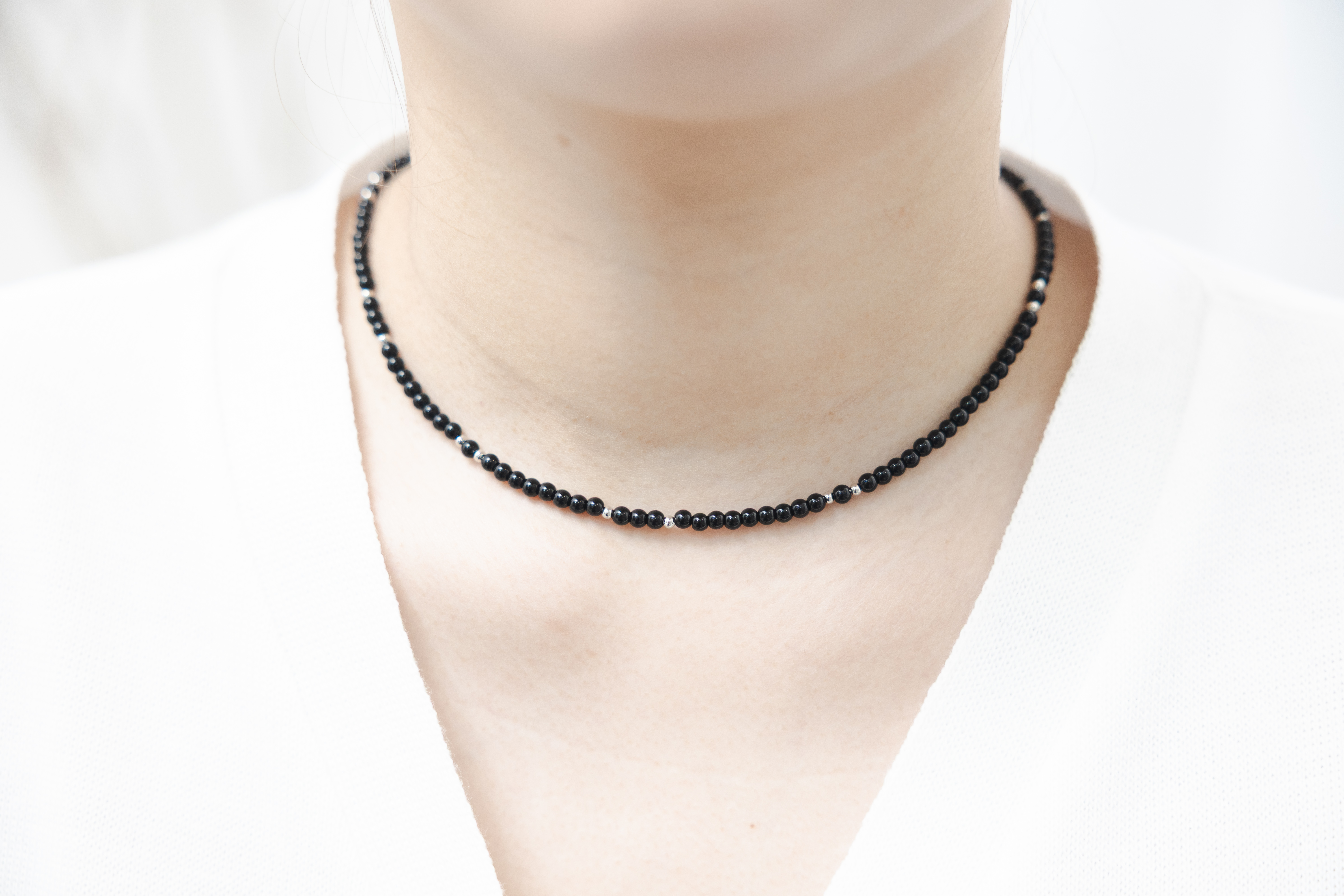 목걸이 瑪瑙圓珠間隔銀色小圓珠項鍊 / 黑色