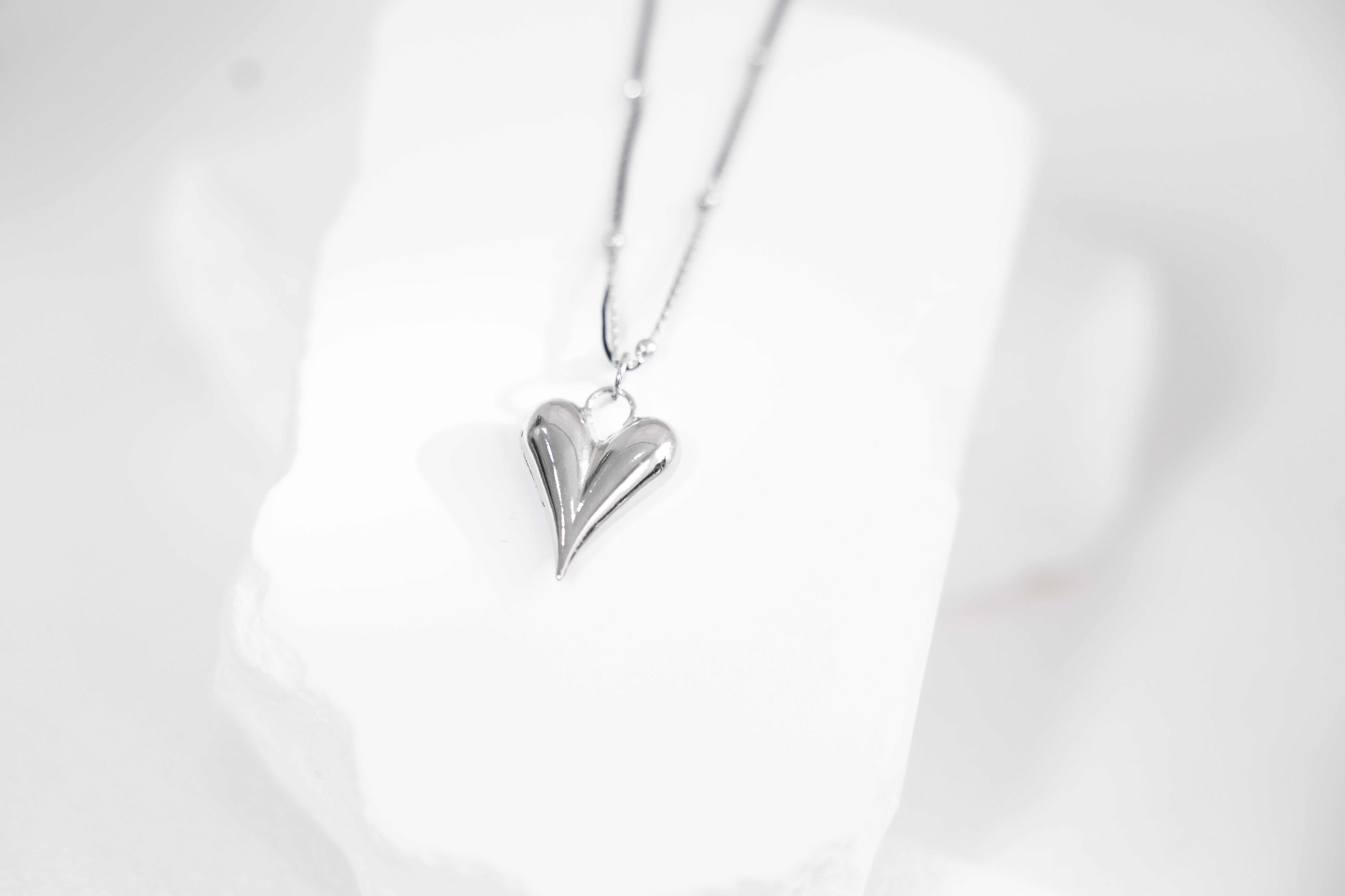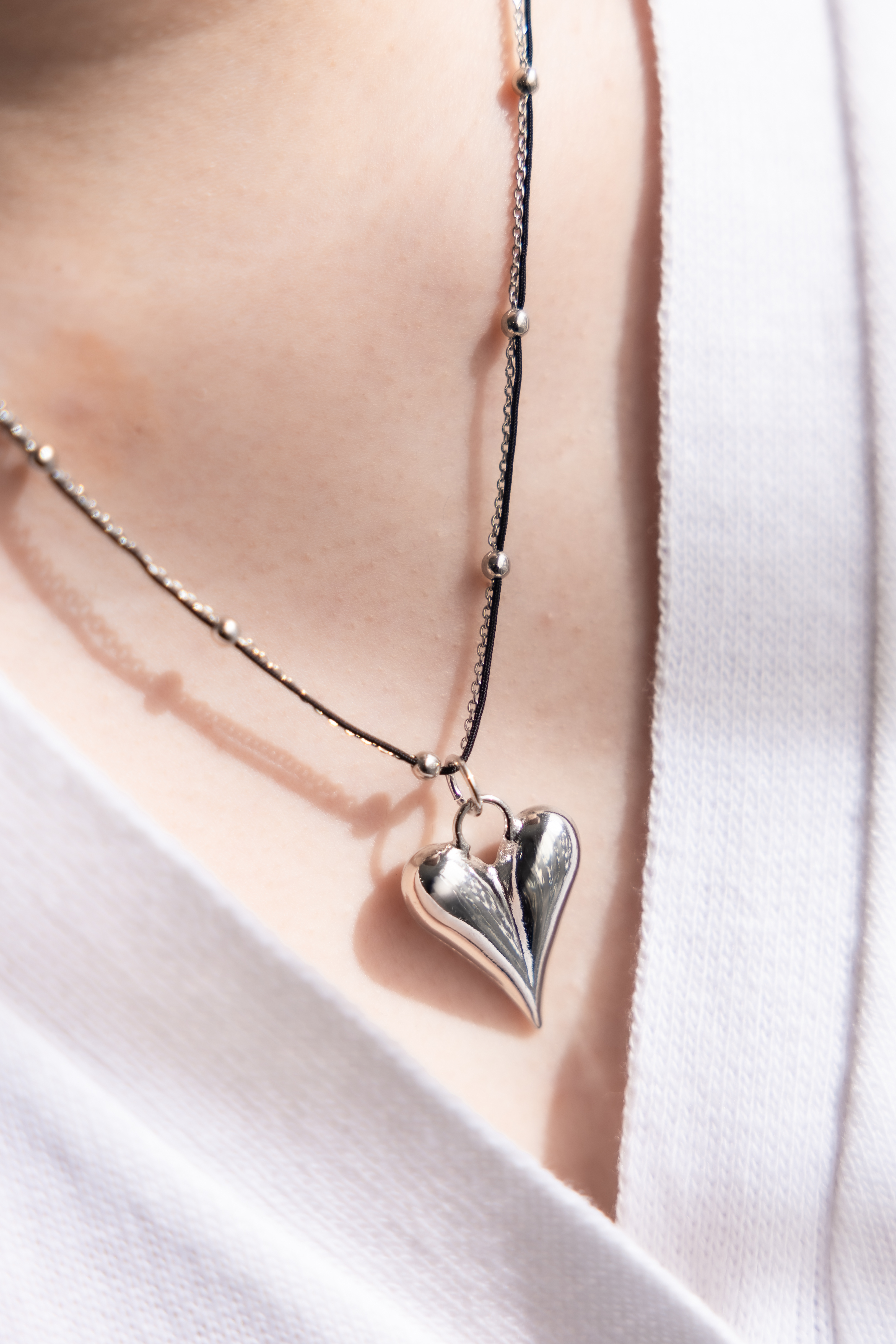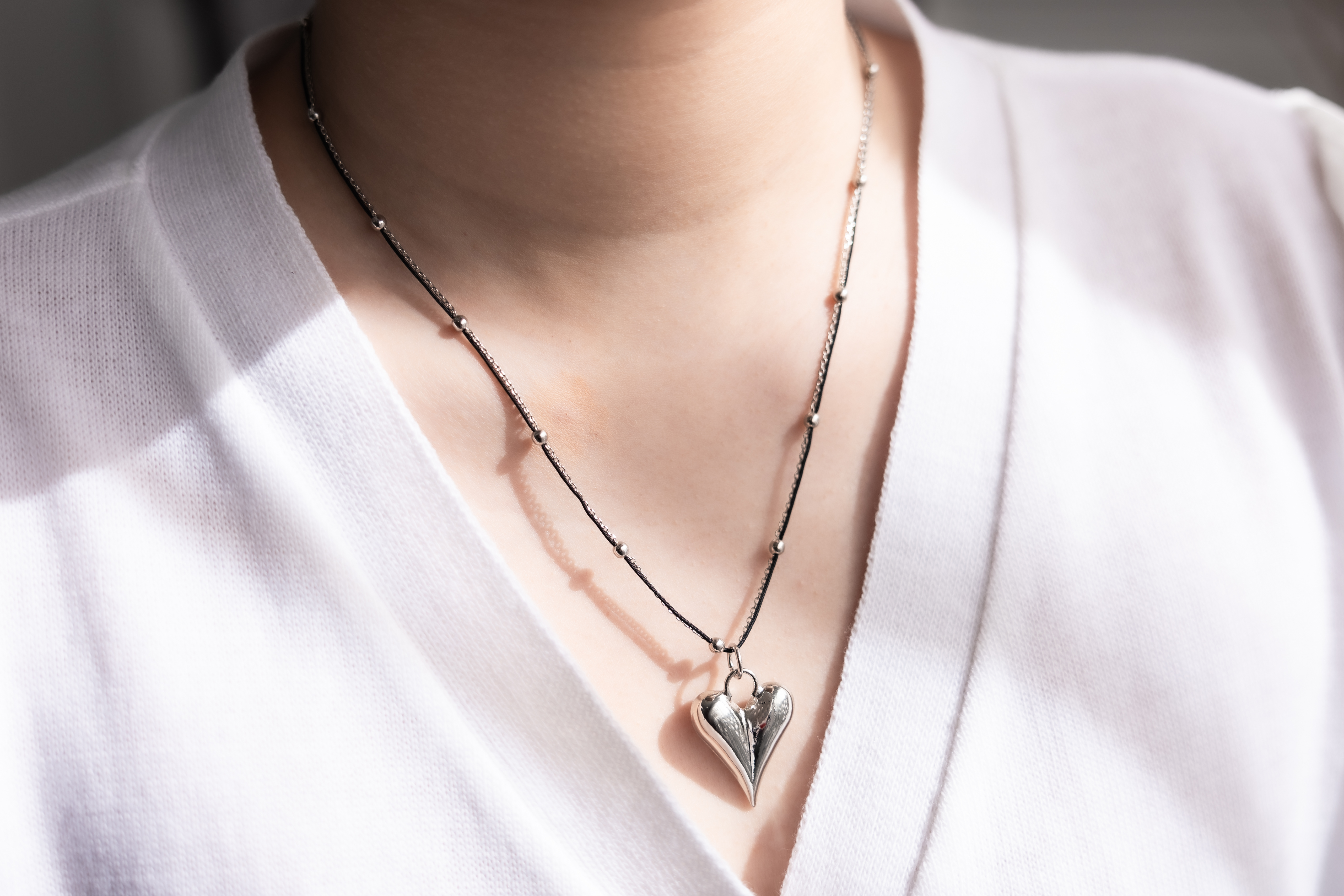 목걸이 黑繩小豆鍊綴立體大愛心項鍊 / 銀色