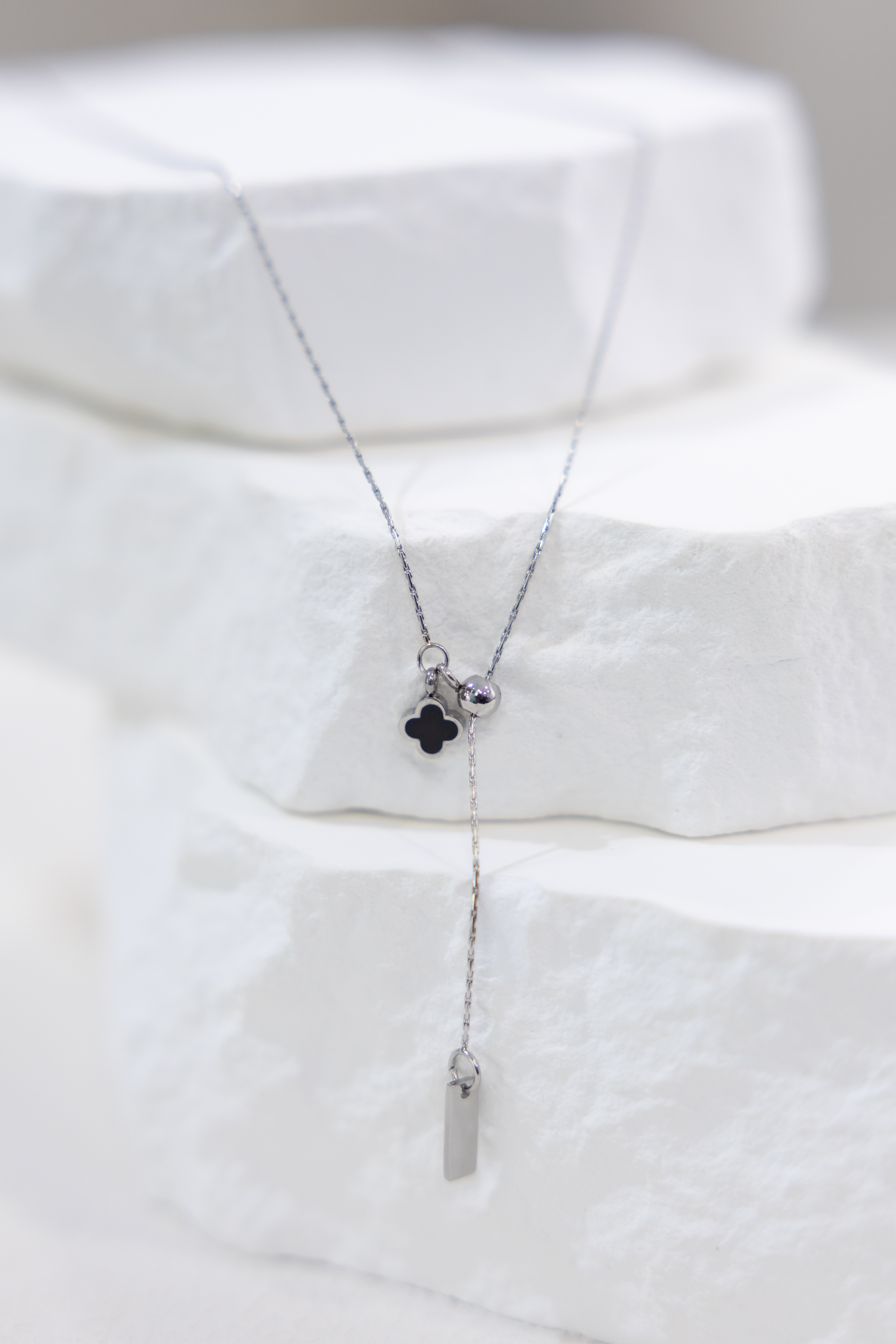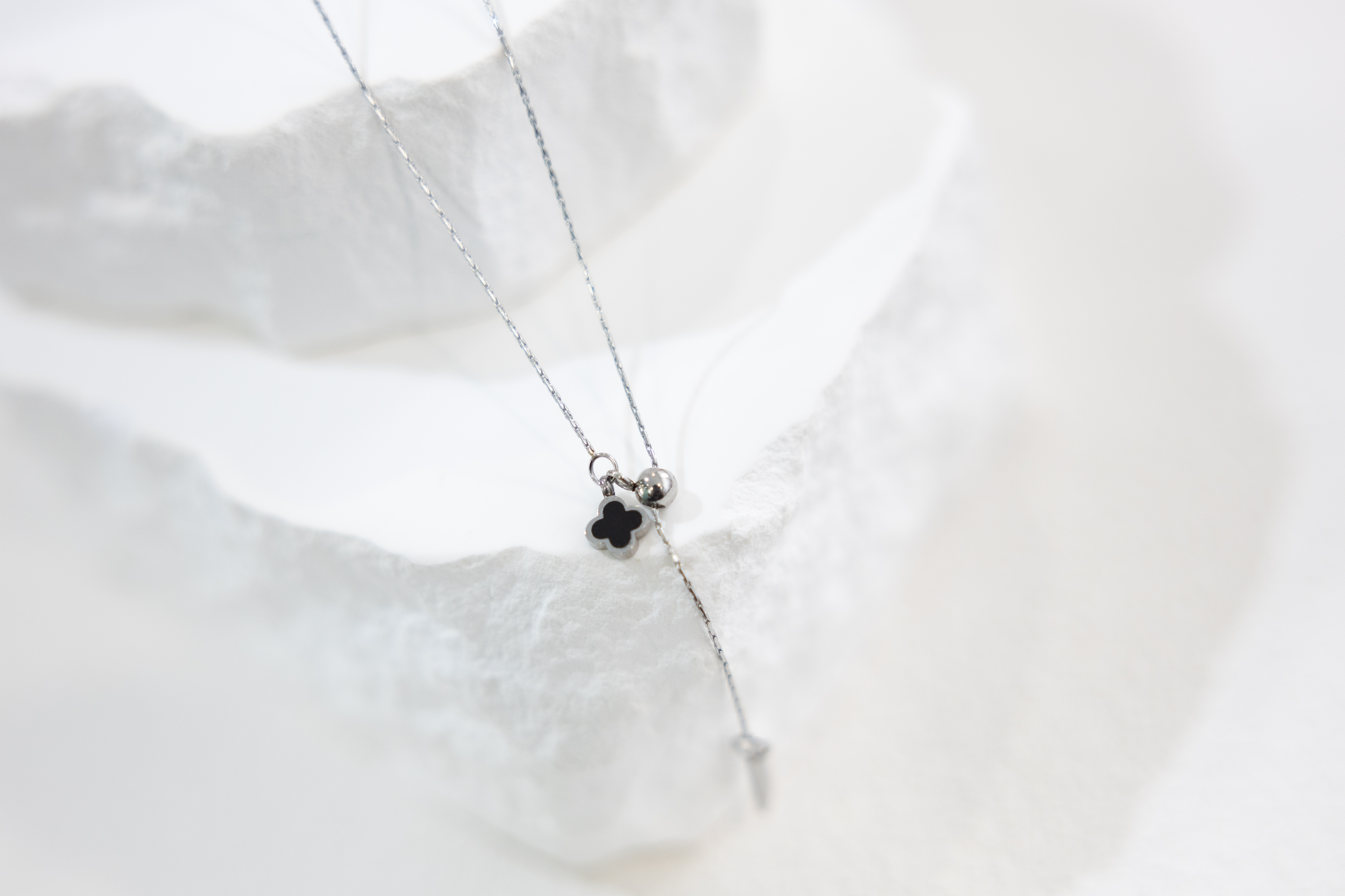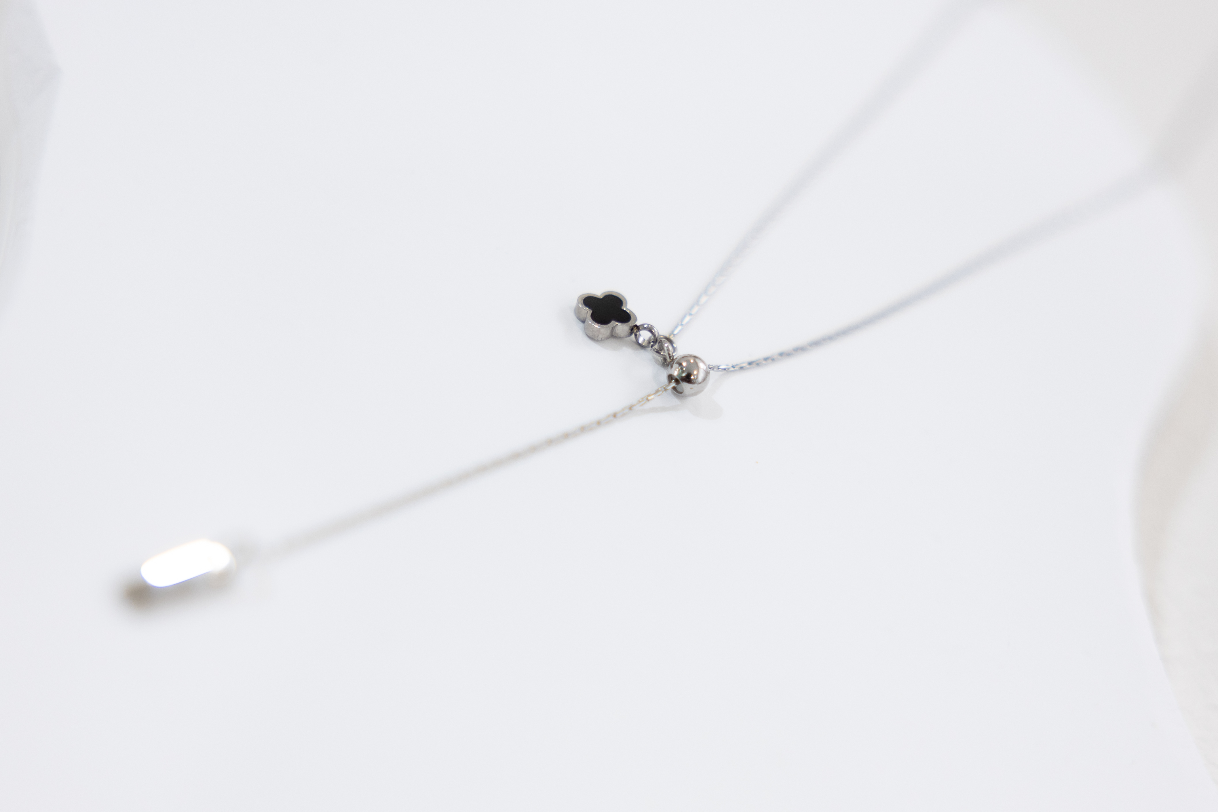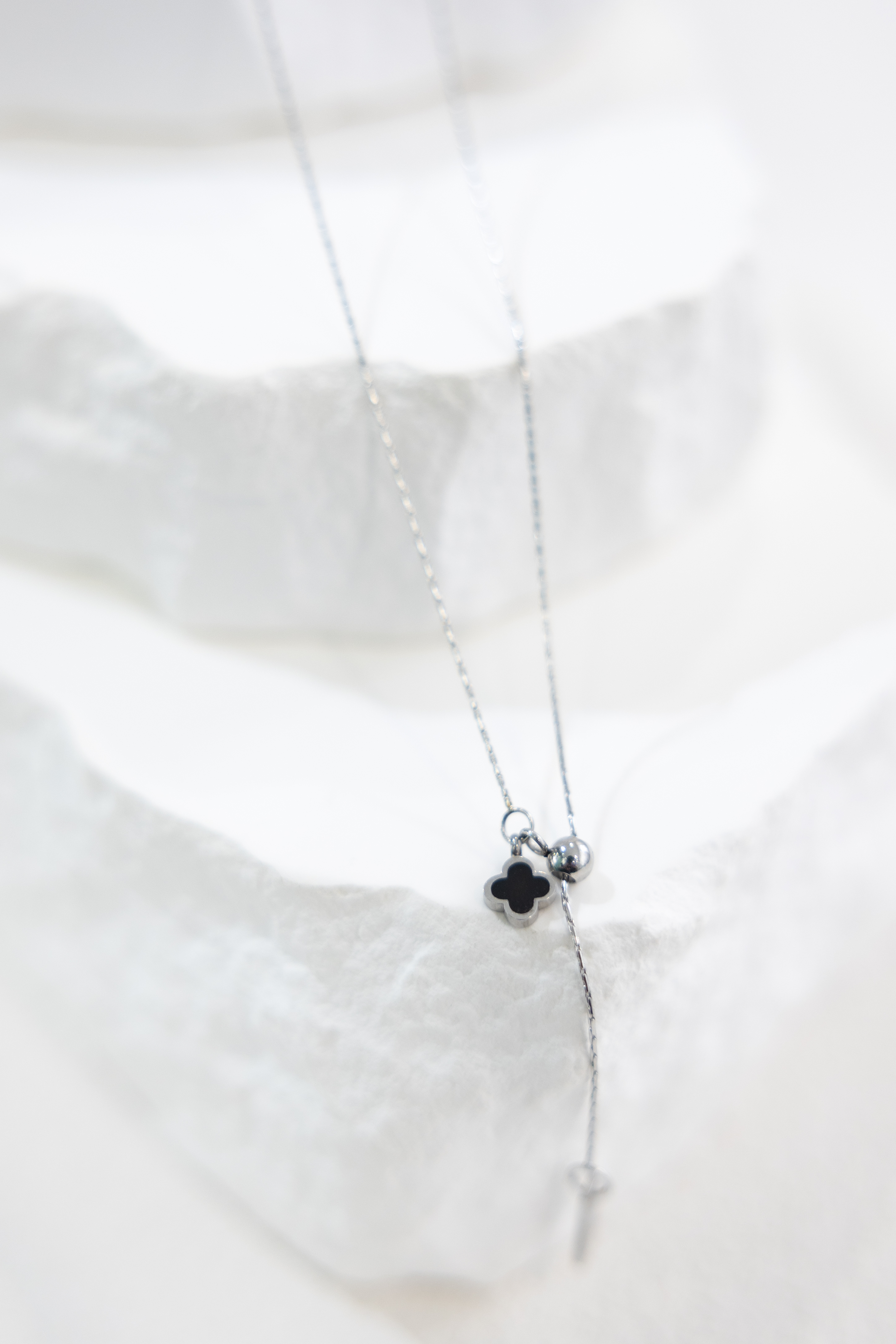 목걸이 黑色四葉花朵Y字極細威尼斯鍊 / 銀色