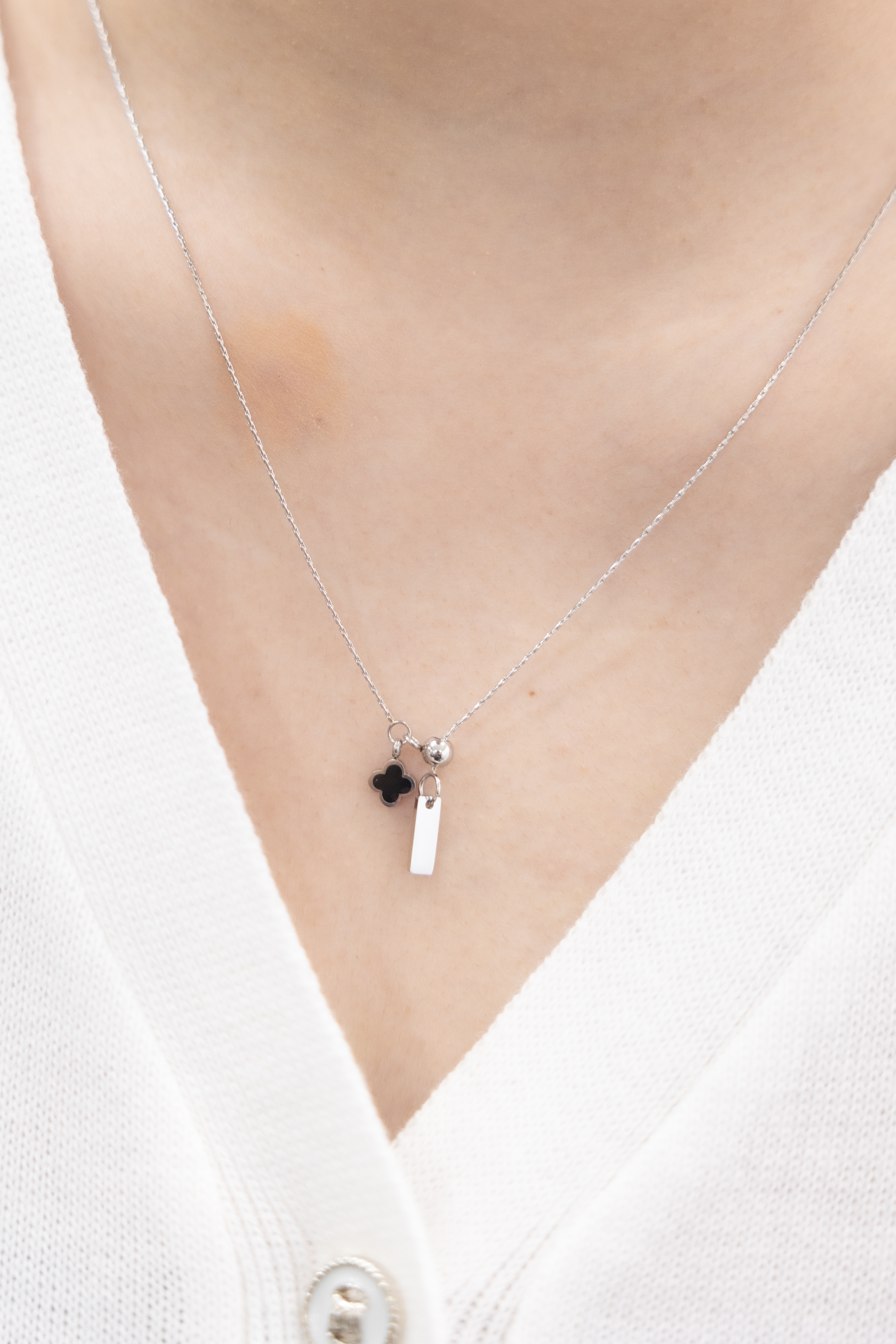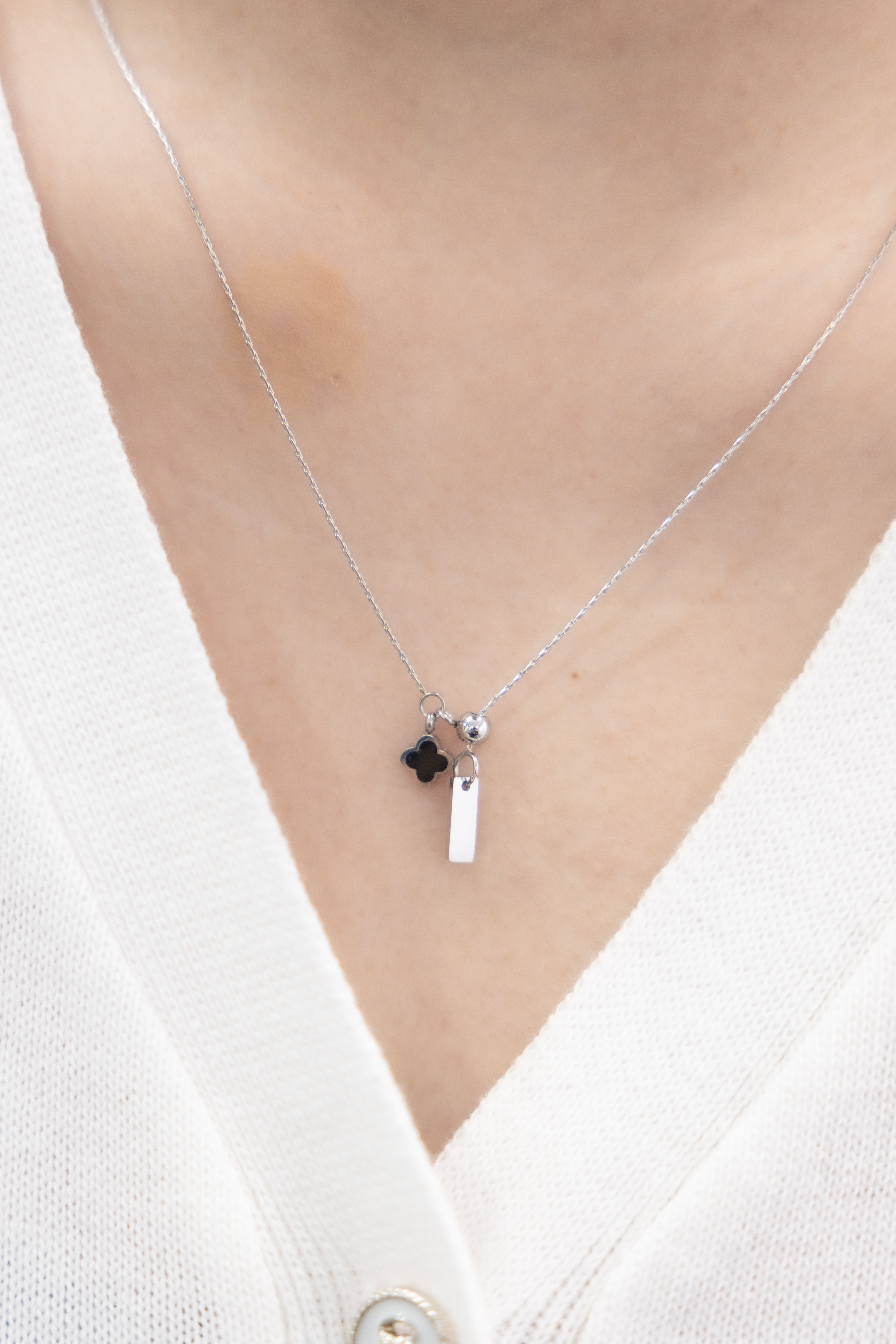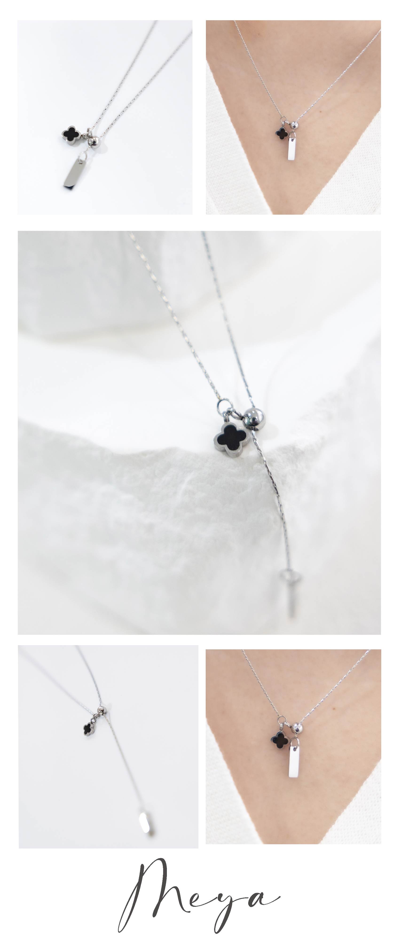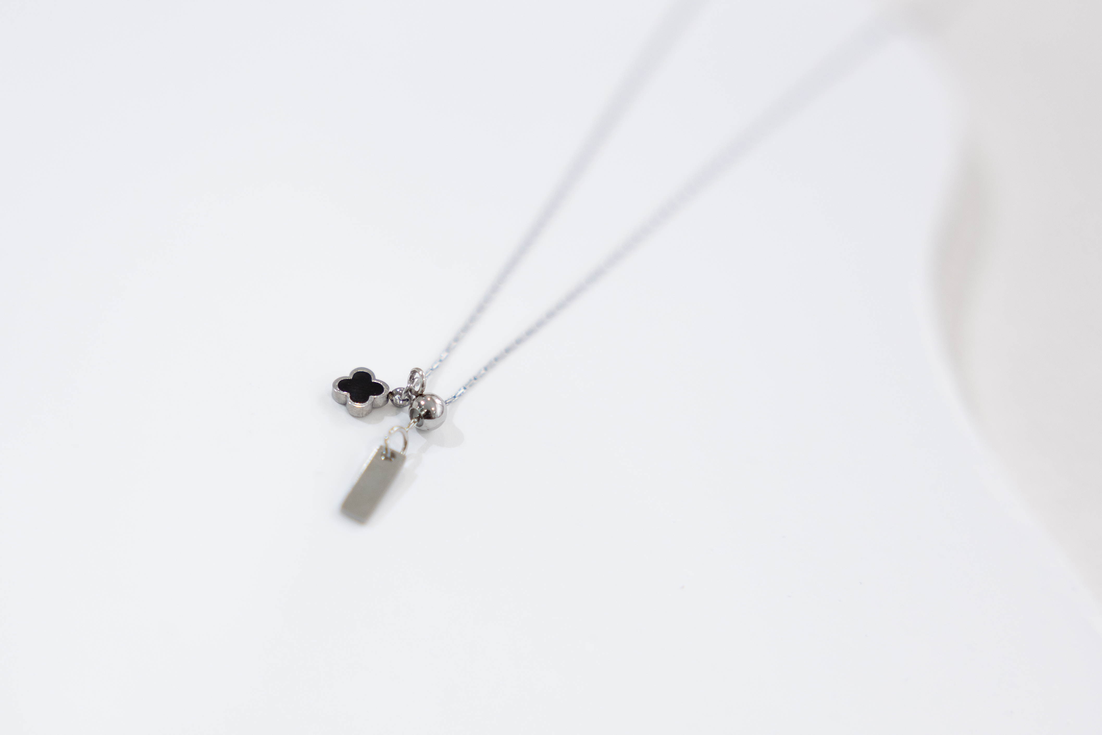 목걸이 黑色四葉花朵Y字極細威尼斯鍊 / 銀色