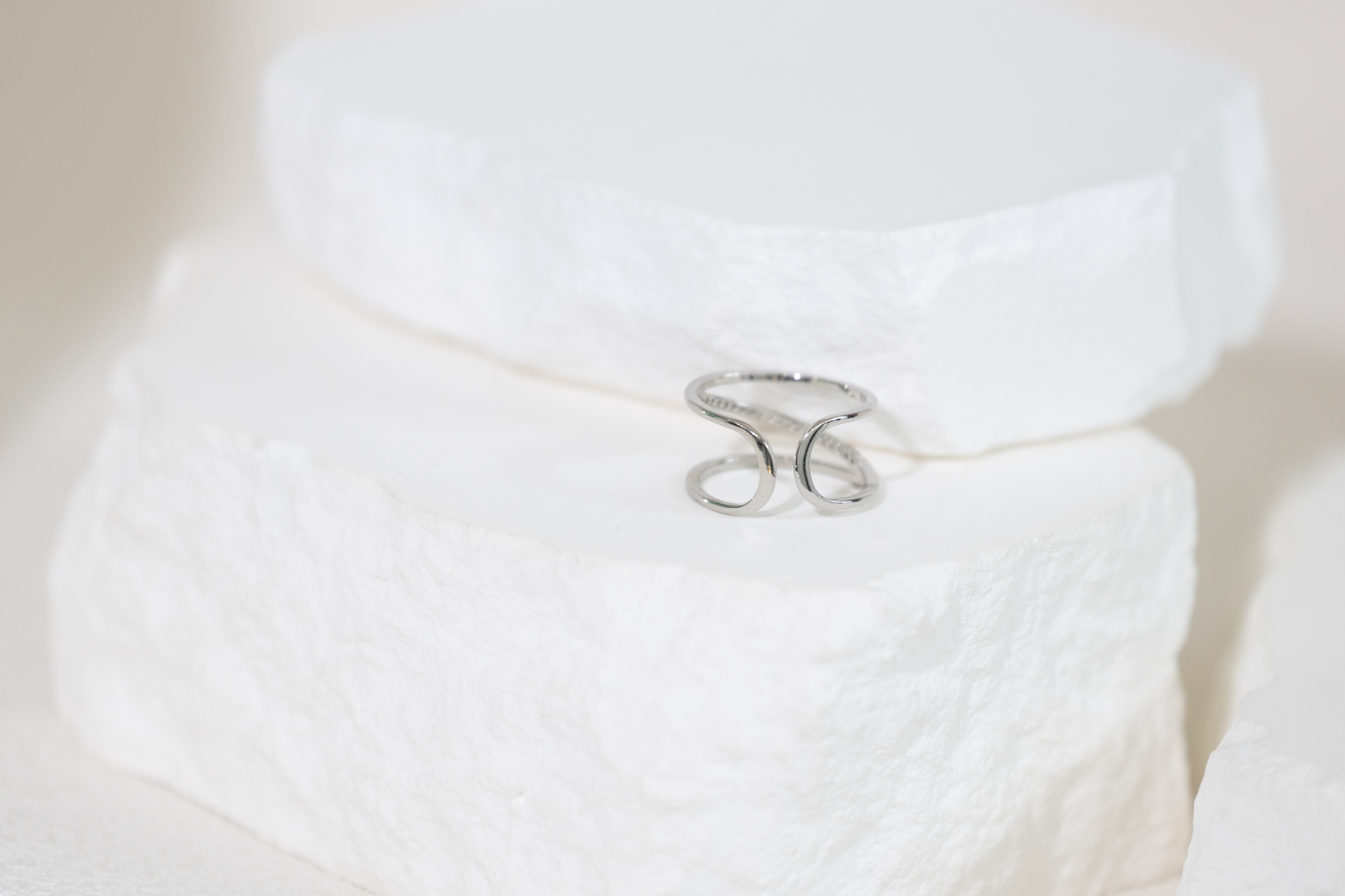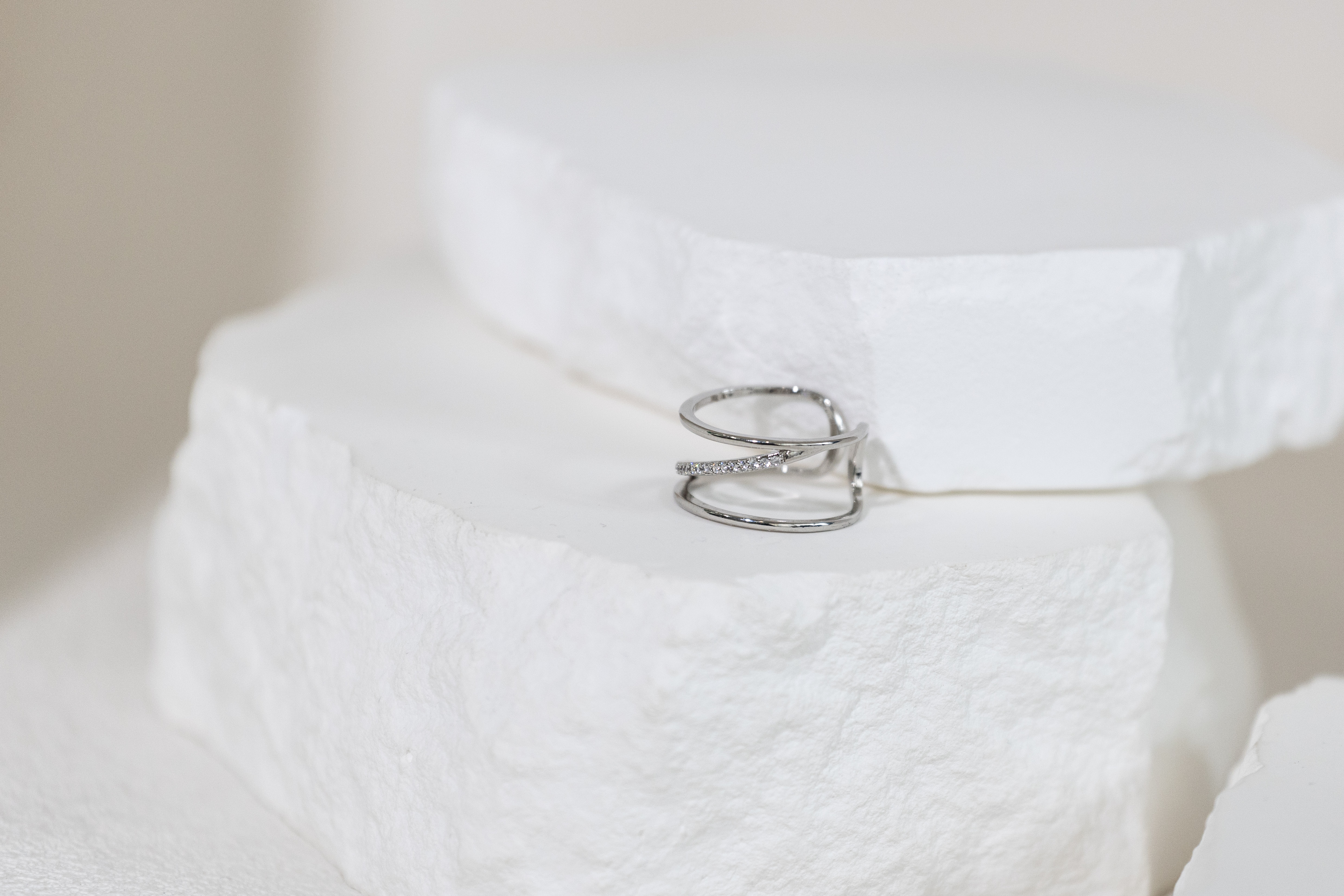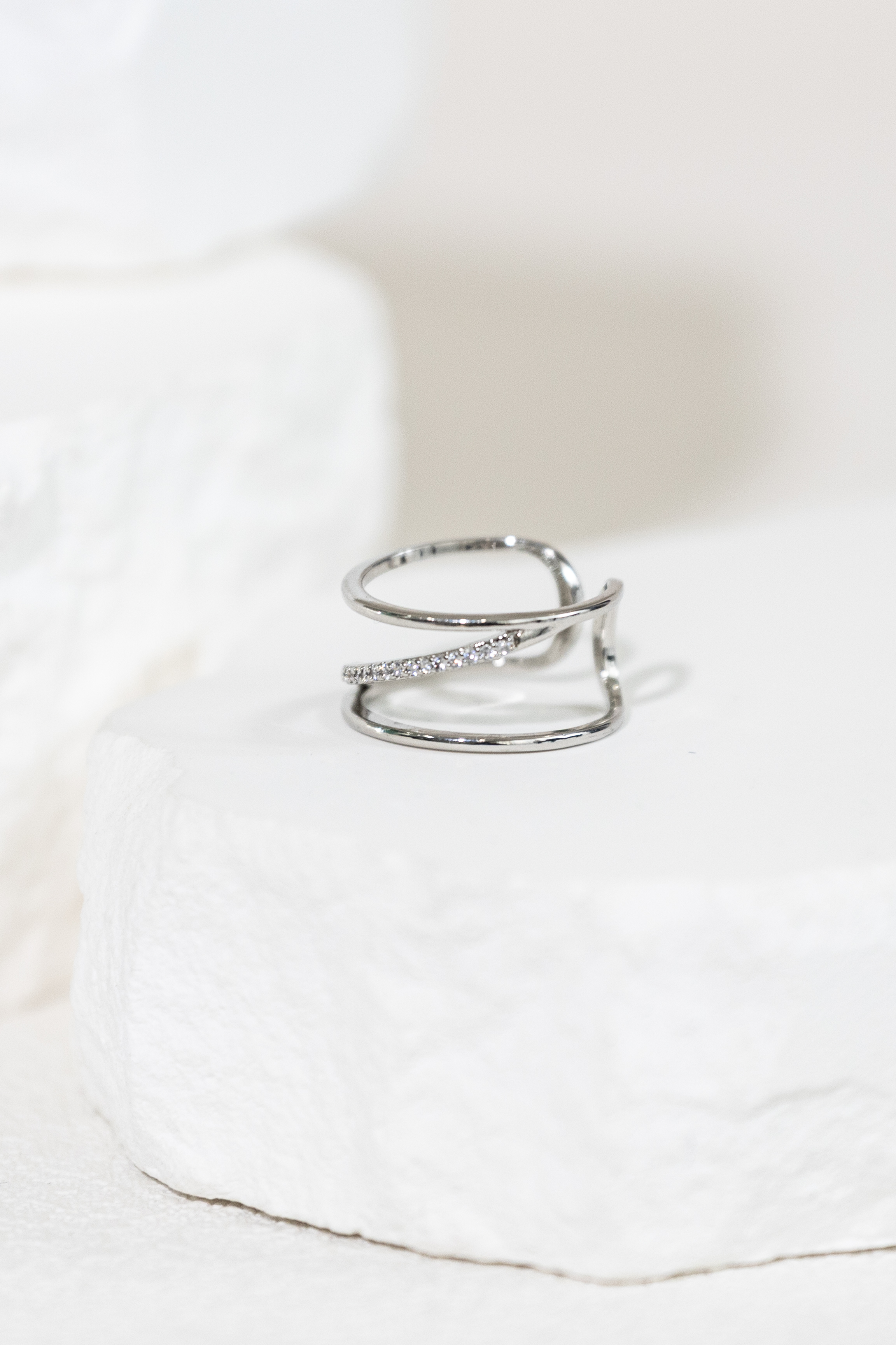 반지 雙層中間斜線多顆小鋯石開口式戒指 / 銀色