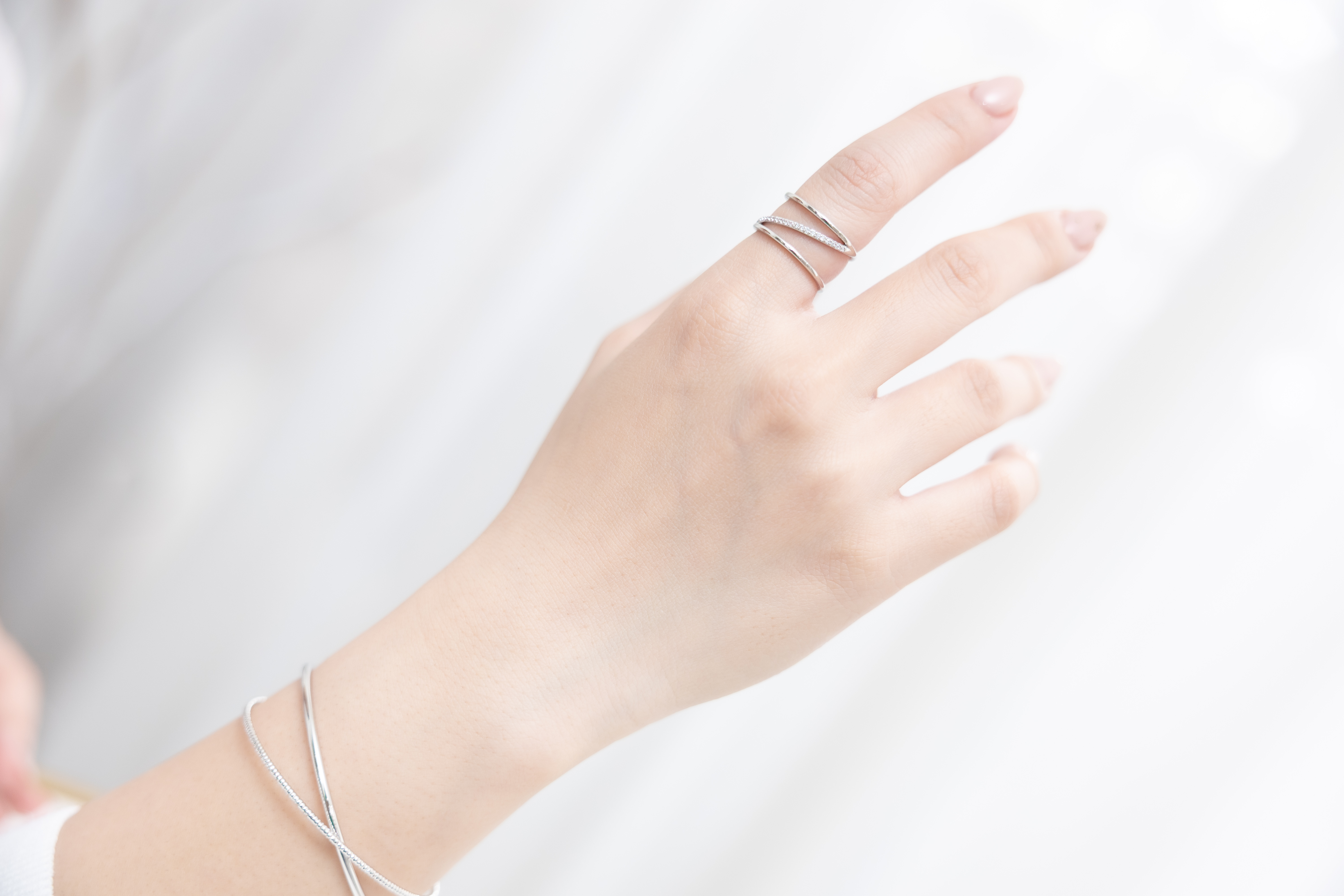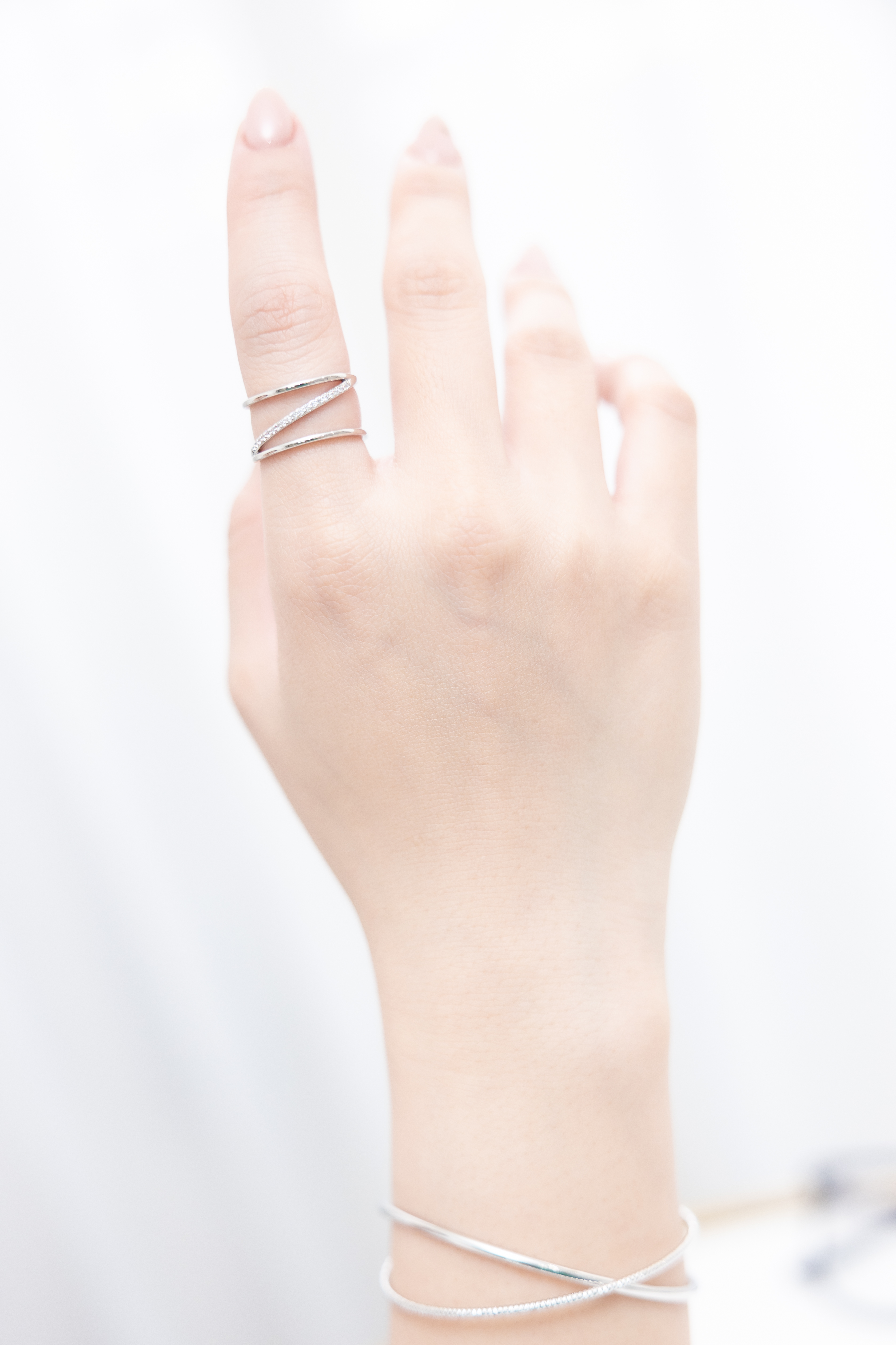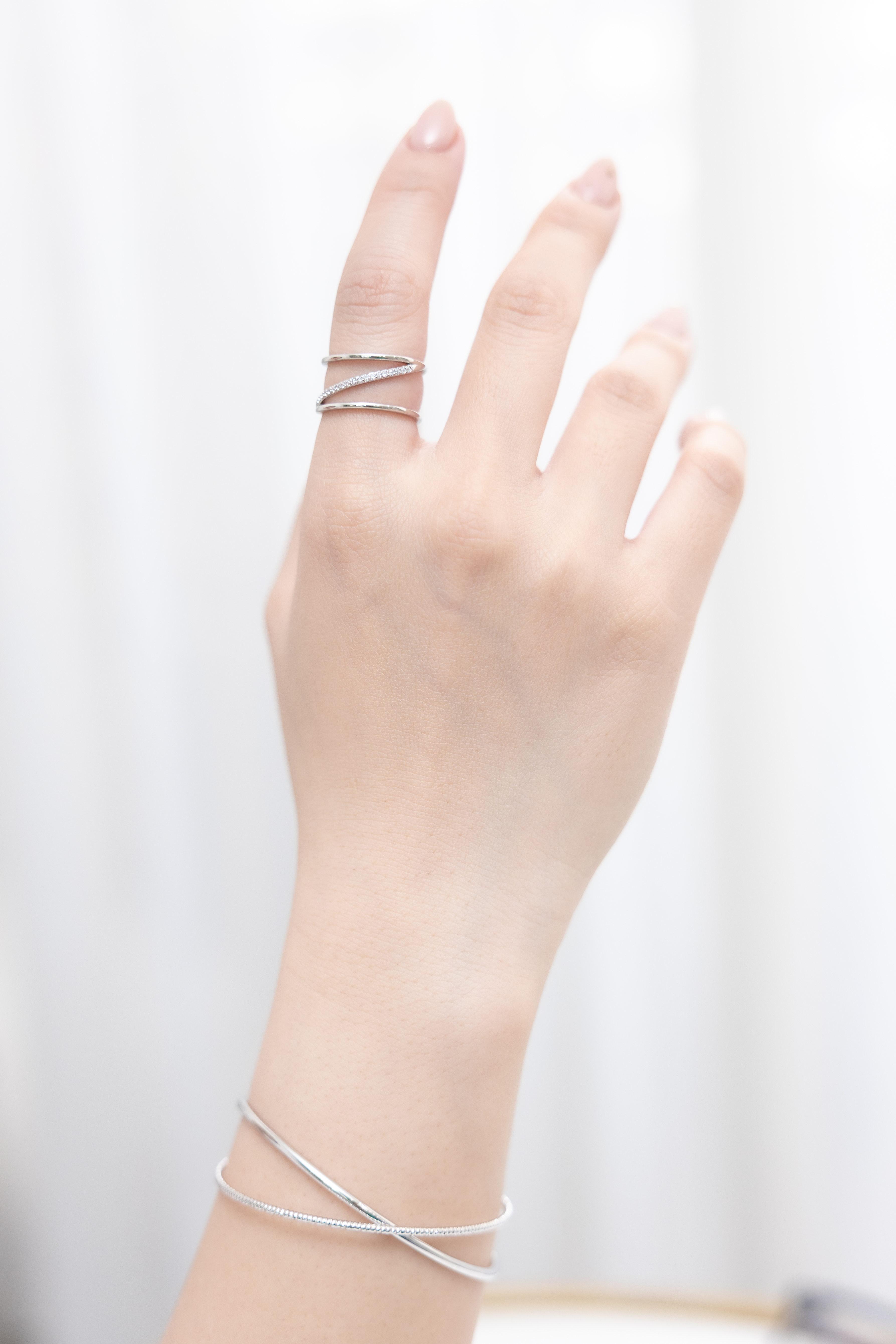 반지 雙層中間斜線多顆小鋯石開口式戒指 / 銀色