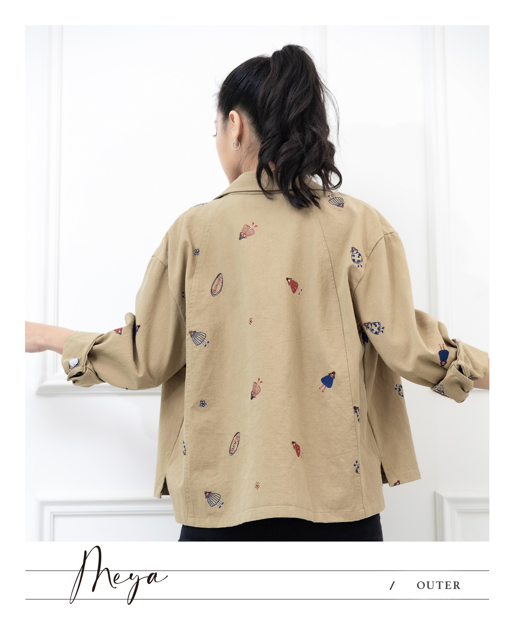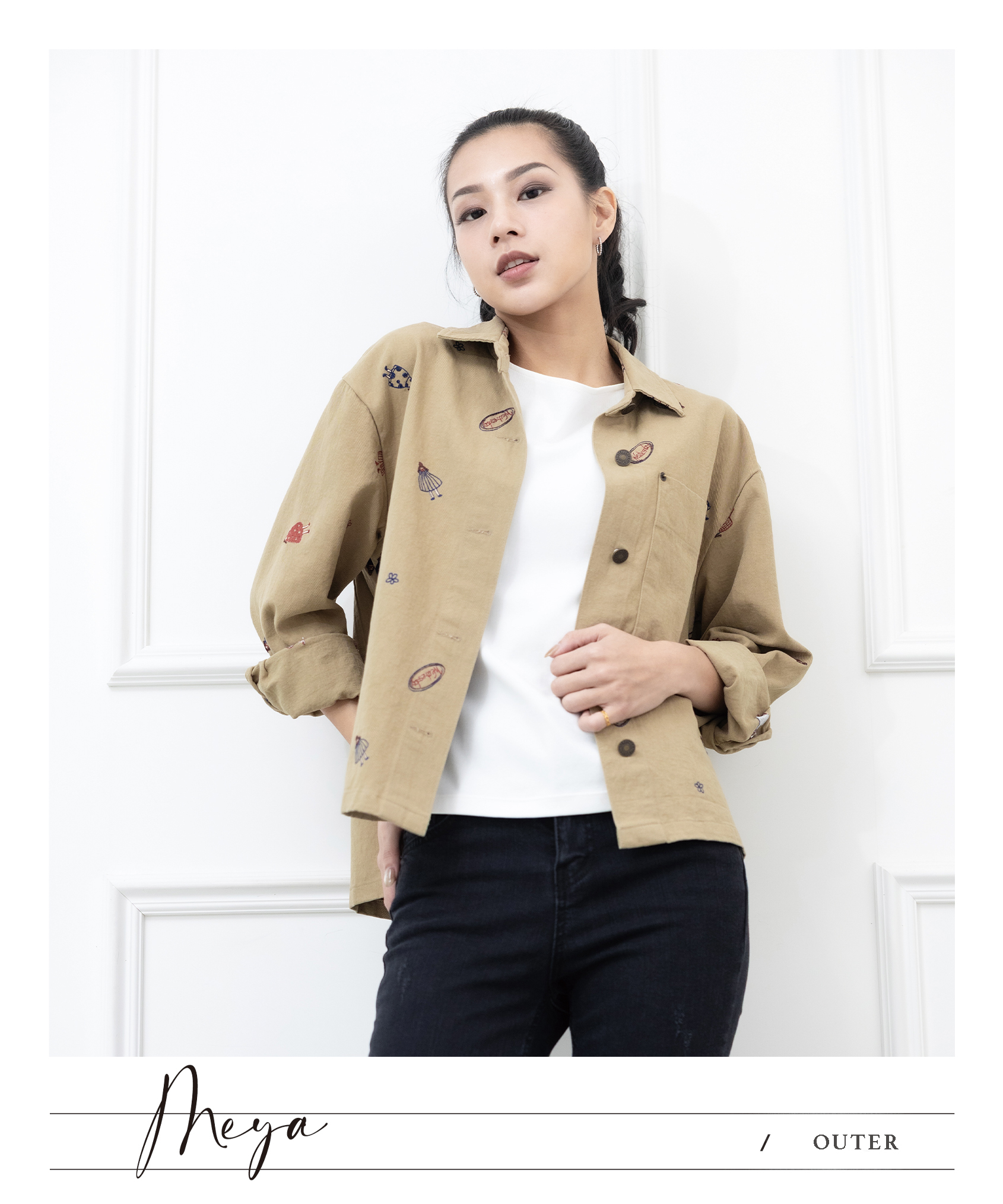 반팔刺繡圖樣襯衫 小人物圖樣 / 棕綠色