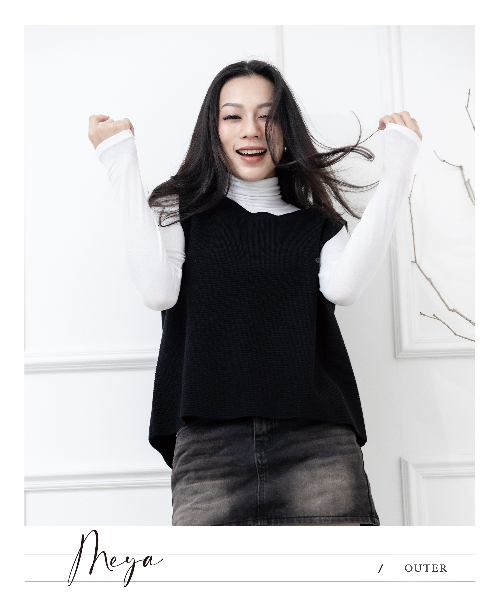 반팔圓領背心 背面假排釦造型開洞設計 / 黑色