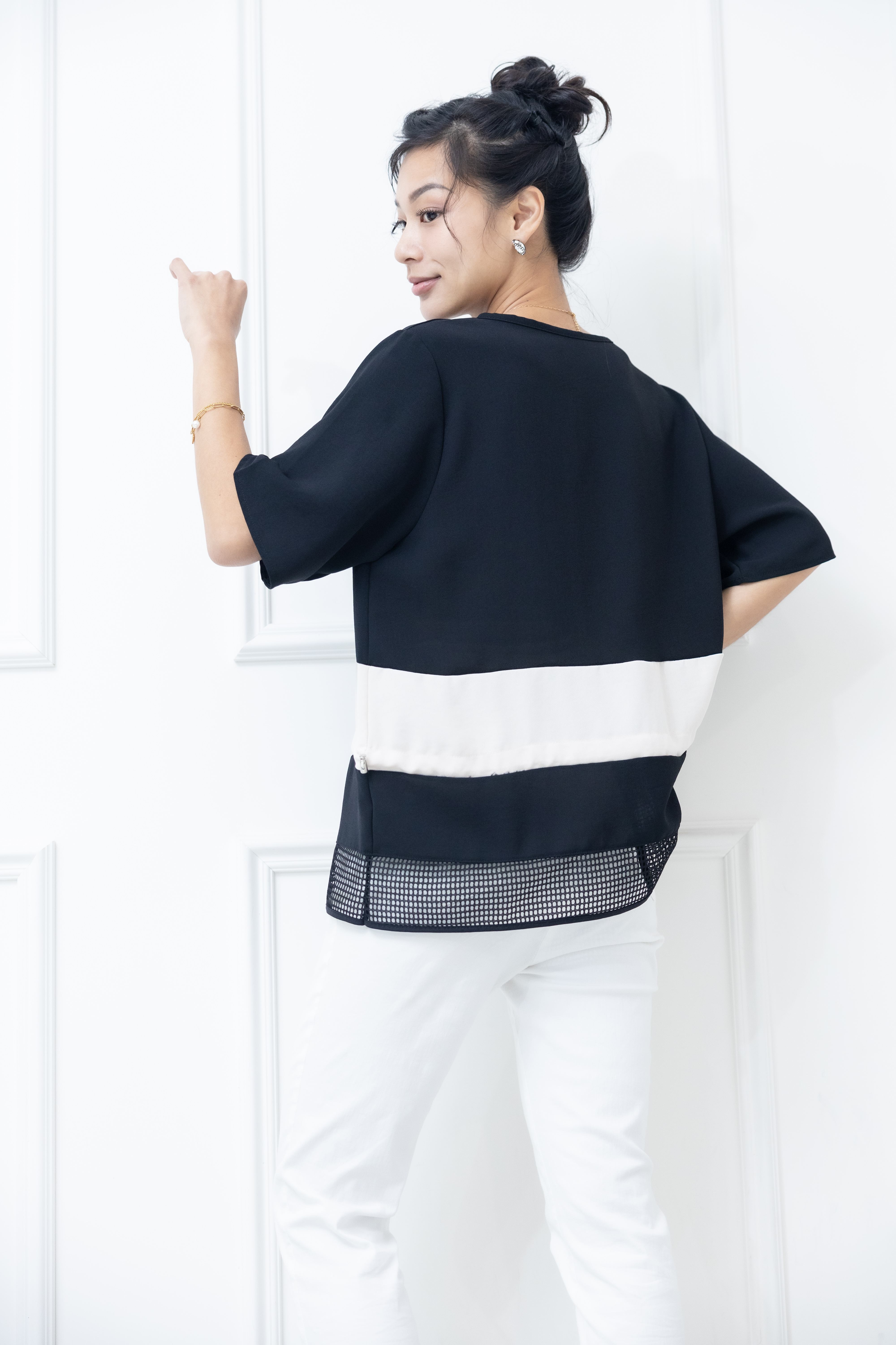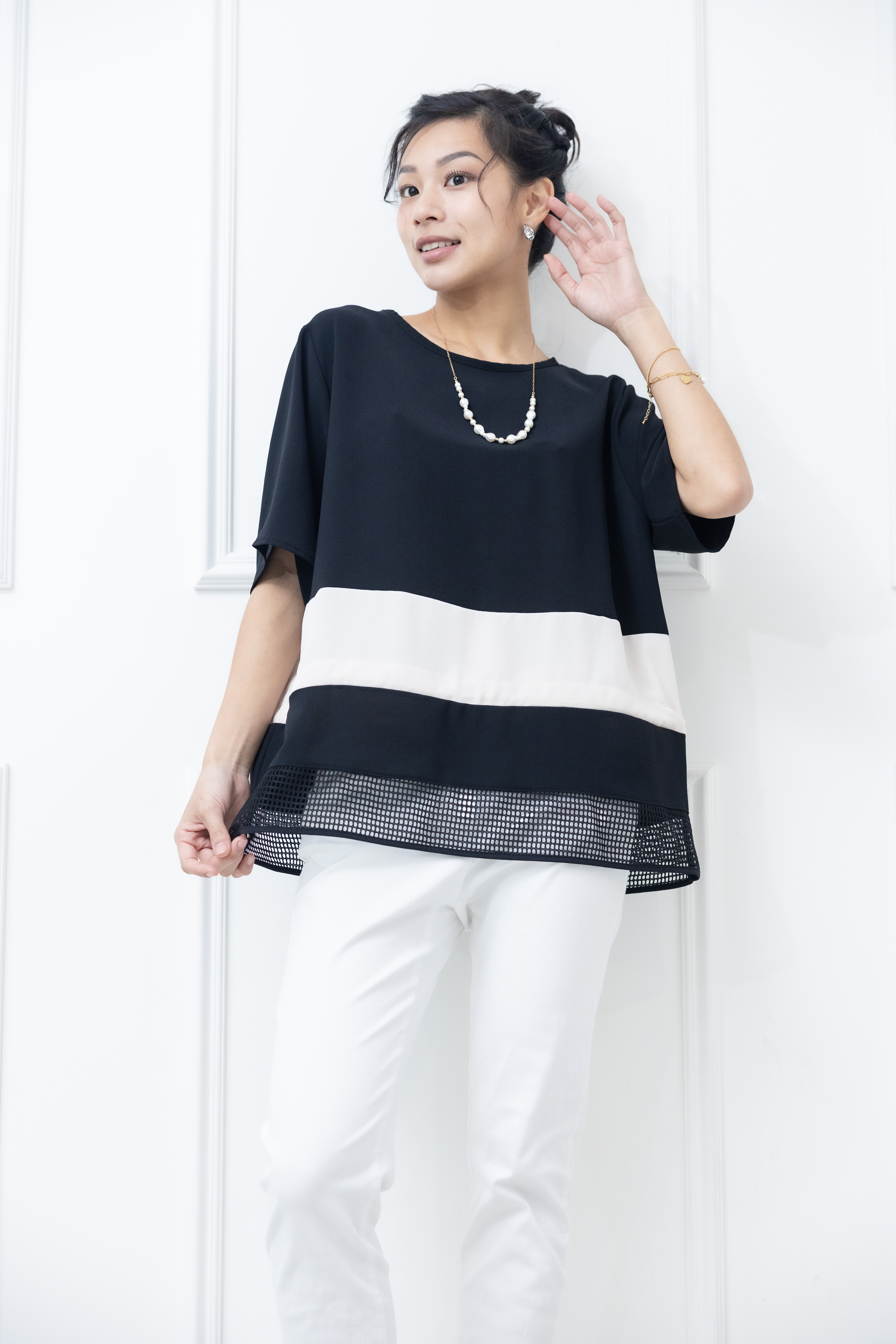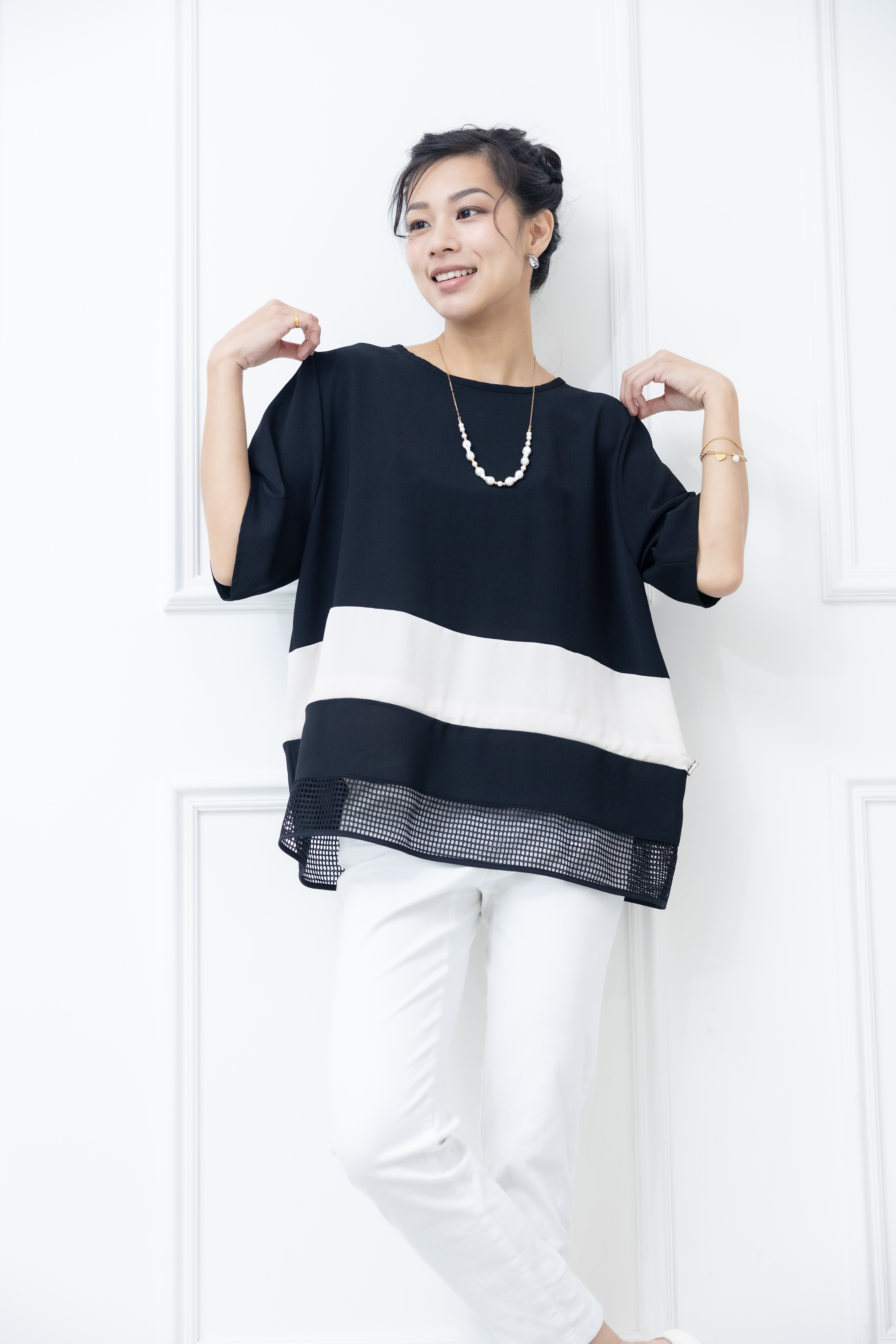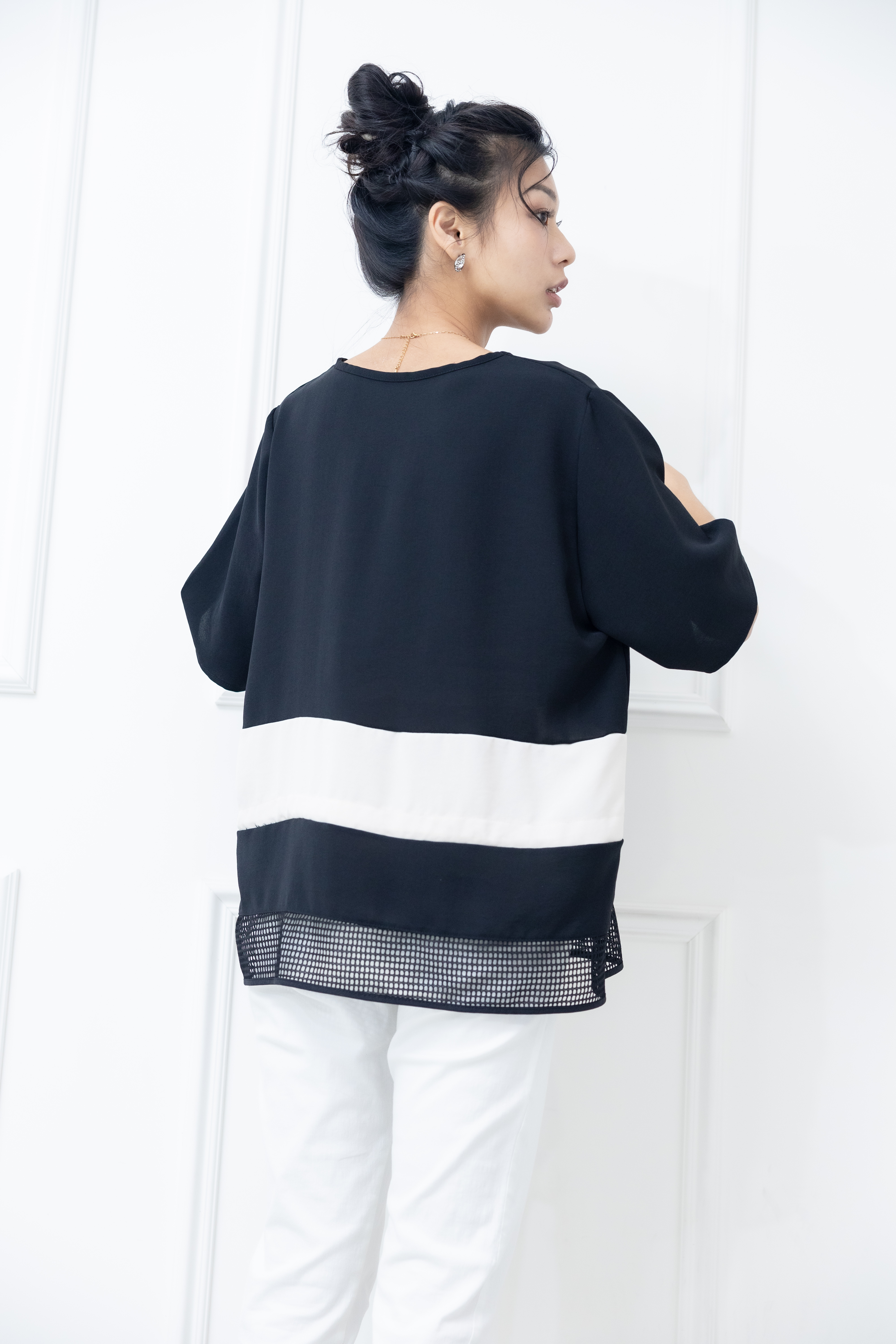 반팔 下擺裸空五分袖上衣 / 黑色絣米色