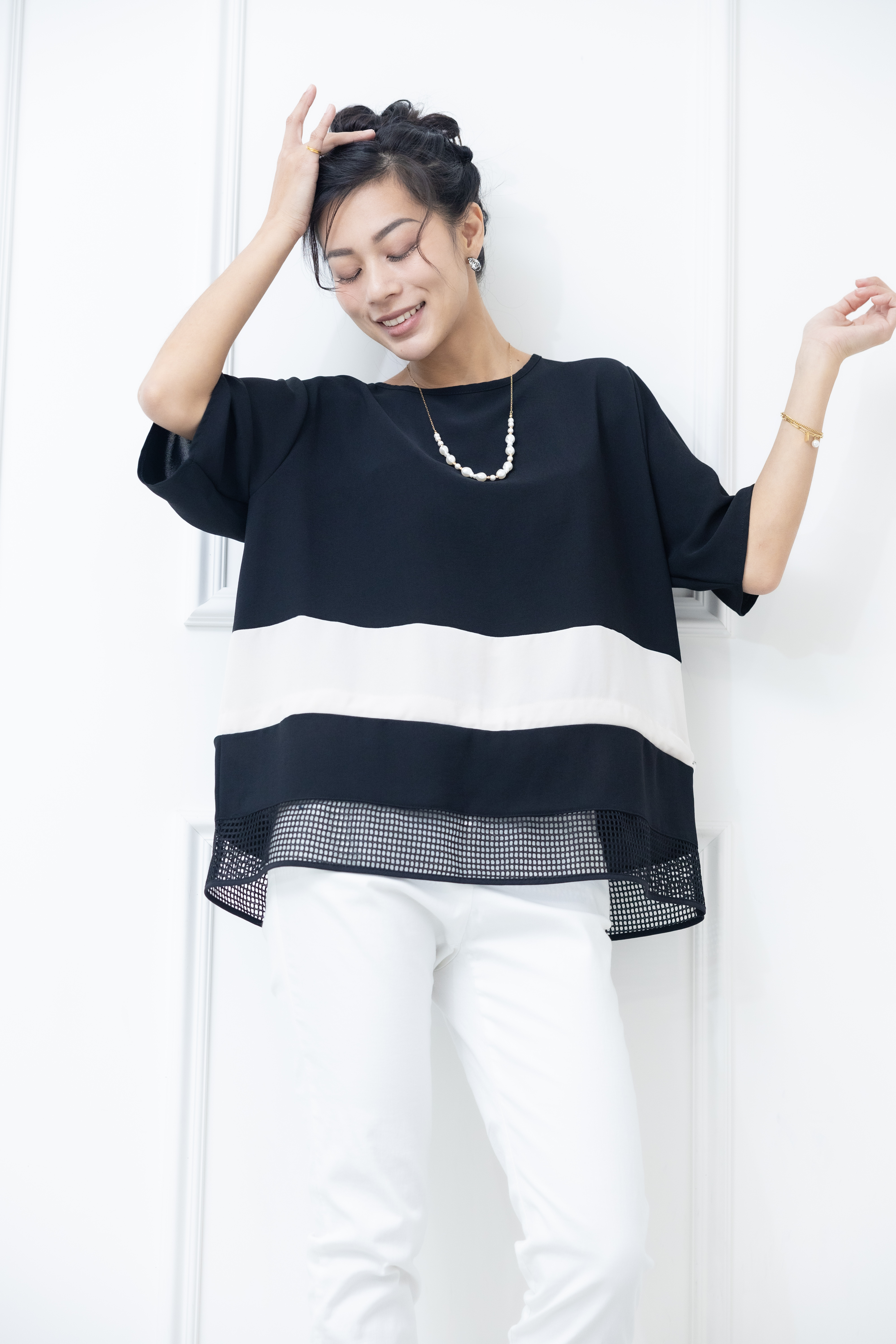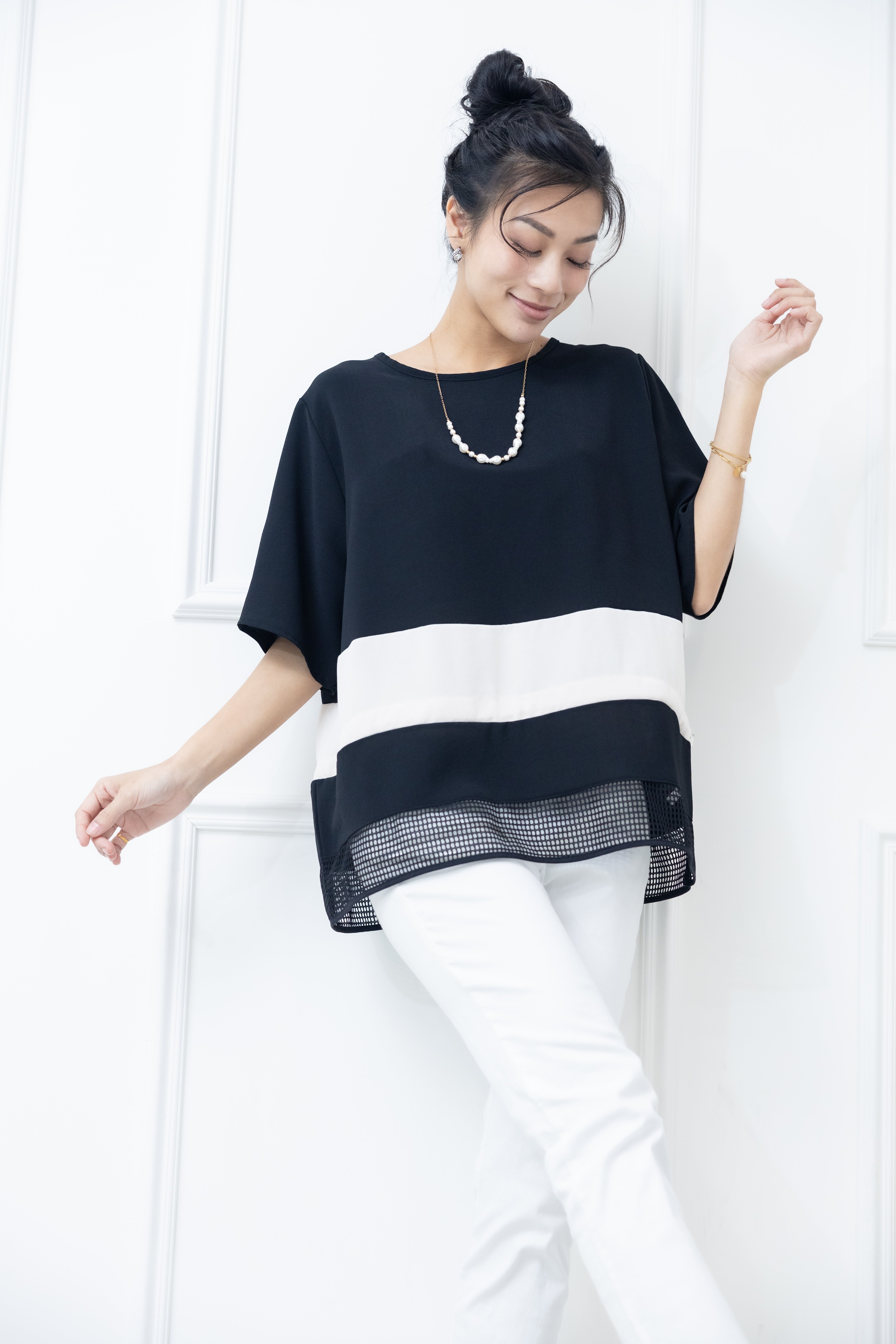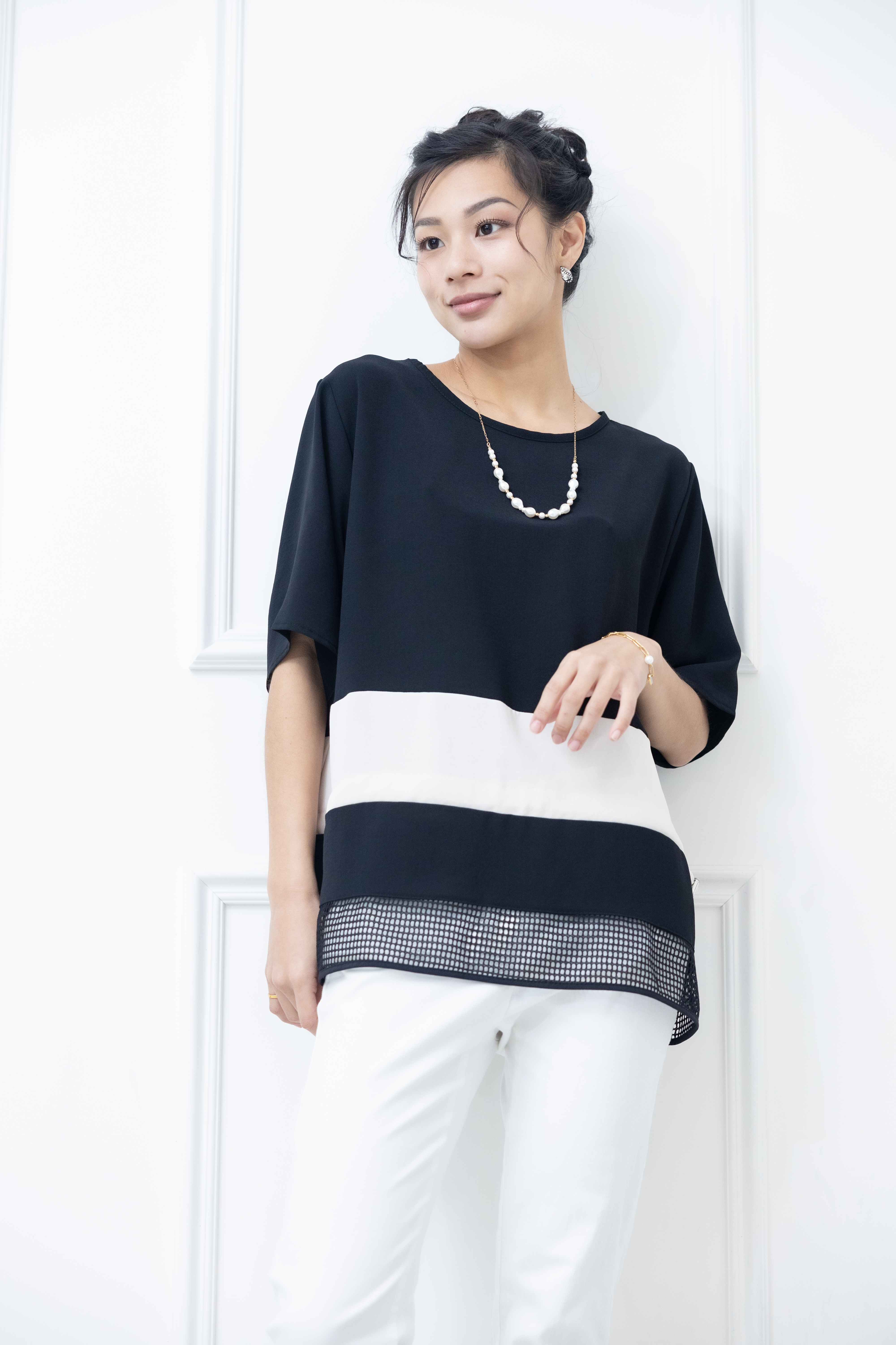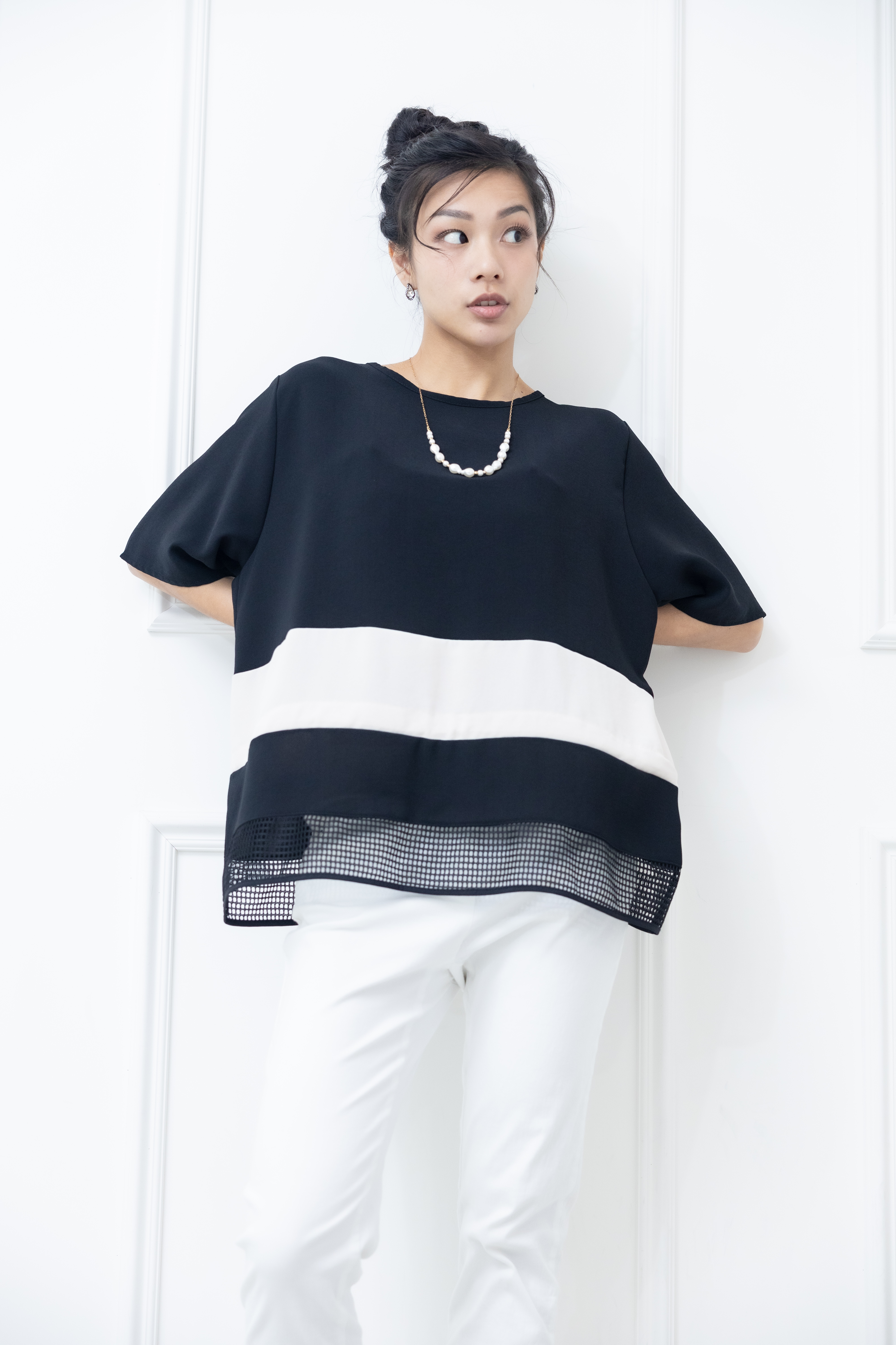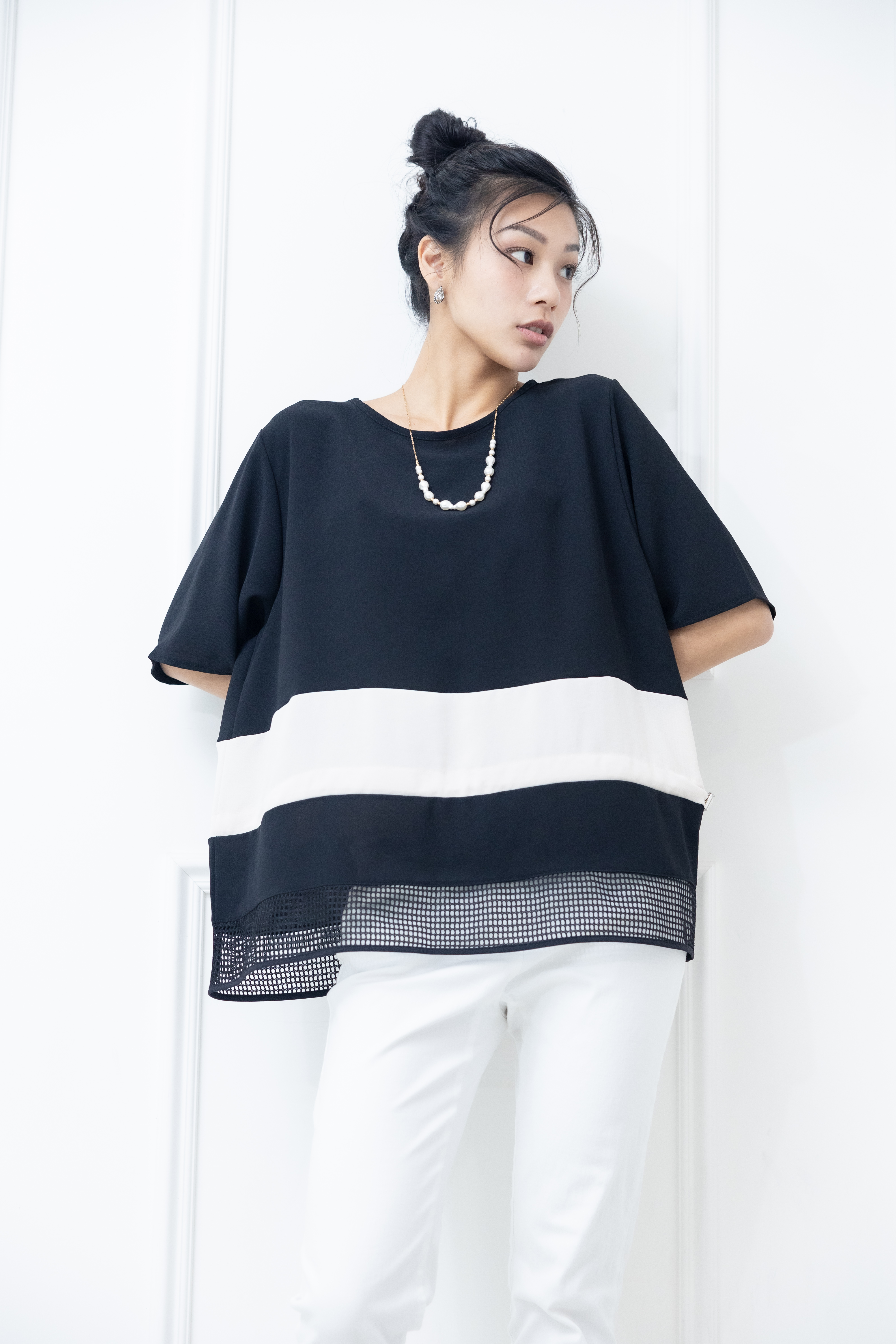 반팔 下擺裸空五分袖上衣 / 黑色絣米色