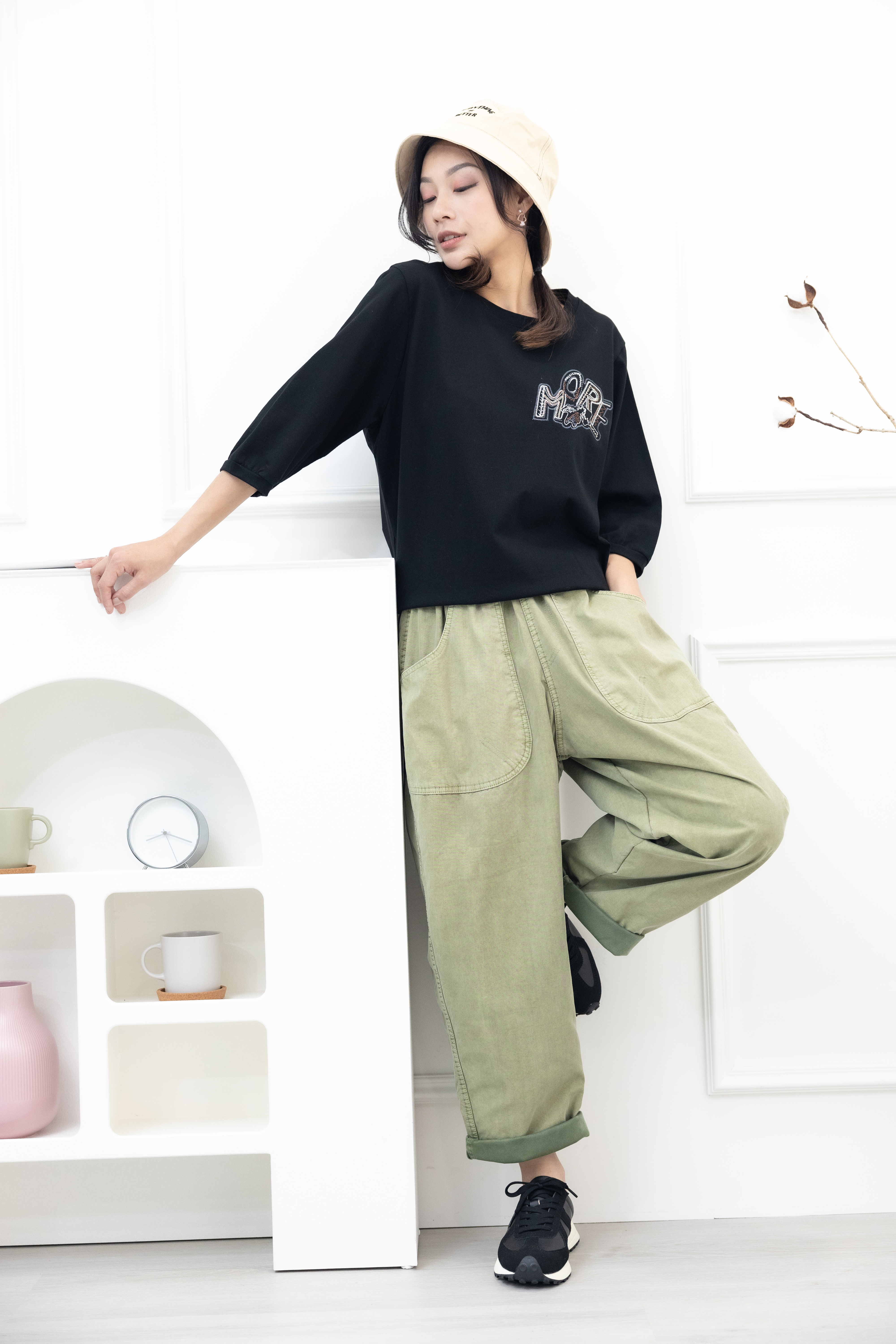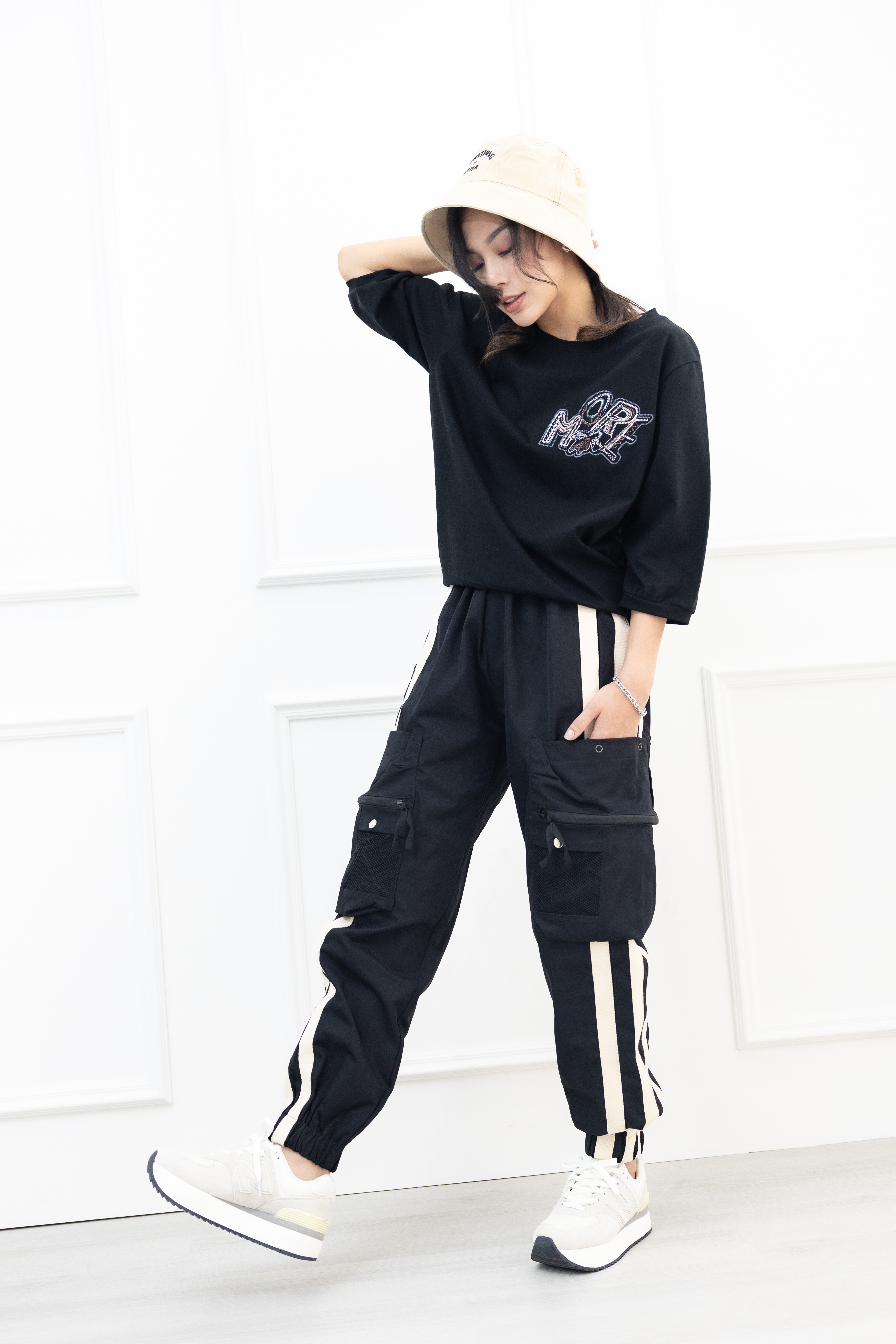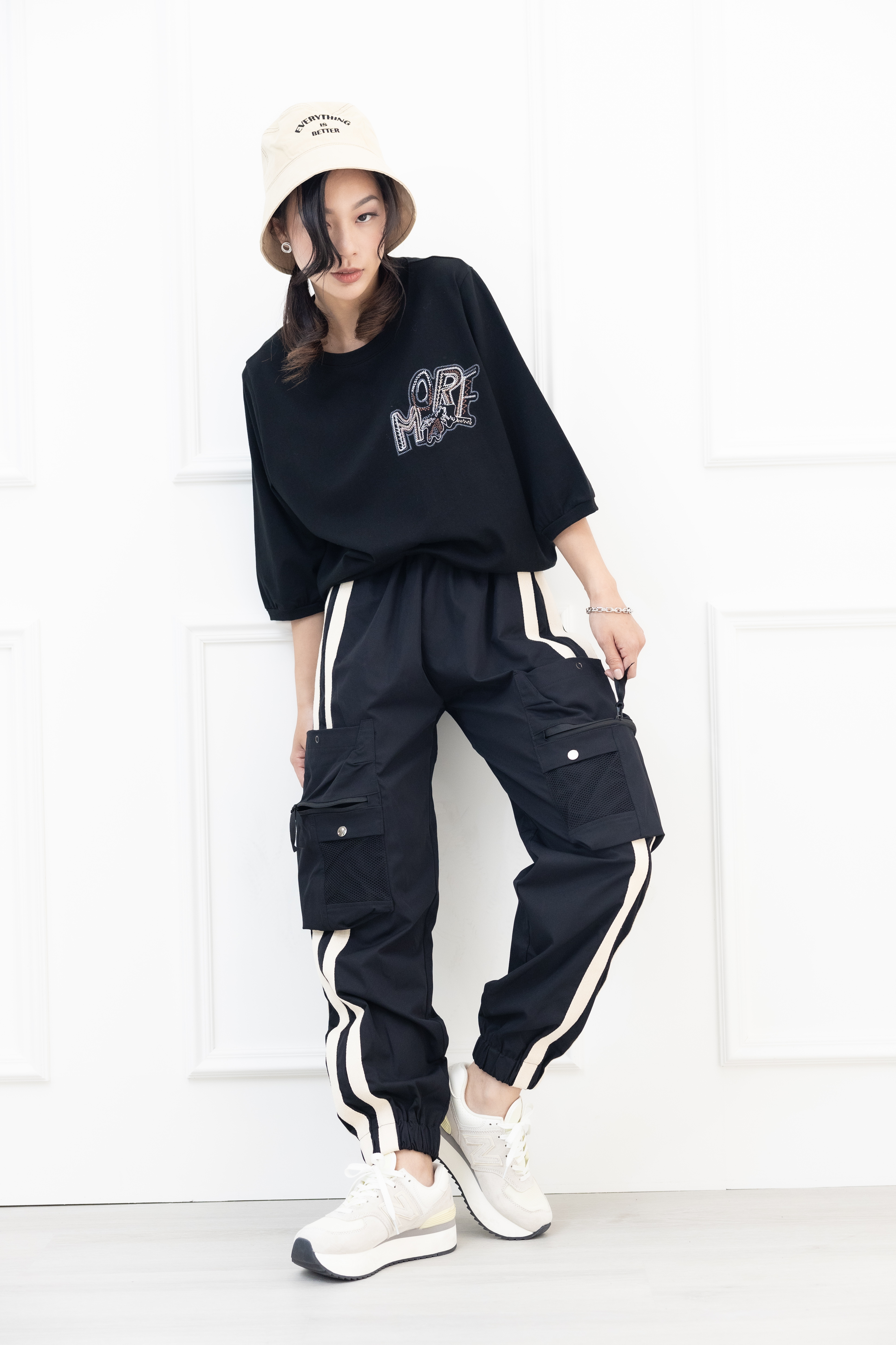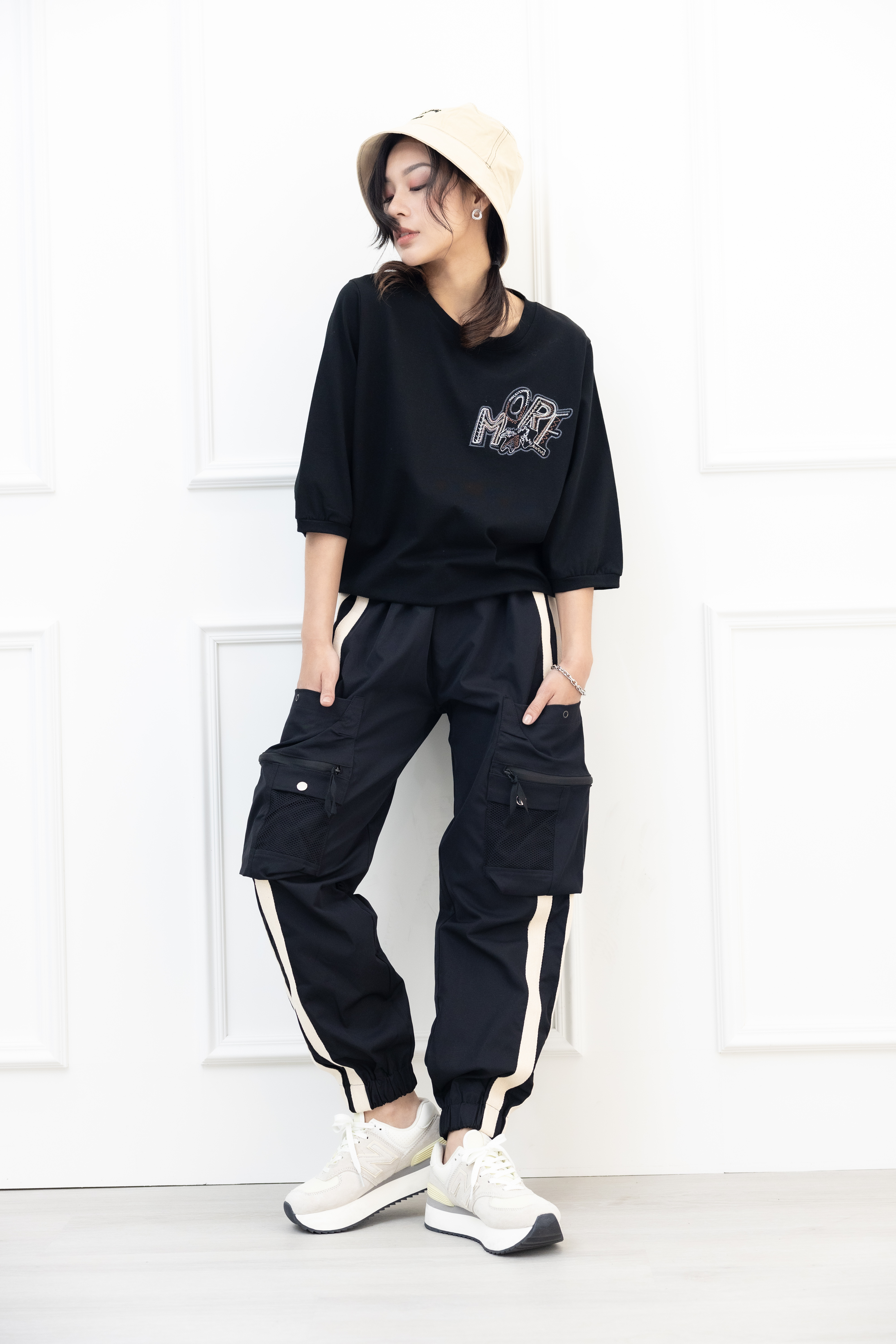 반팔 刺繡塗鴉字體彈性短袖上衣/黑色