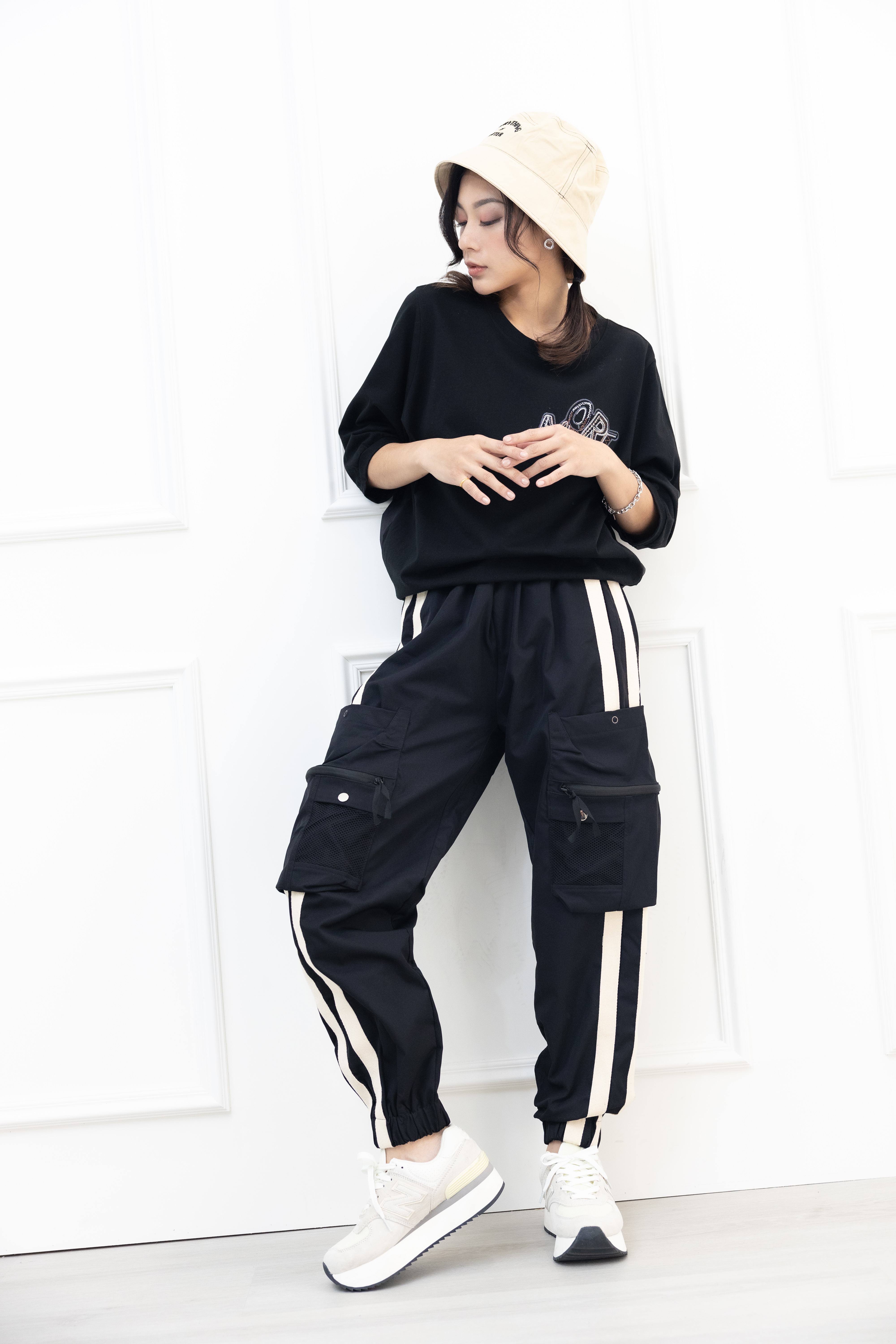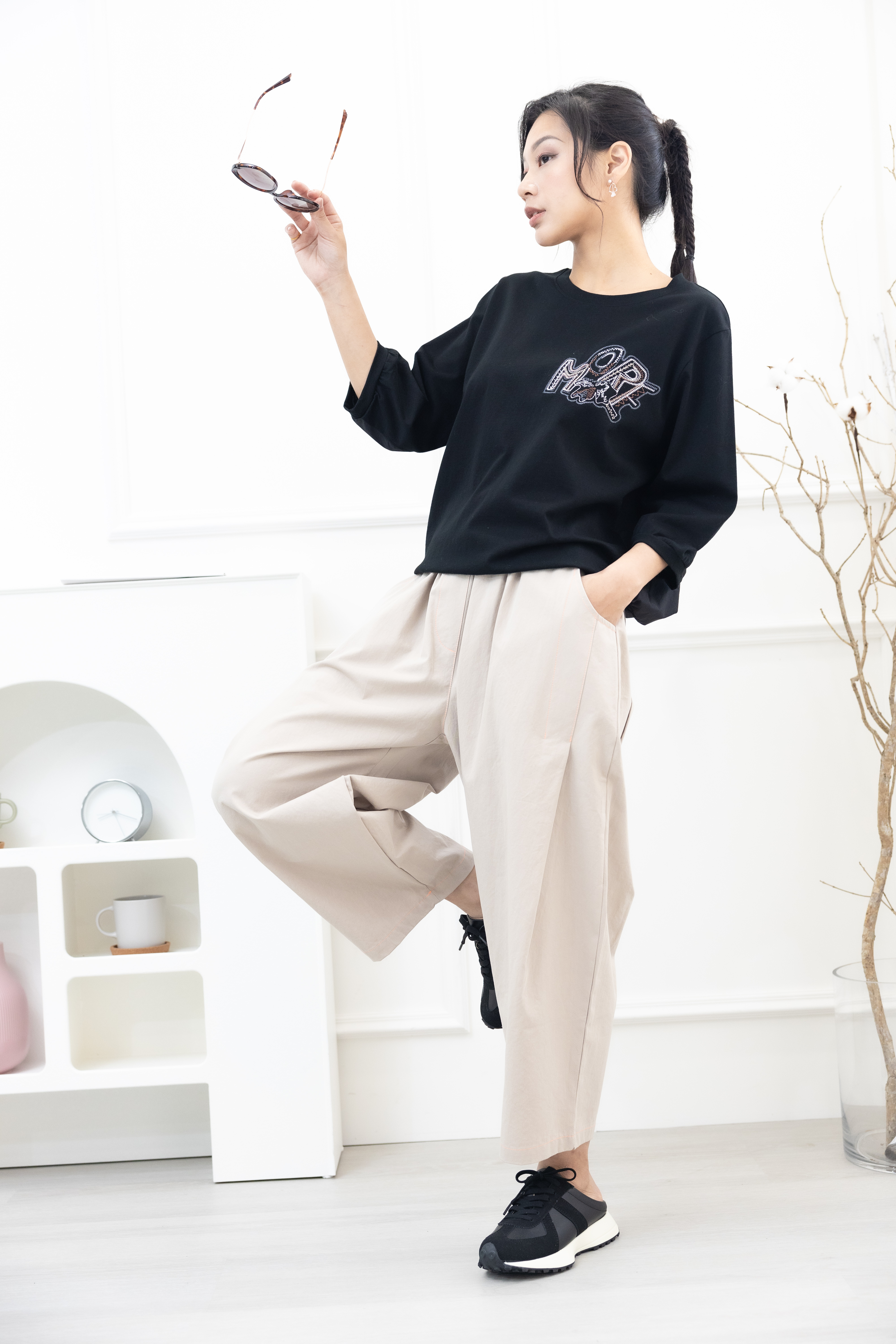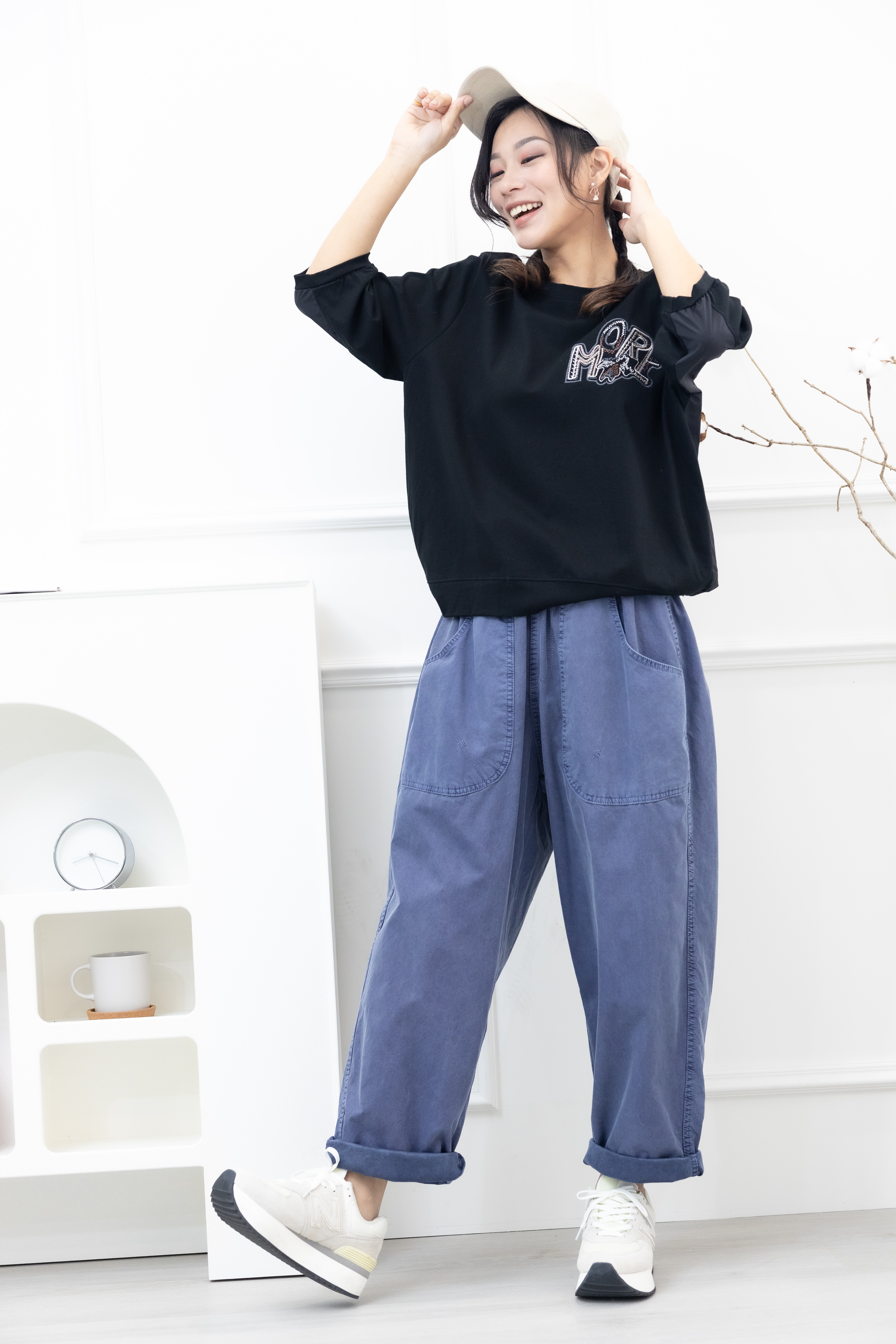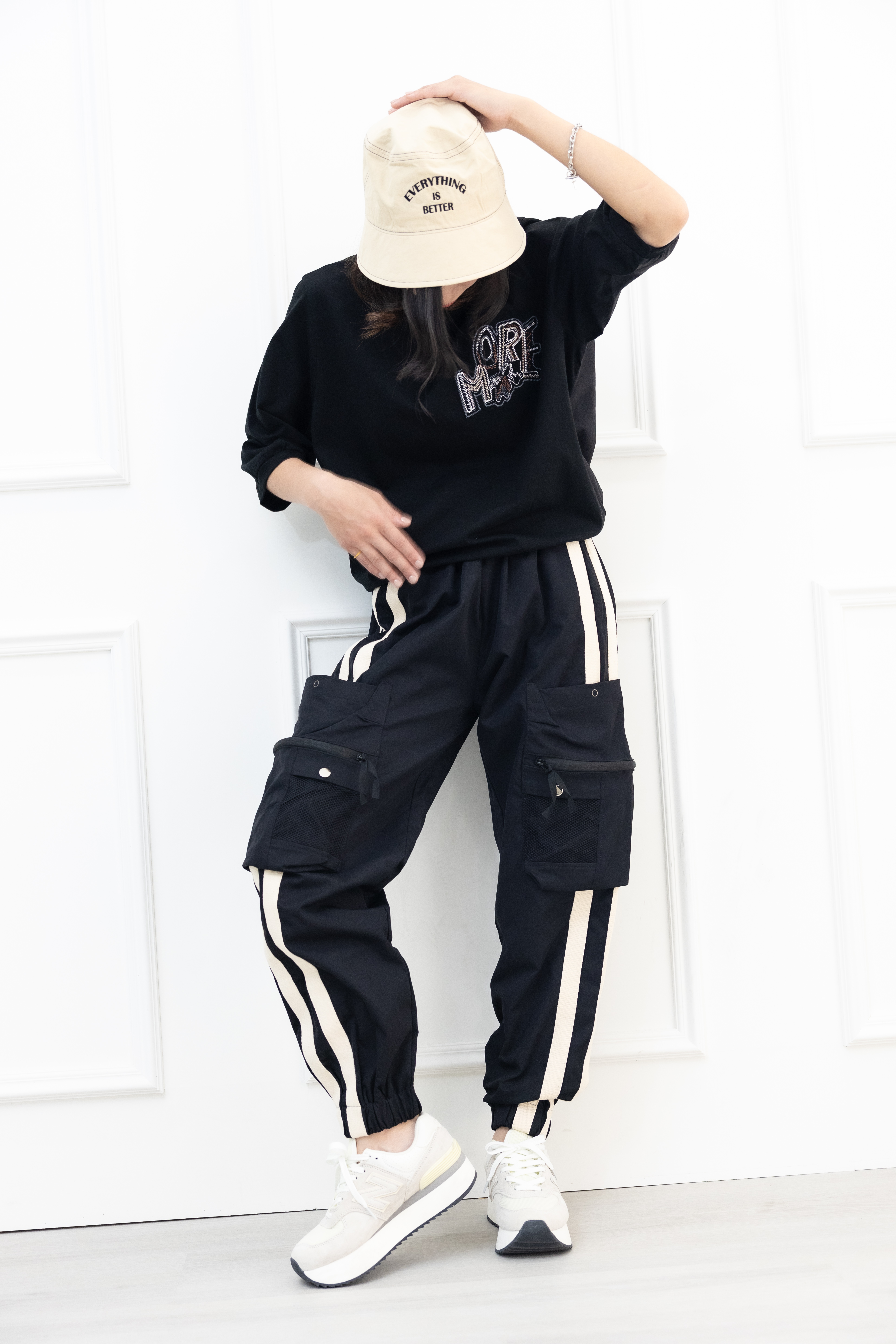 반팔 刺繡塗鴉字體彈性短袖上衣/黑色