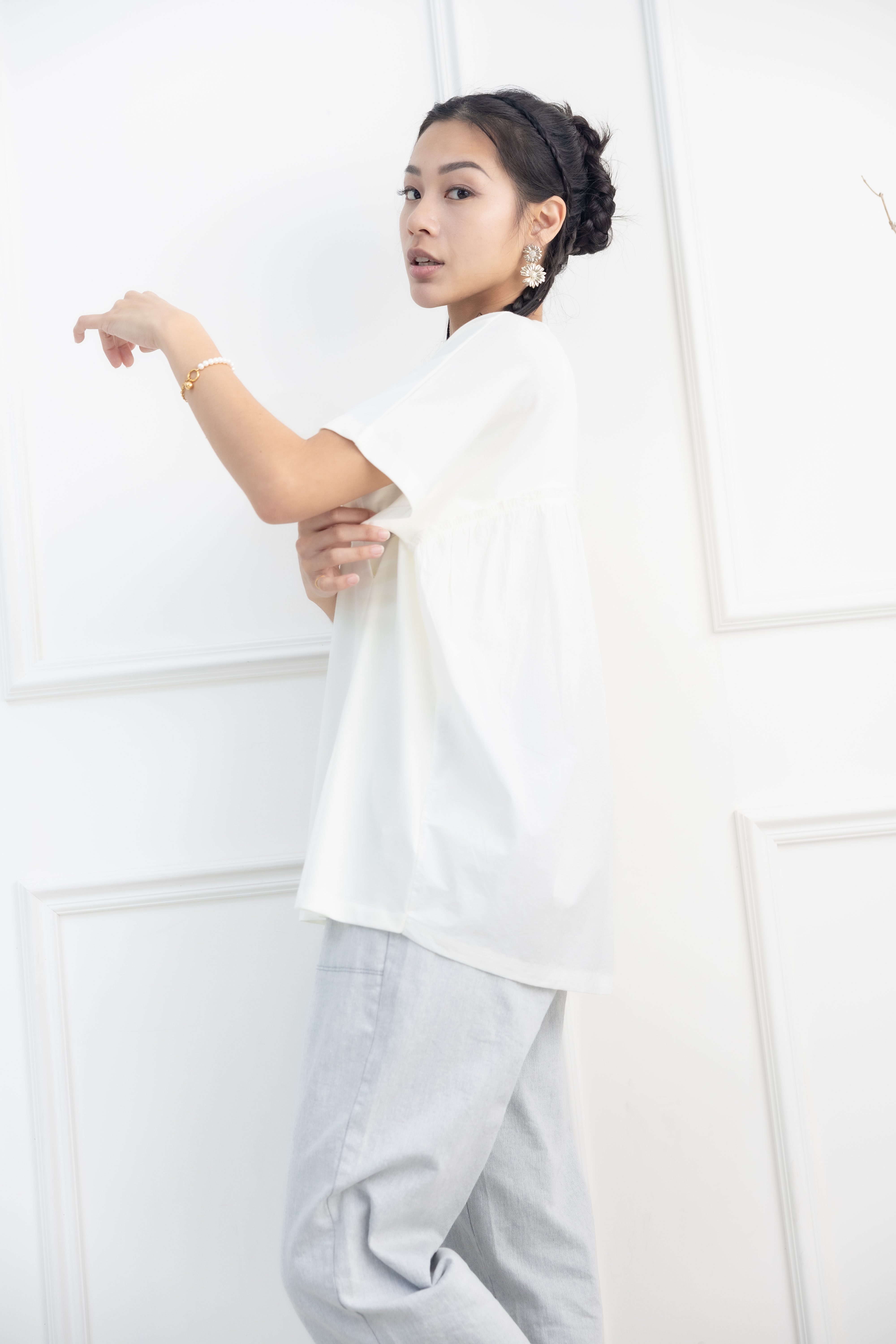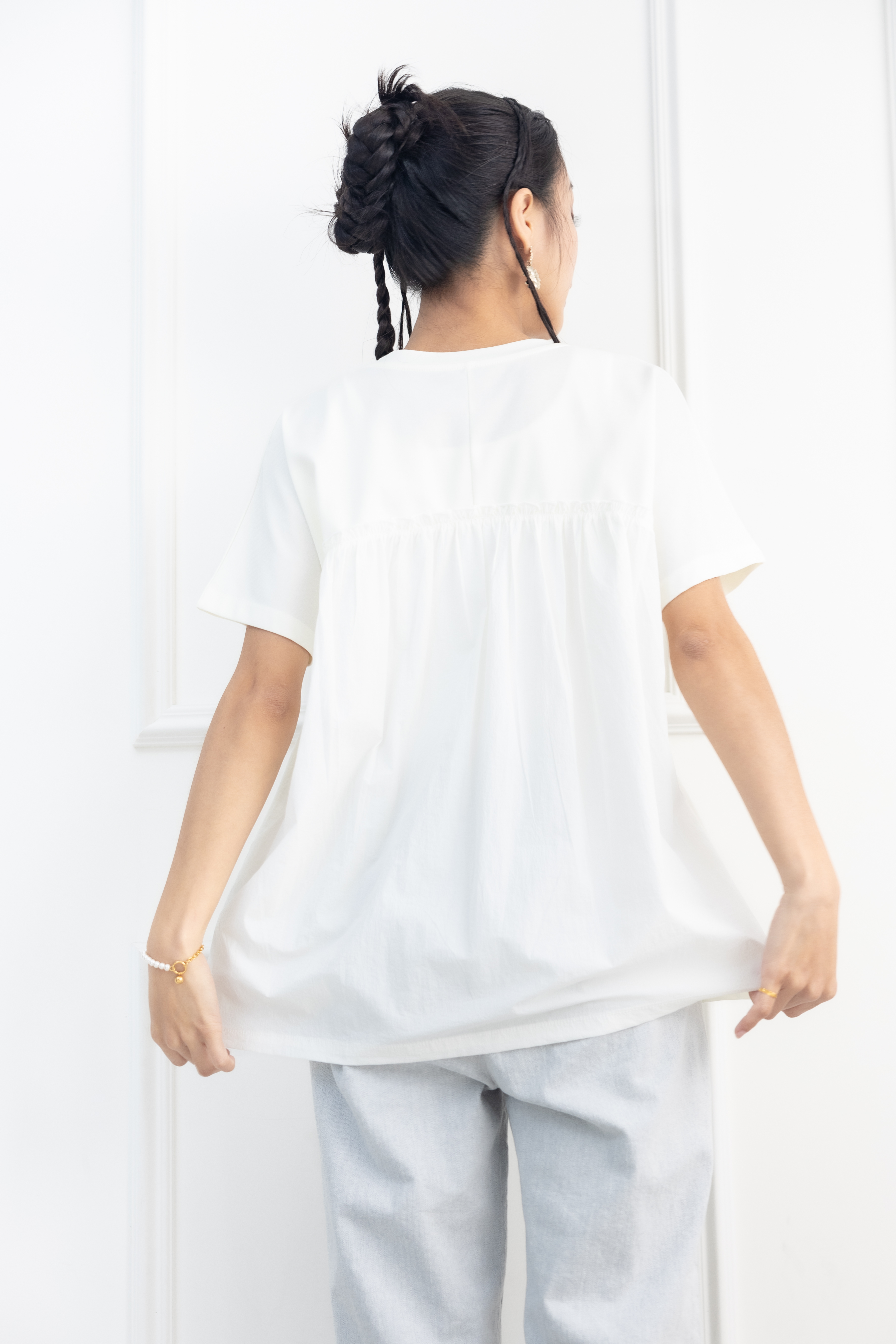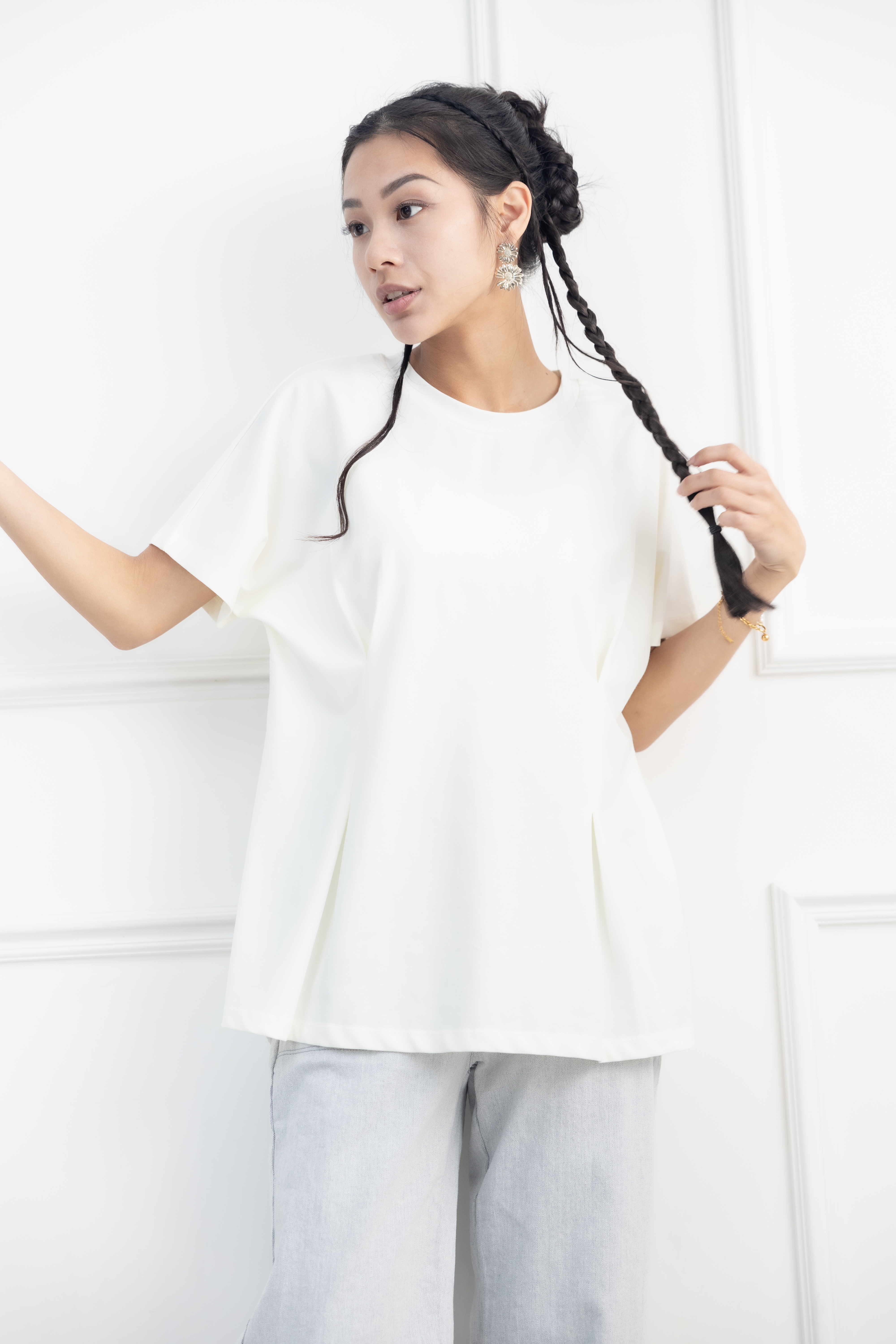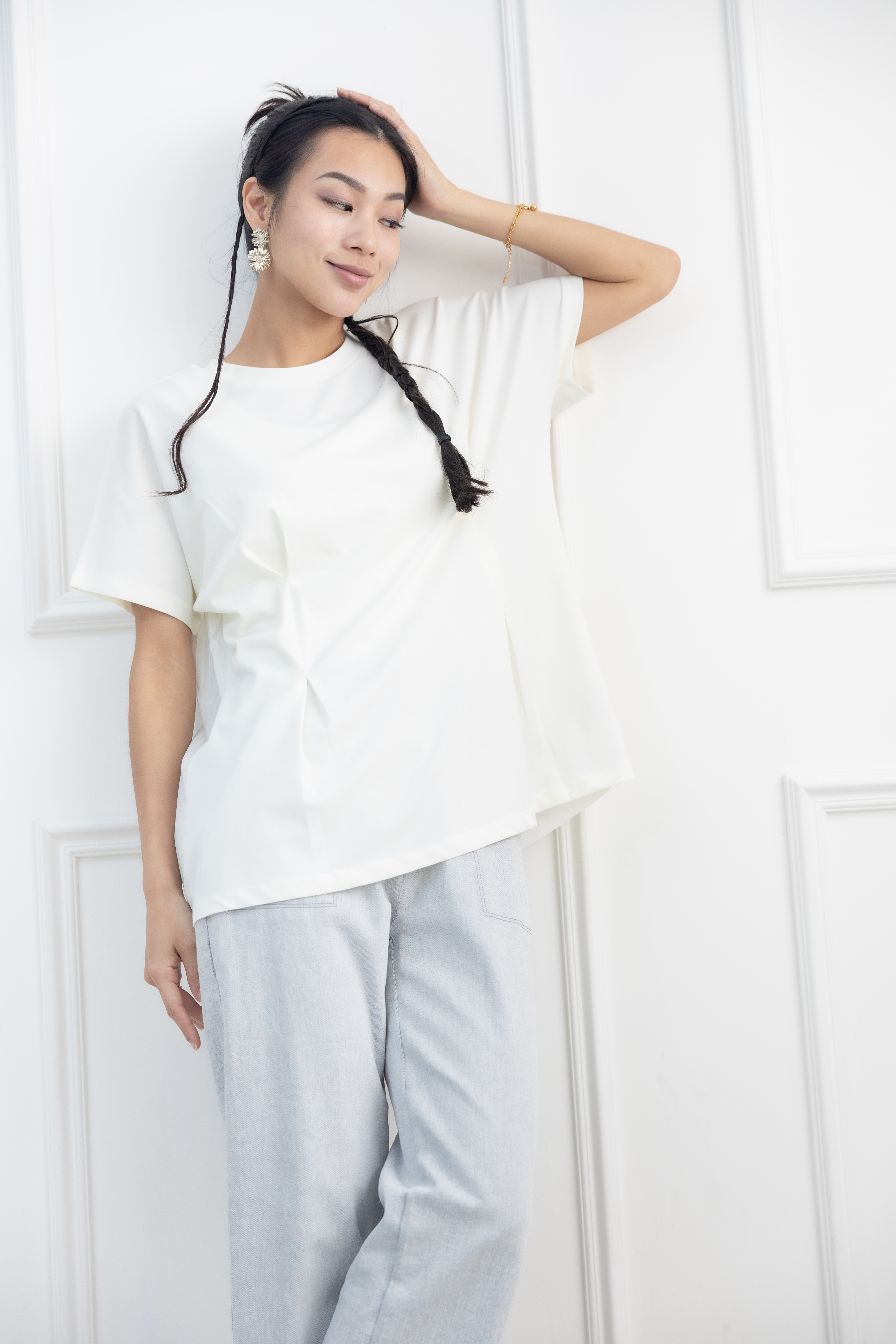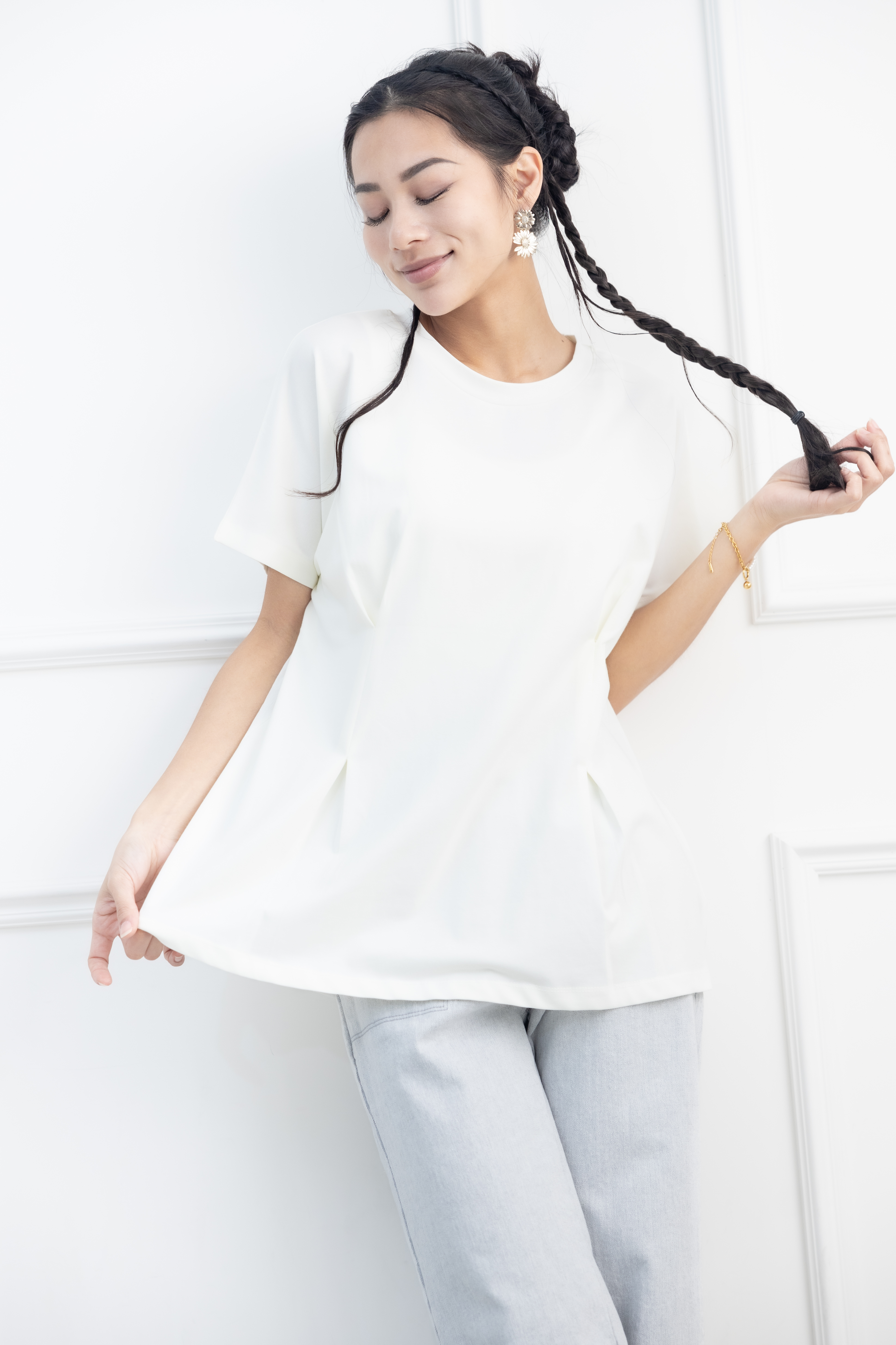 반팔 前面腰處打摺素面上衣 / 淺黃色