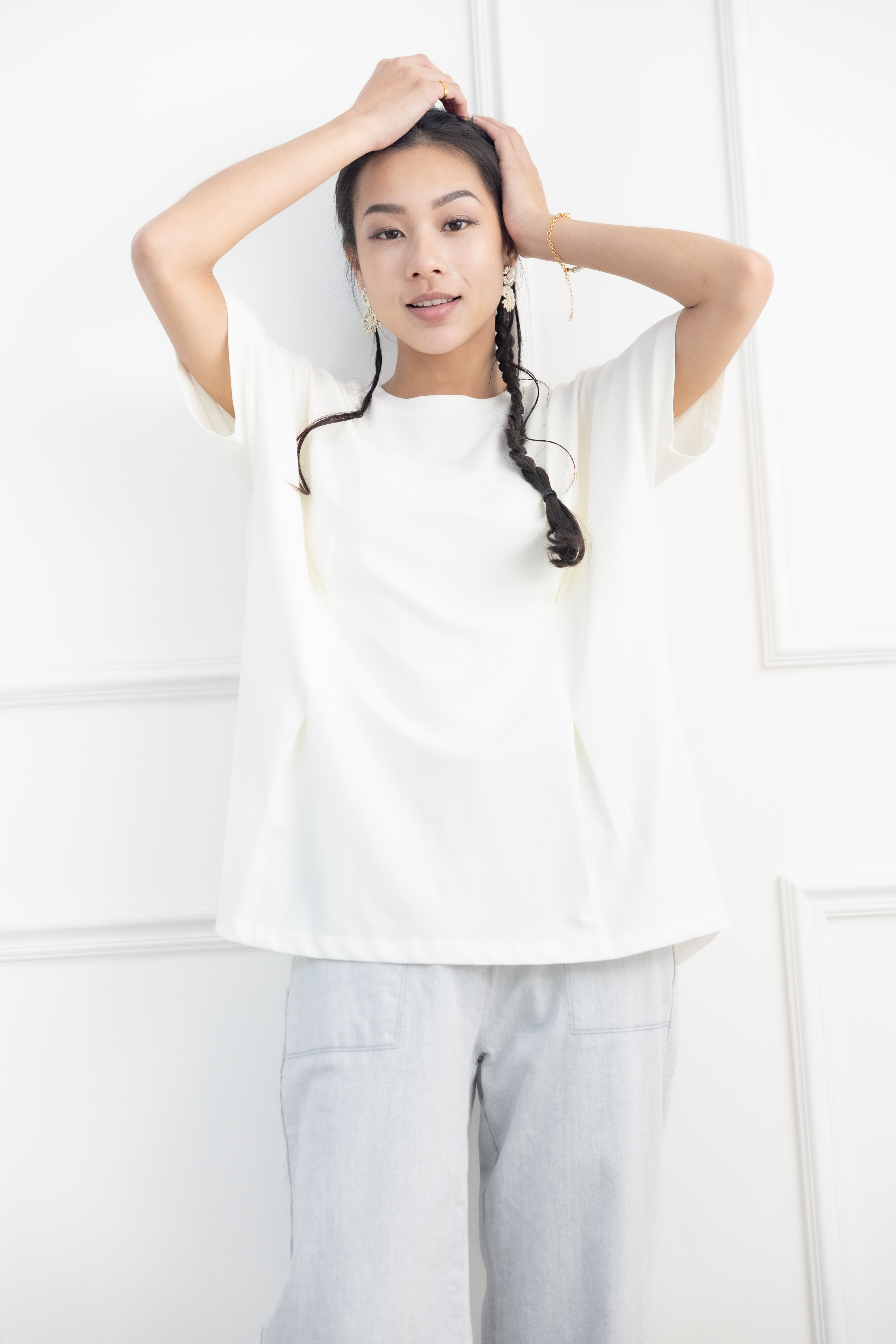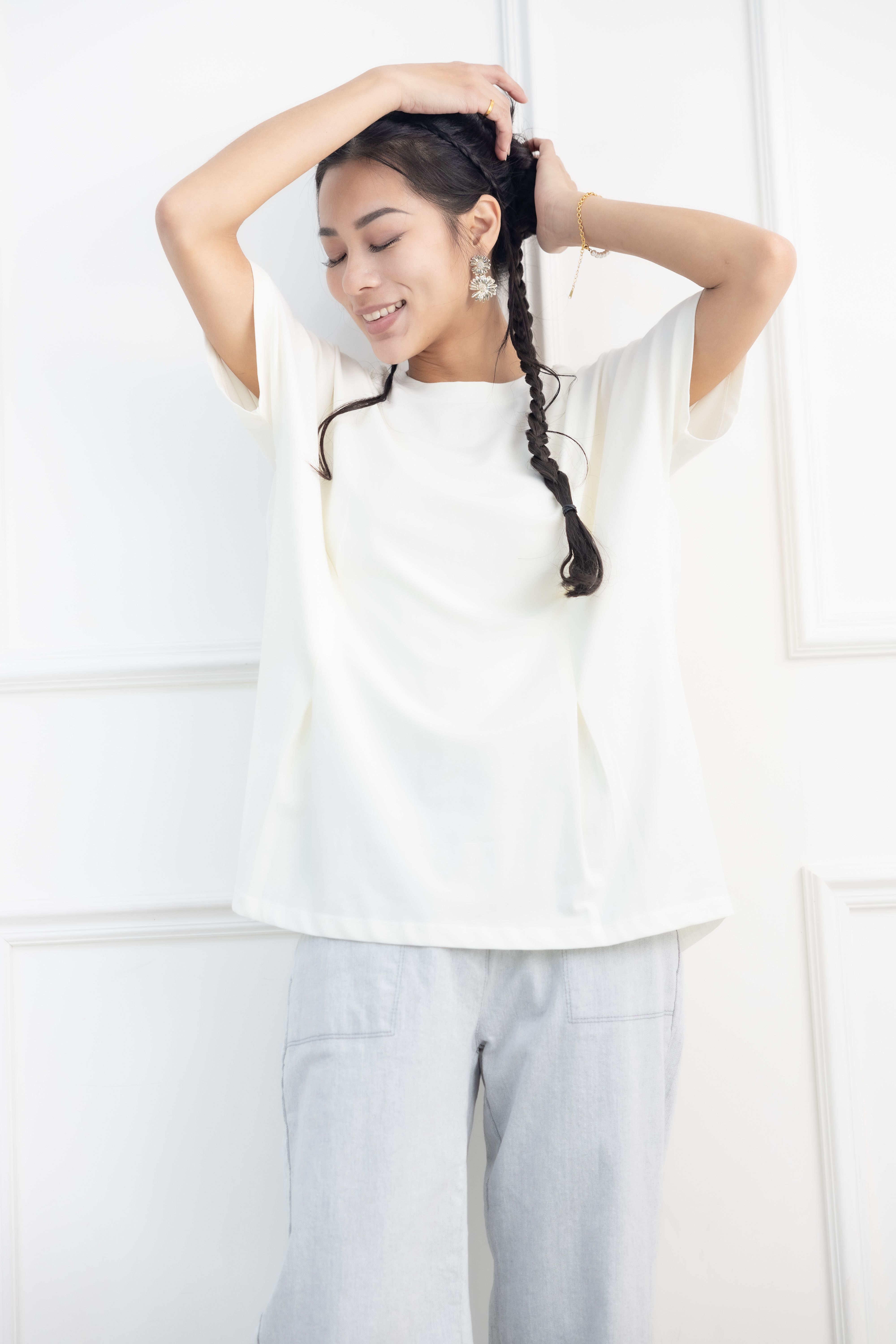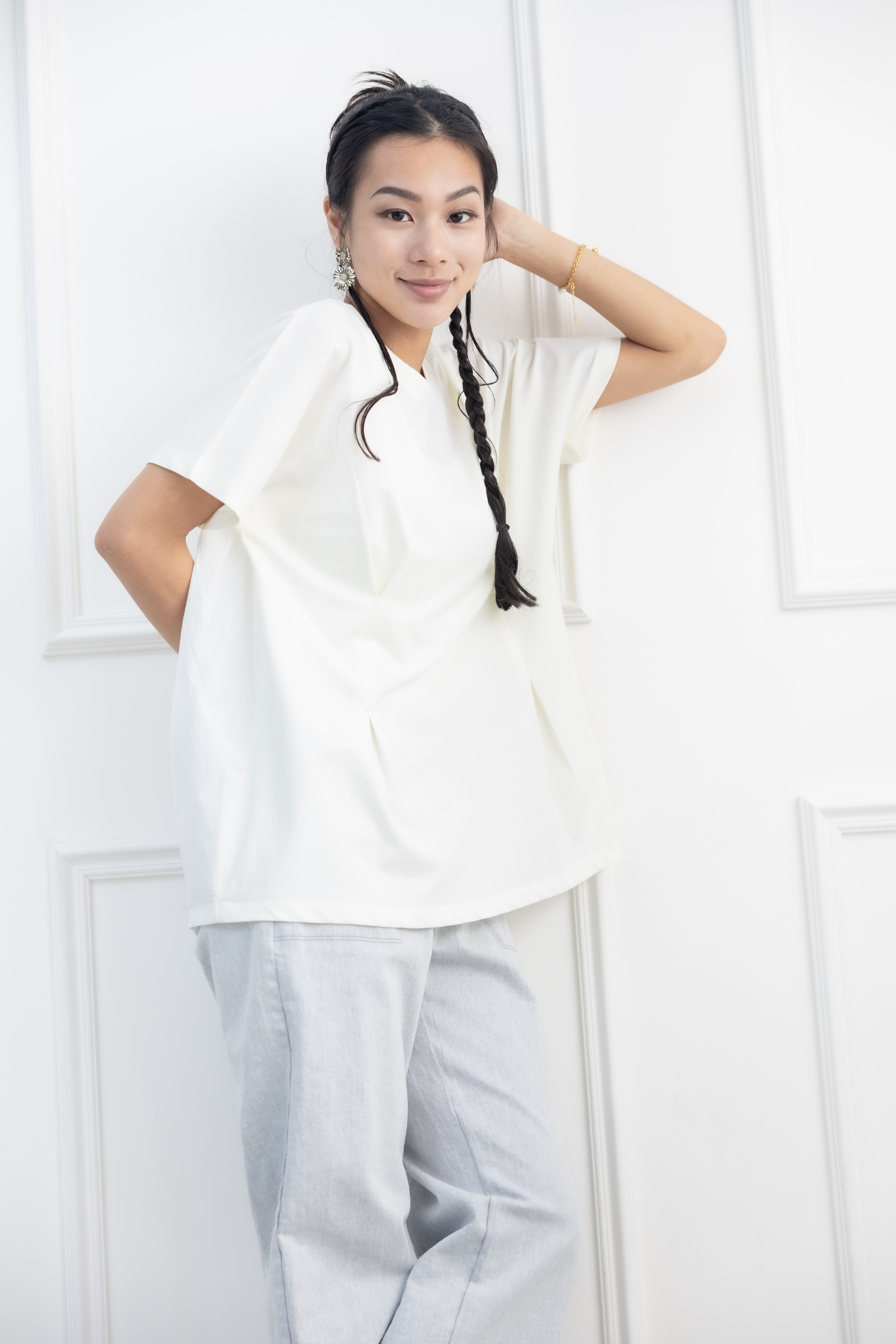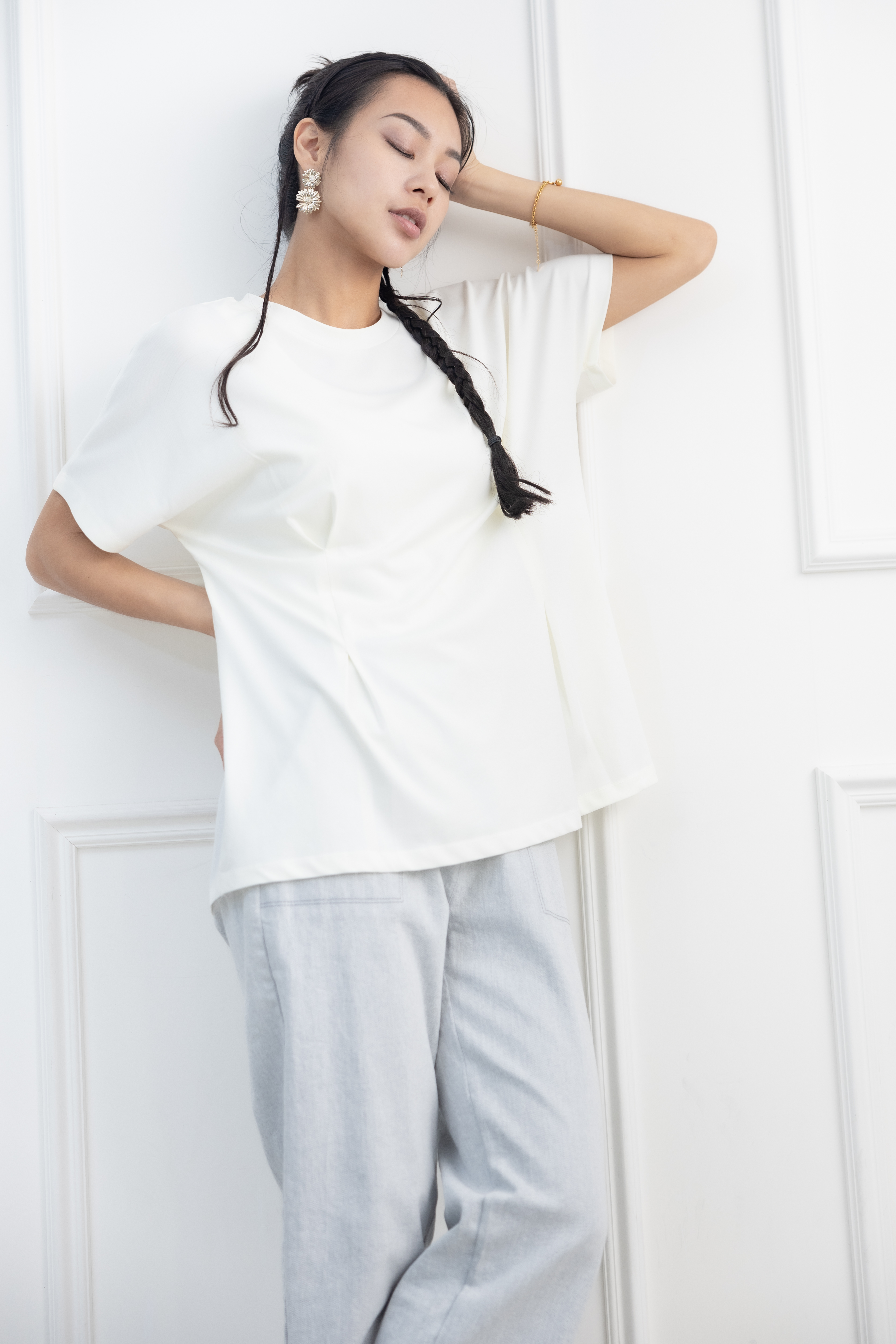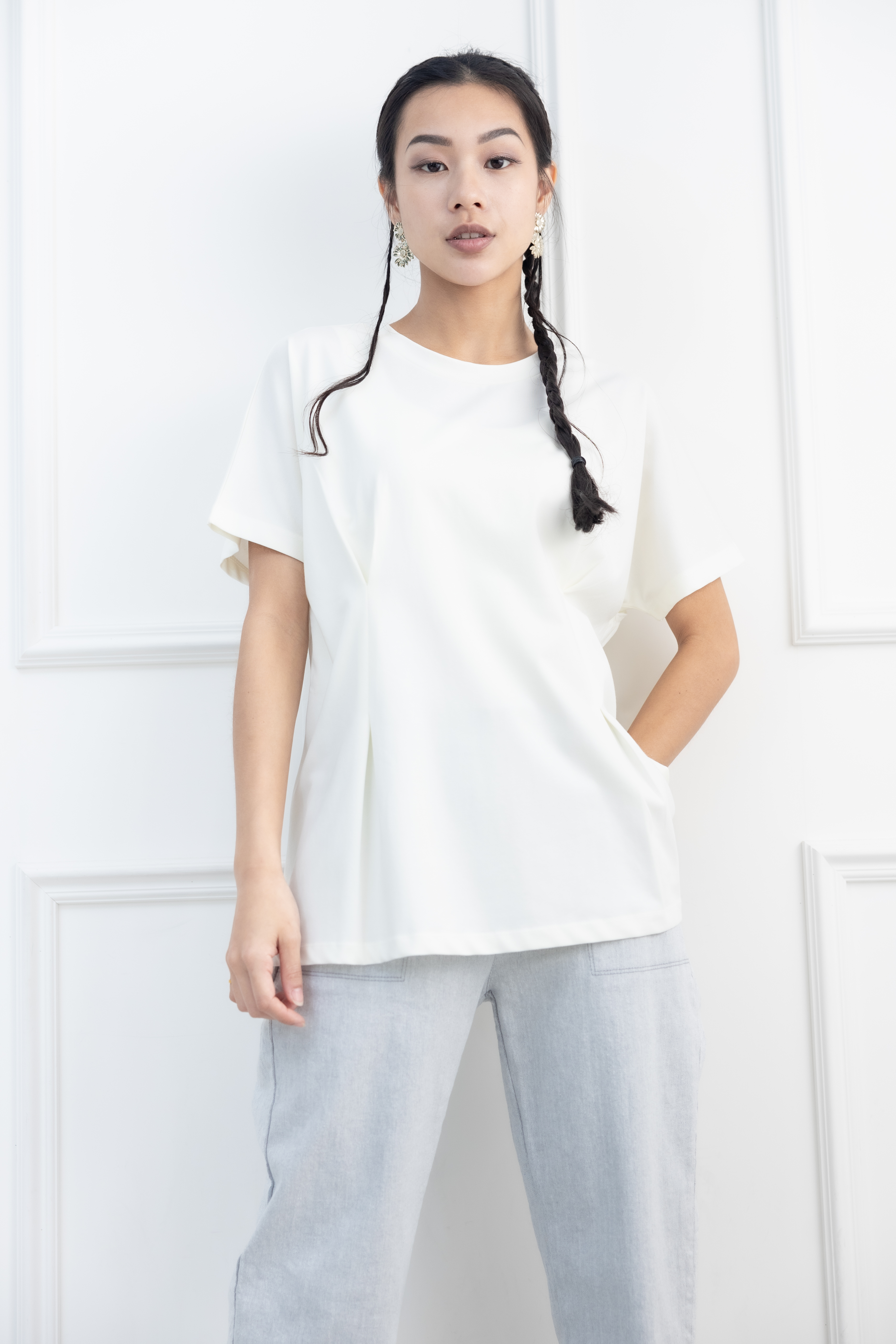 반팔 前面腰處打摺素面上衣 / 淺黃色