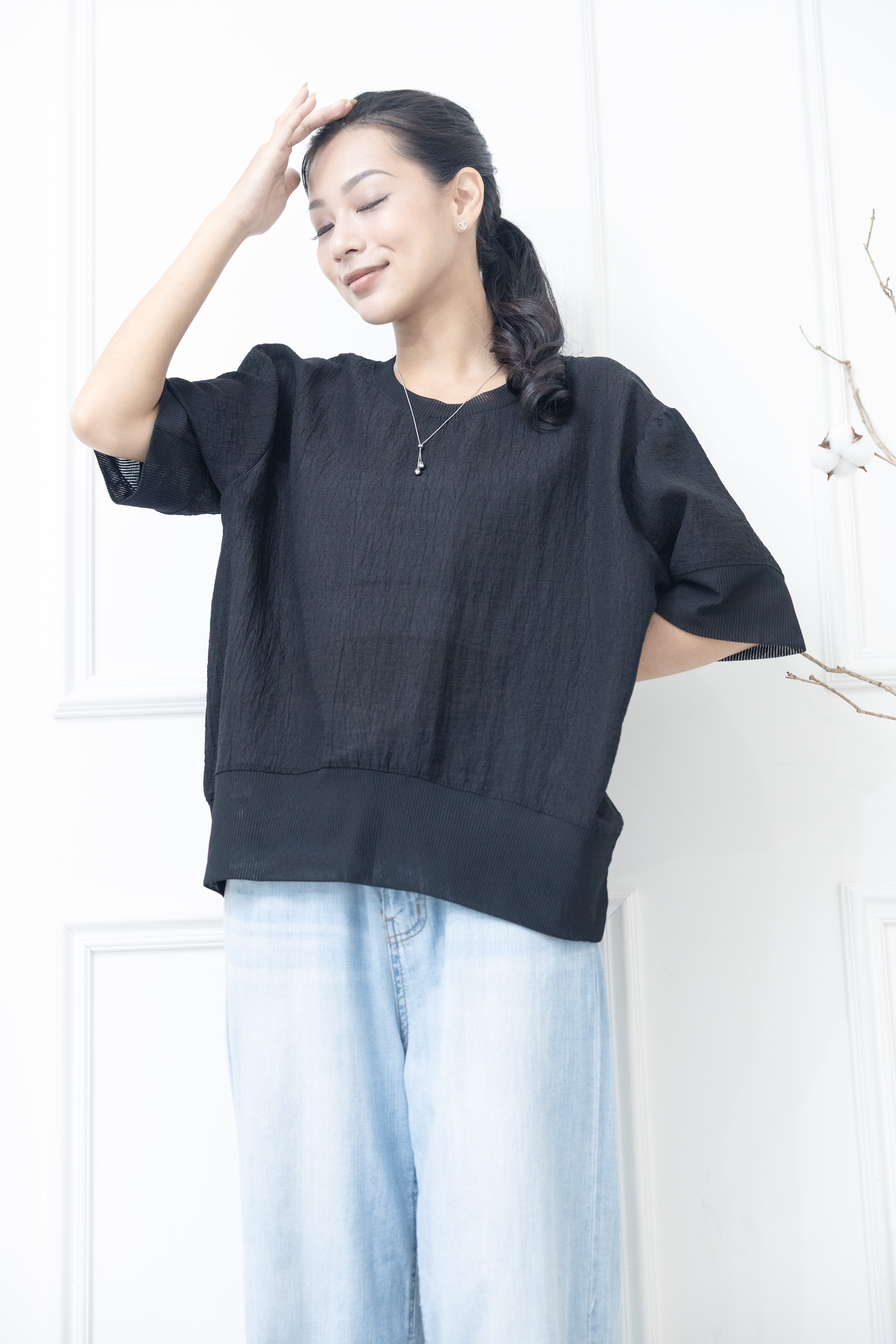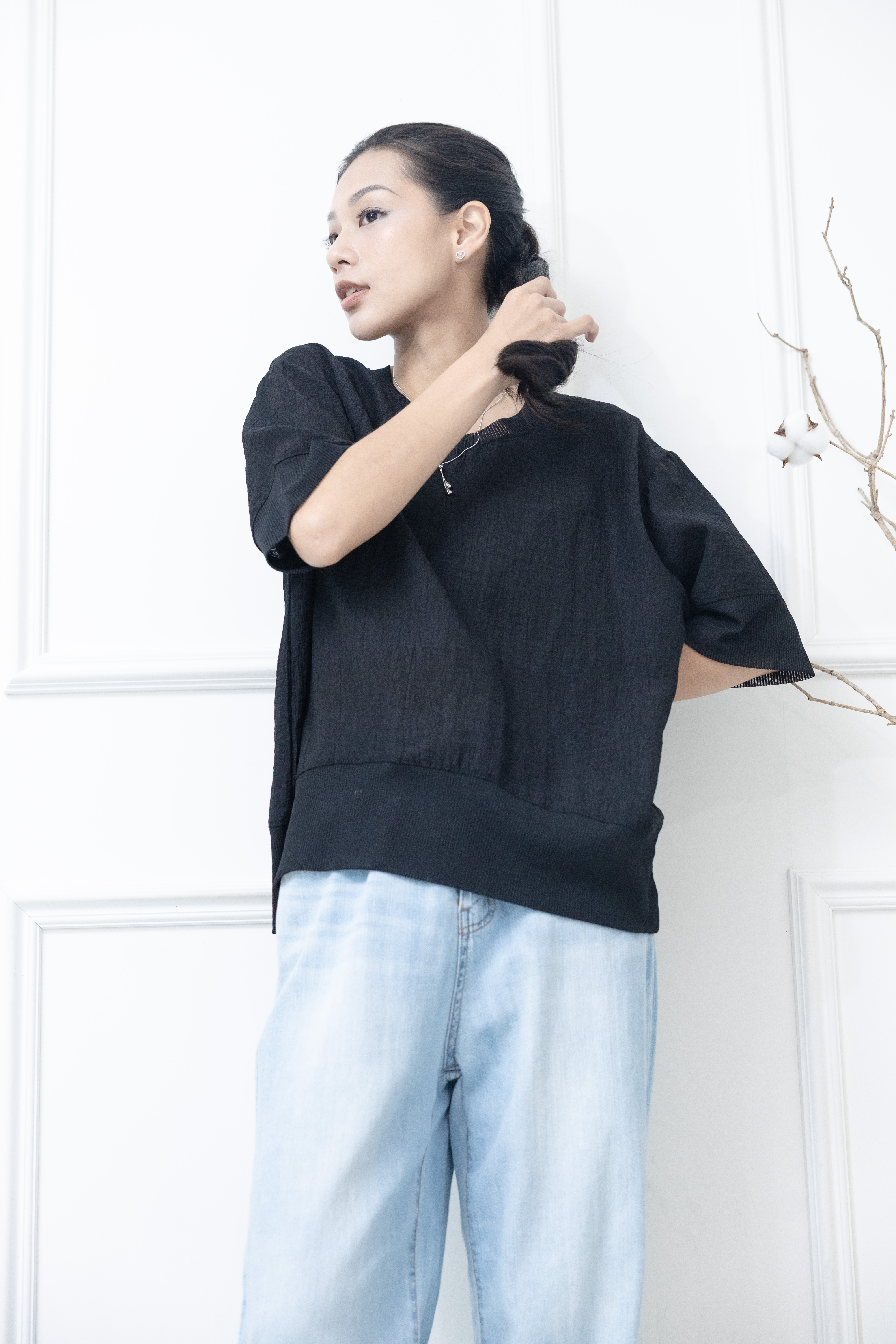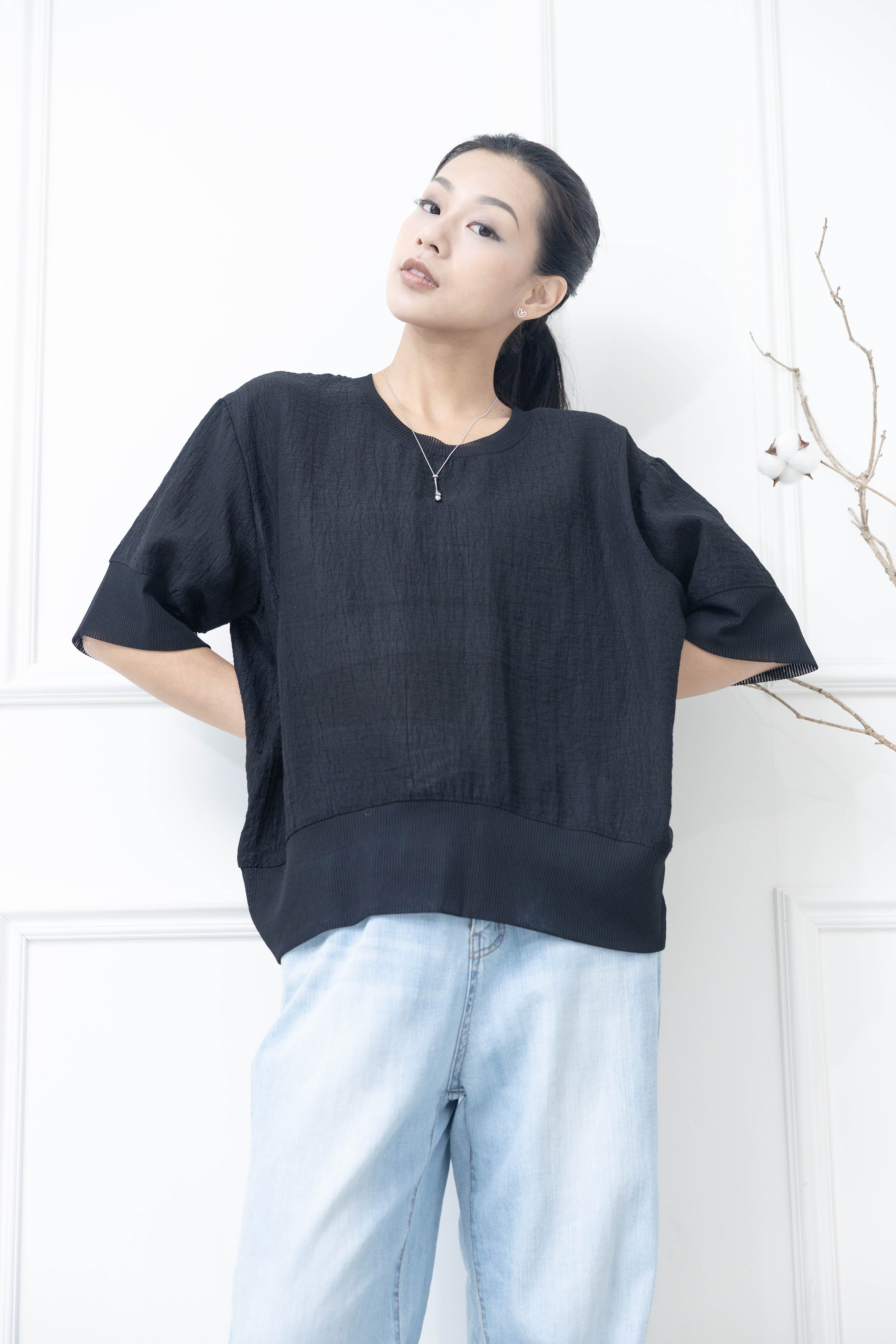 반팔 壓皺拼接針織上衣 / 黑色