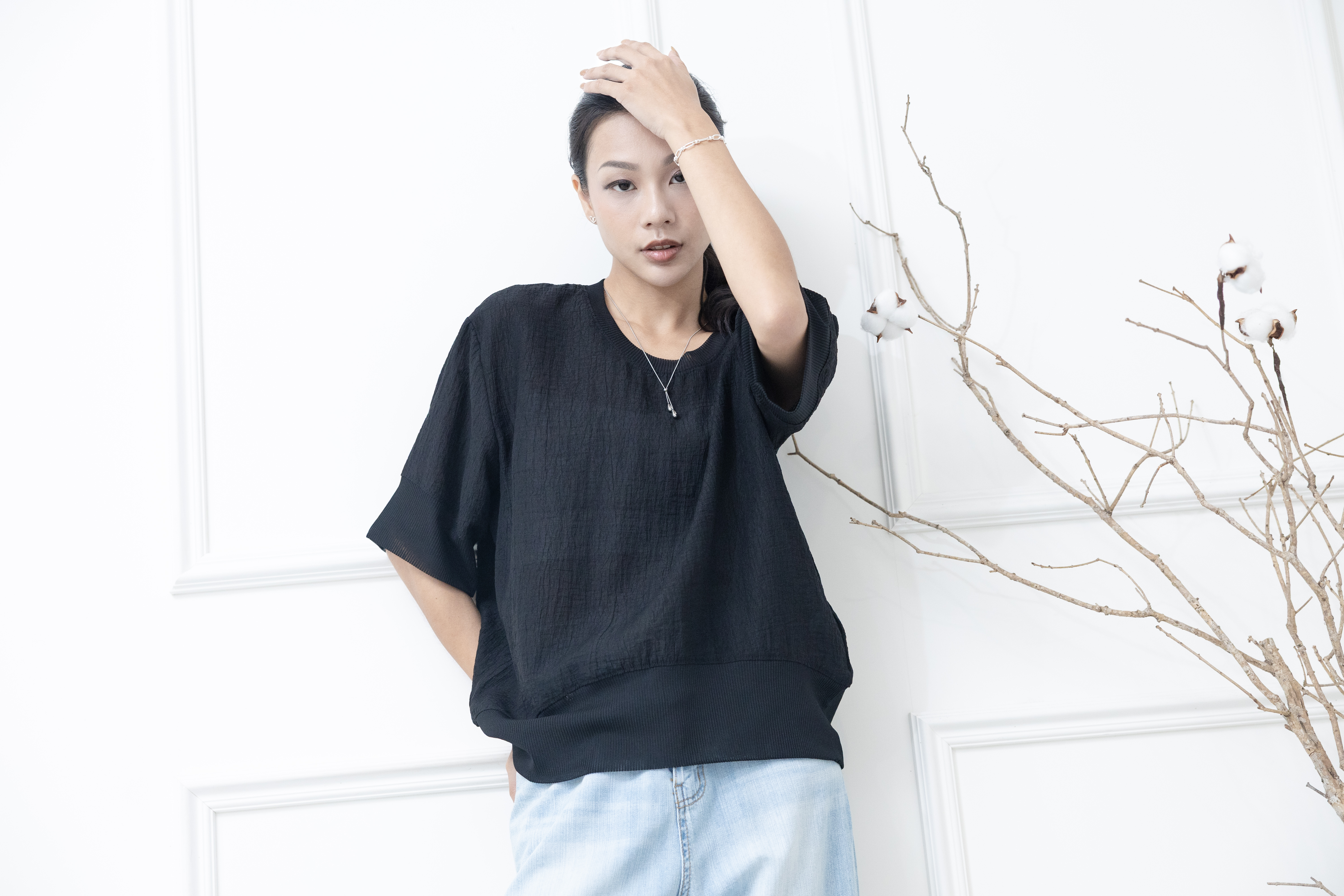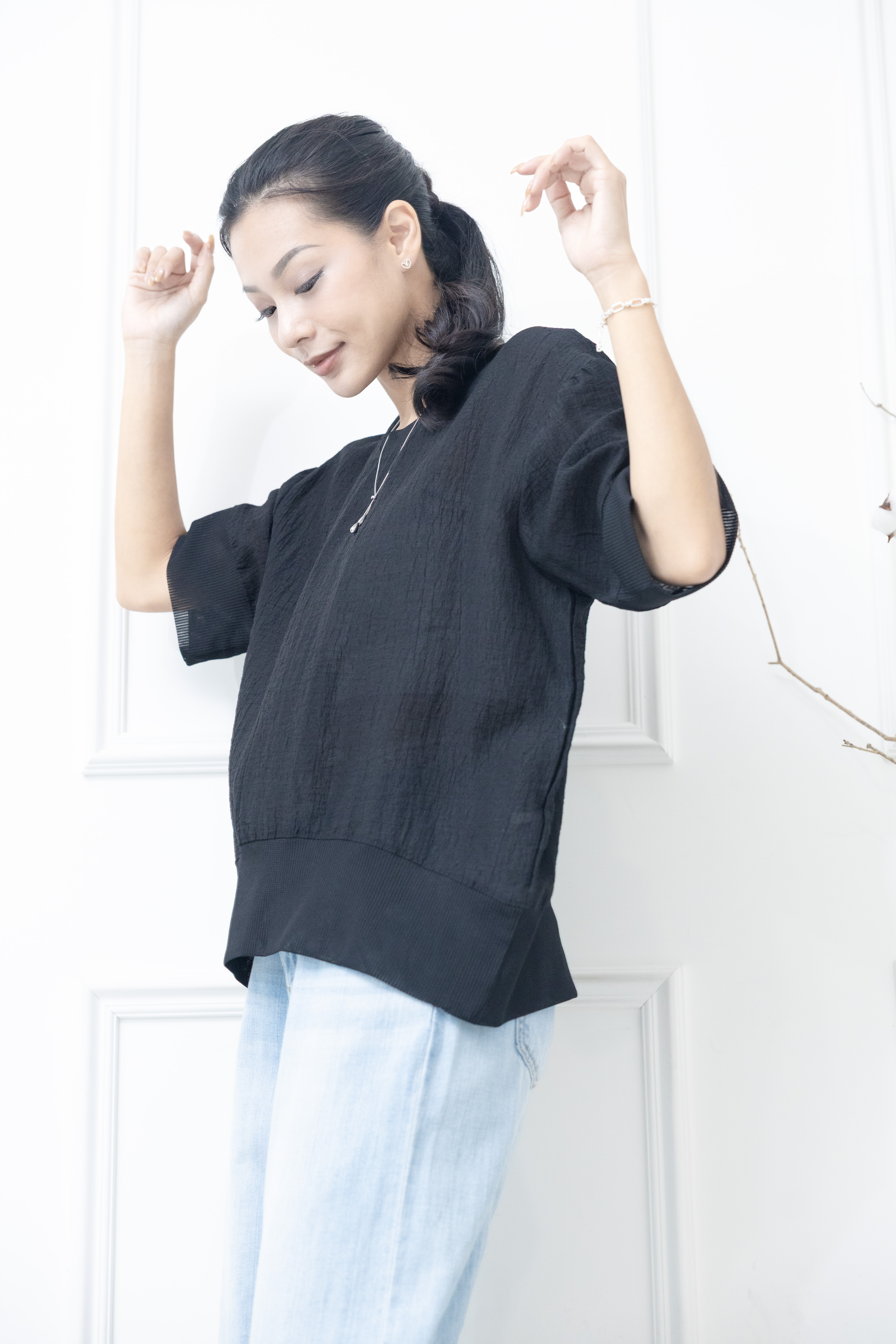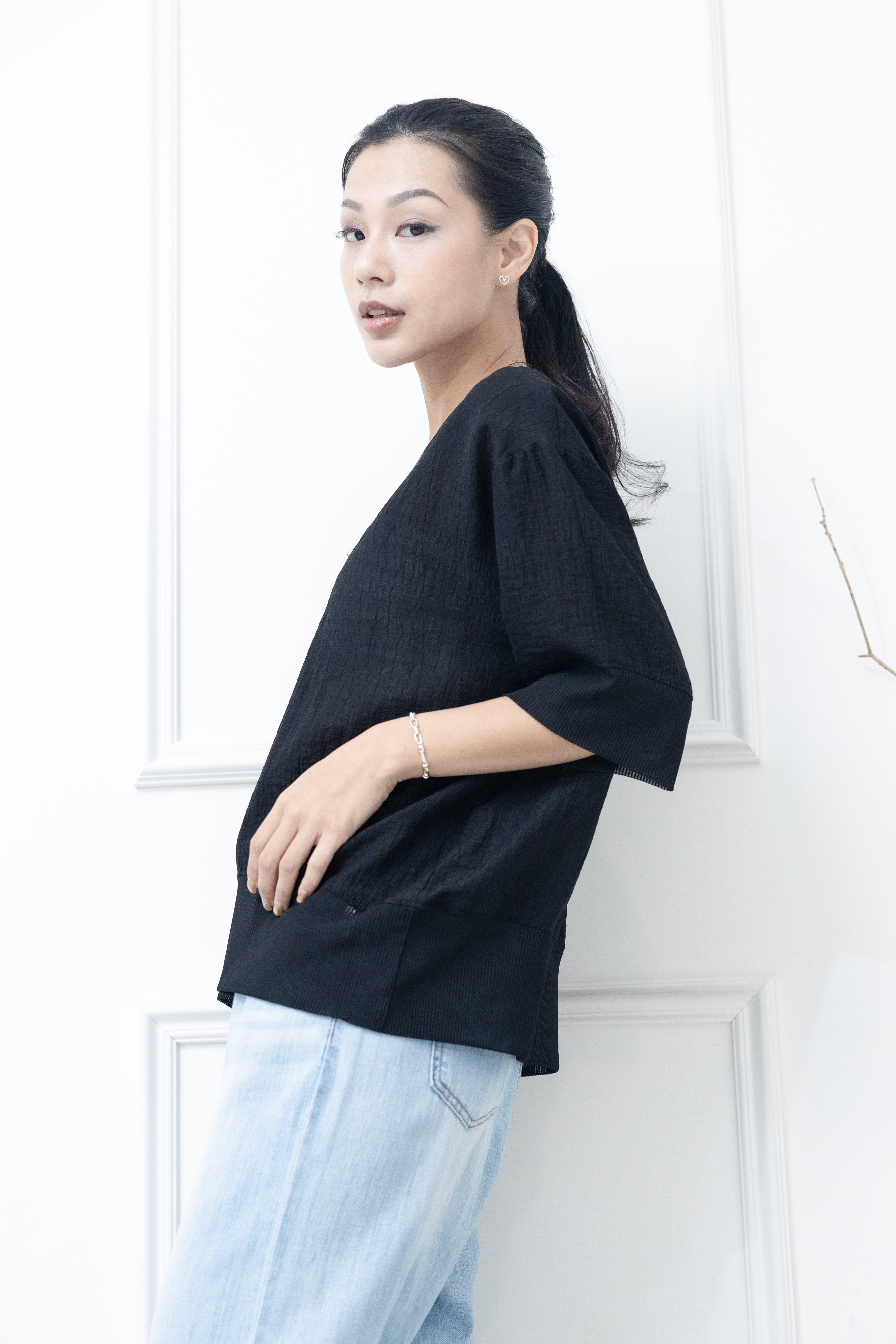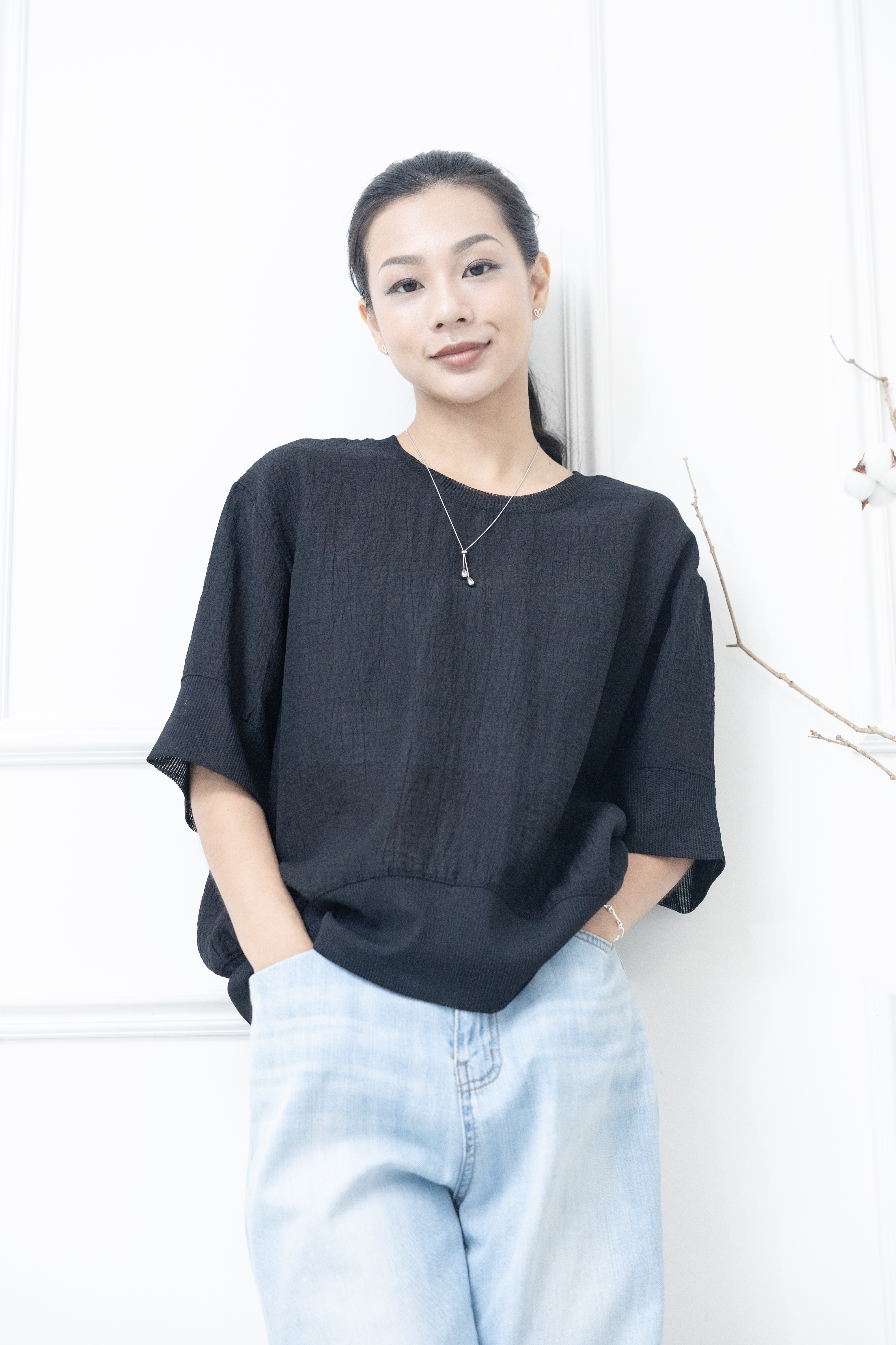 반팔 壓皺拼接針織上衣 / 黑色
