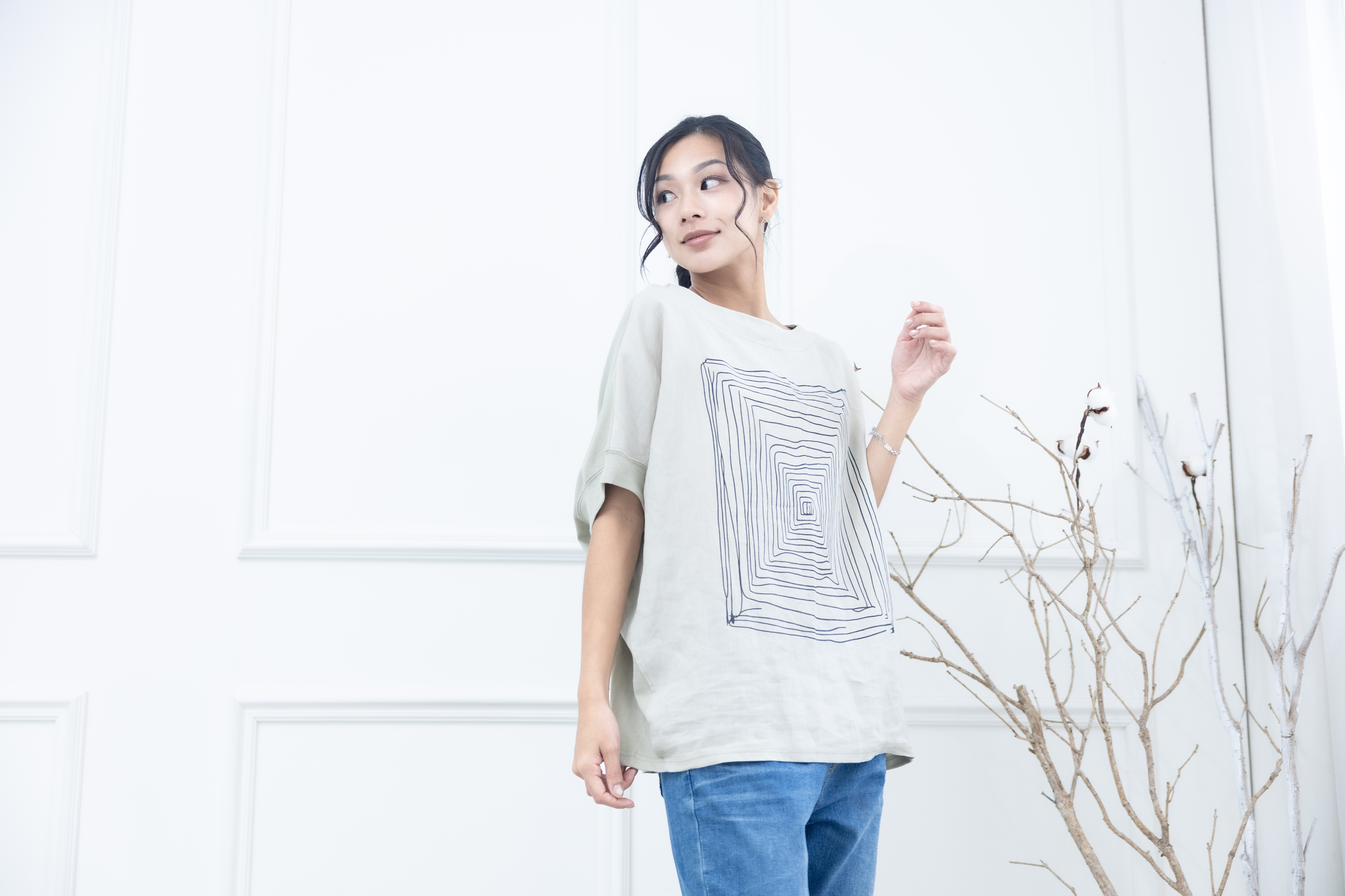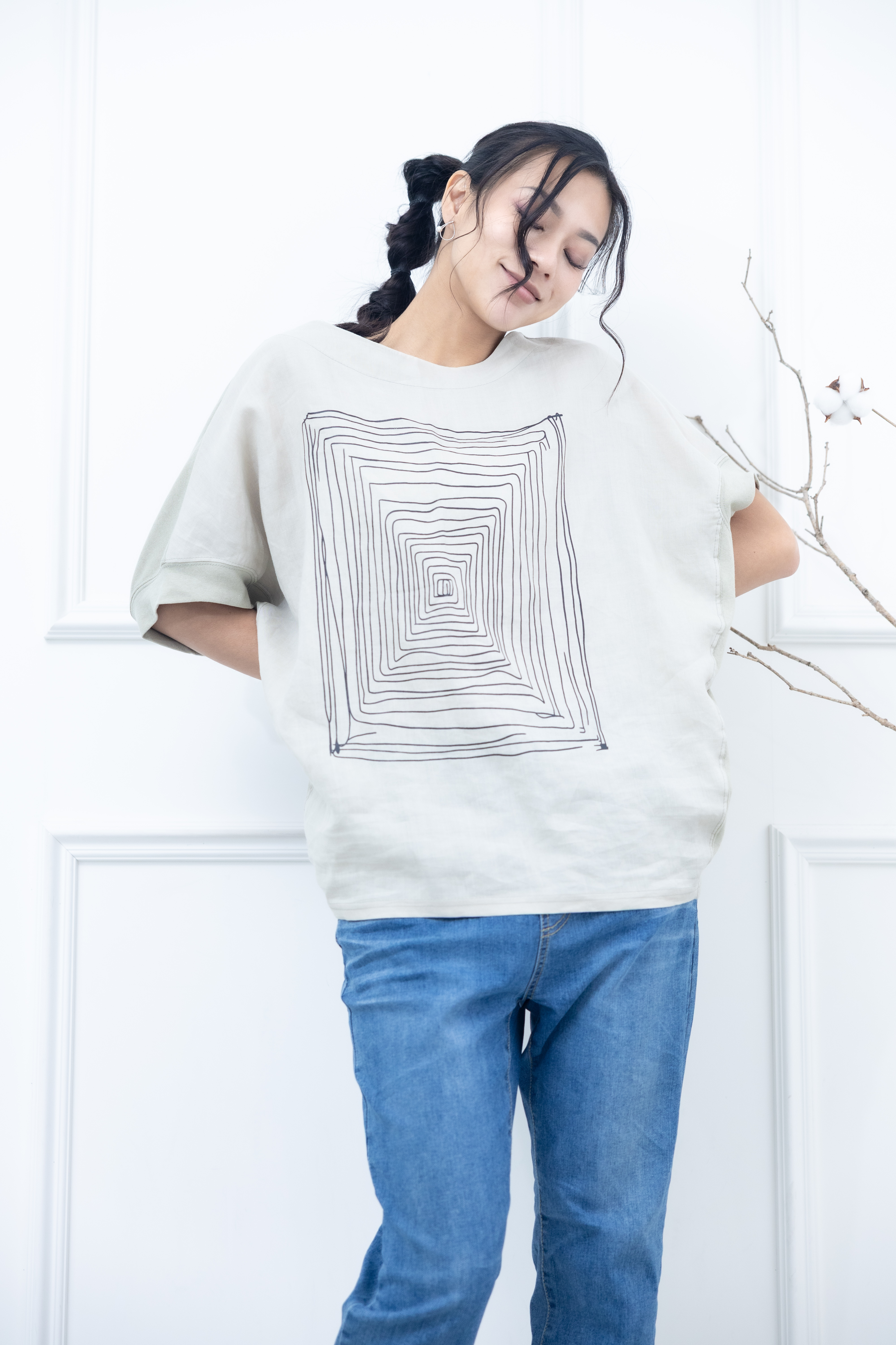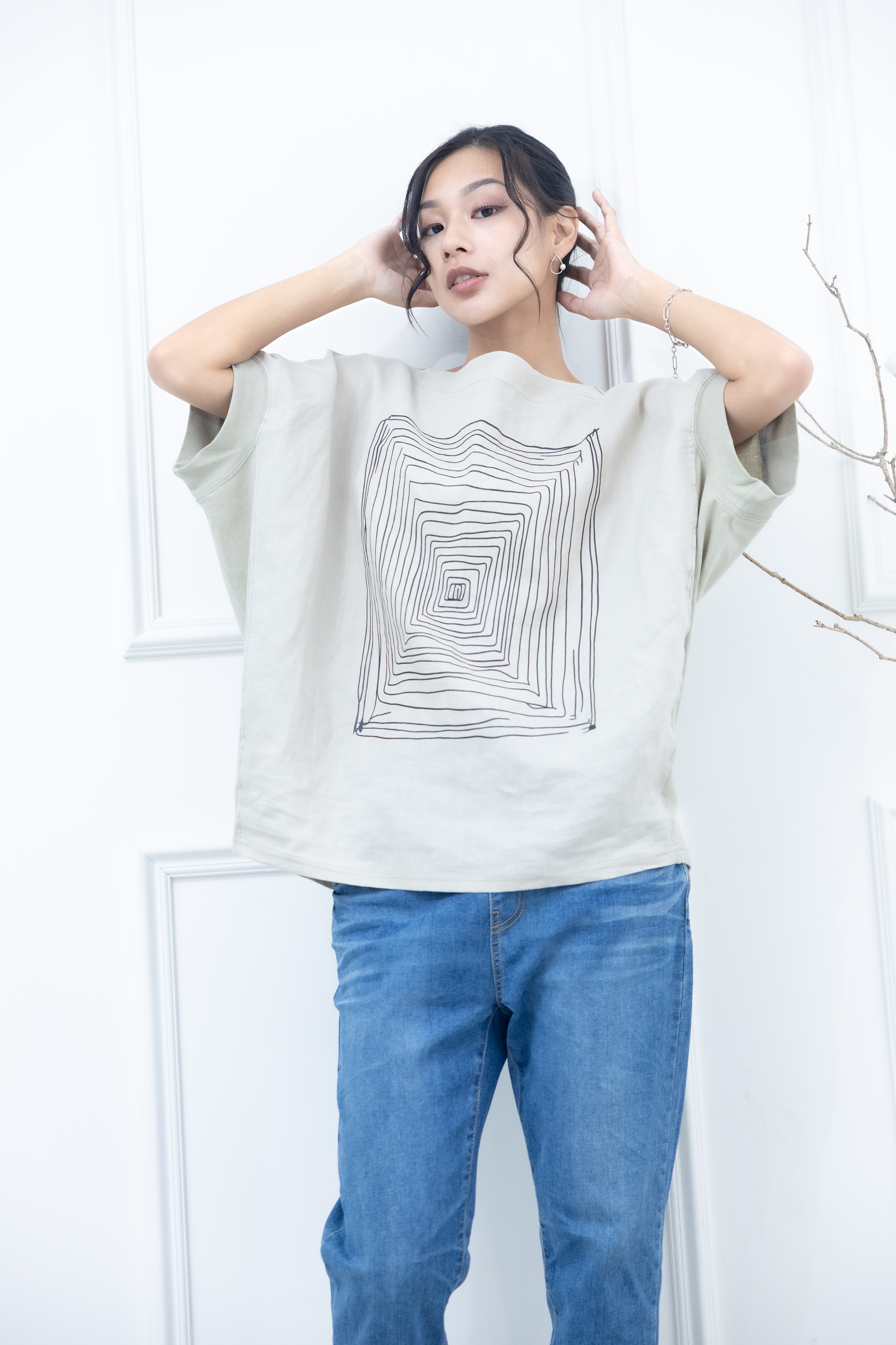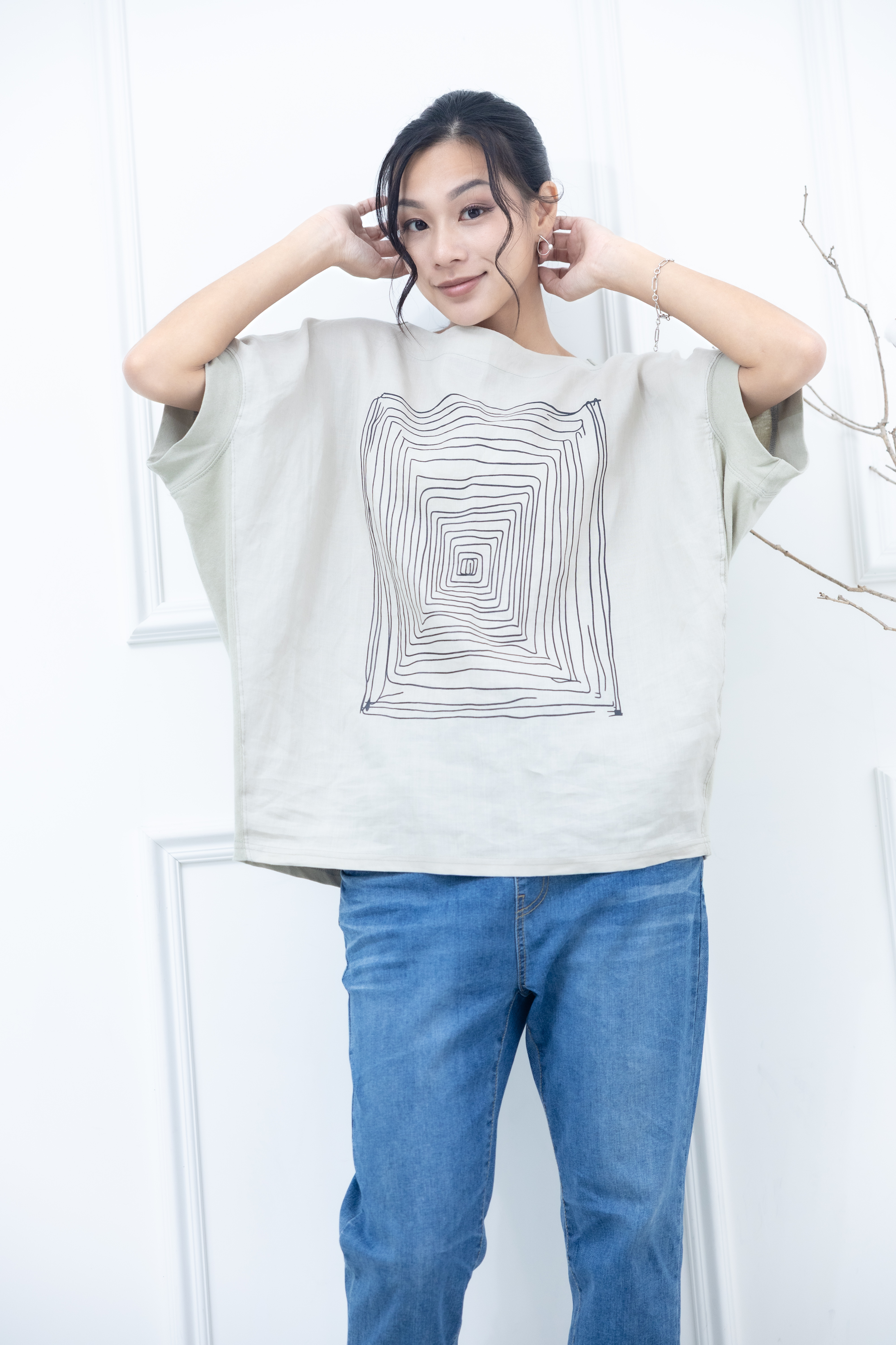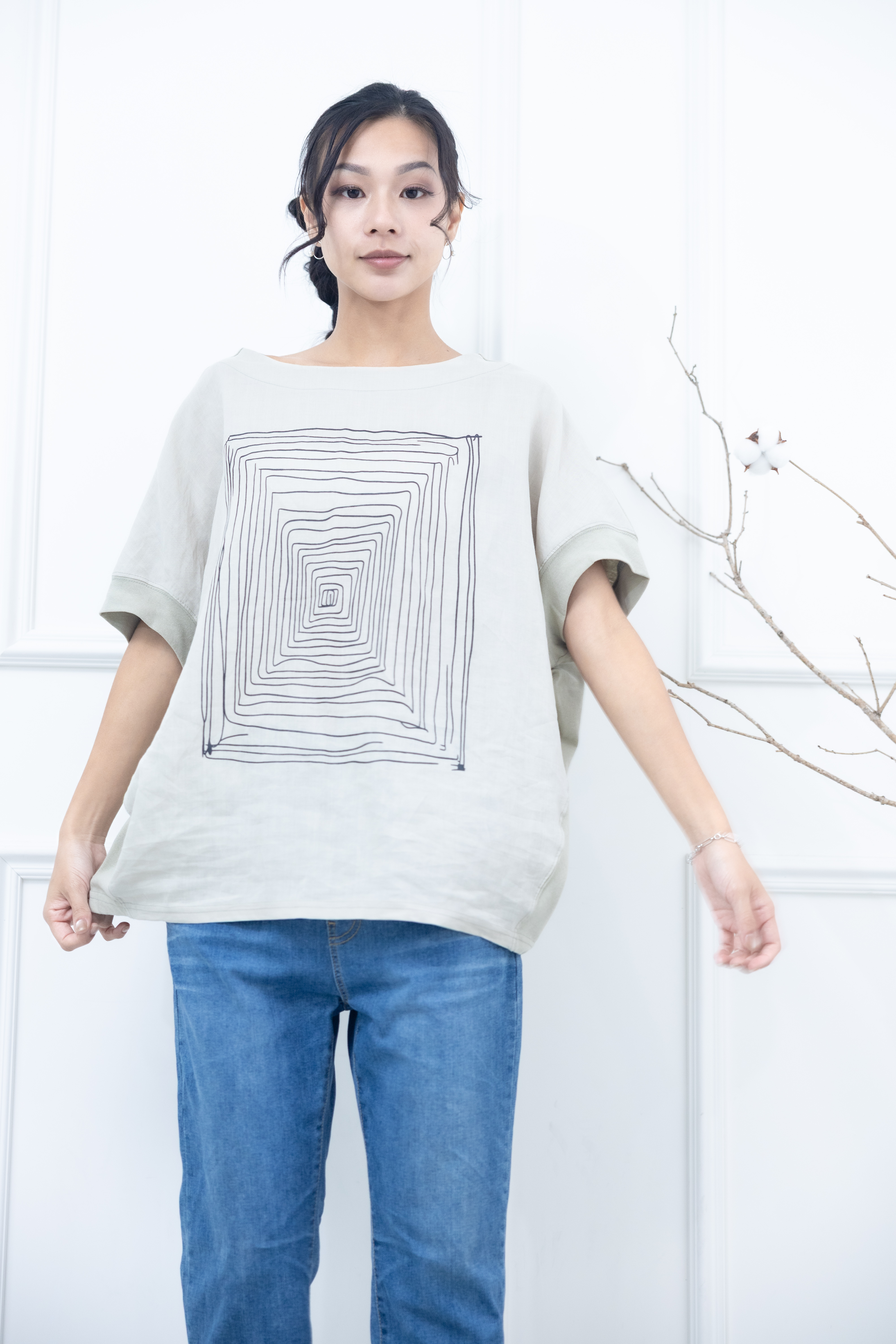 반팔 手繪方形迷宮短袖上衣 / 淺綠色