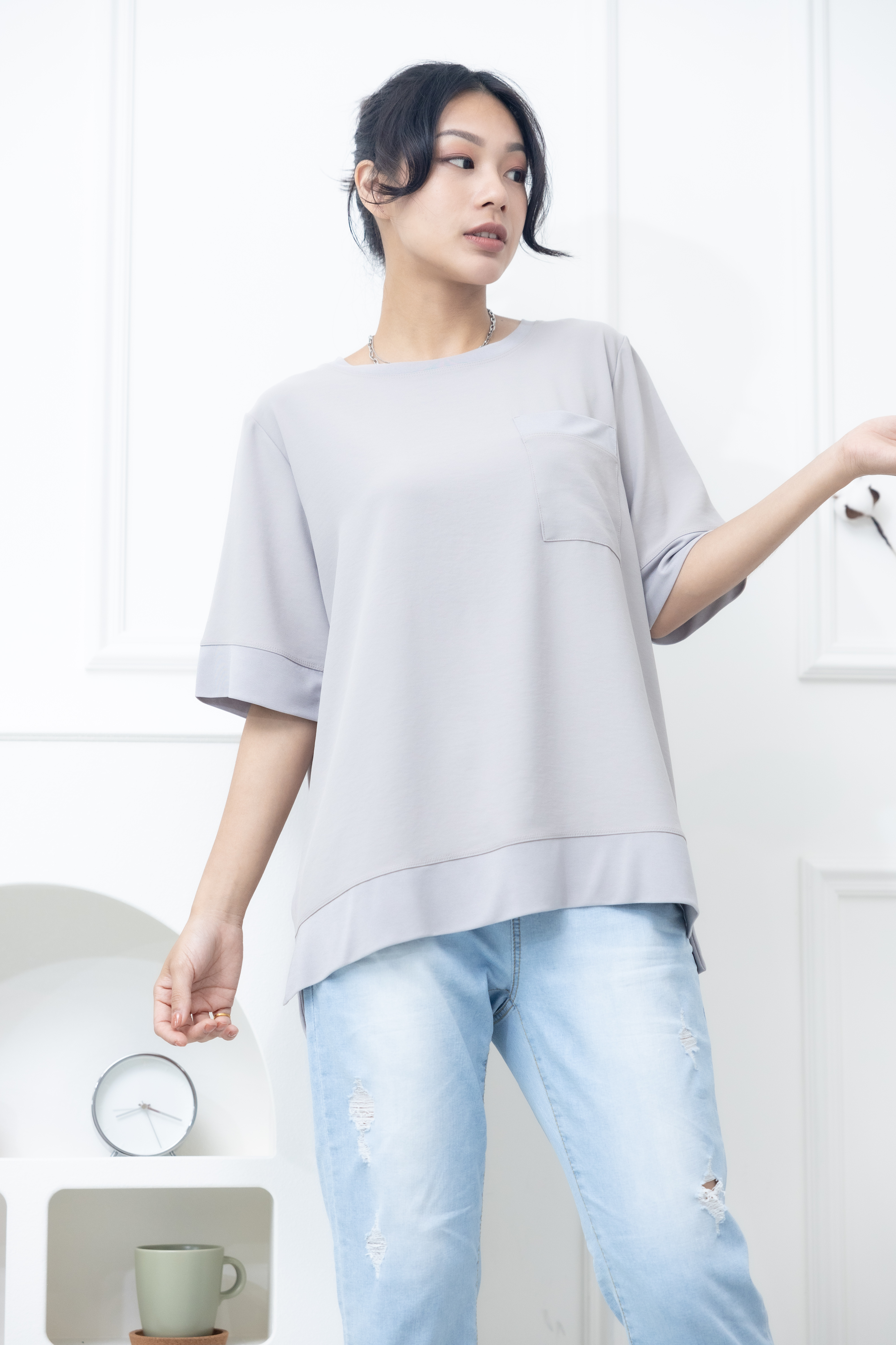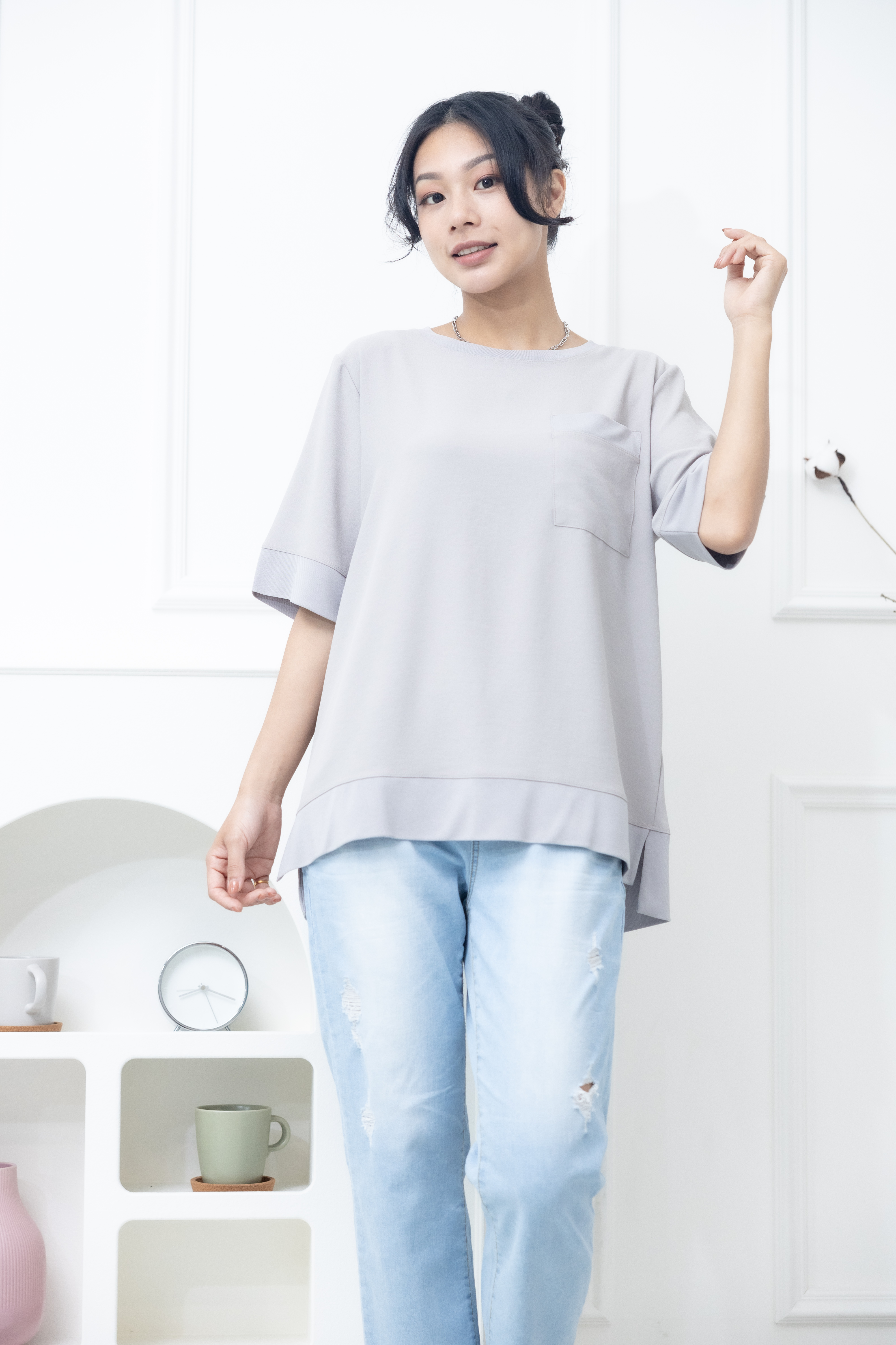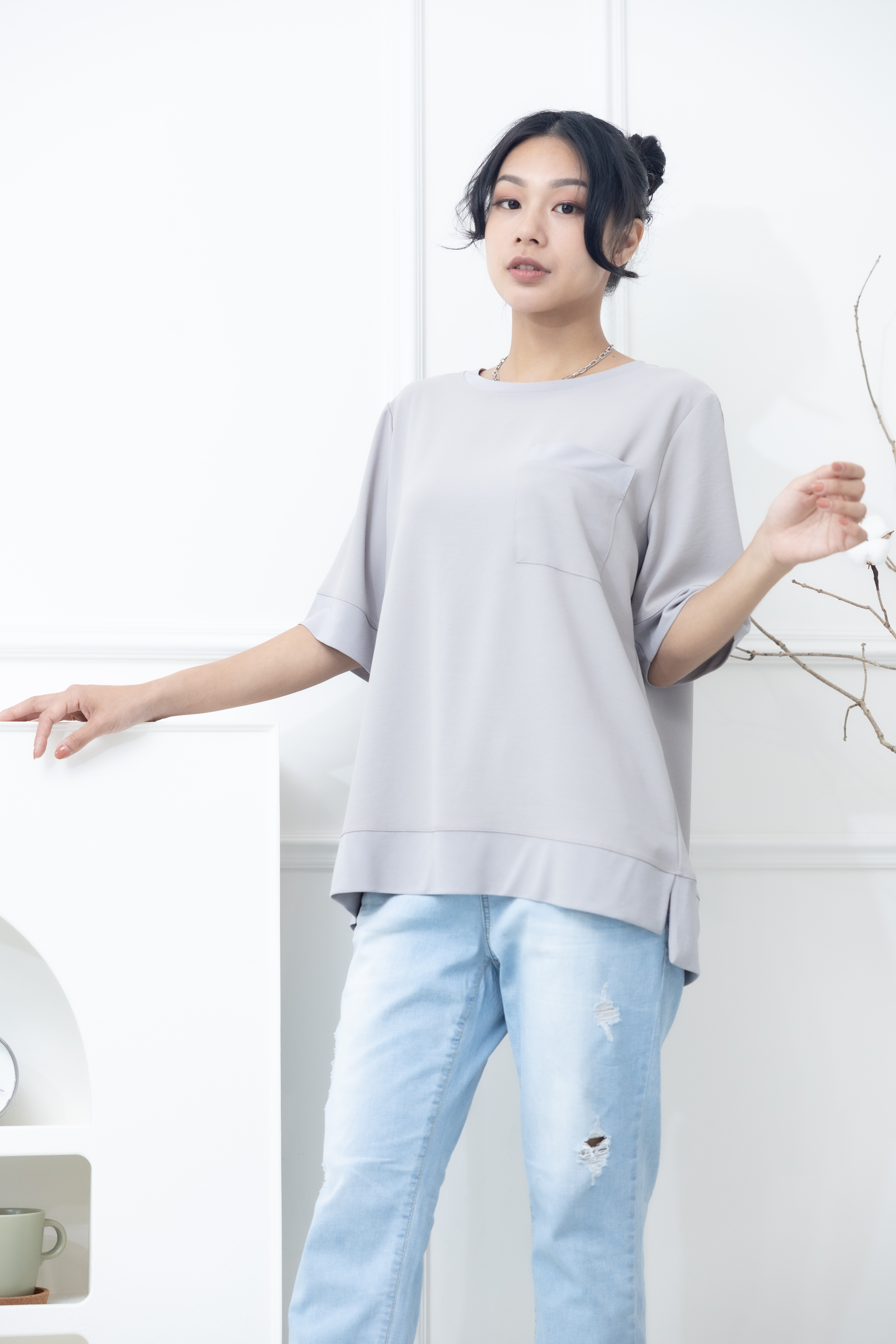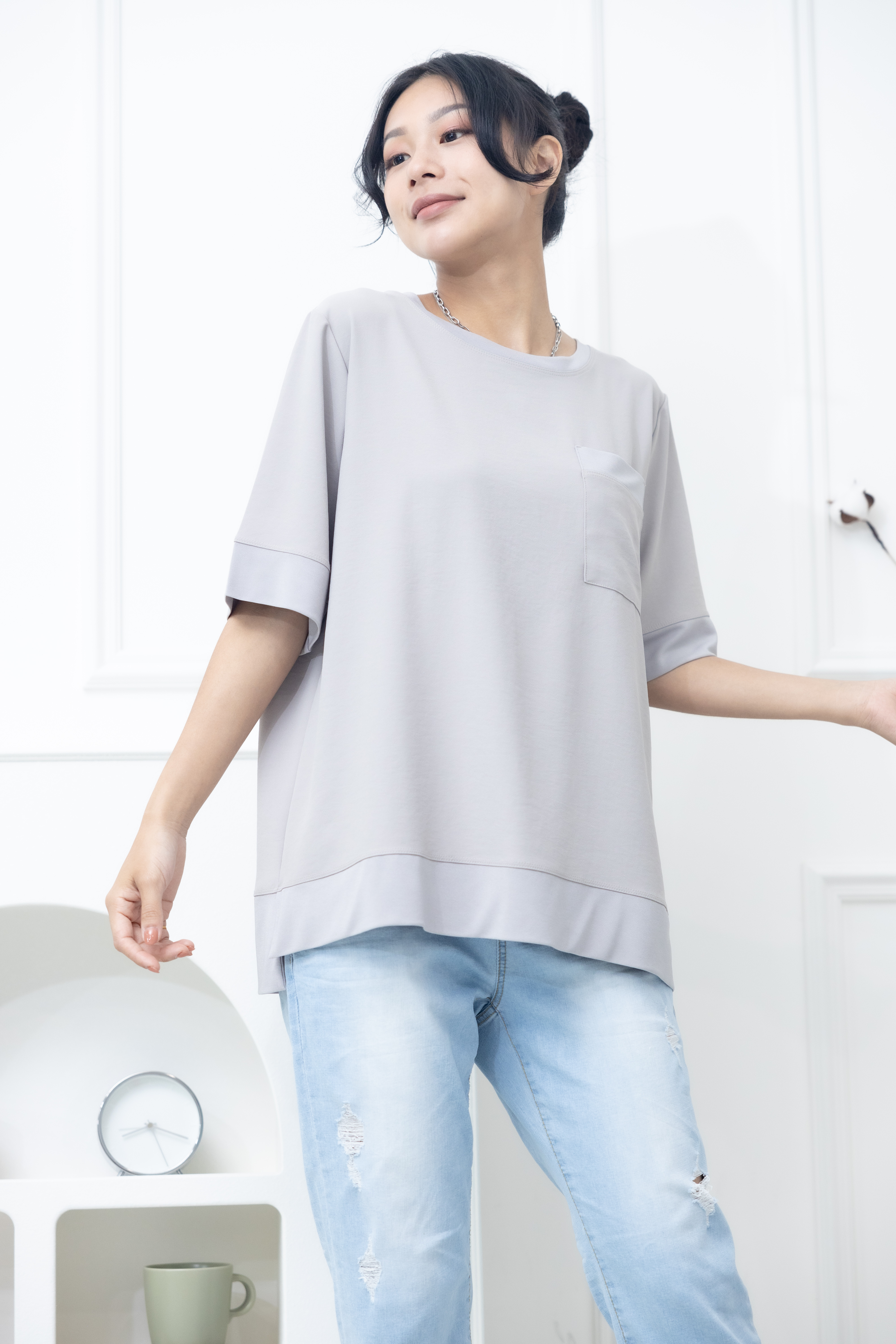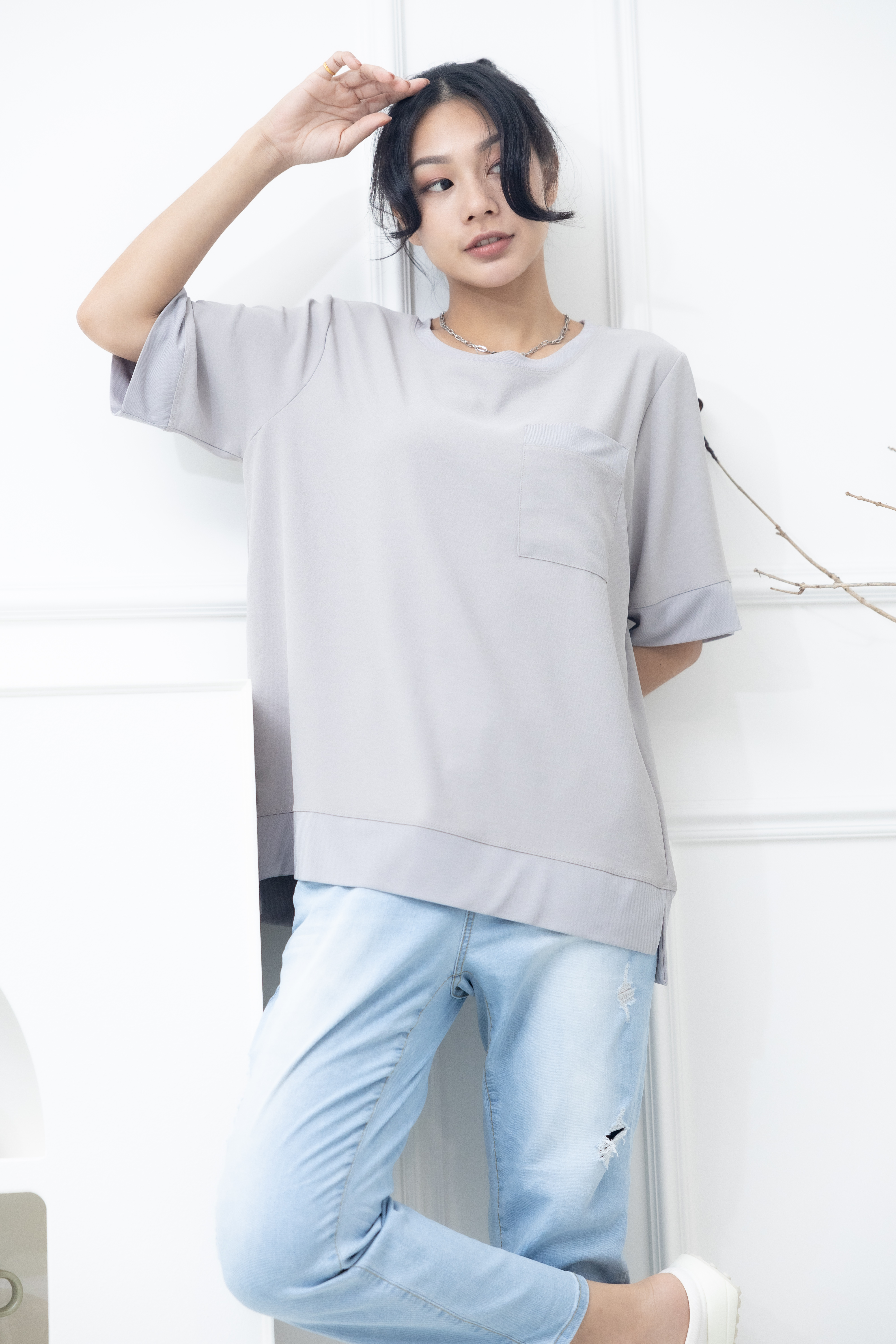 반팔 胸前口袋彈性纖維上衣 / 米灰色