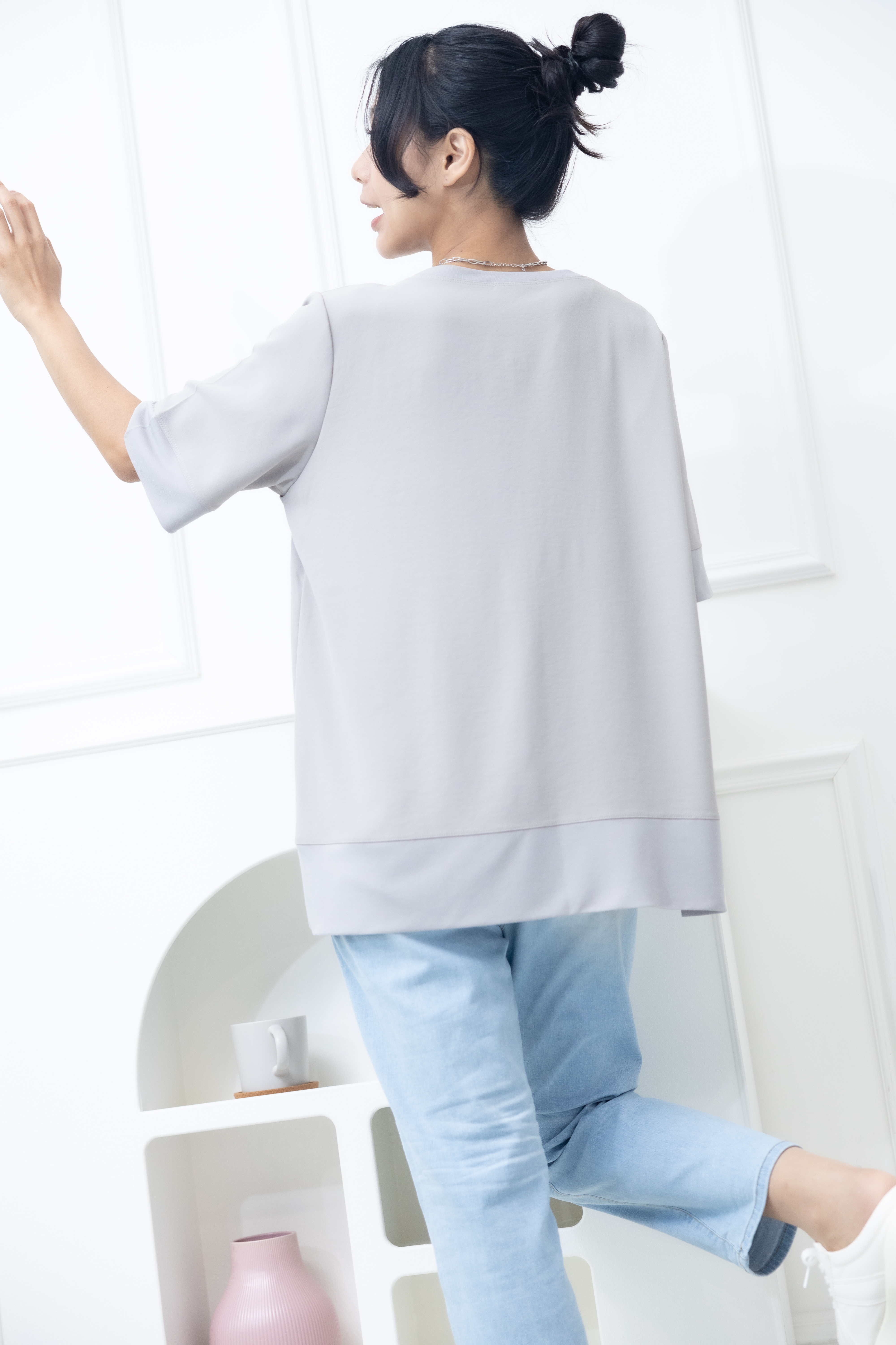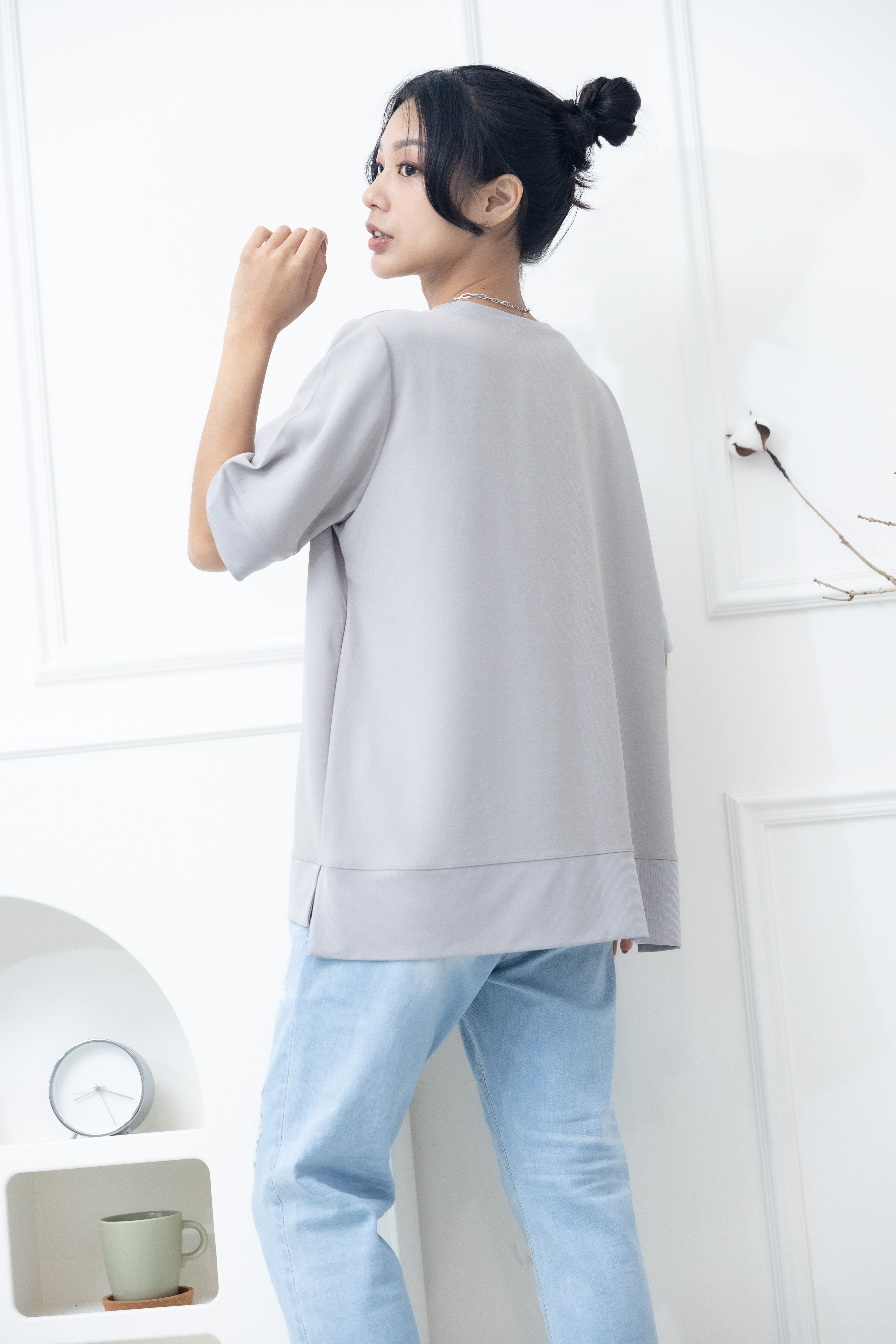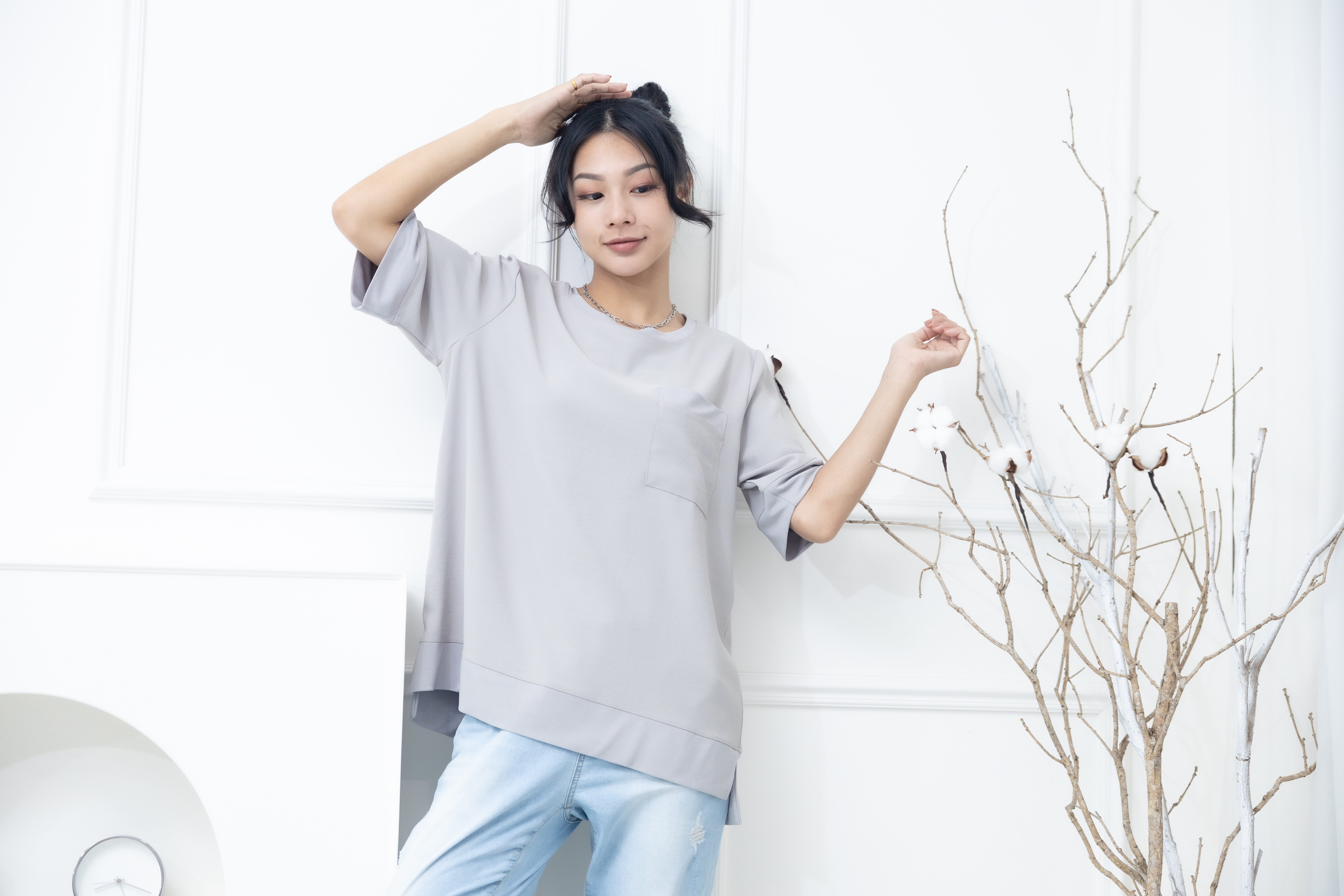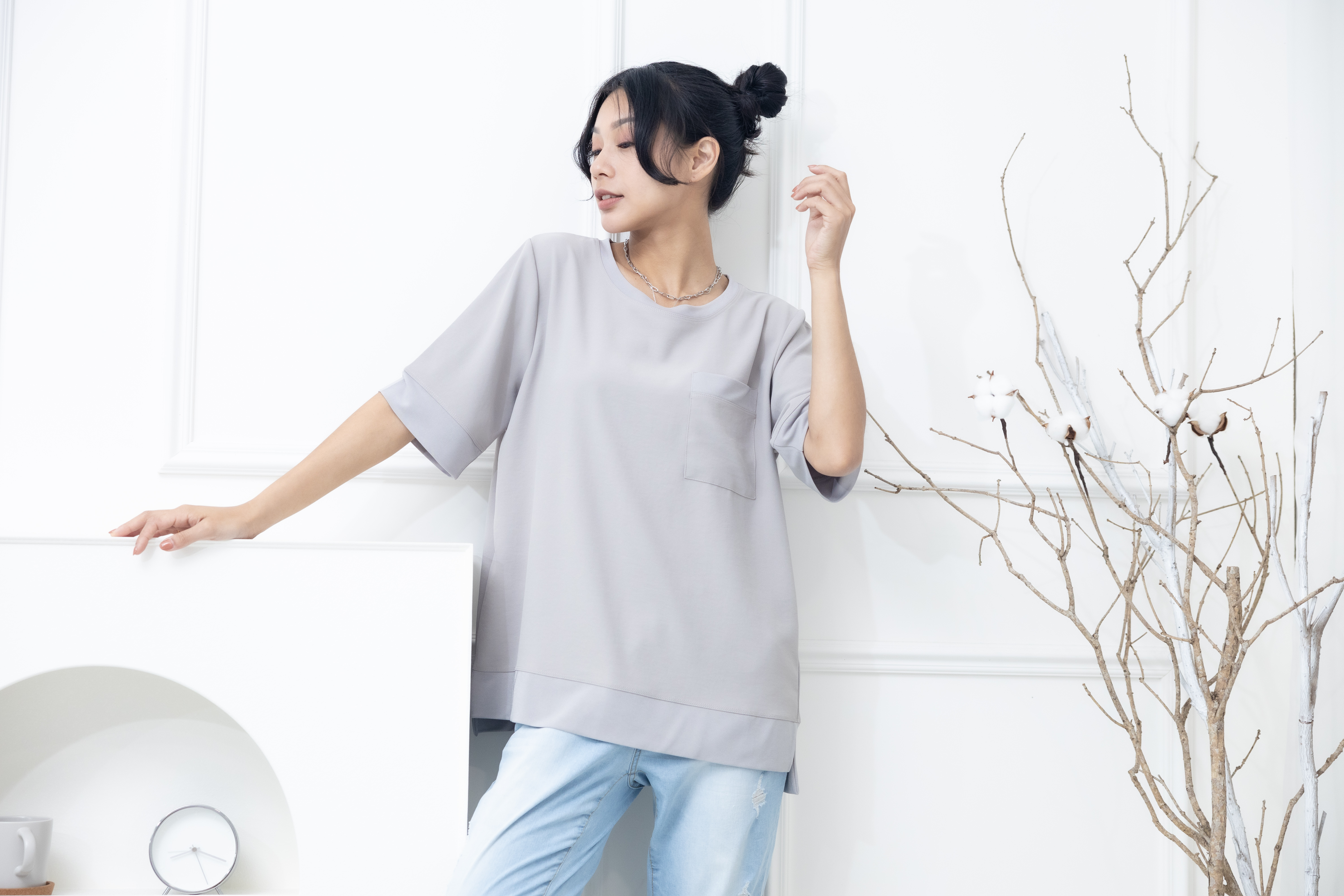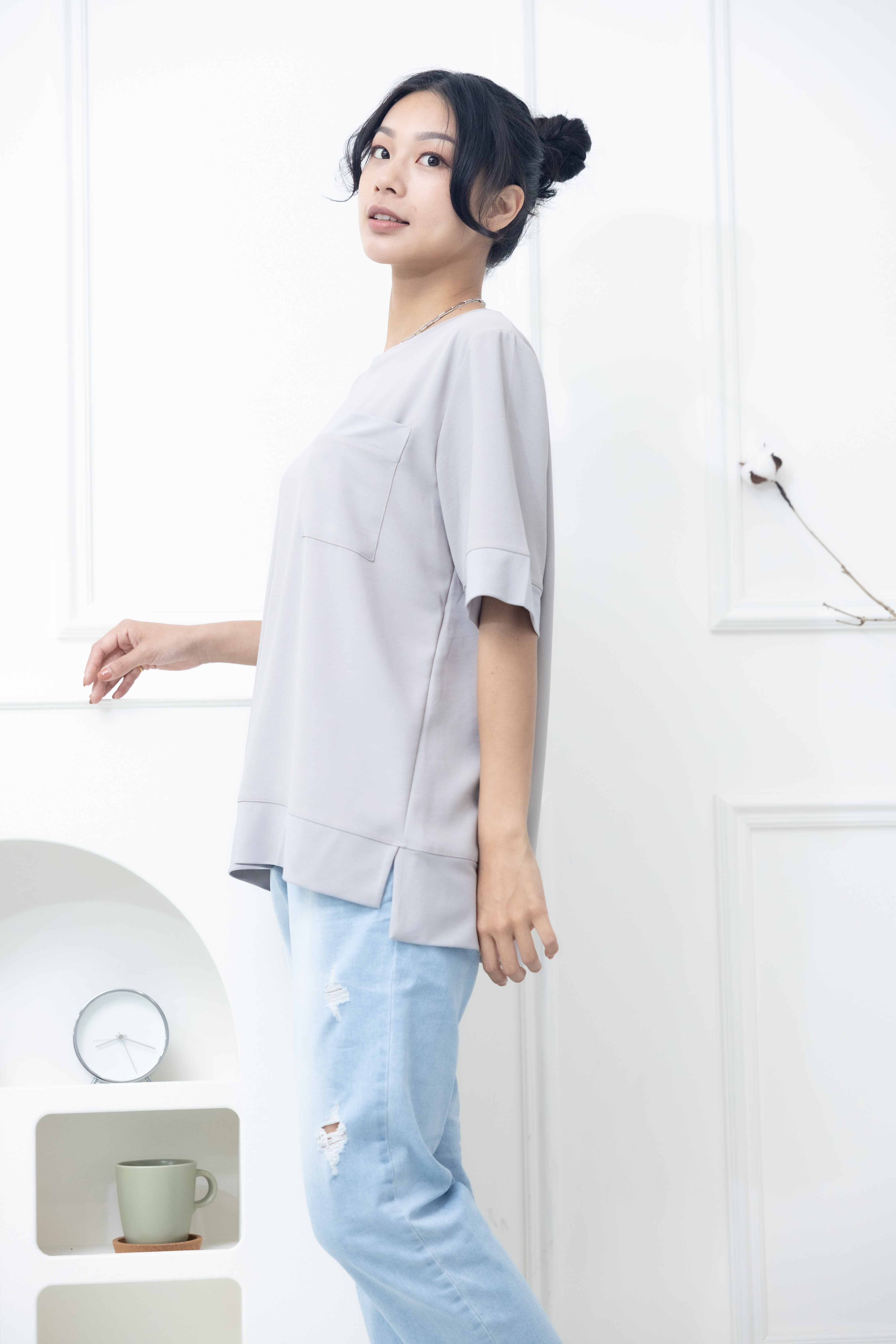 반팔 胸前口袋彈性纖維上衣 / 米灰色