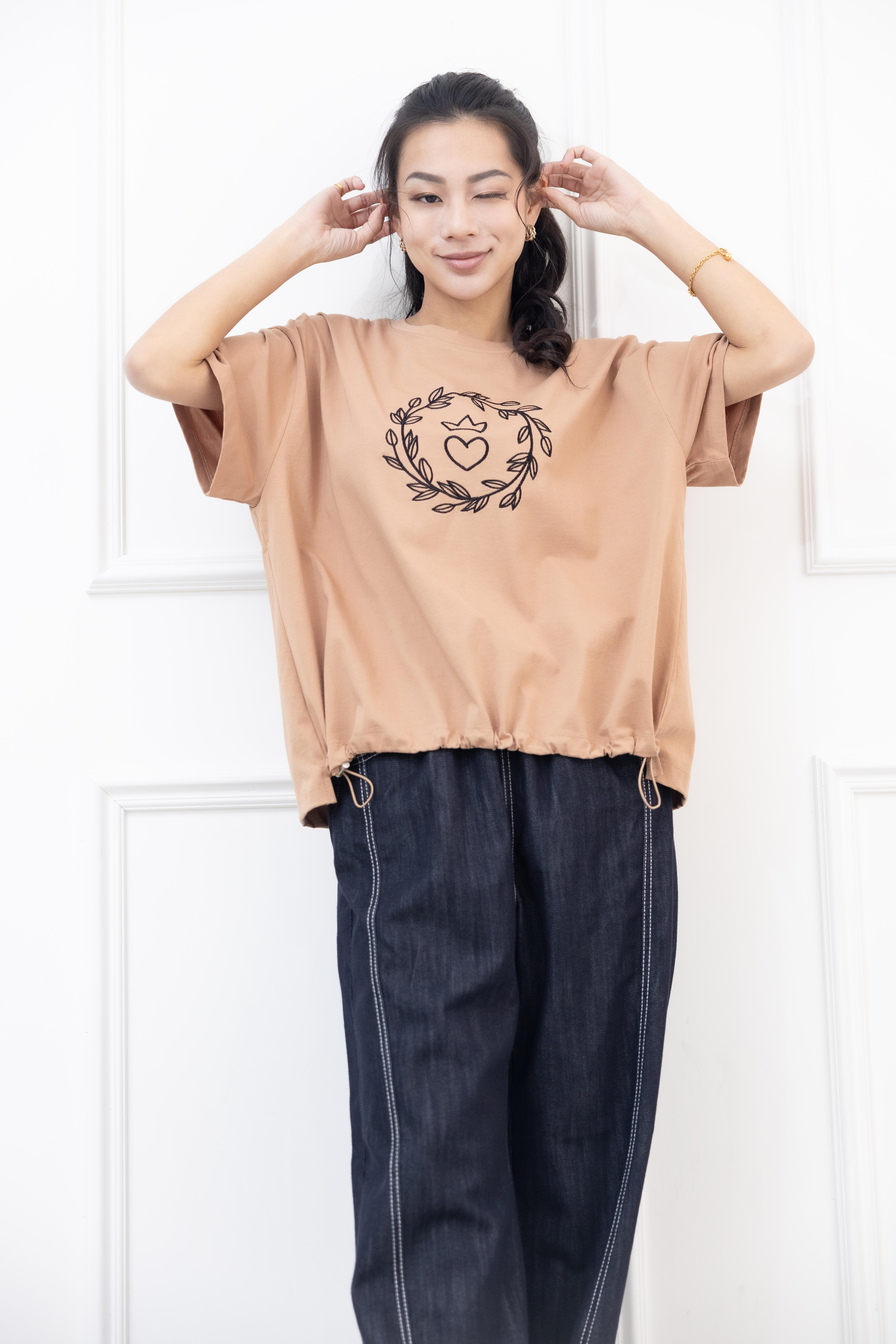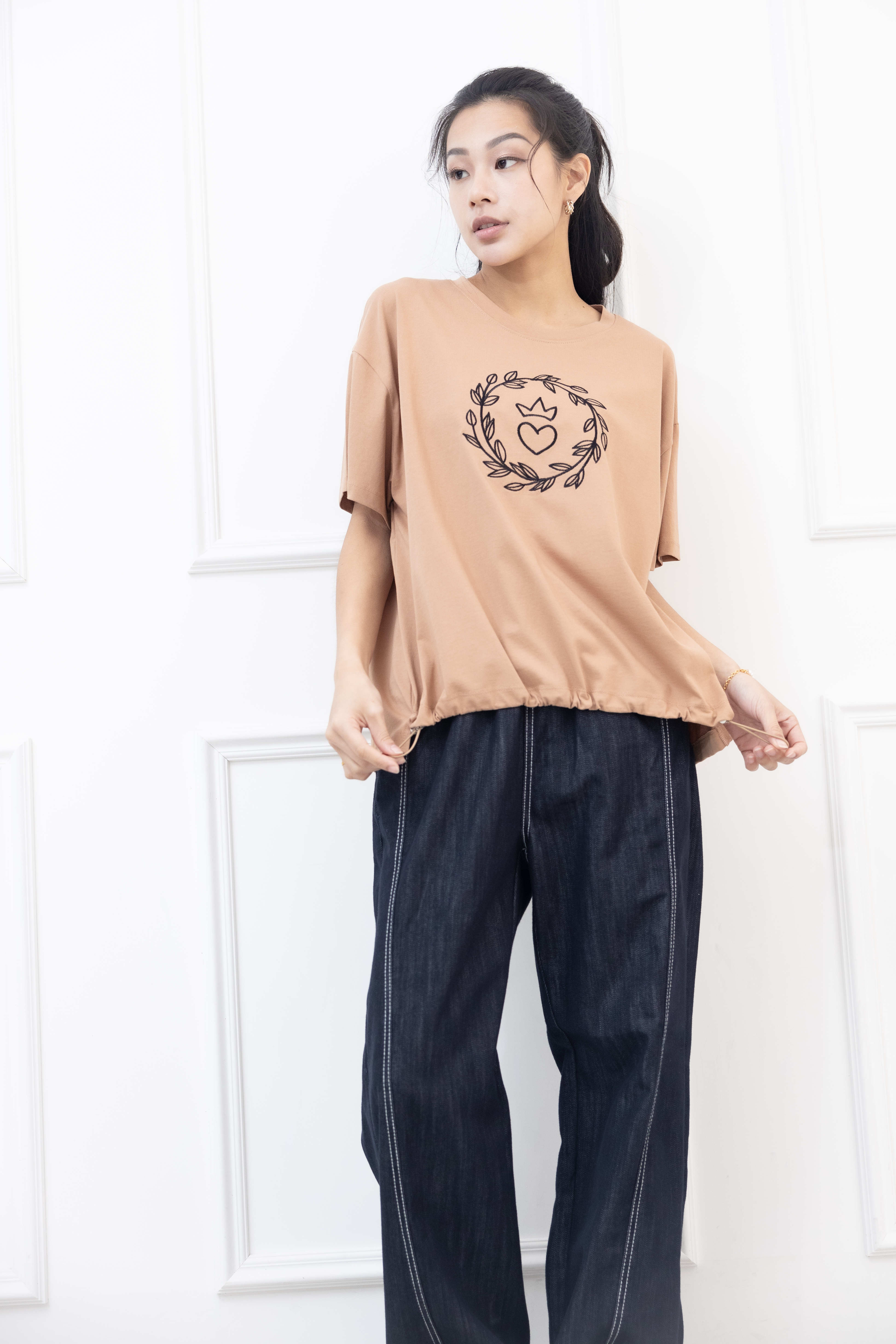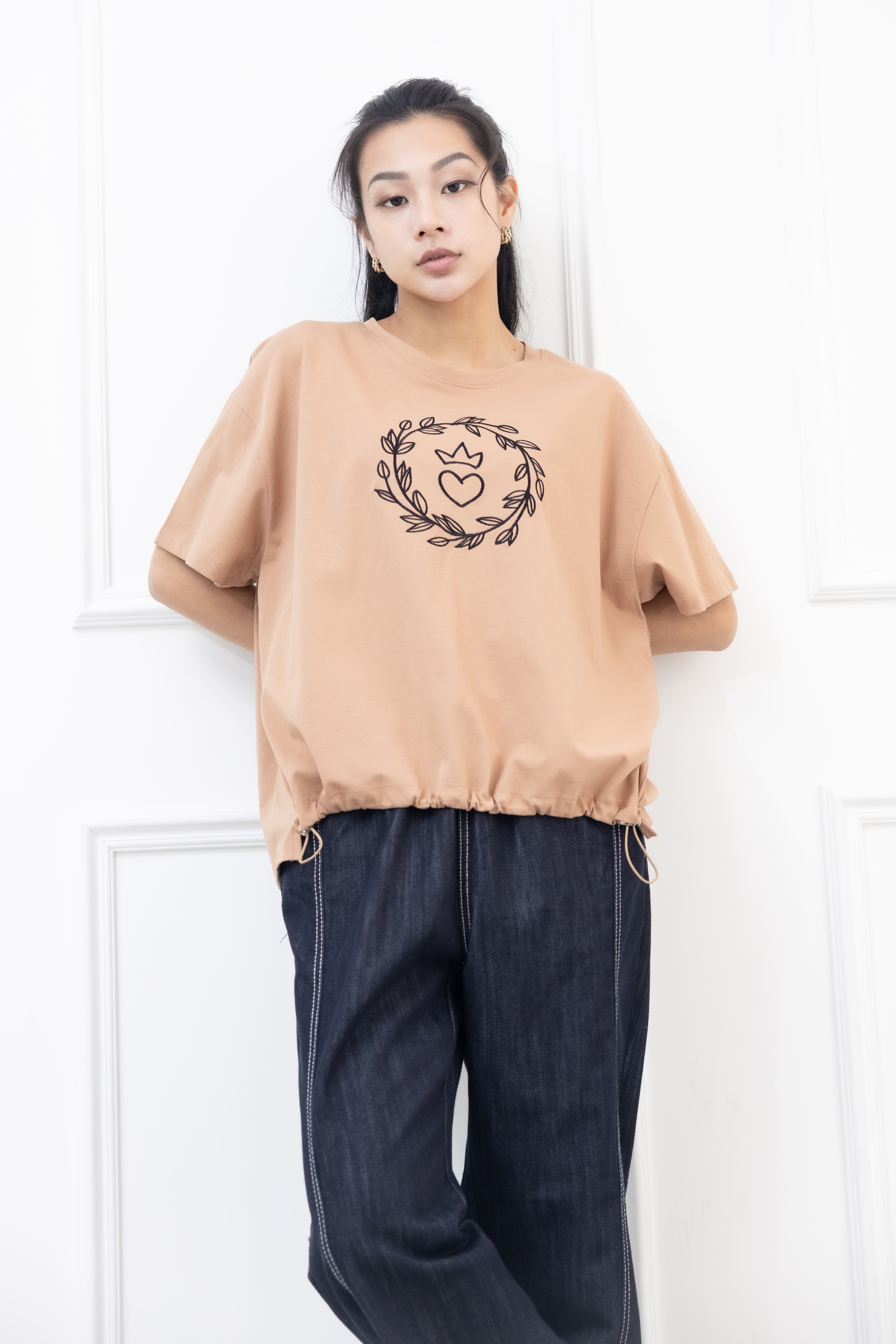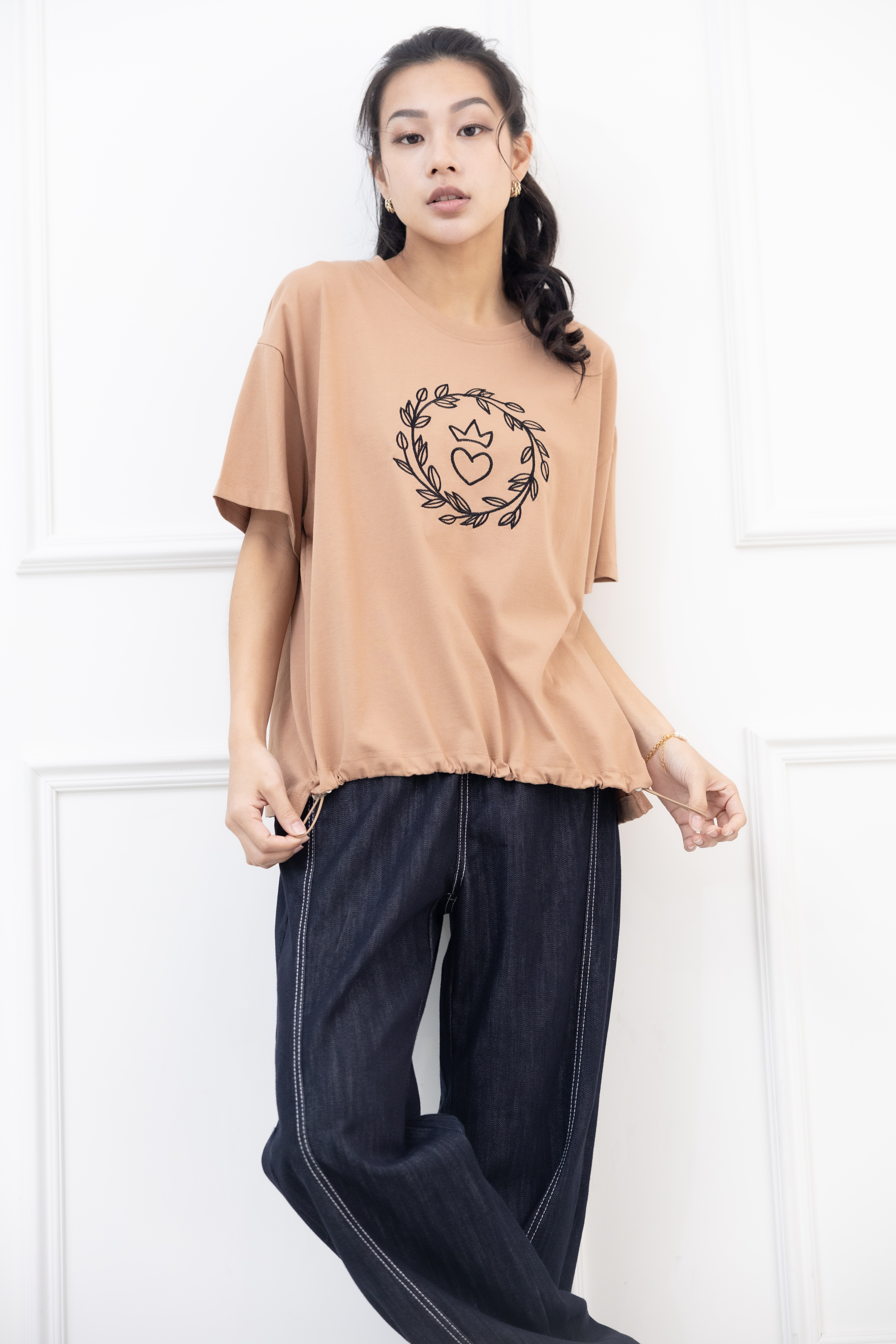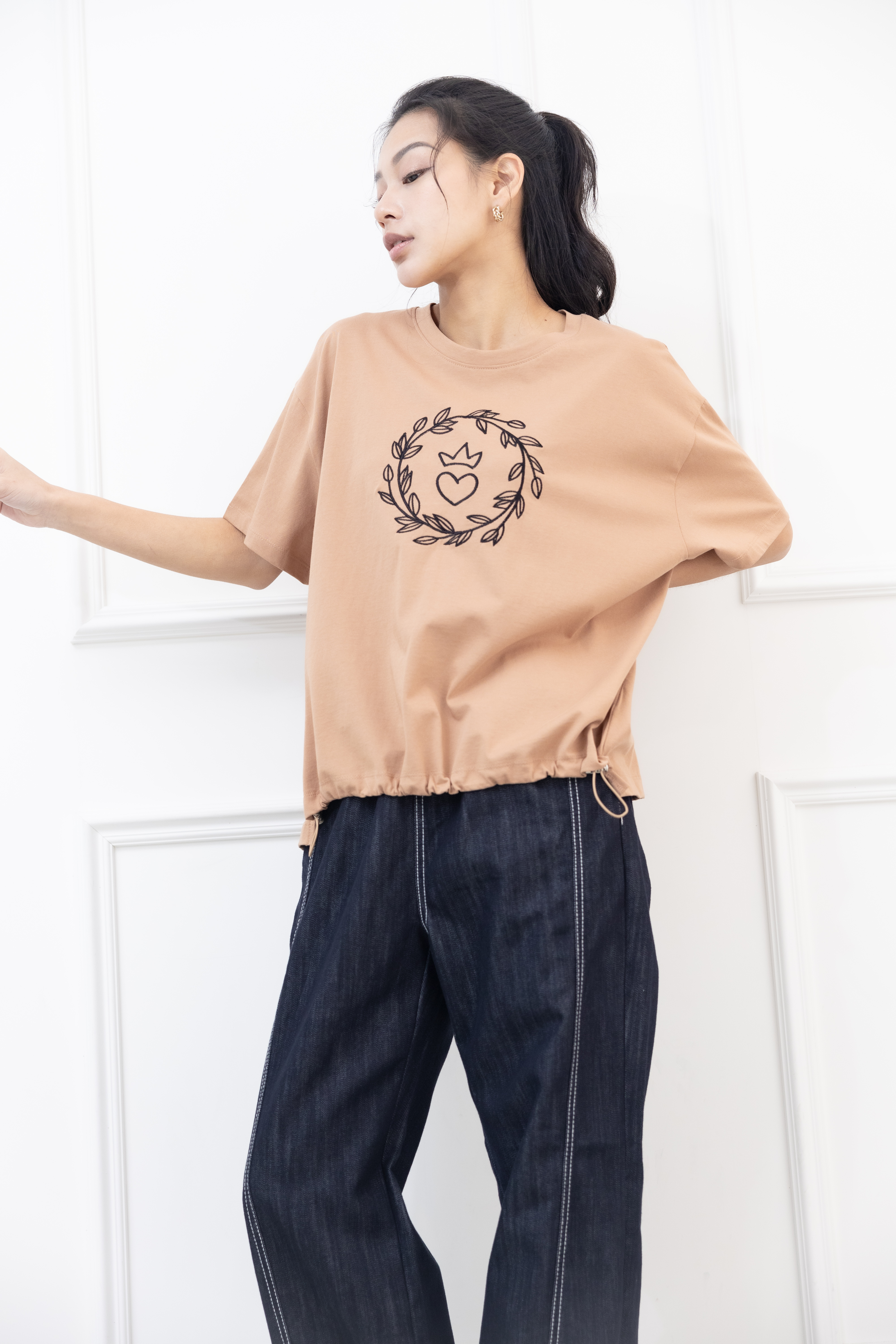 반팔 胸前立體花圈愛心刺繡上衣 / 土色
