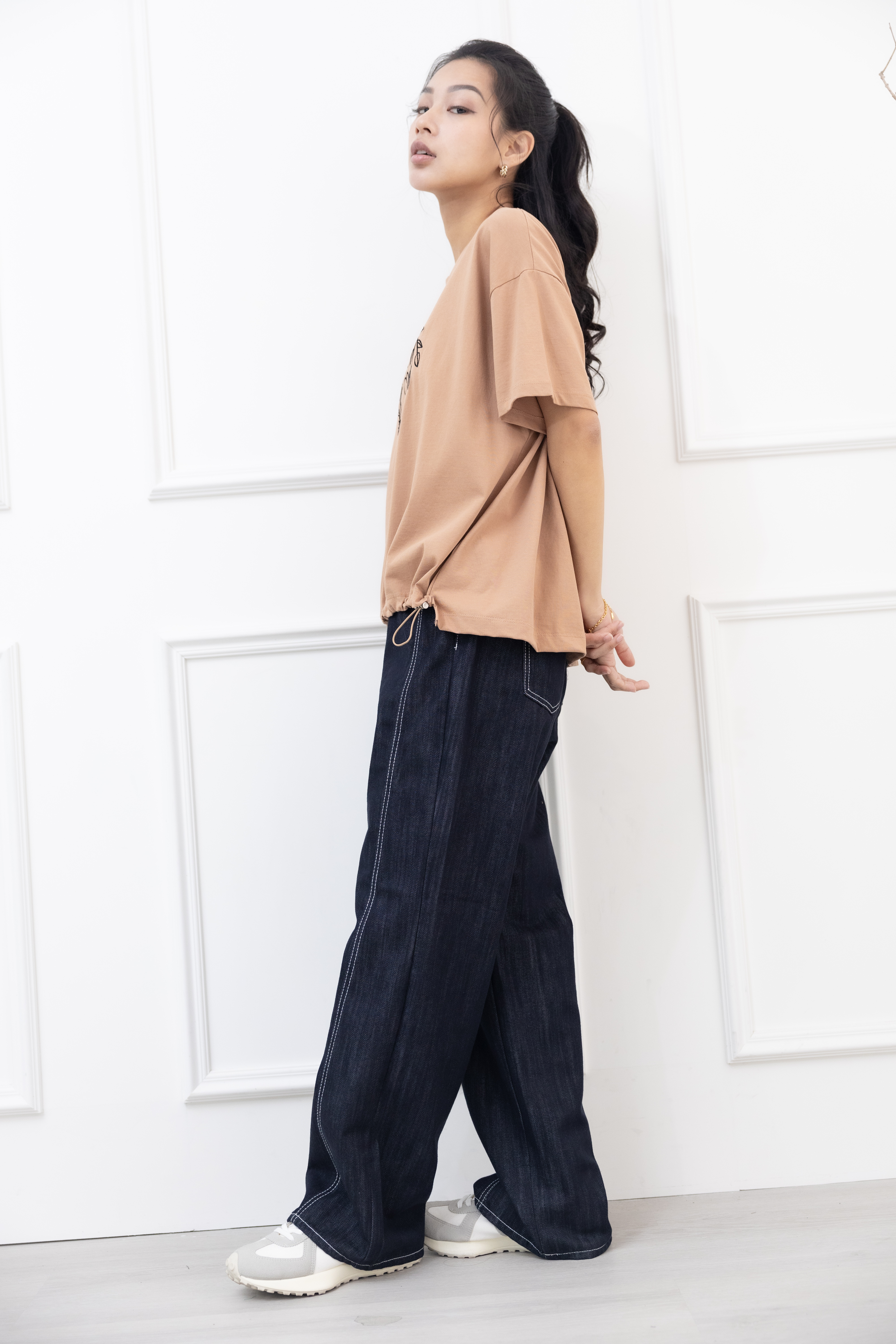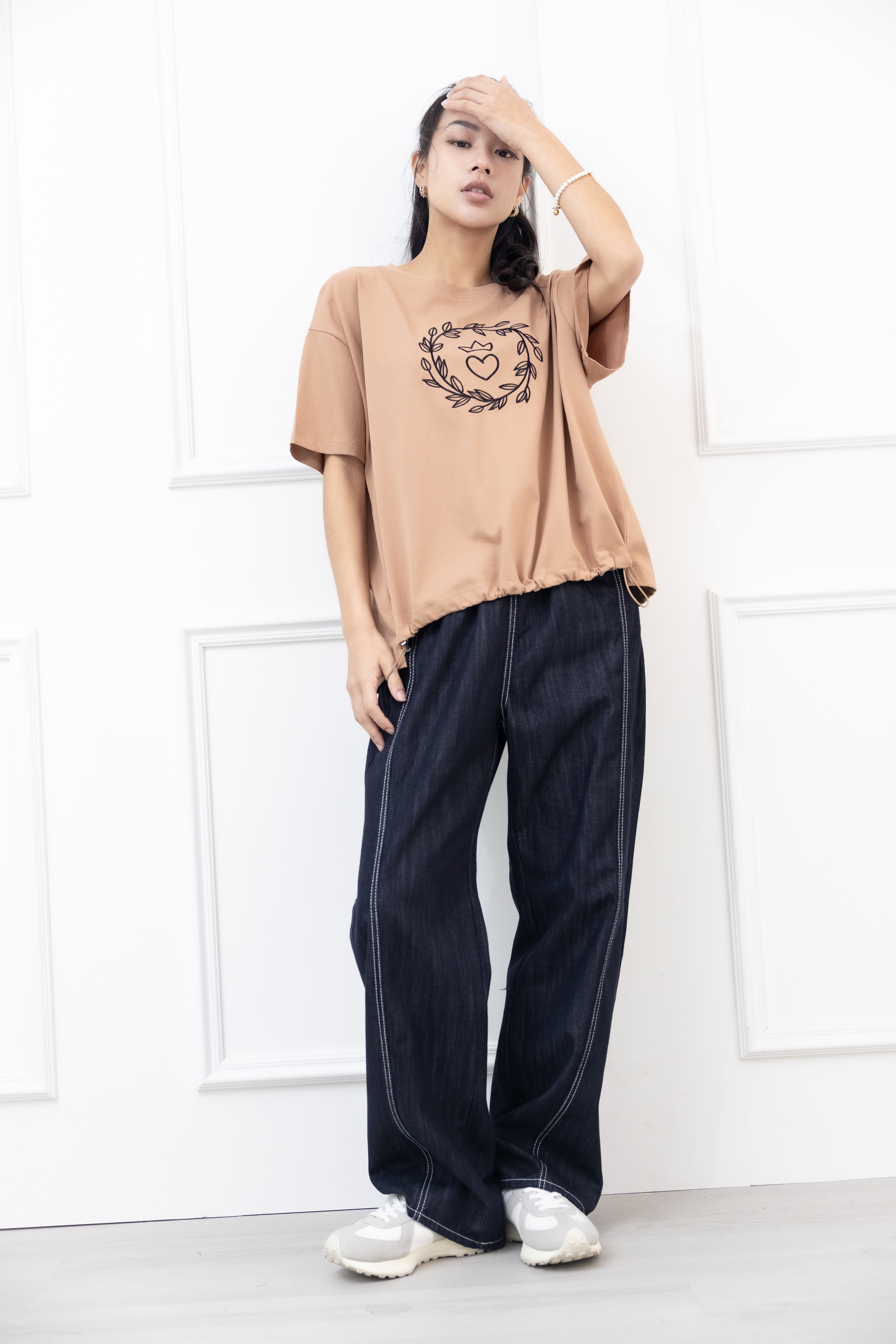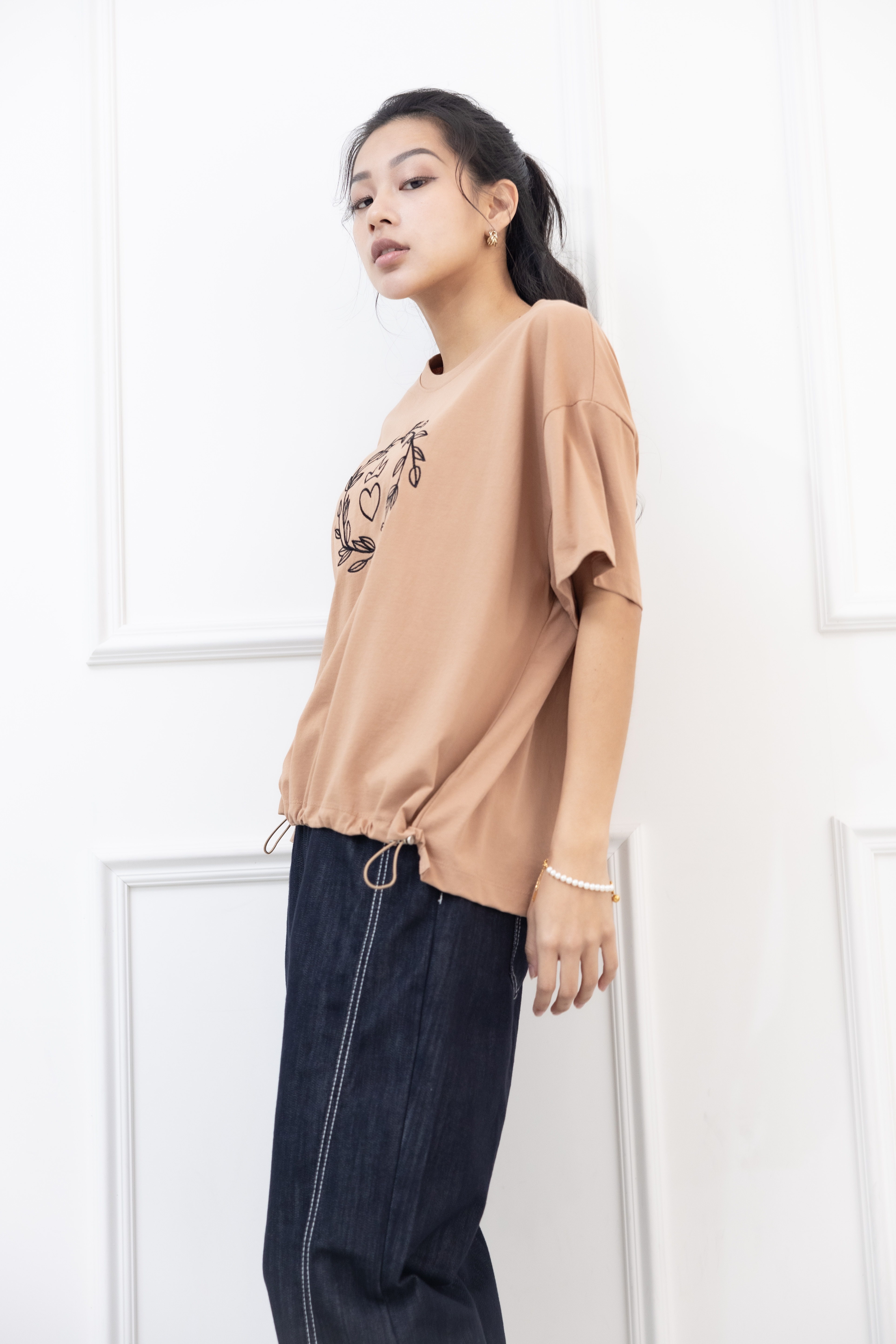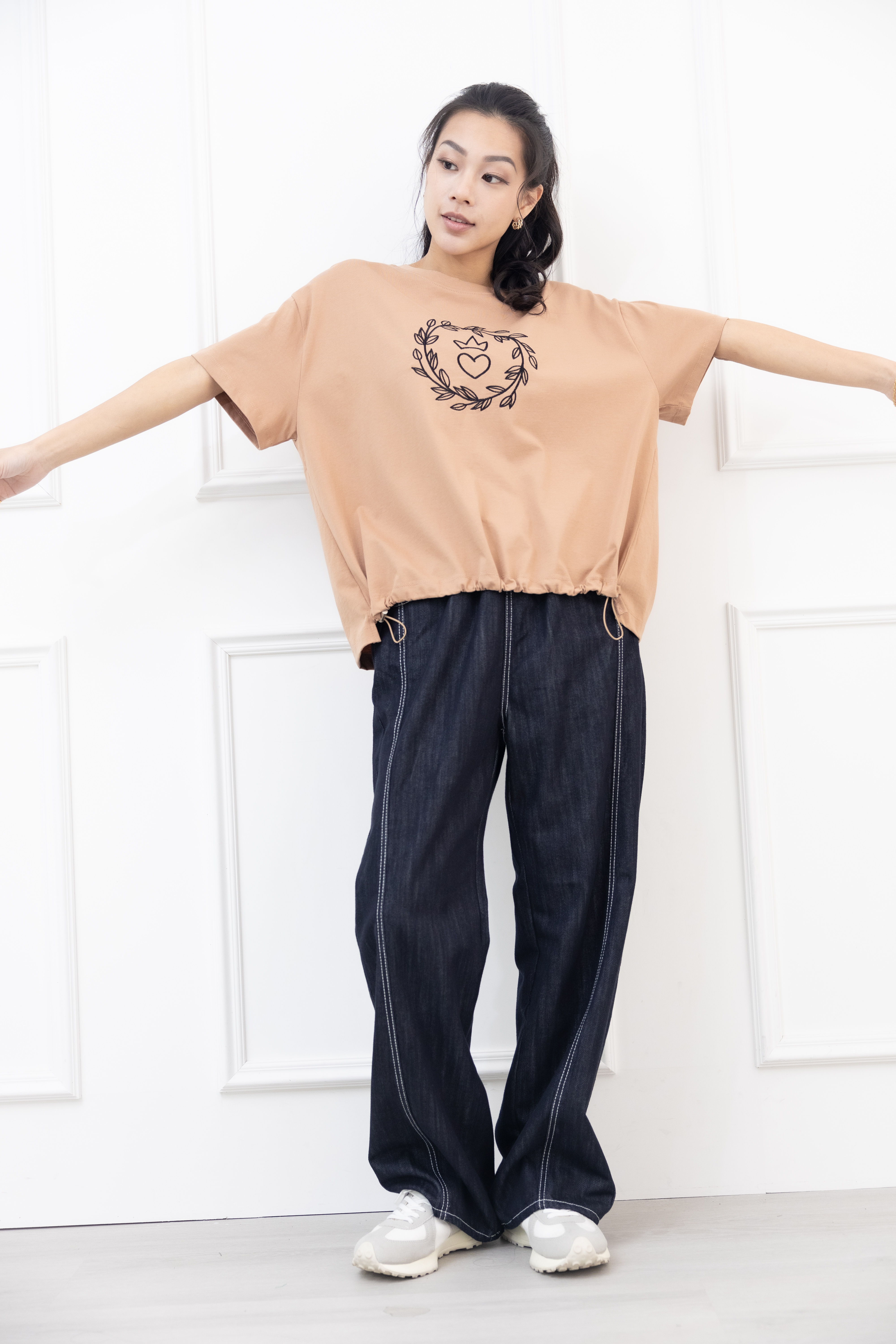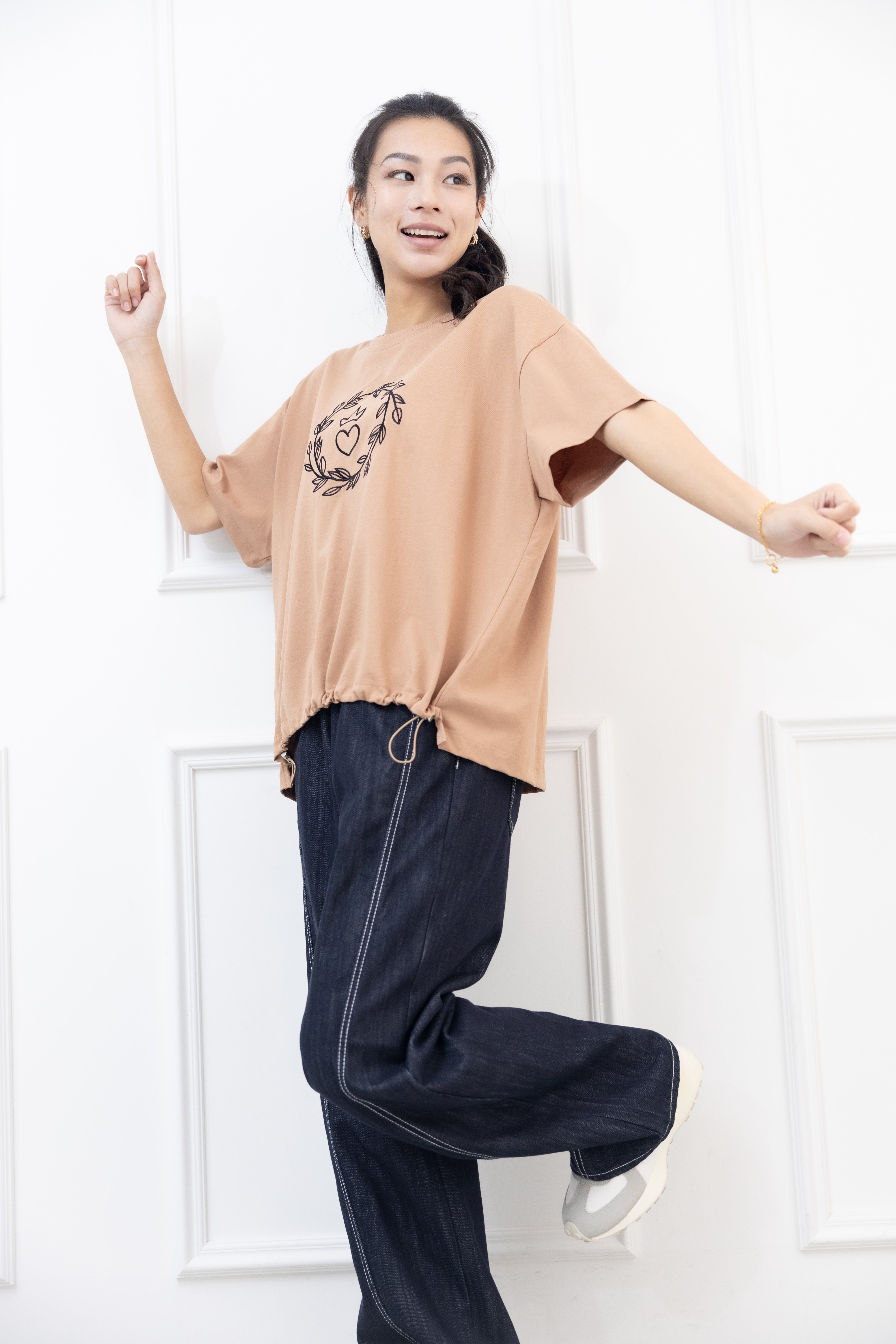 반팔 胸前立體花圈愛心刺繡上衣 / 土色