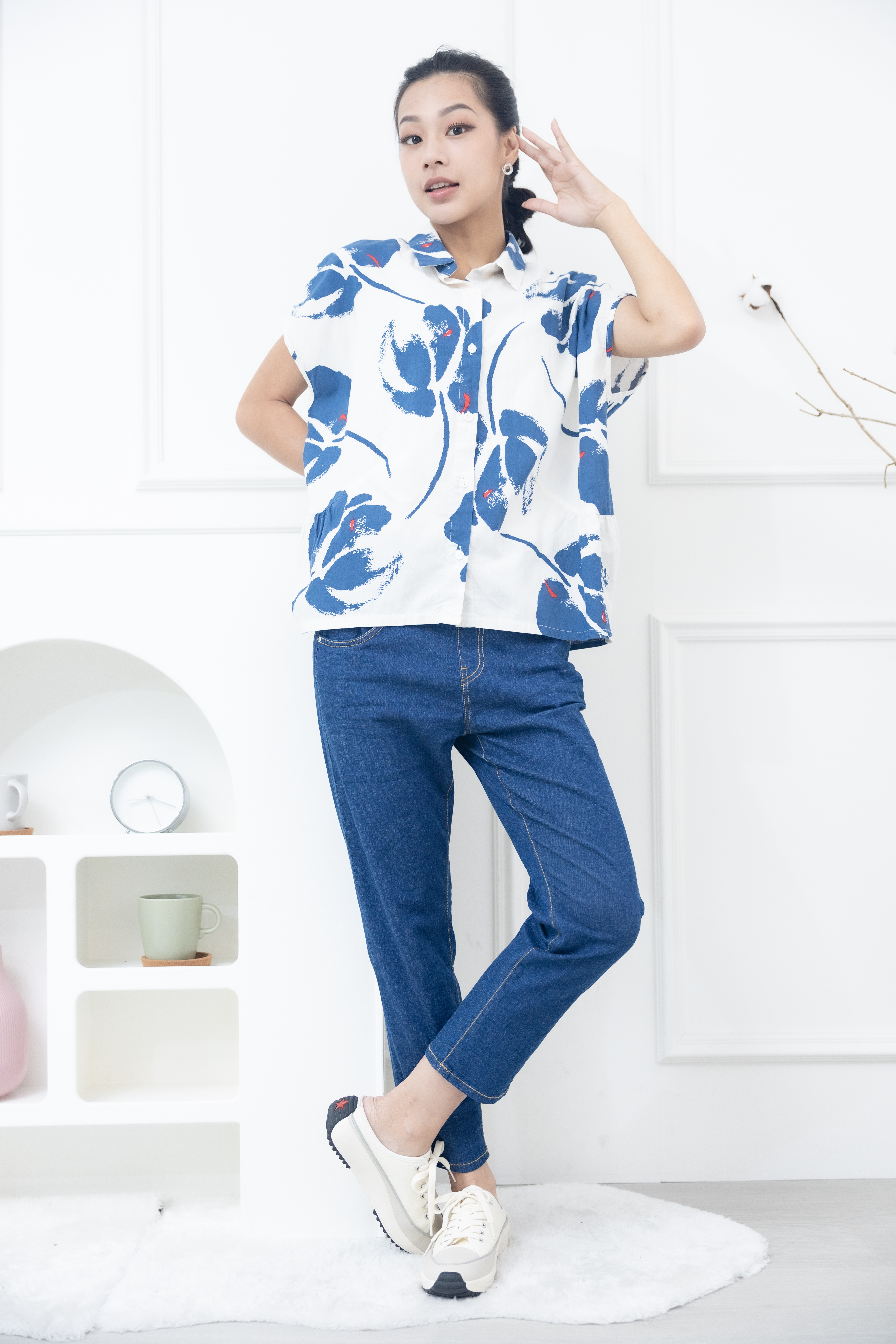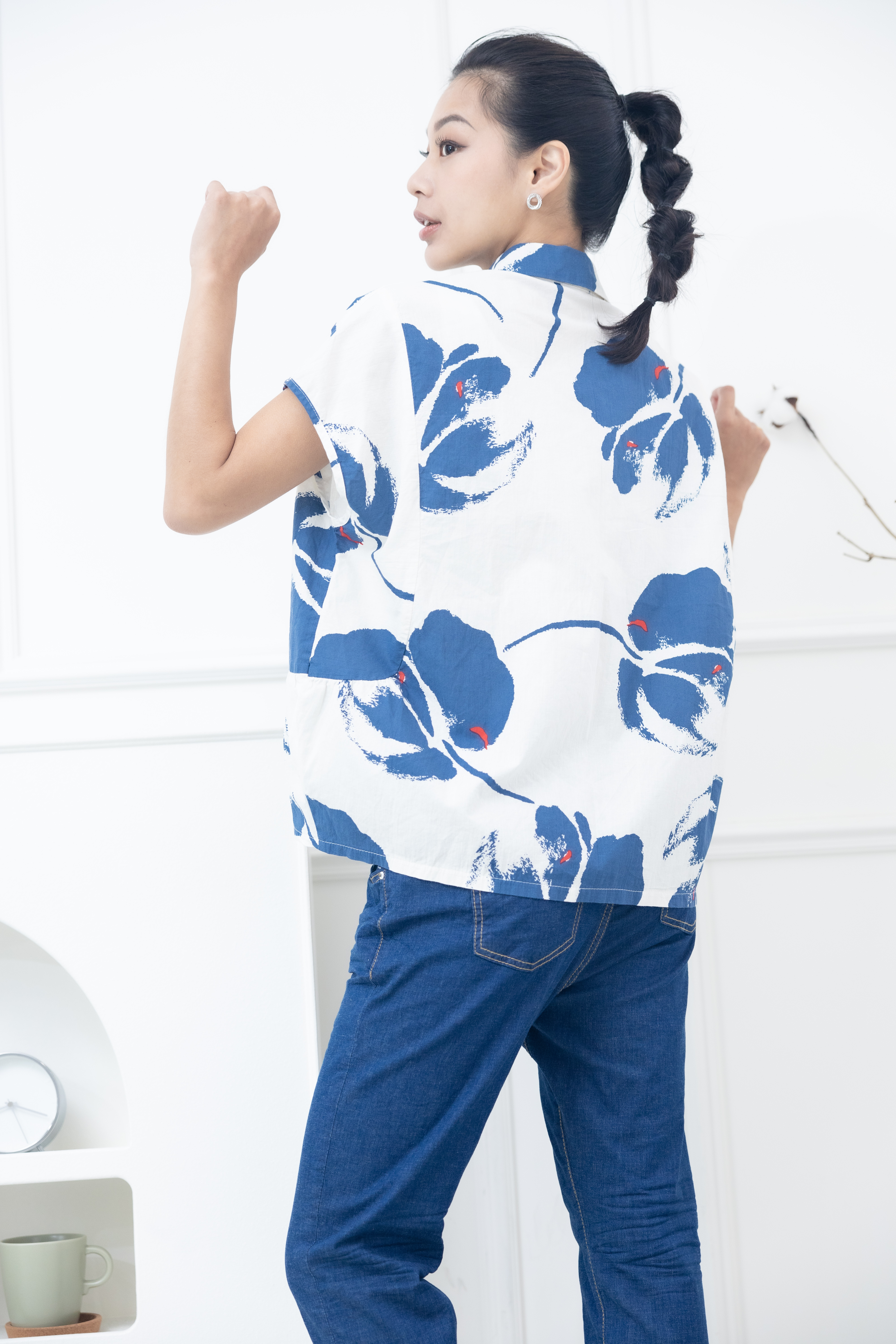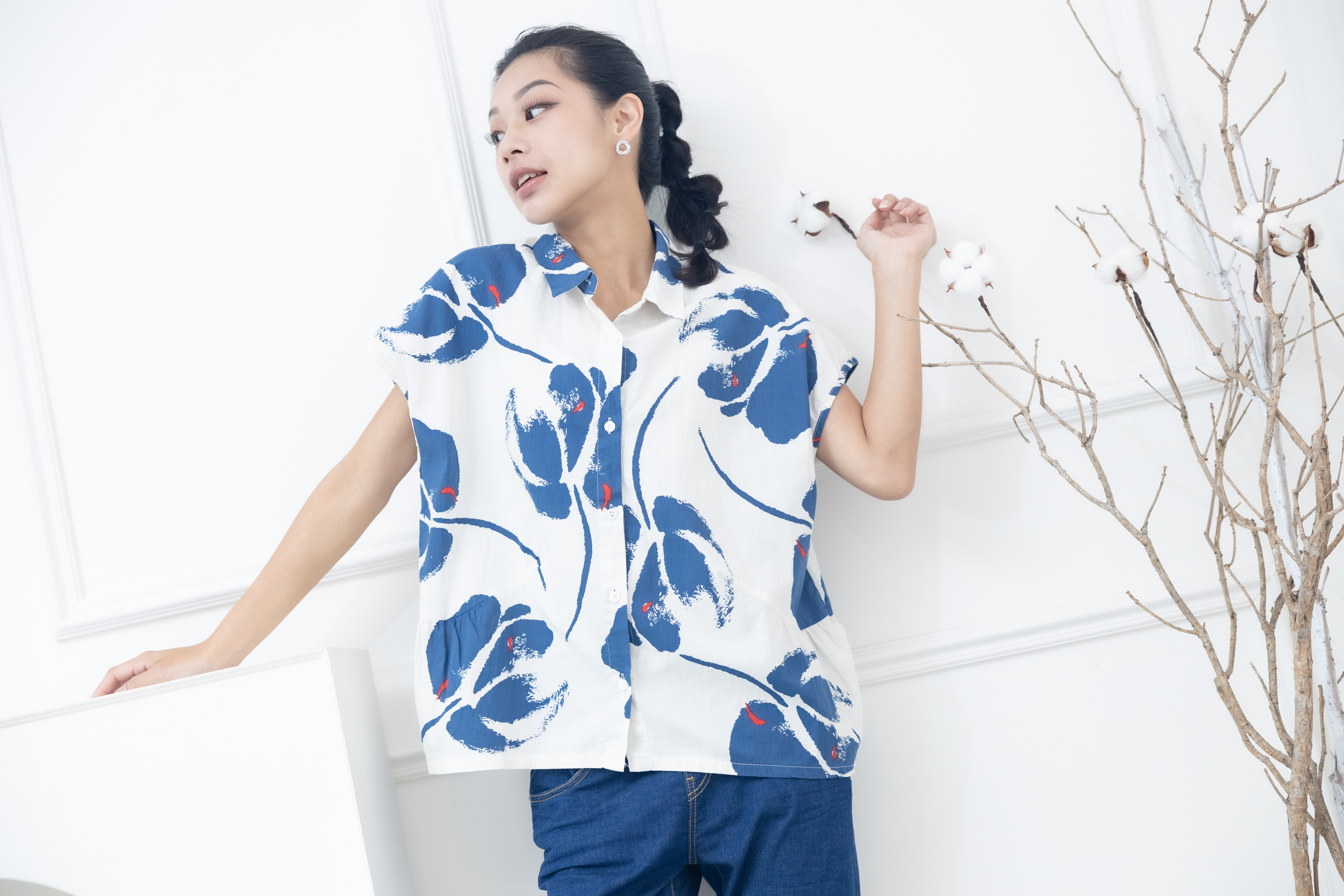 반팔 藍色水彩大花無袖襯衫 / 白色