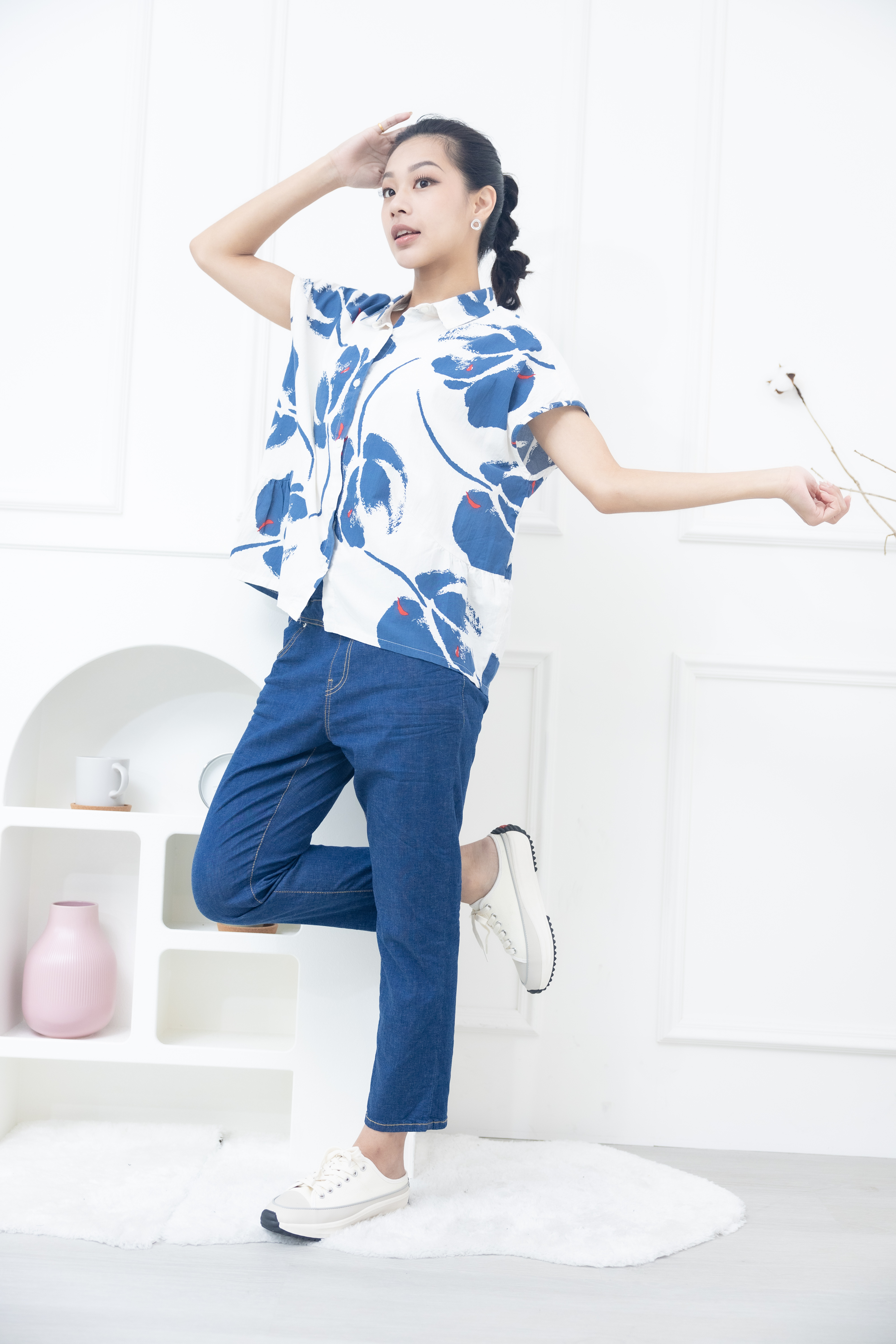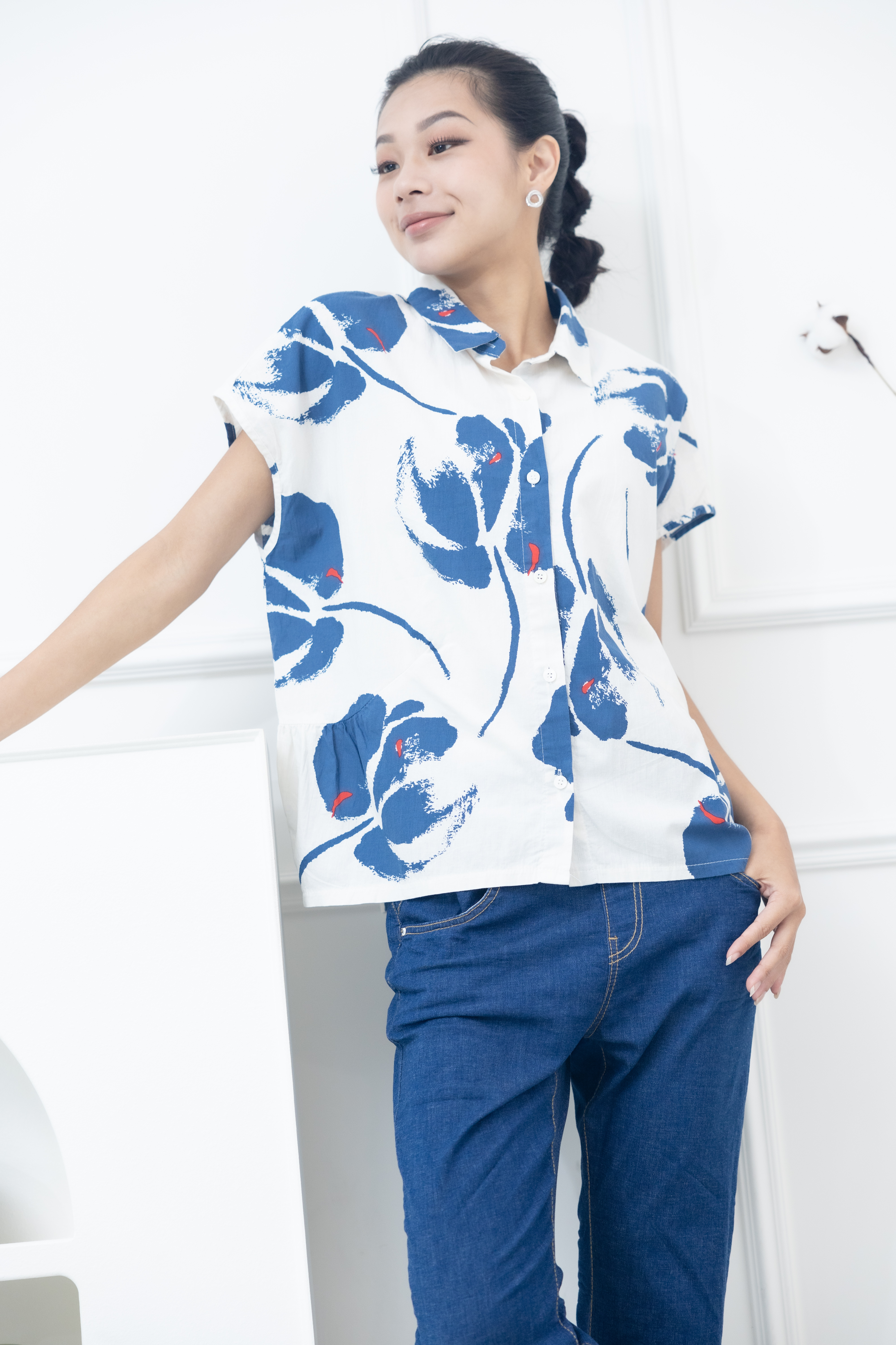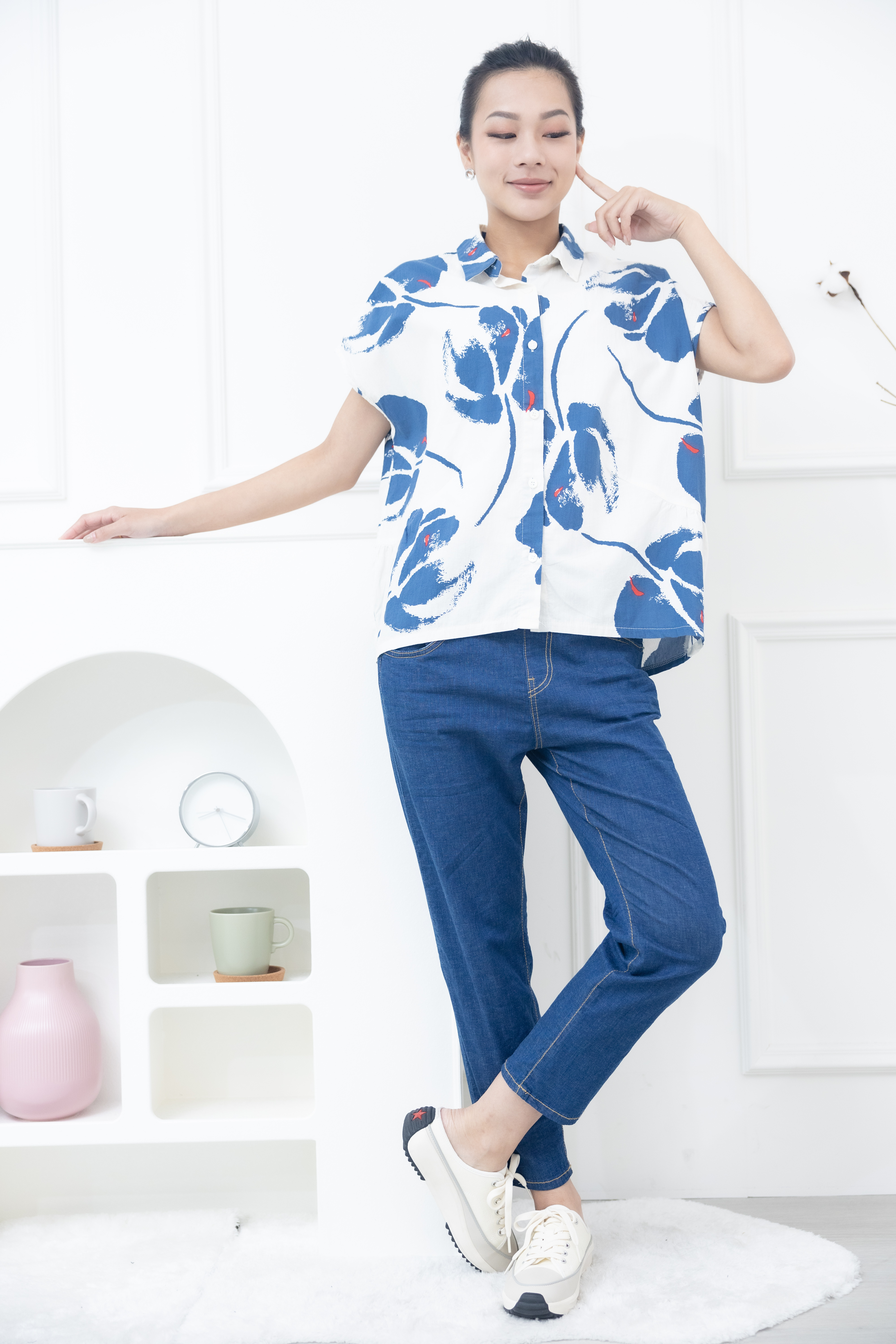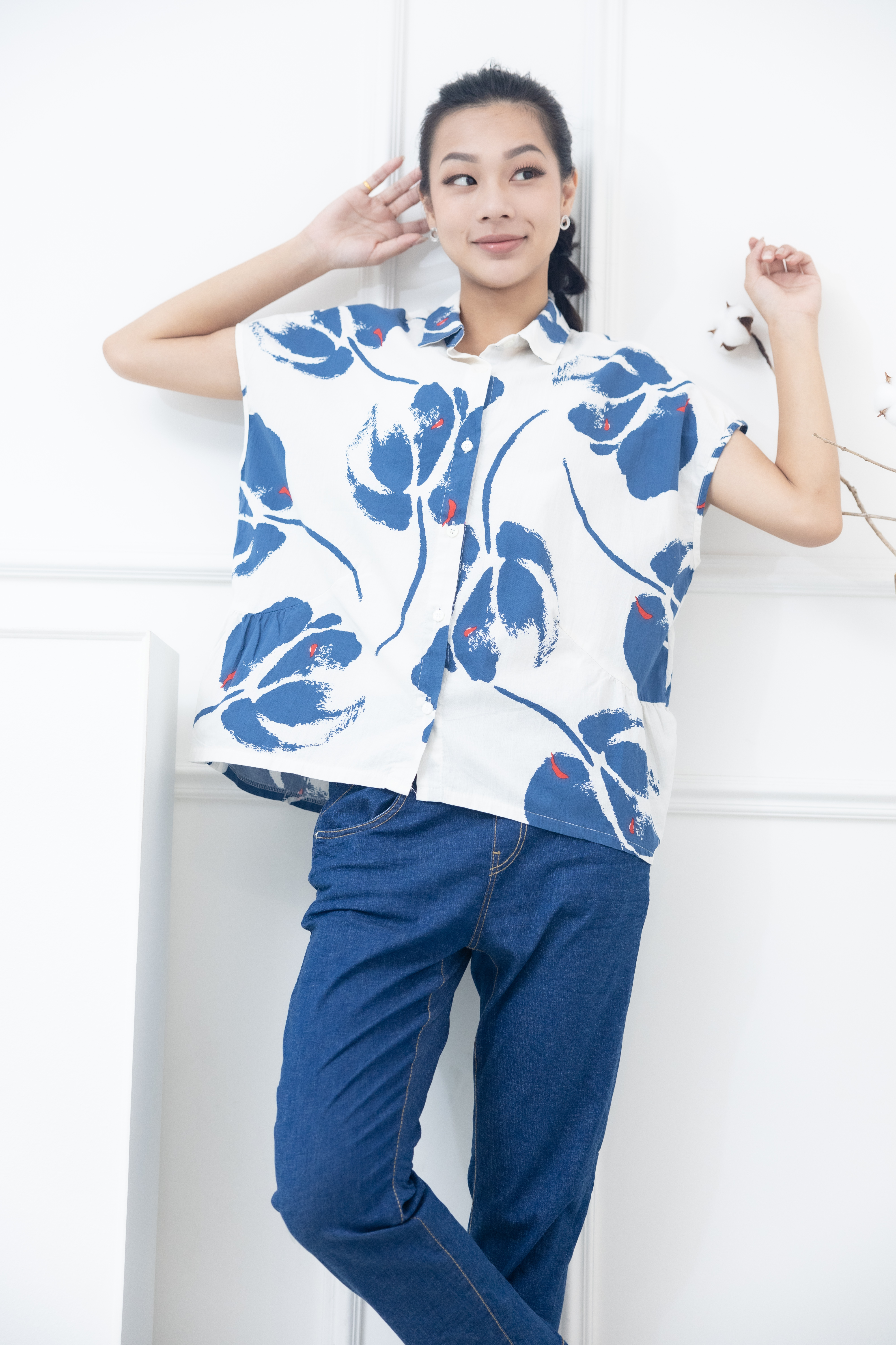 반팔 藍色水彩大花無袖襯衫 / 白色