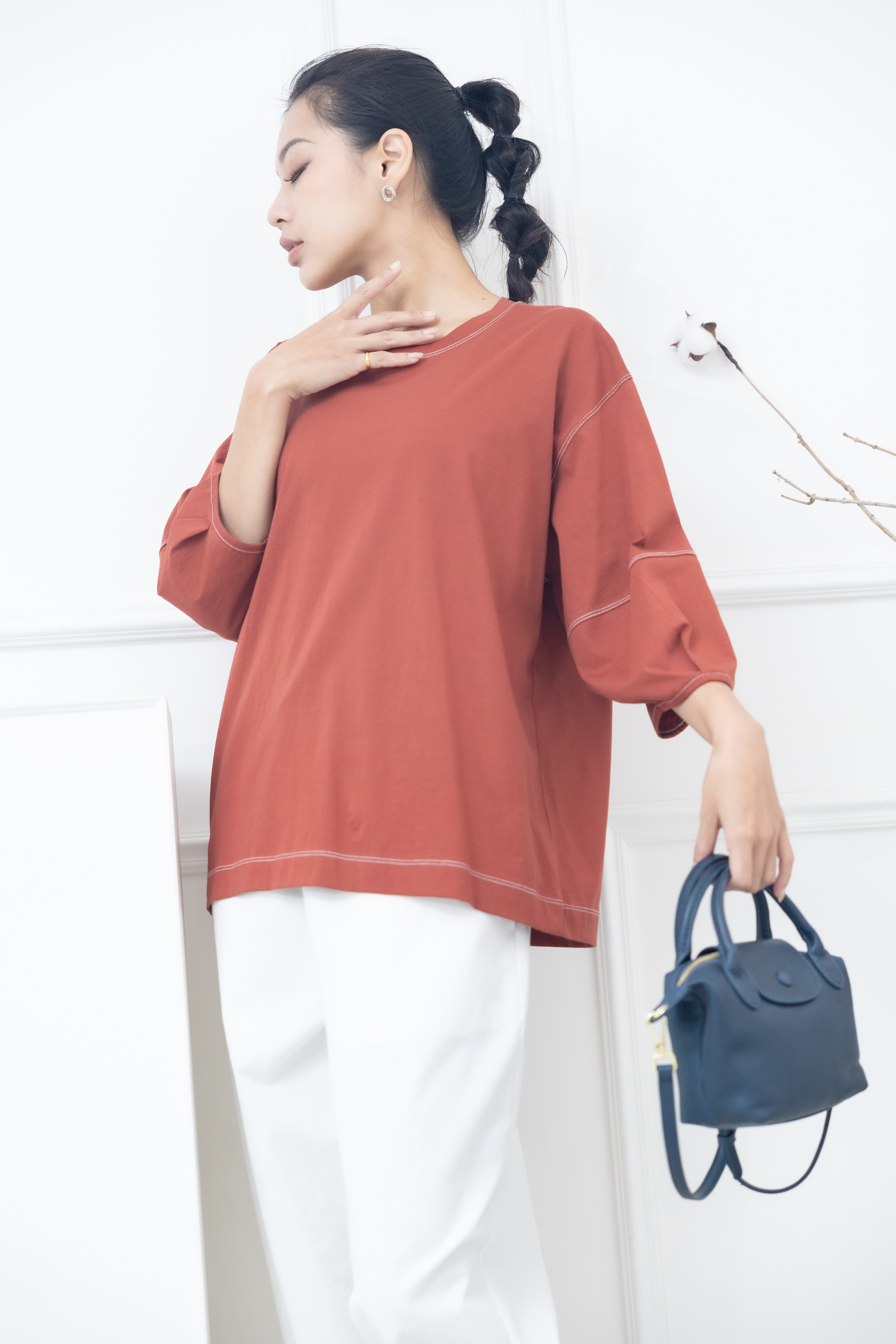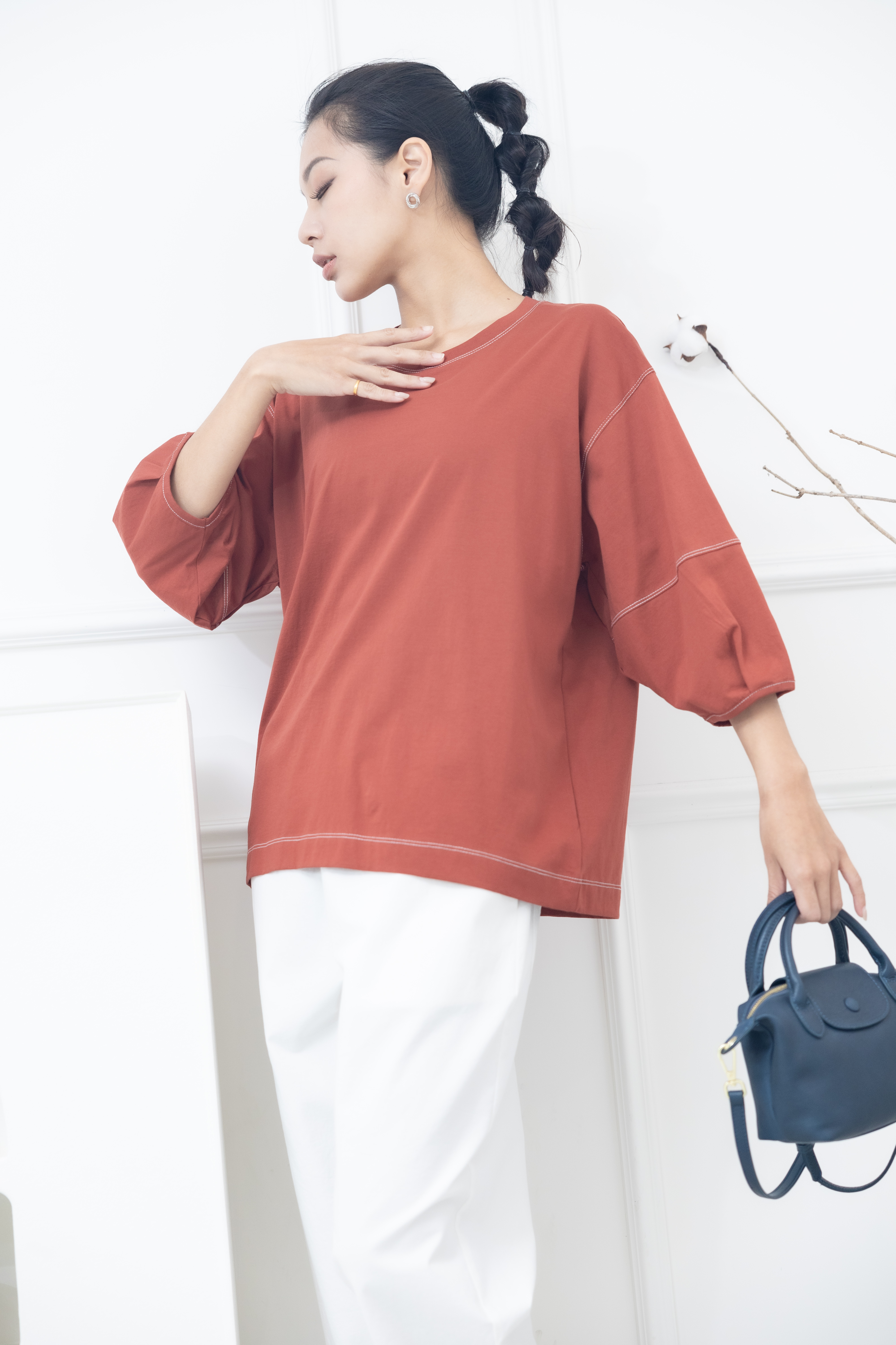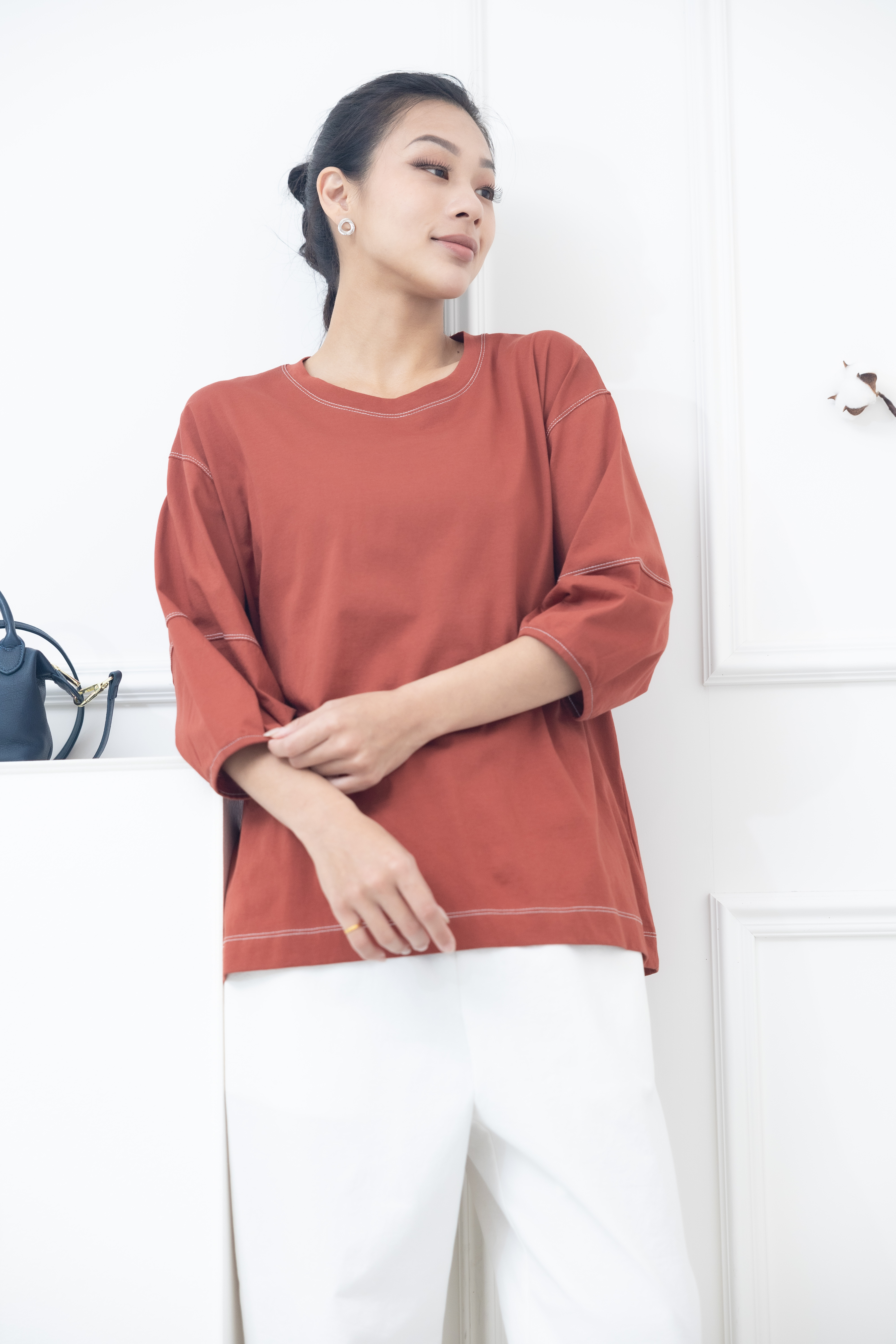 반팔 袖子下擺白色縫線五分袖上衣 / 暗橘色