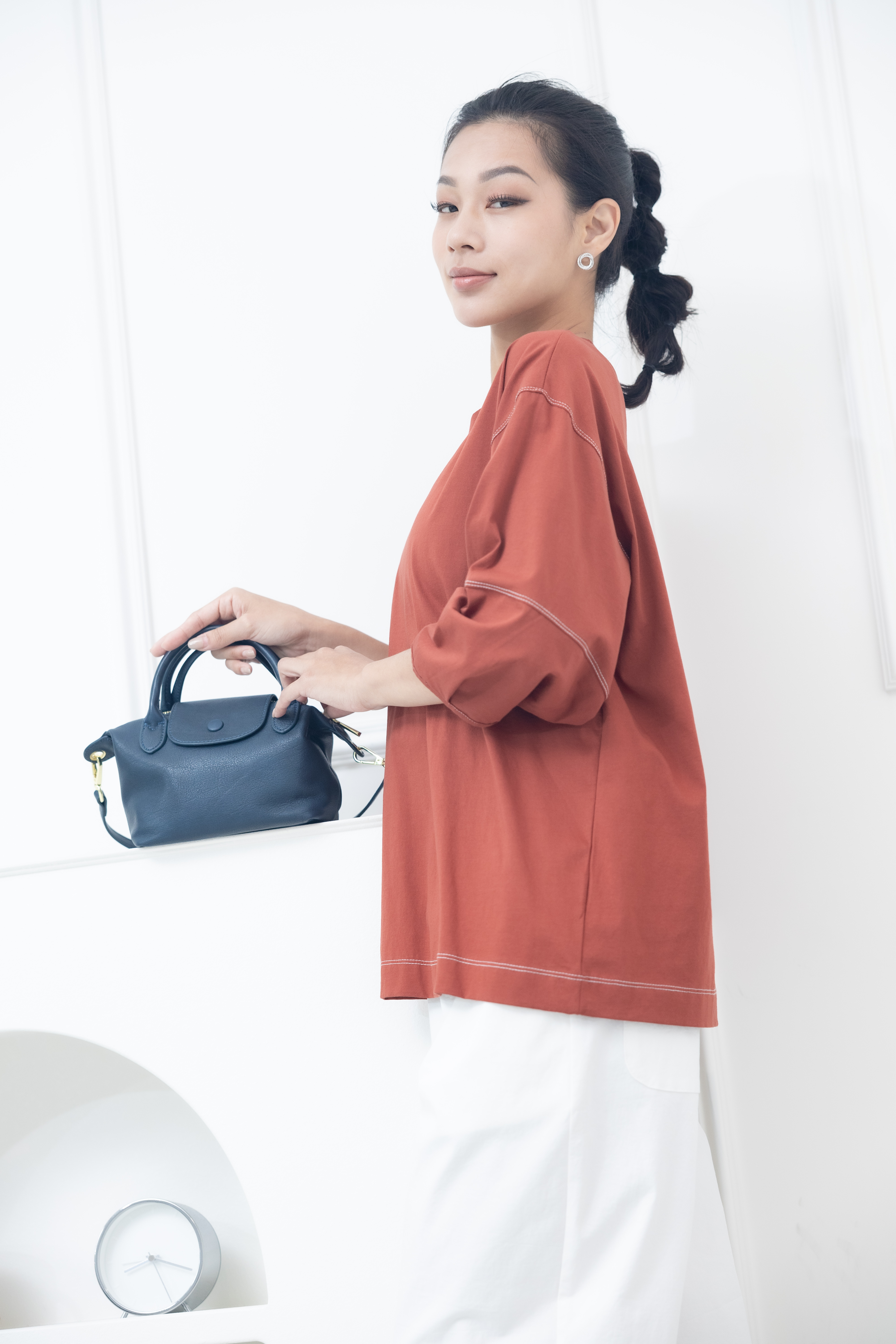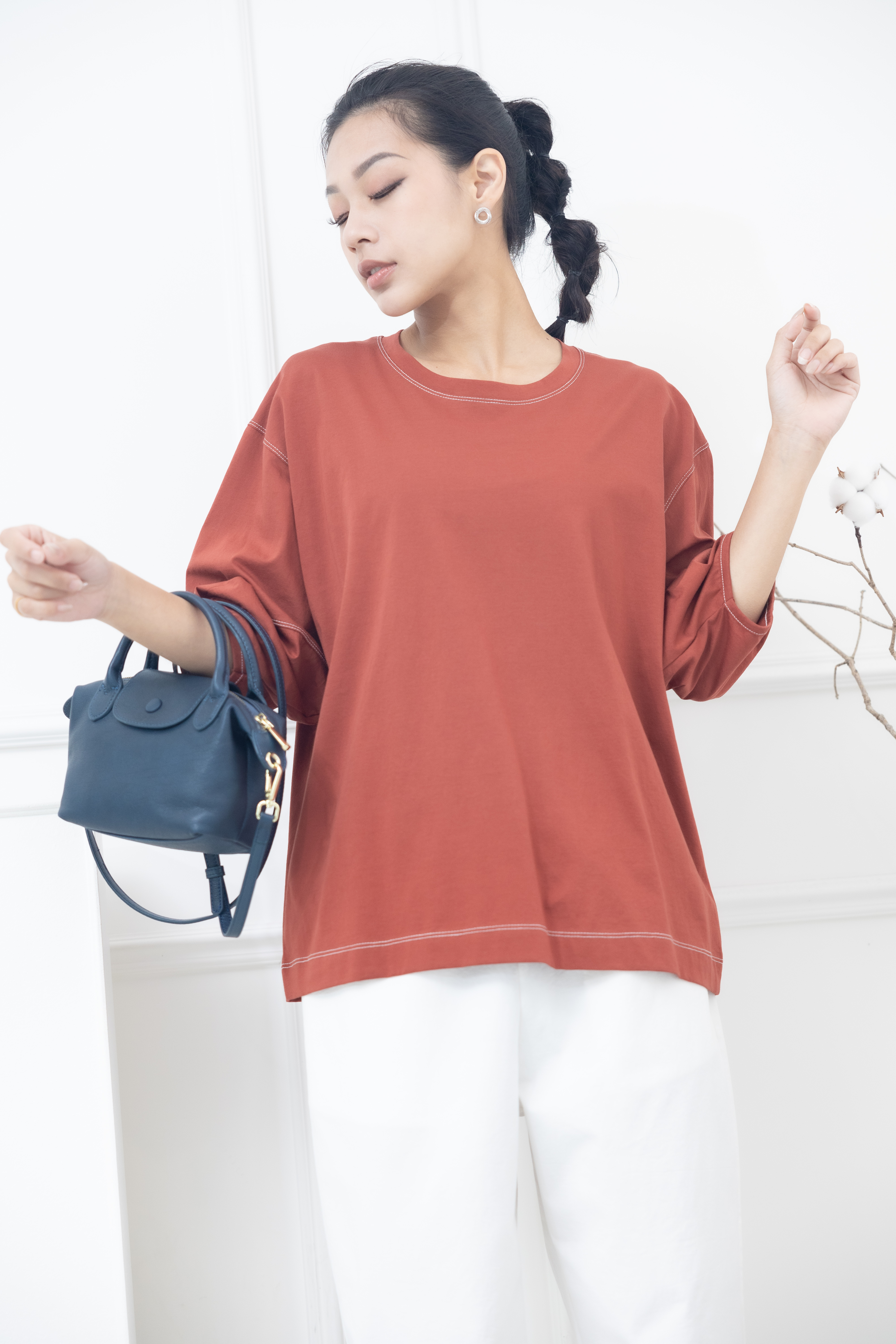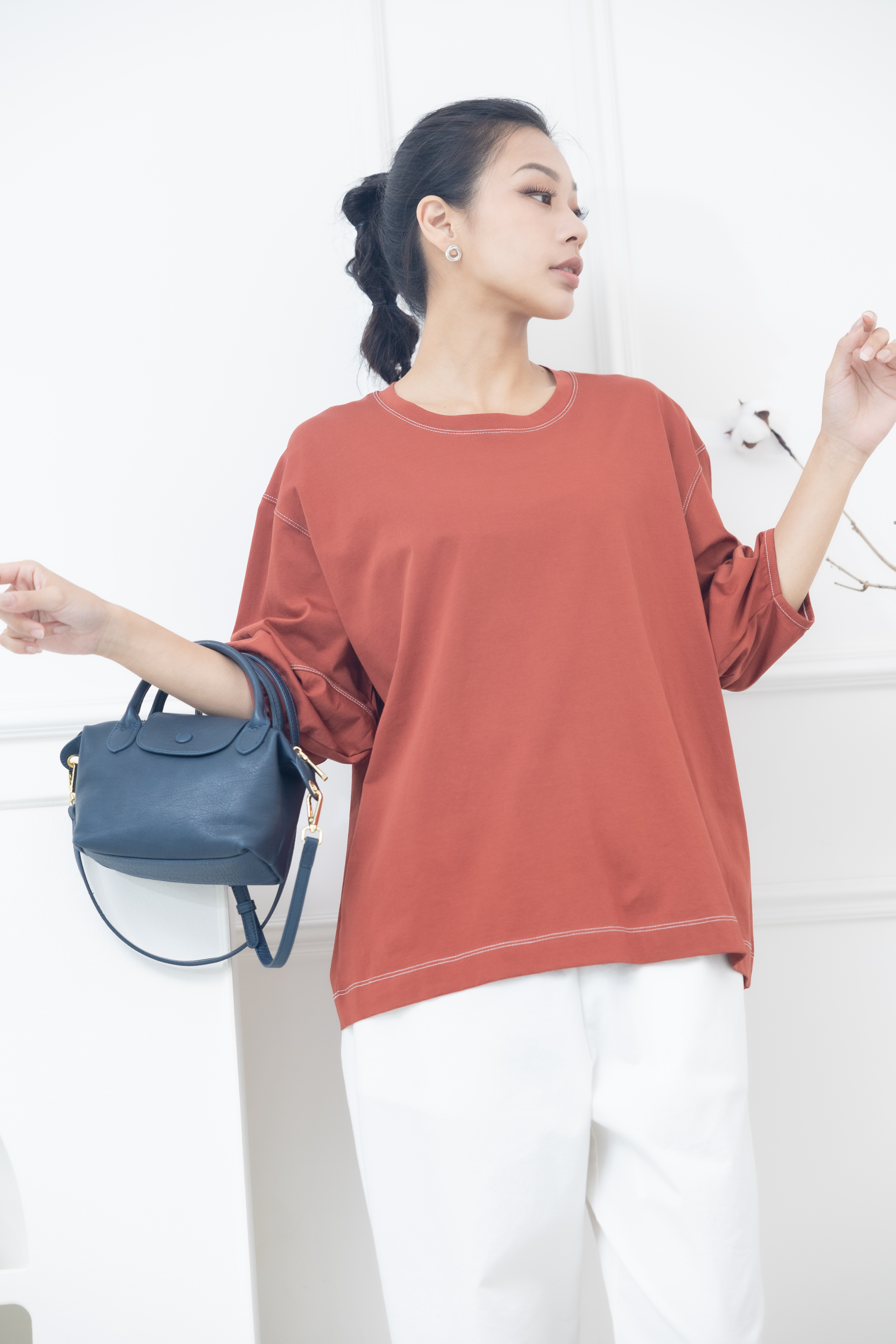 반팔 袖子下擺白色縫線五分袖上衣 / 暗橘色