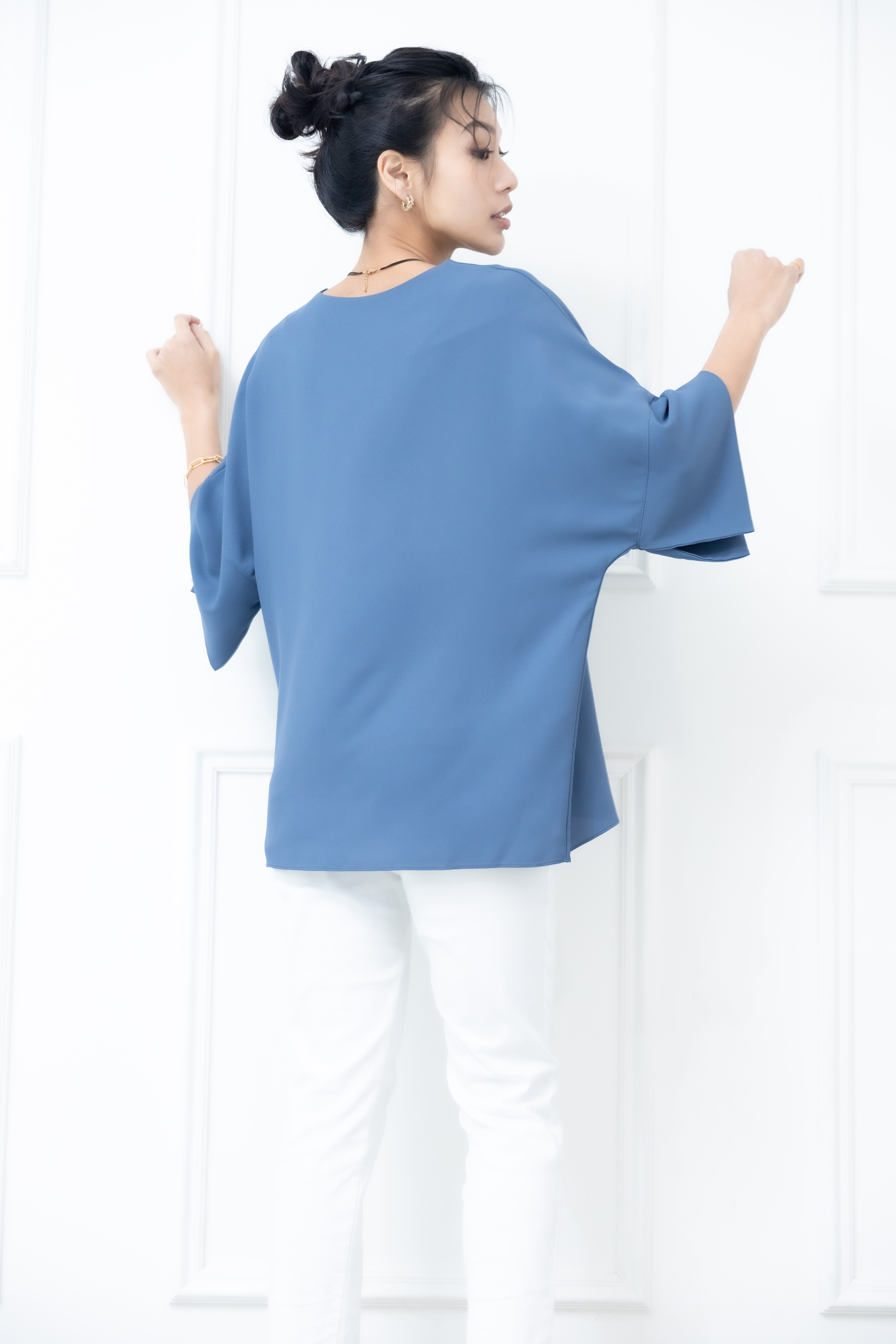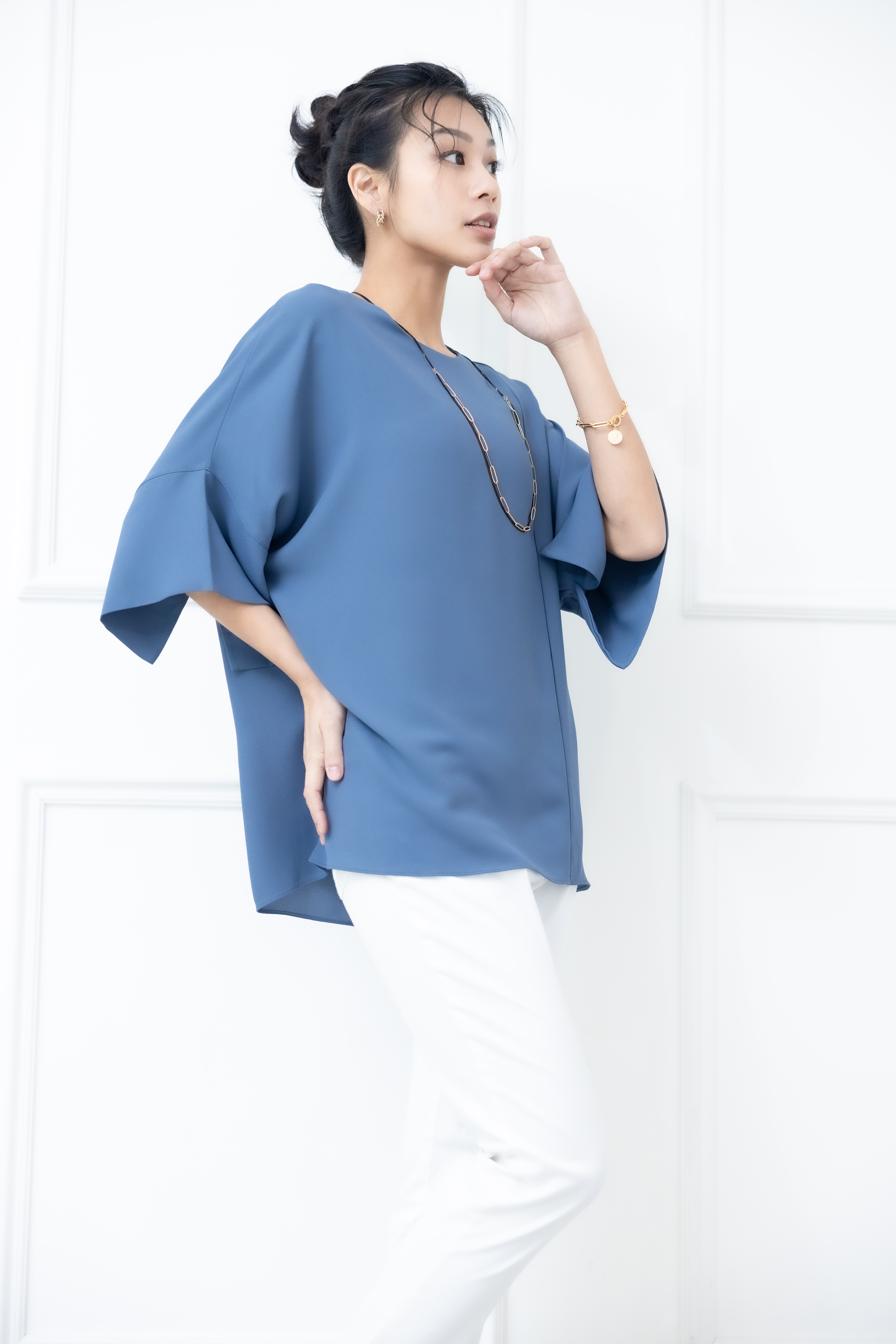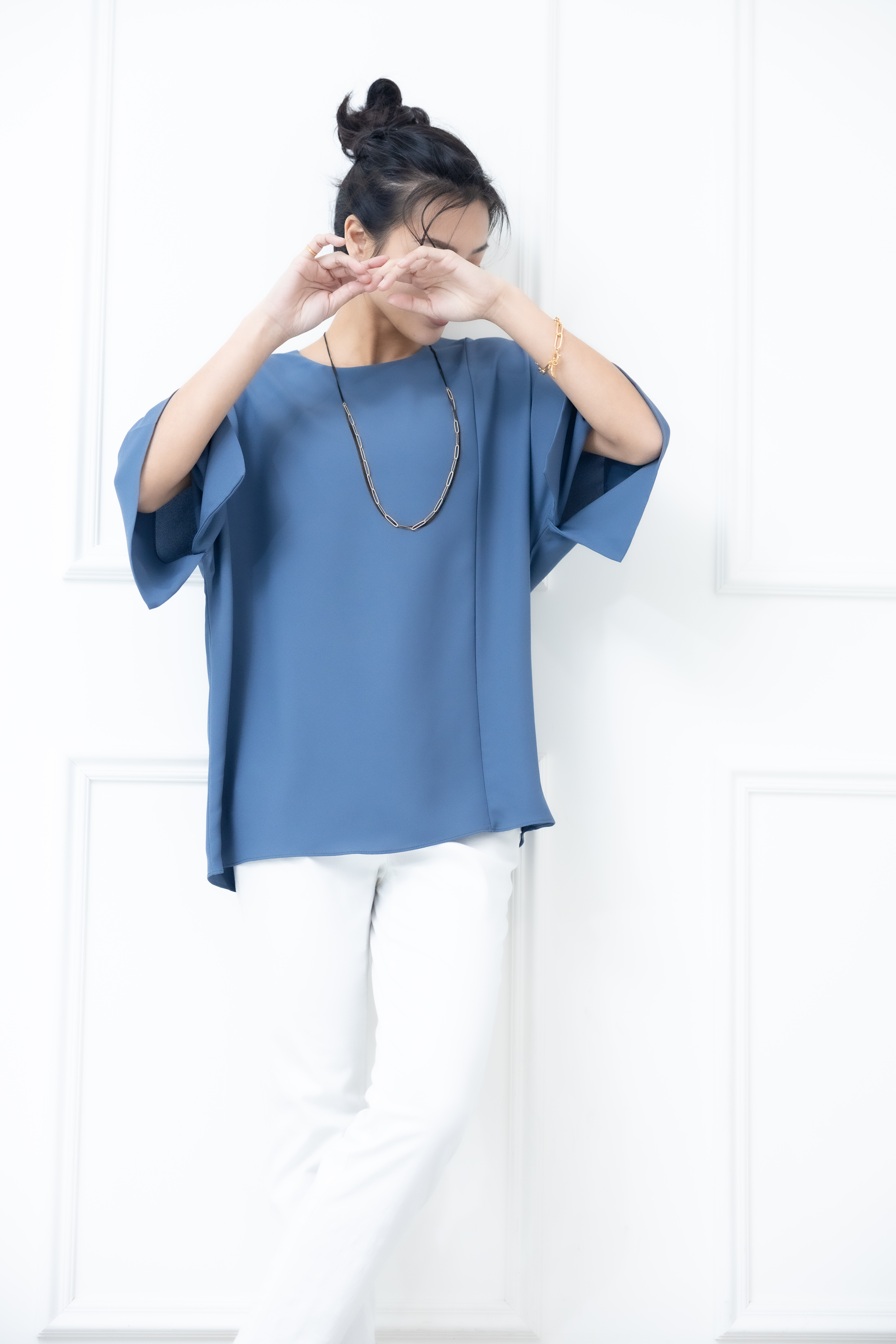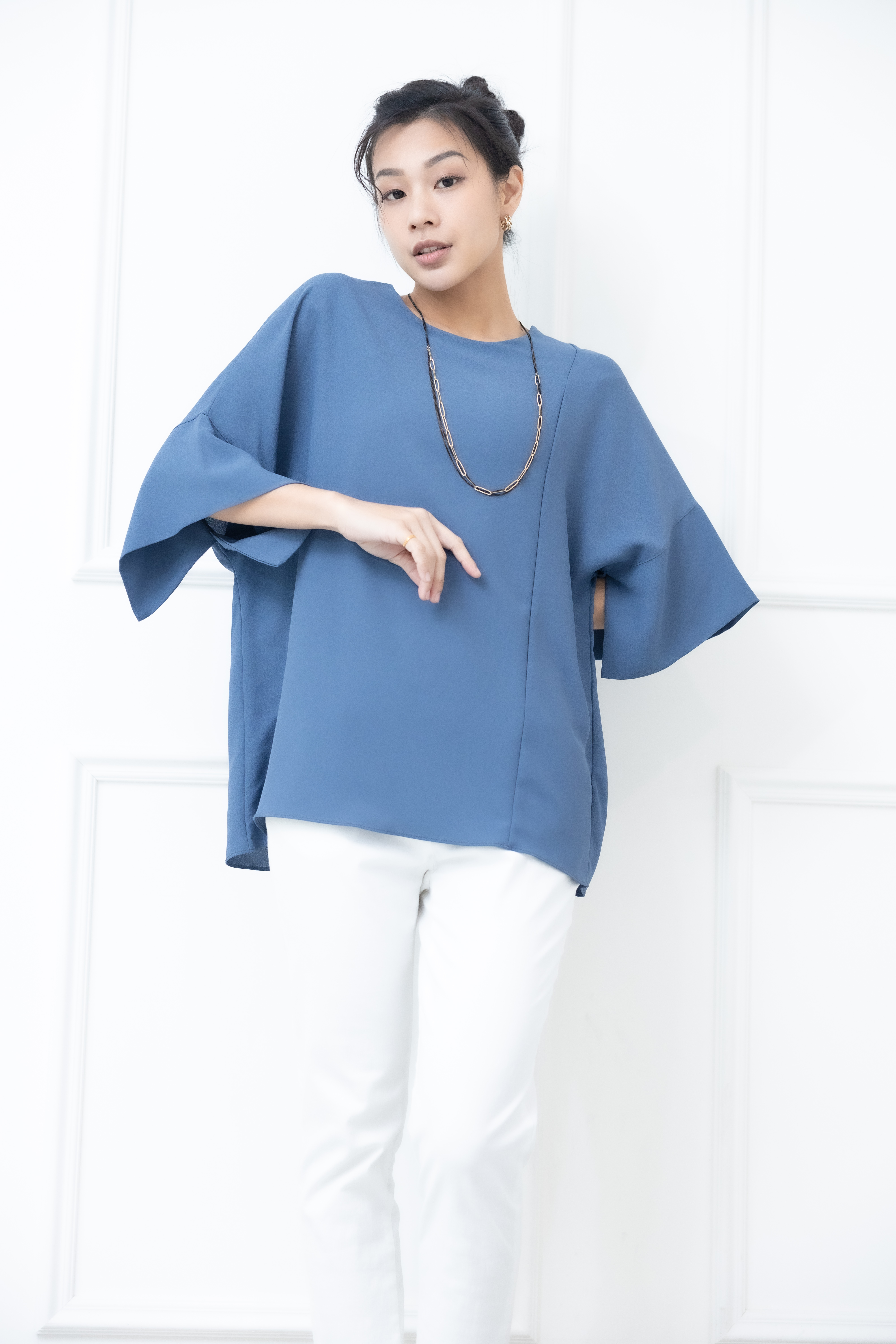 반팔 袖子開衩素色雪紡上衣 / 藍色