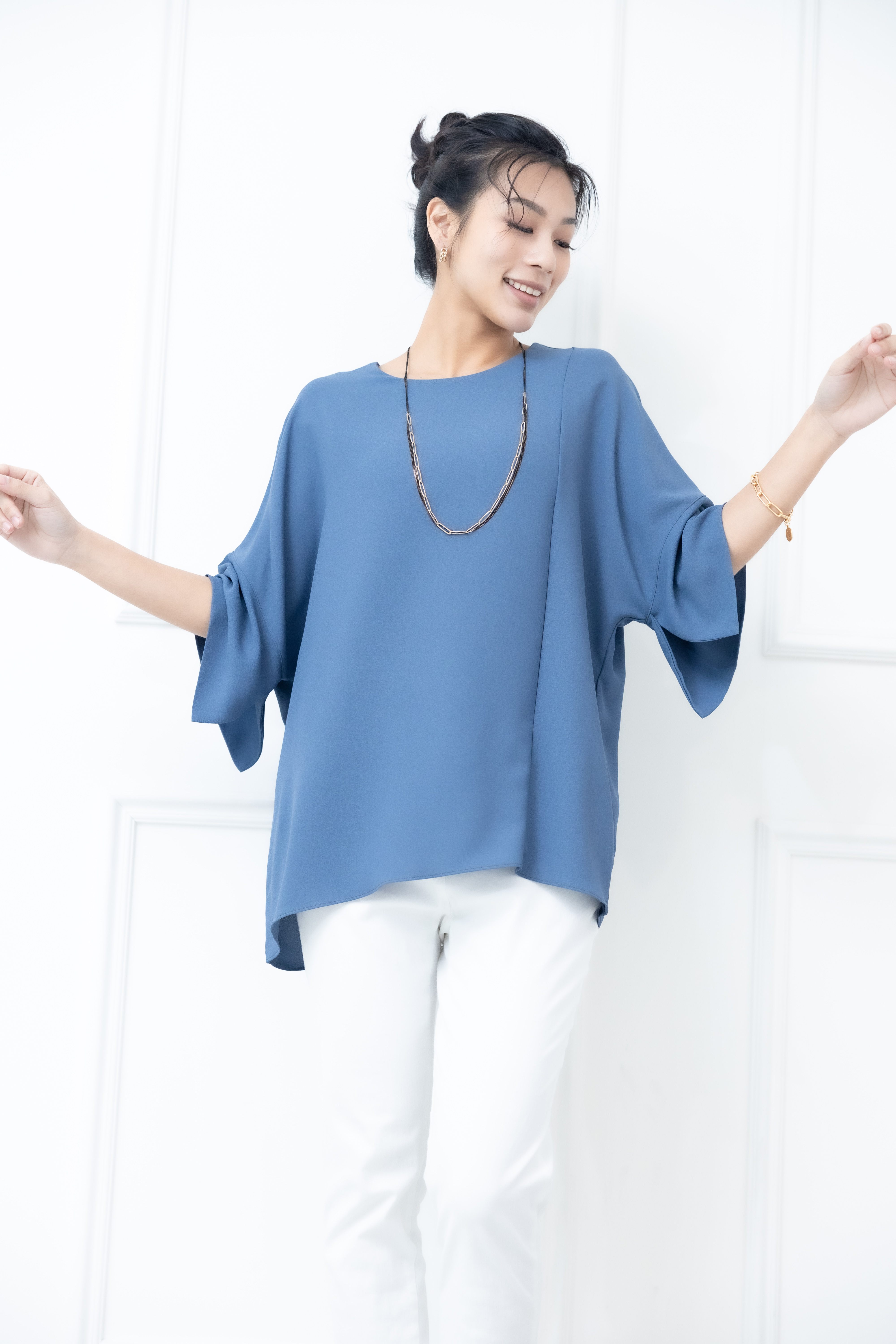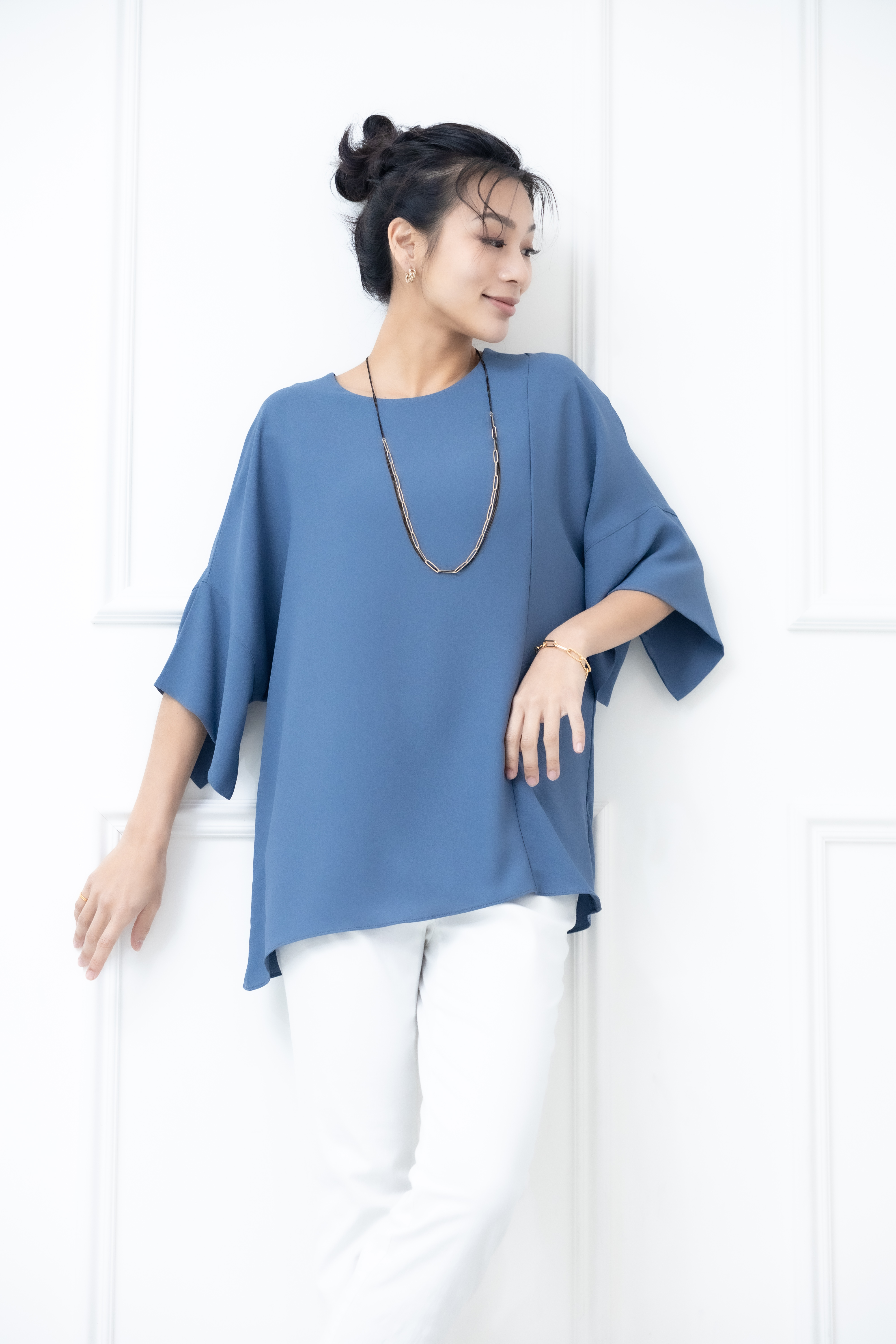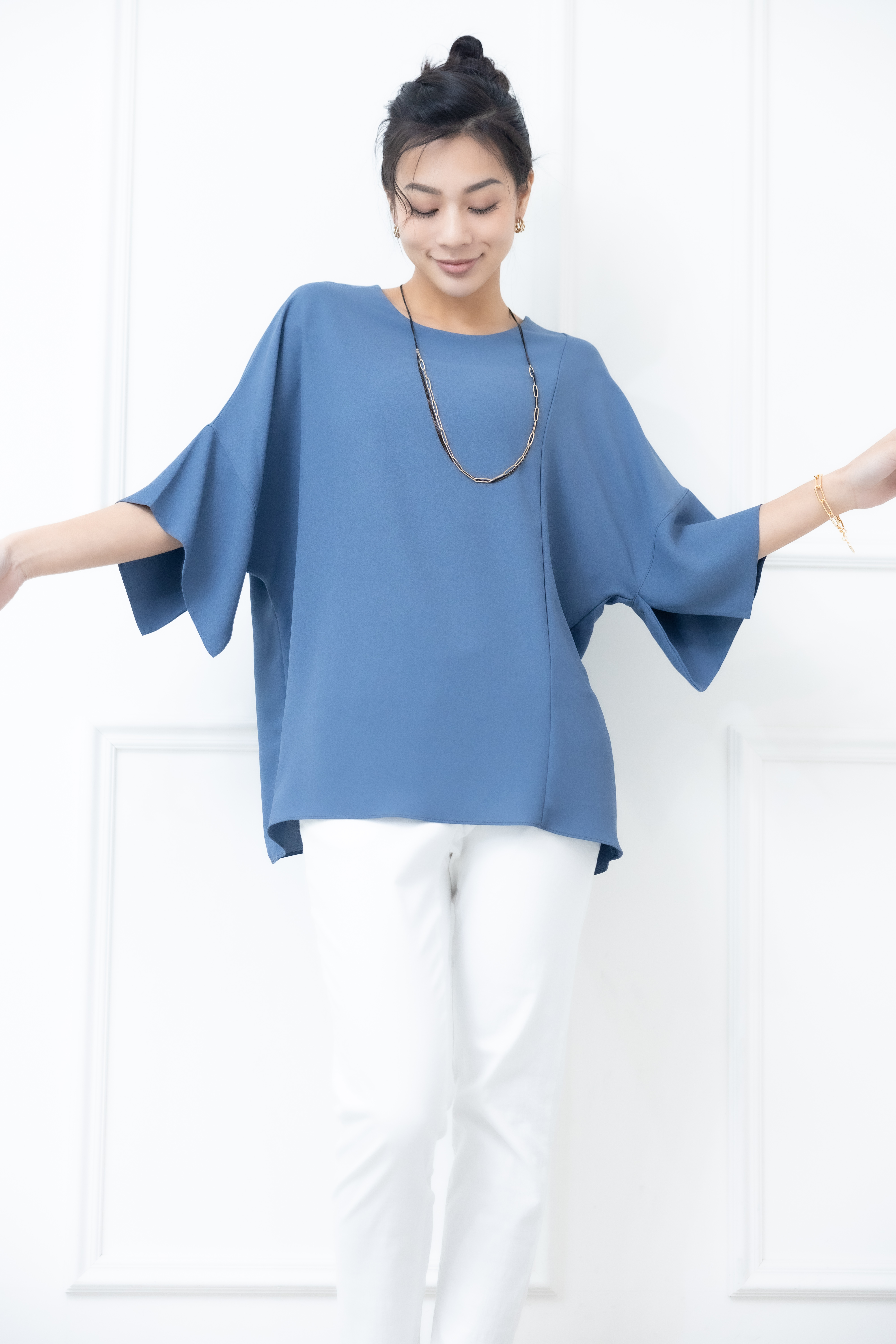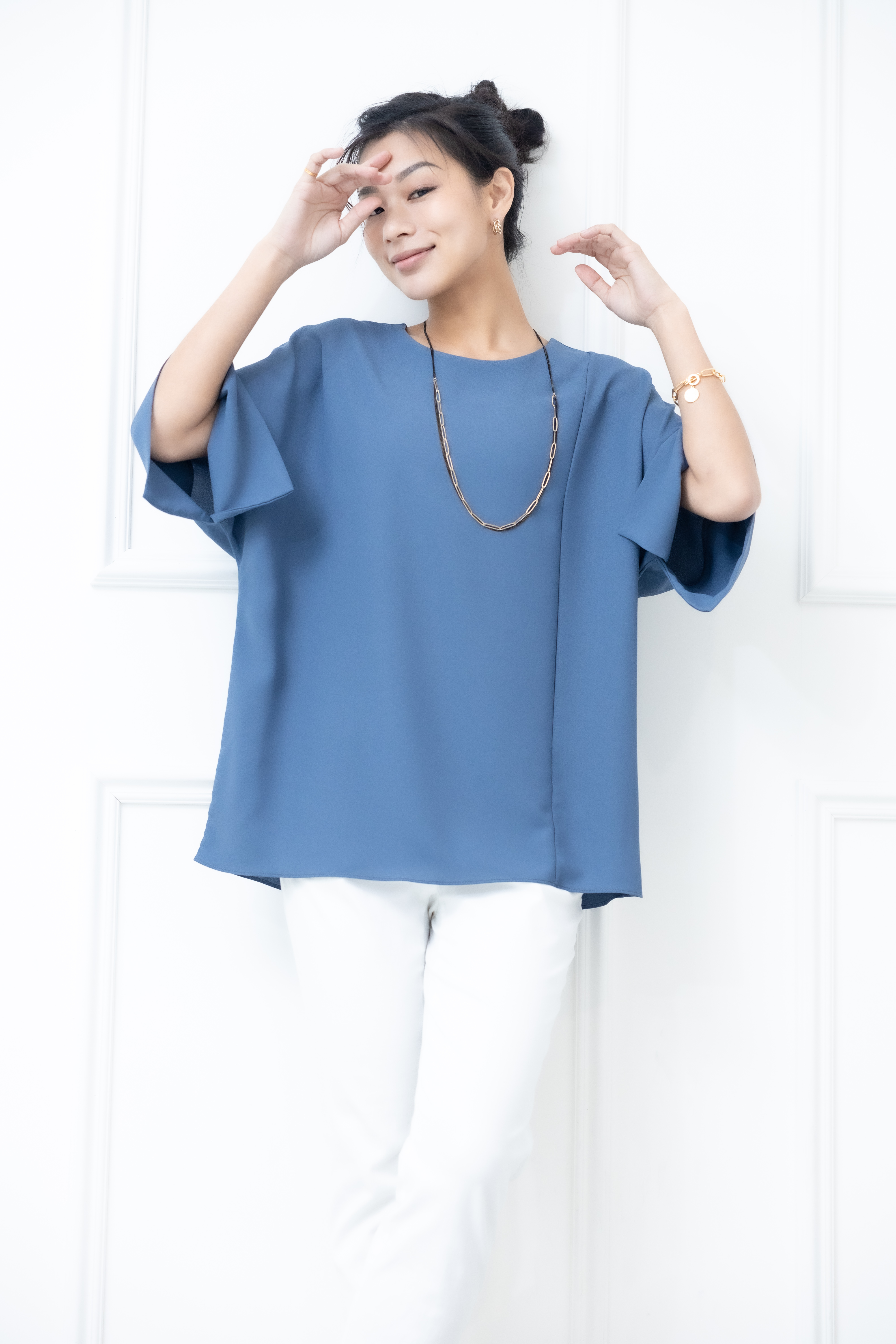반팔 袖子開衩素色雪紡上衣 / 藍色