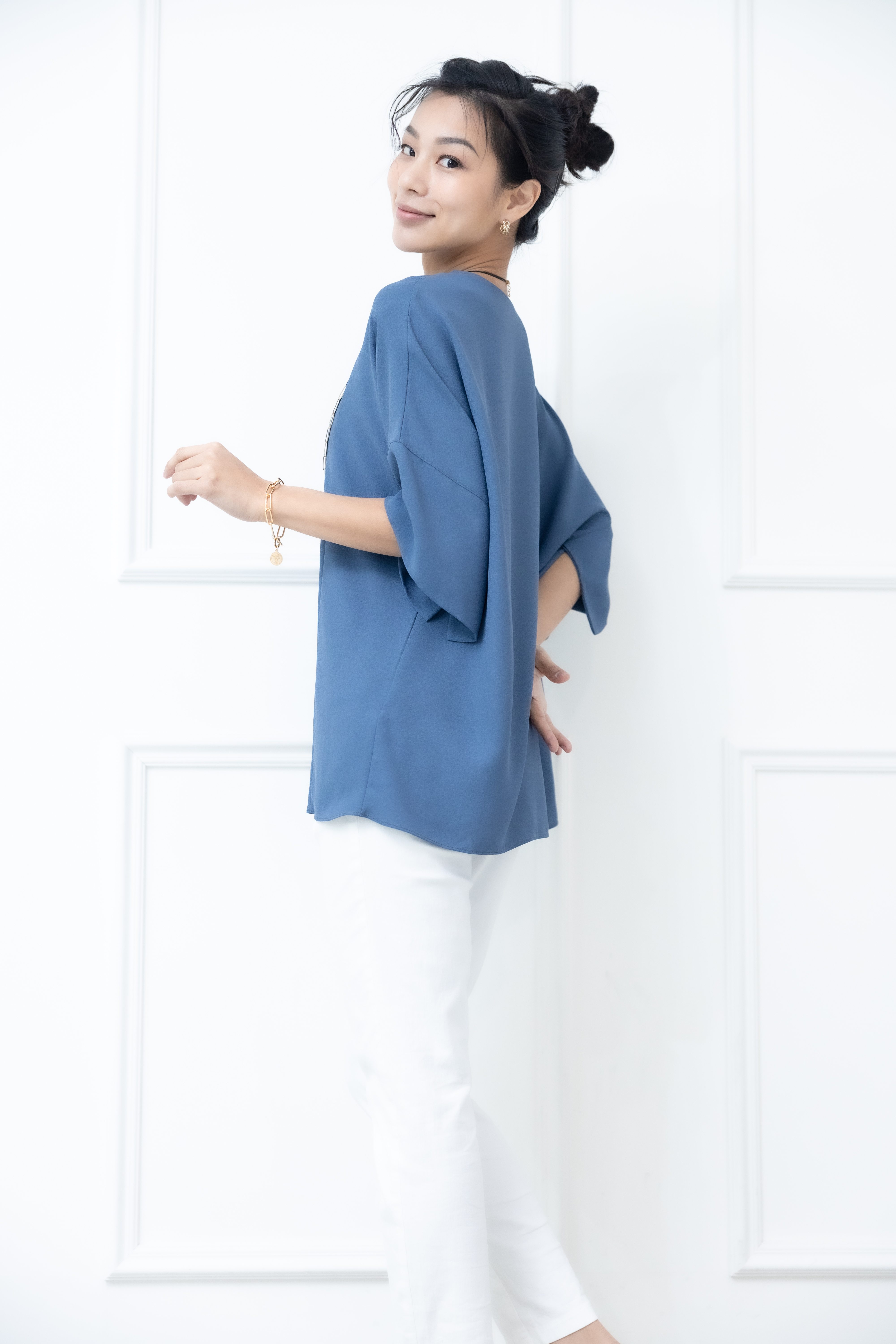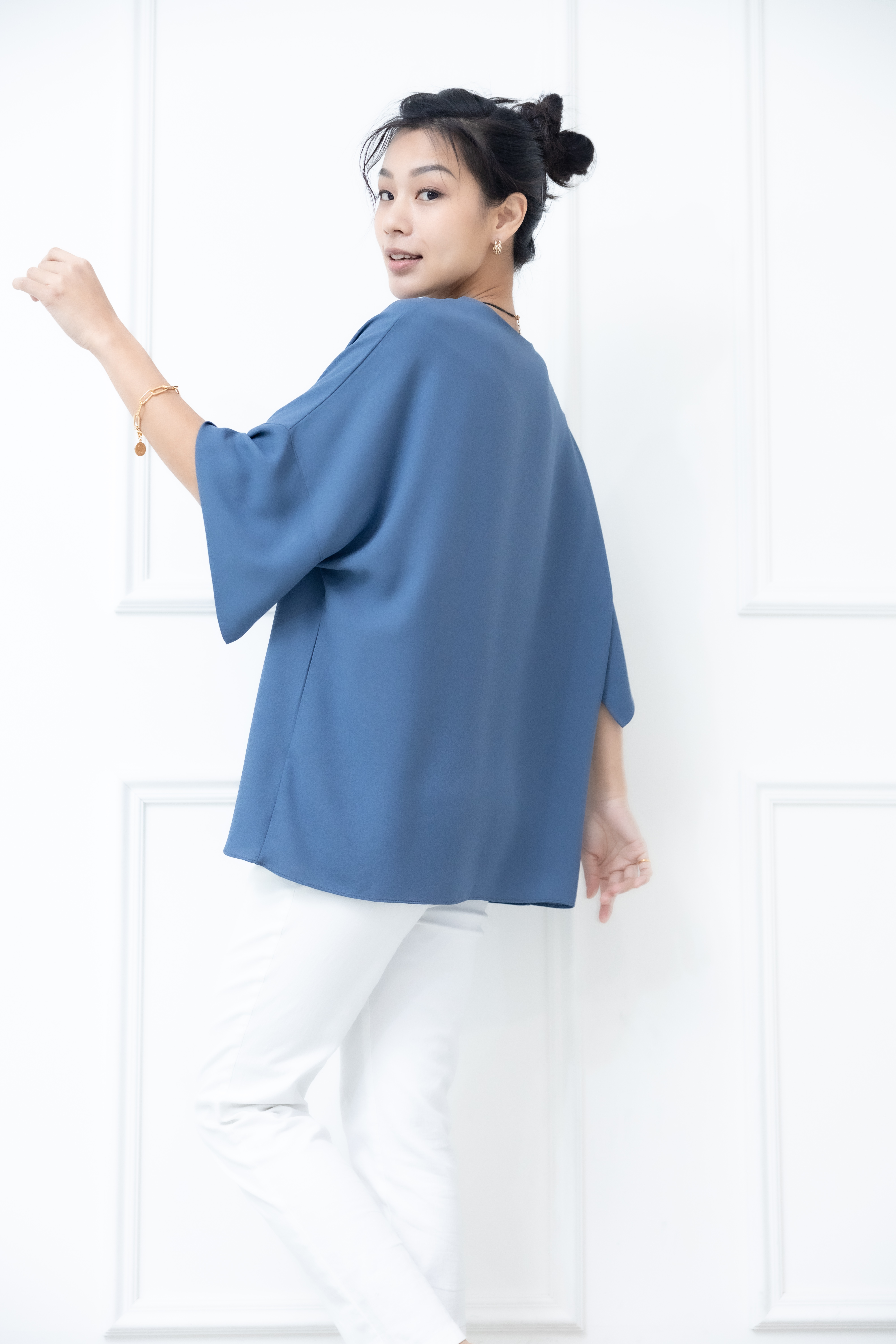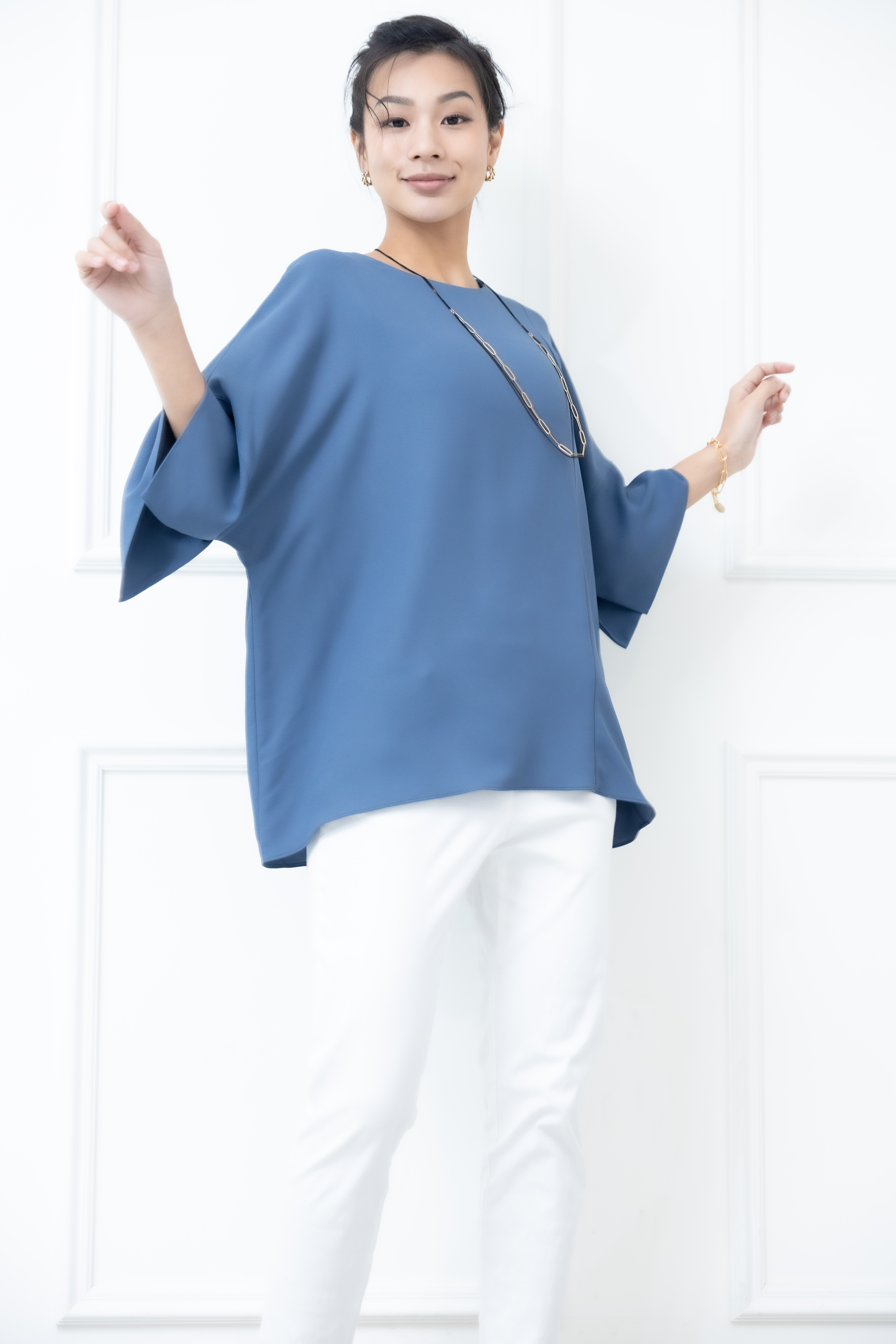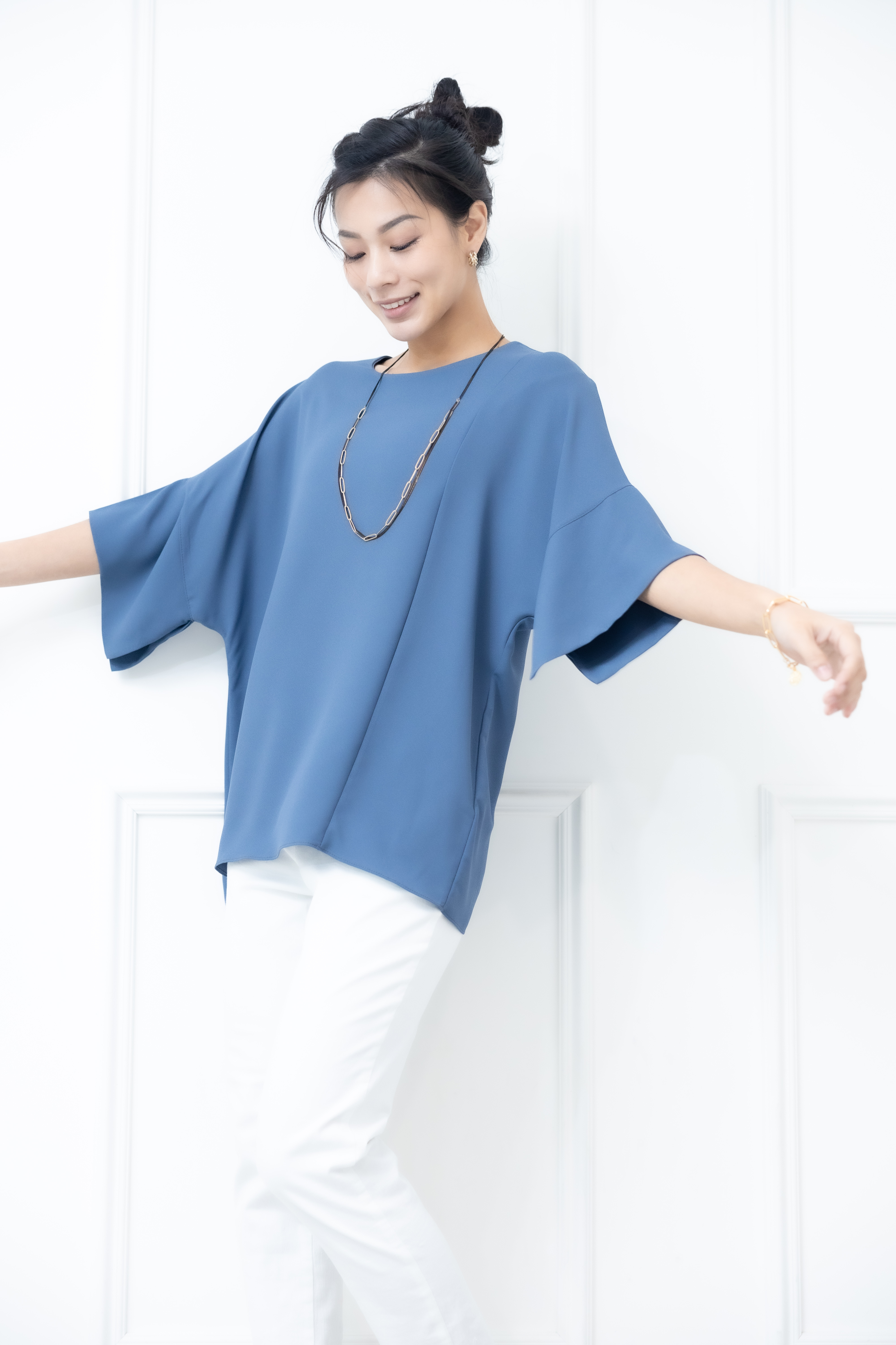 반팔 袖子開衩素色雪紡上衣 / 藍色