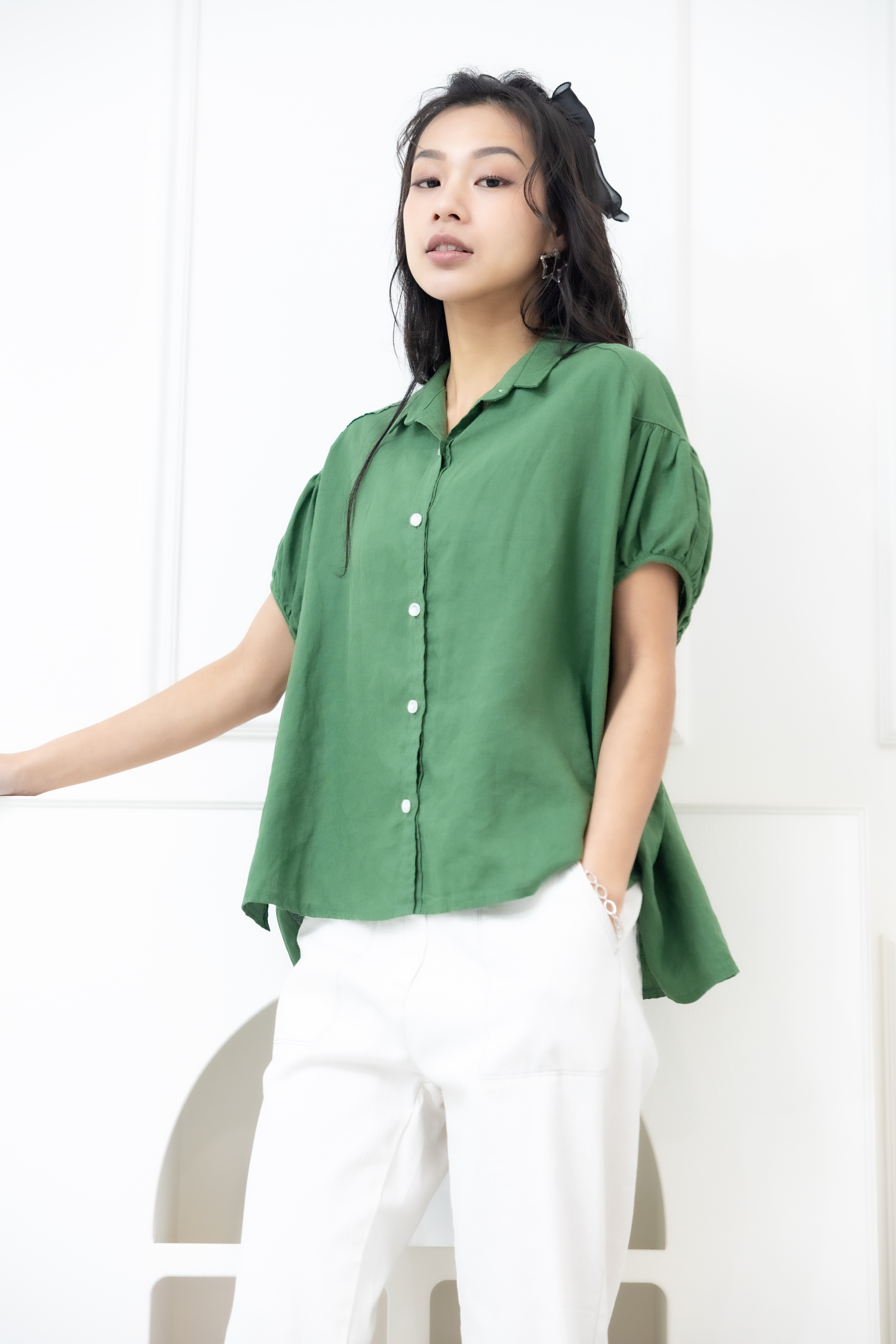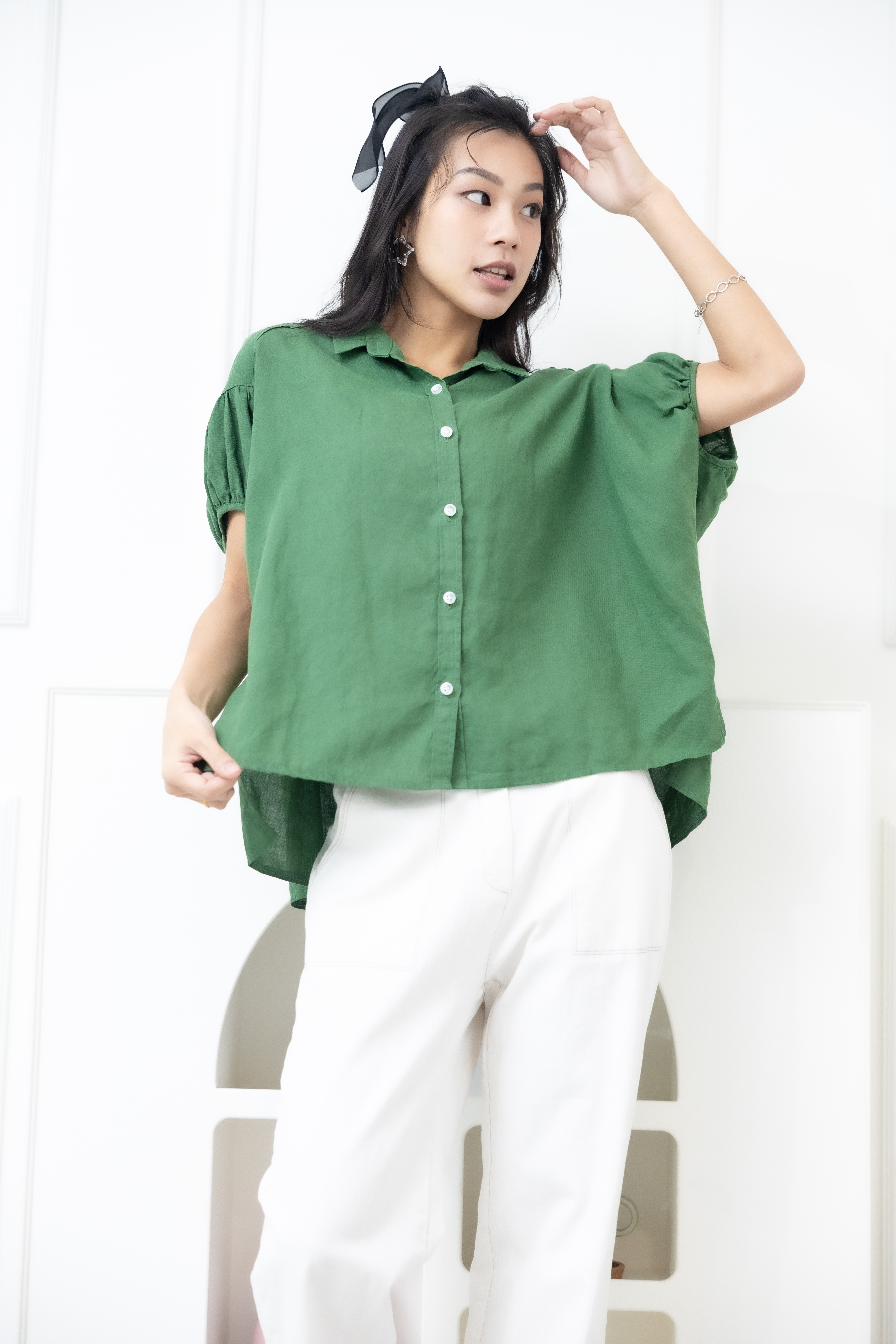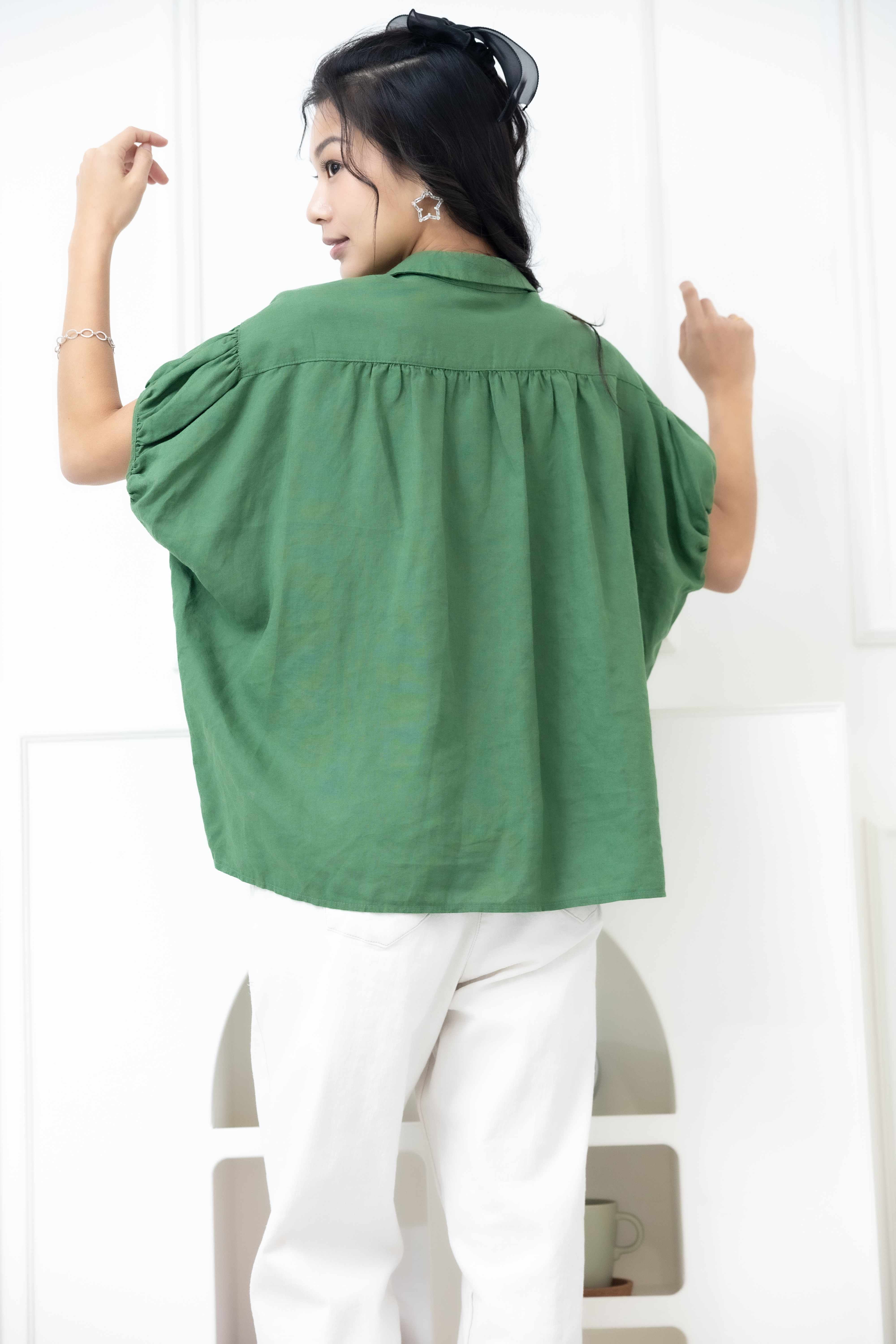 반팔 襯衫領袖口皺褶前短後長上衣 / 綠色
