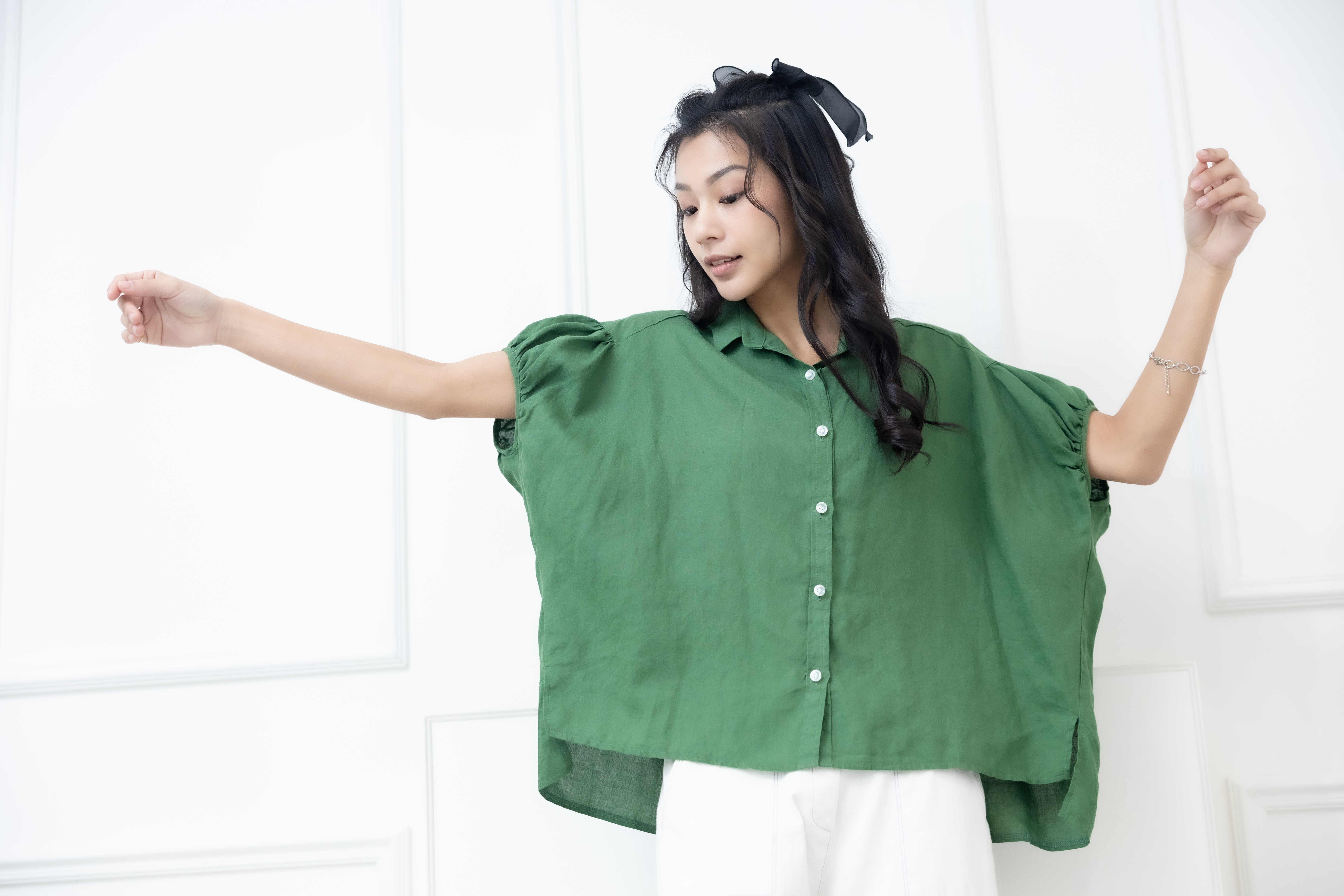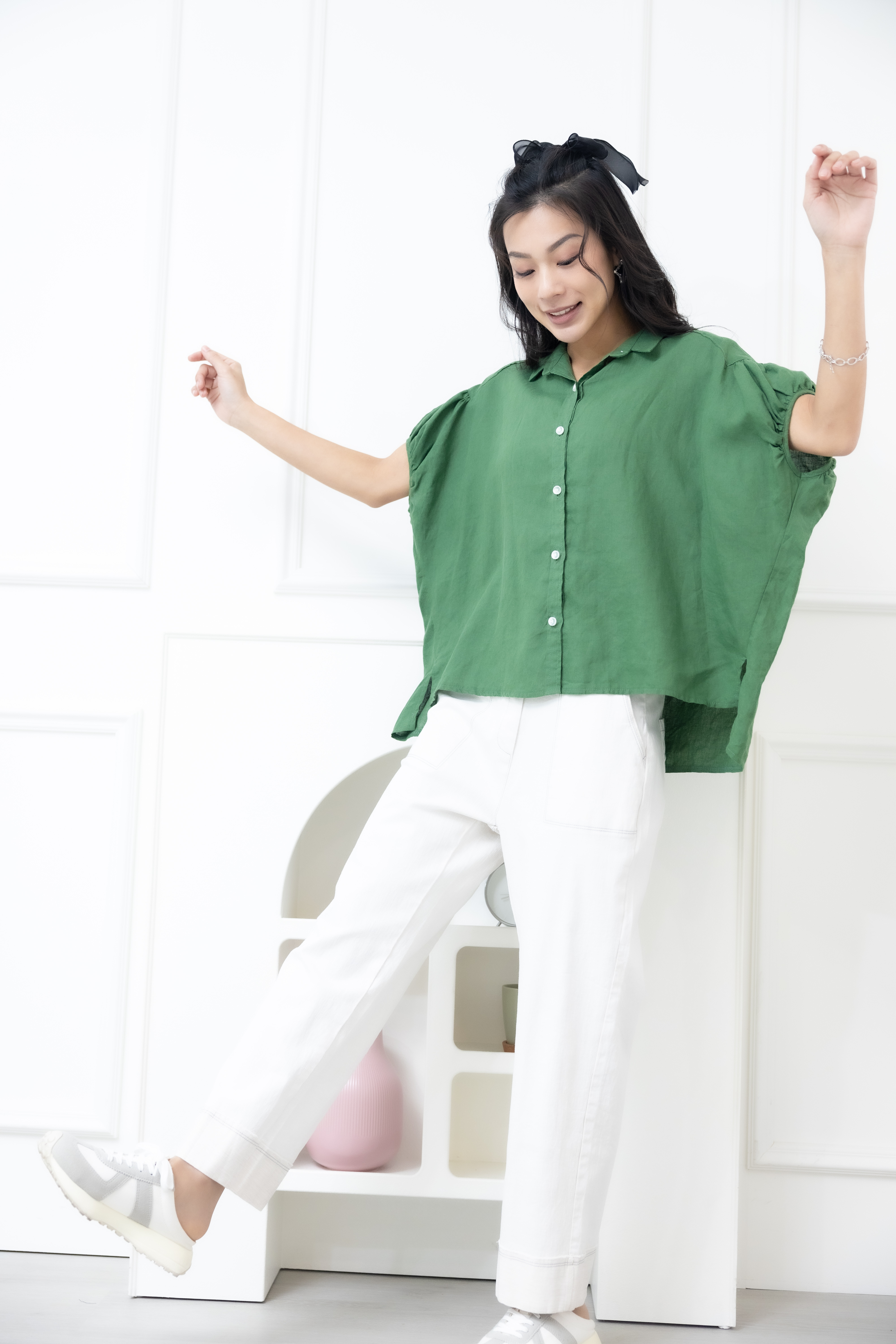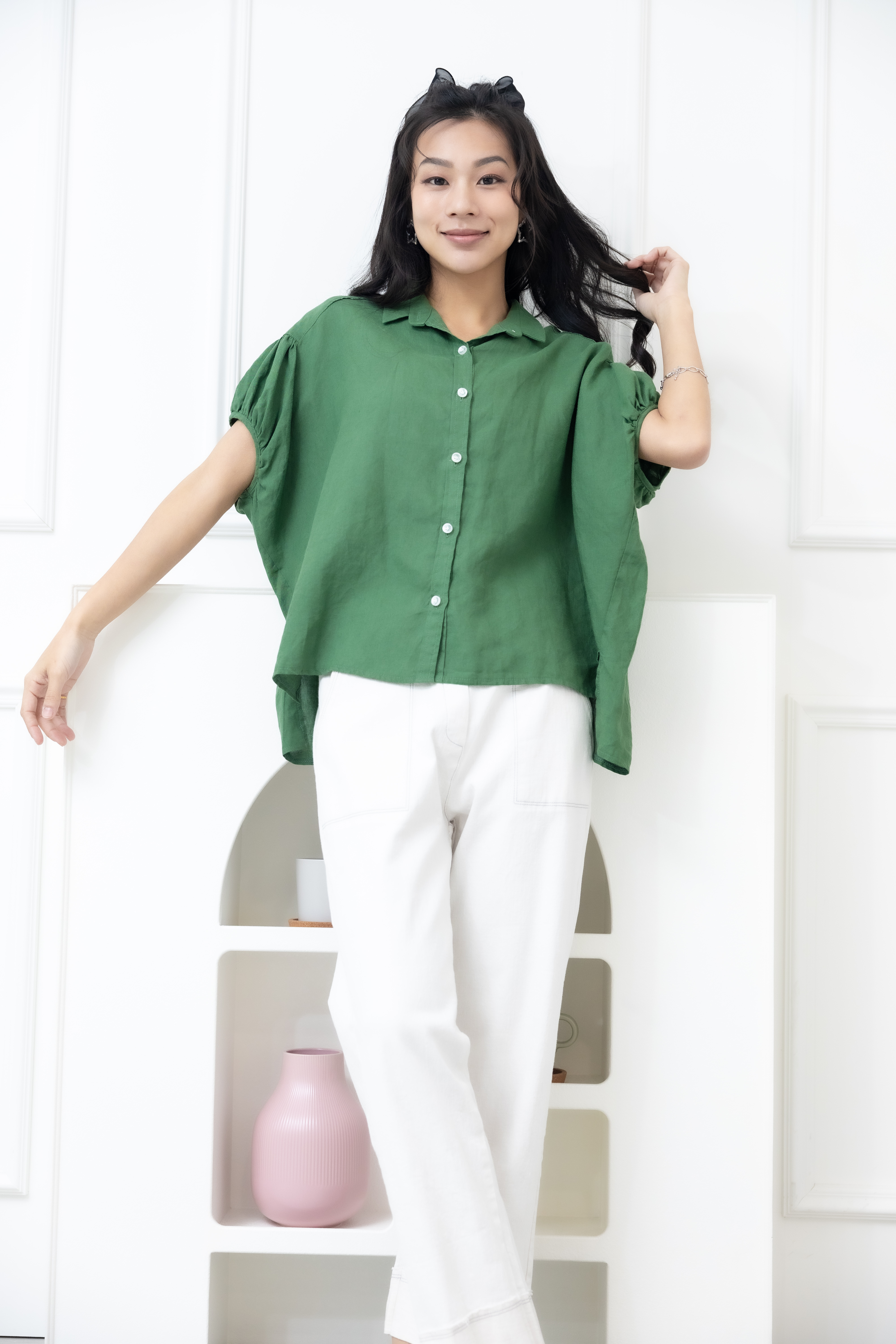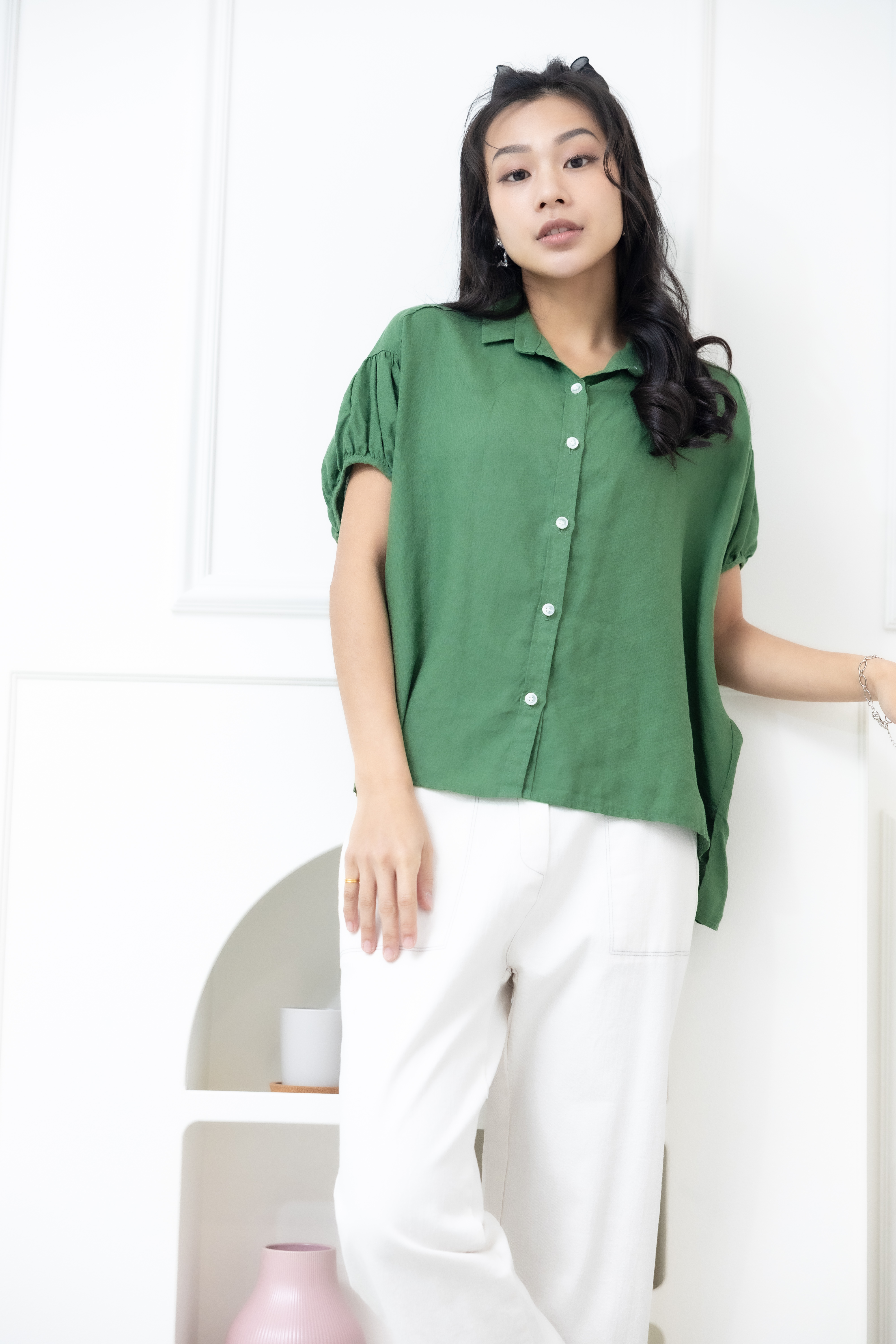 반팔 襯衫領袖口皺褶前短後長上衣 / 綠色