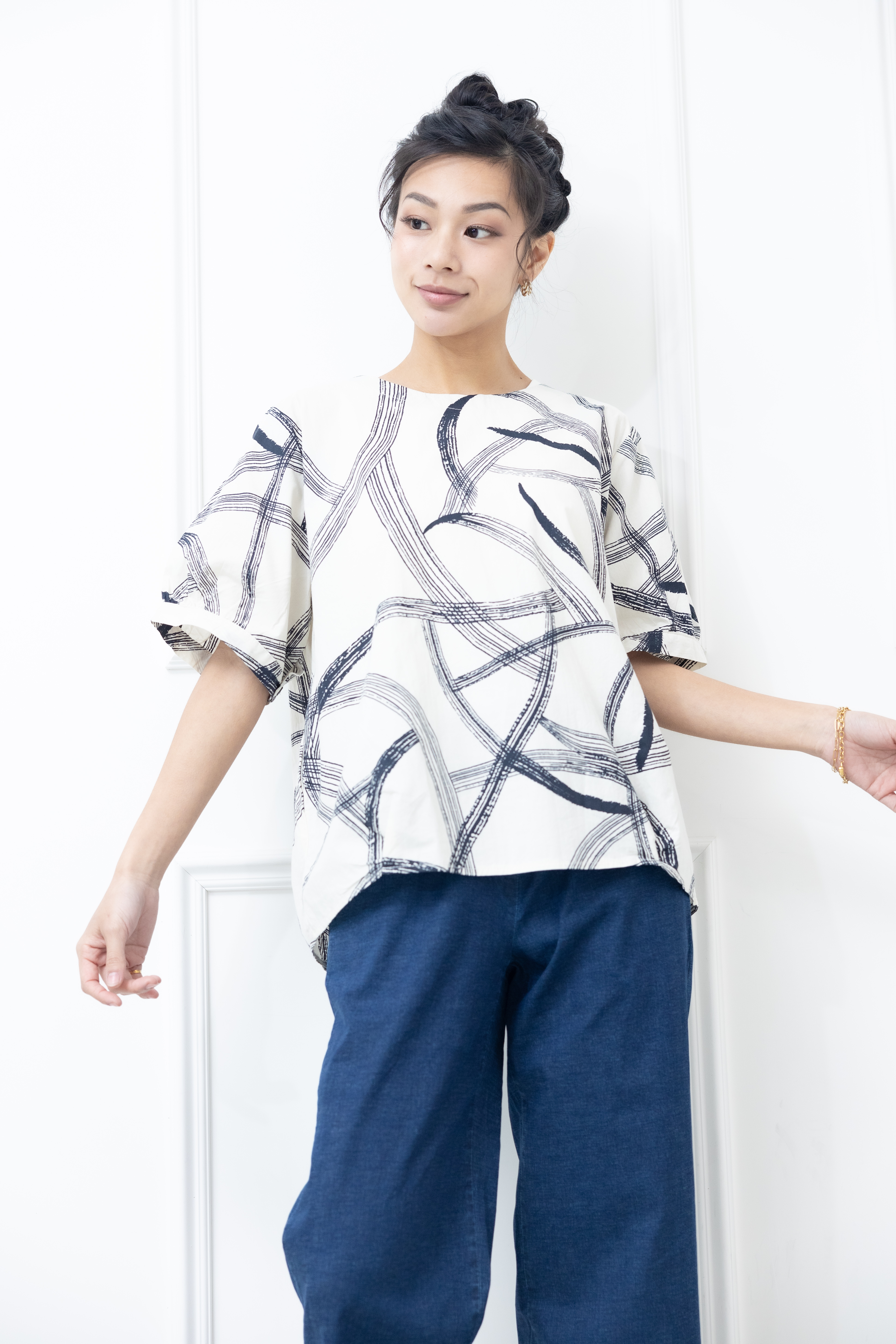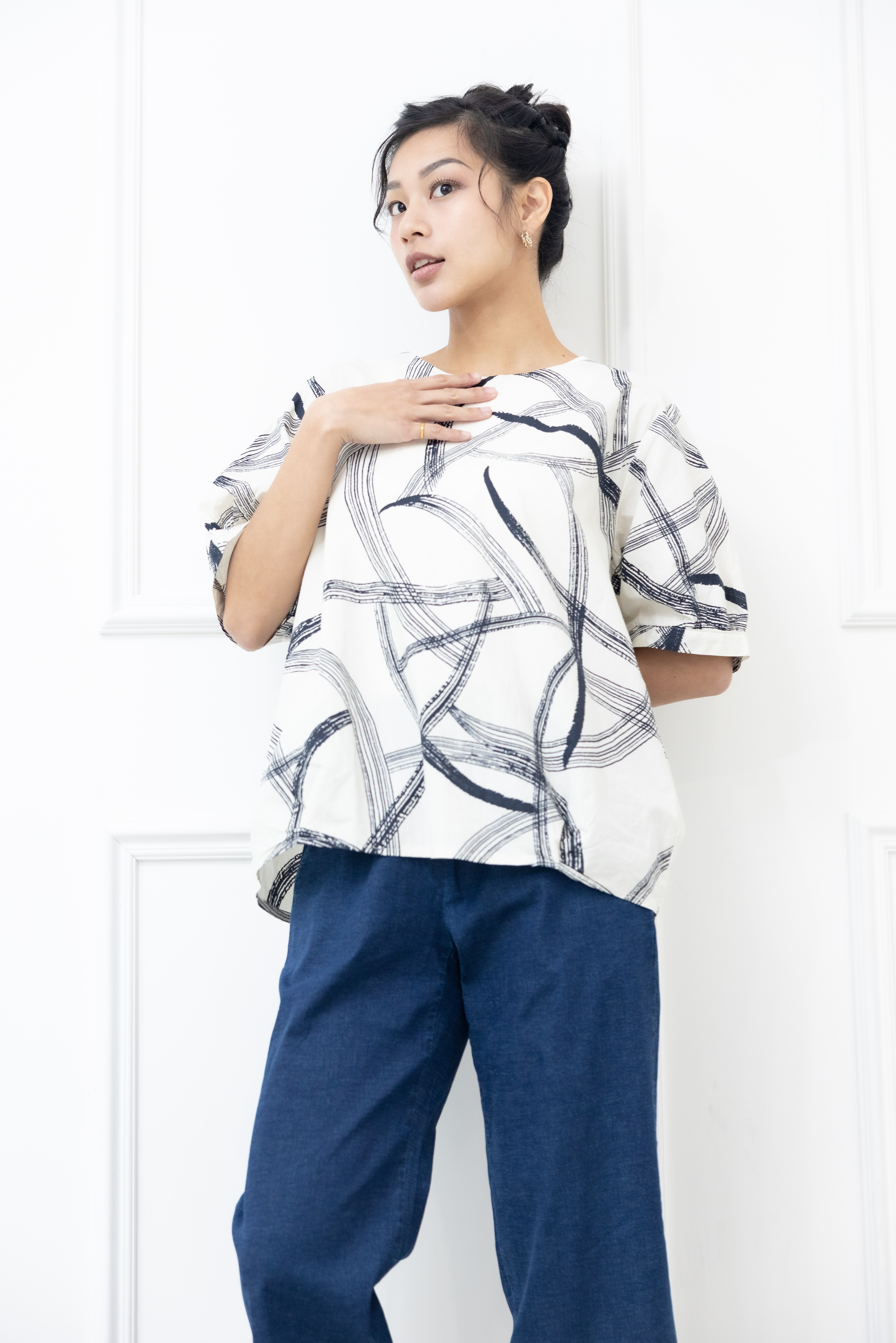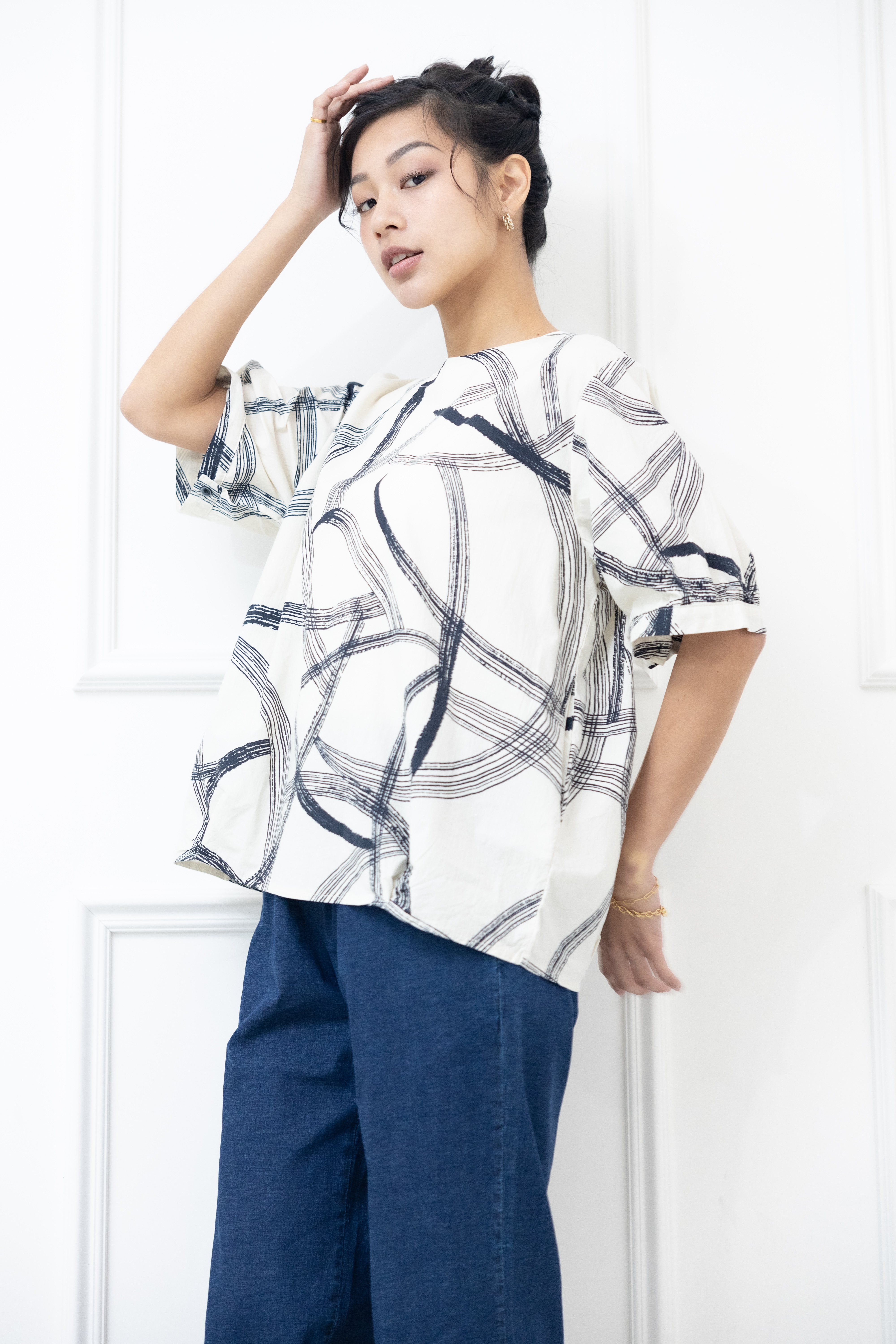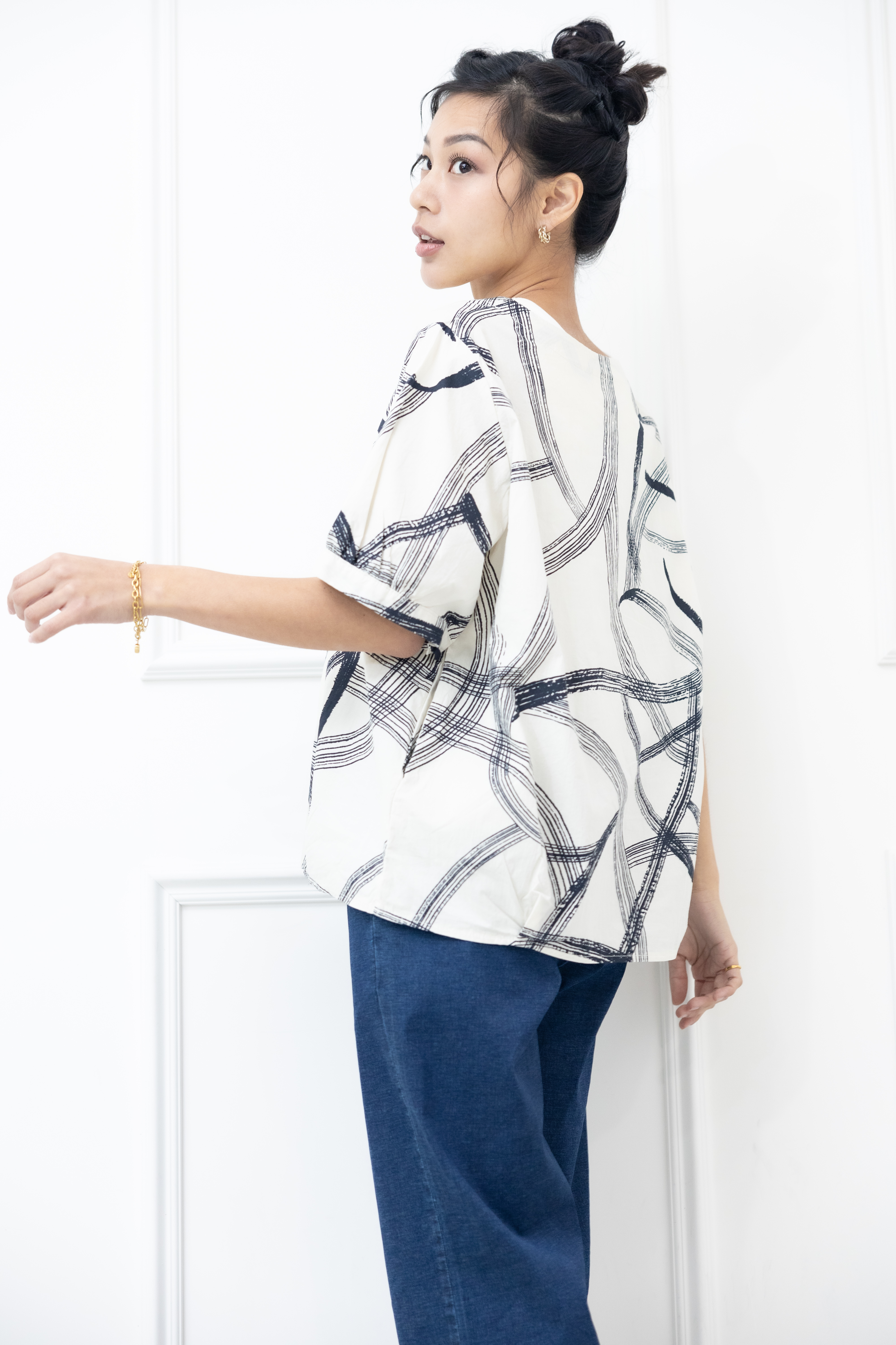 반팔 黑色線條寬版上衣 / 白色