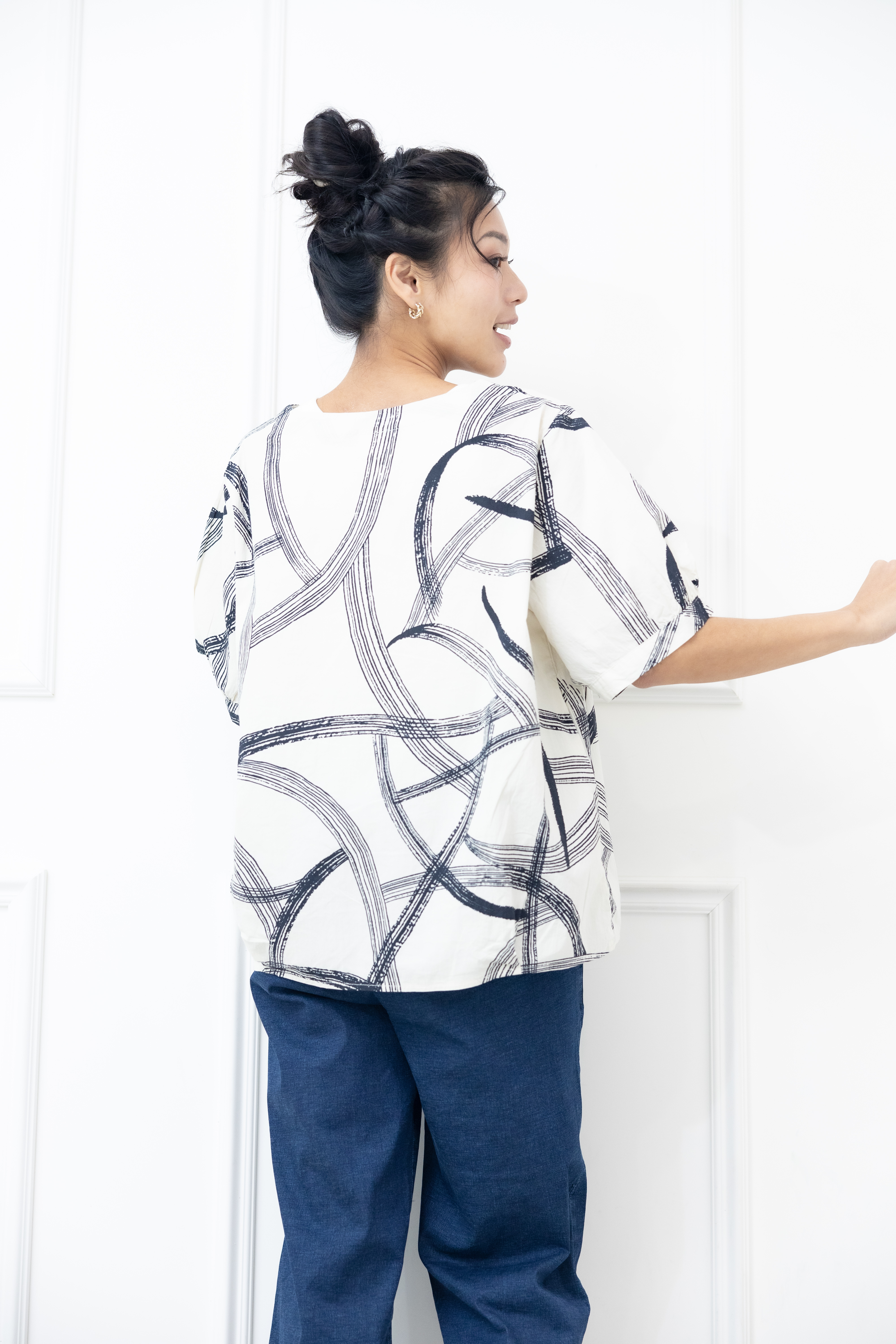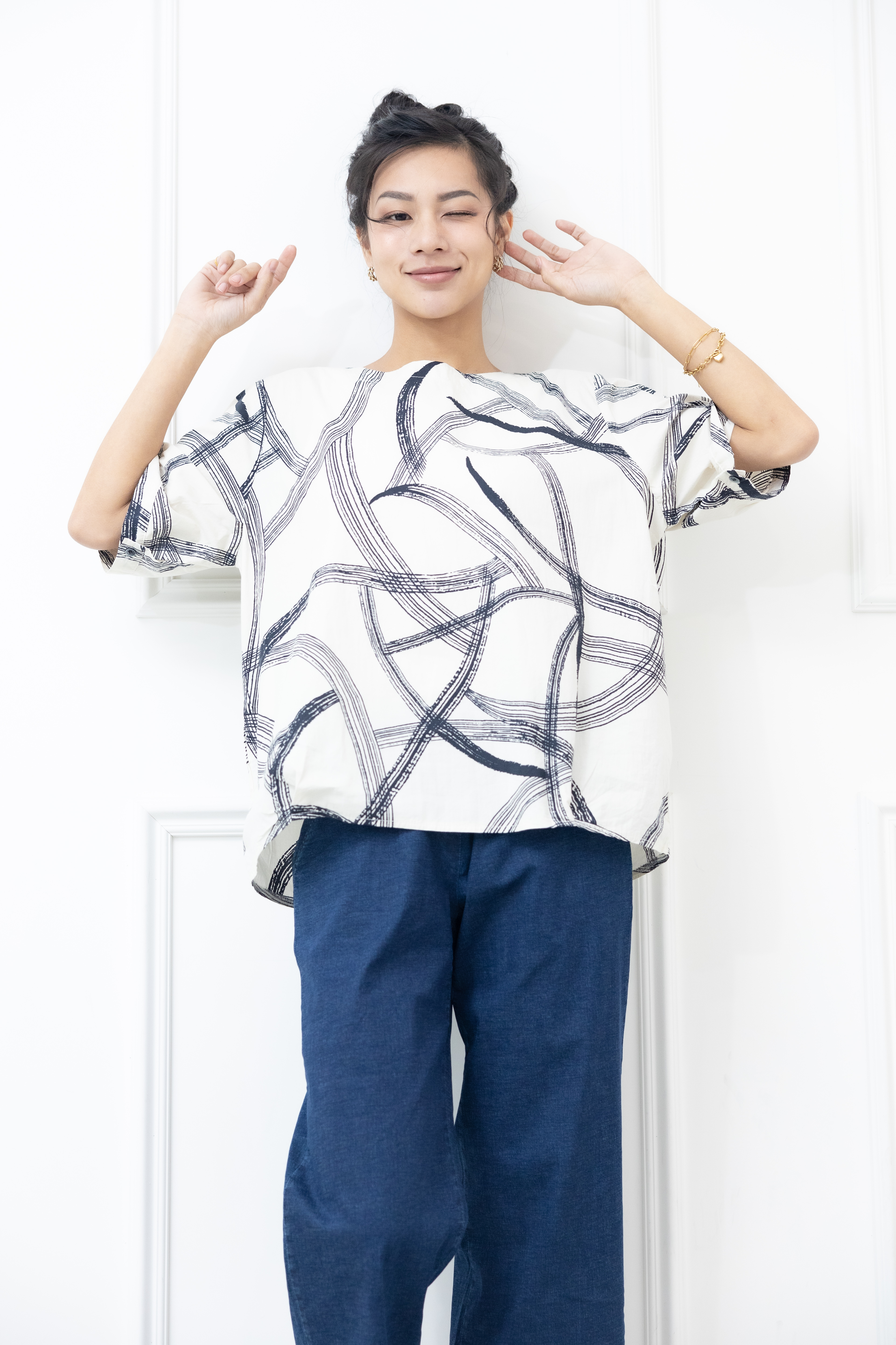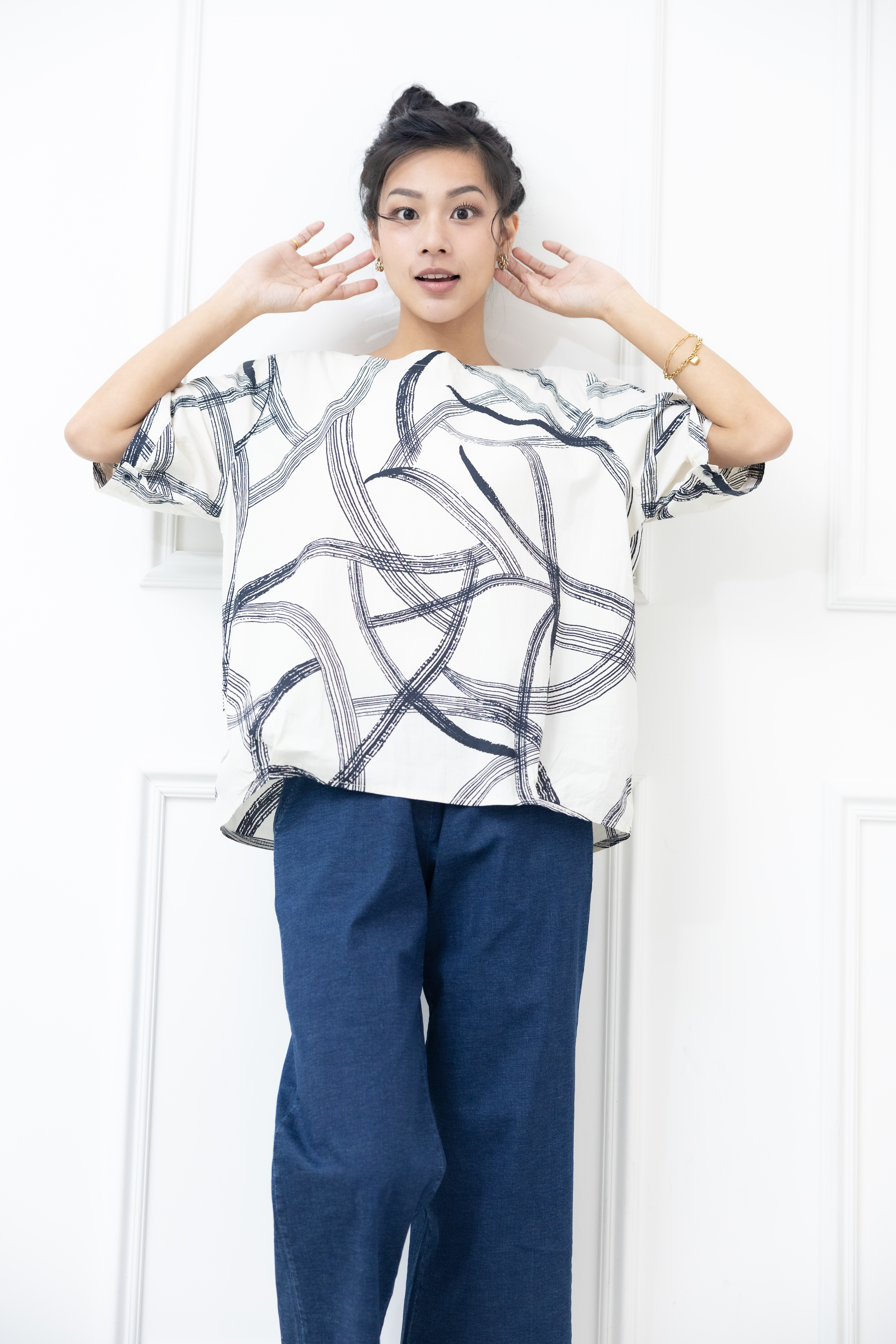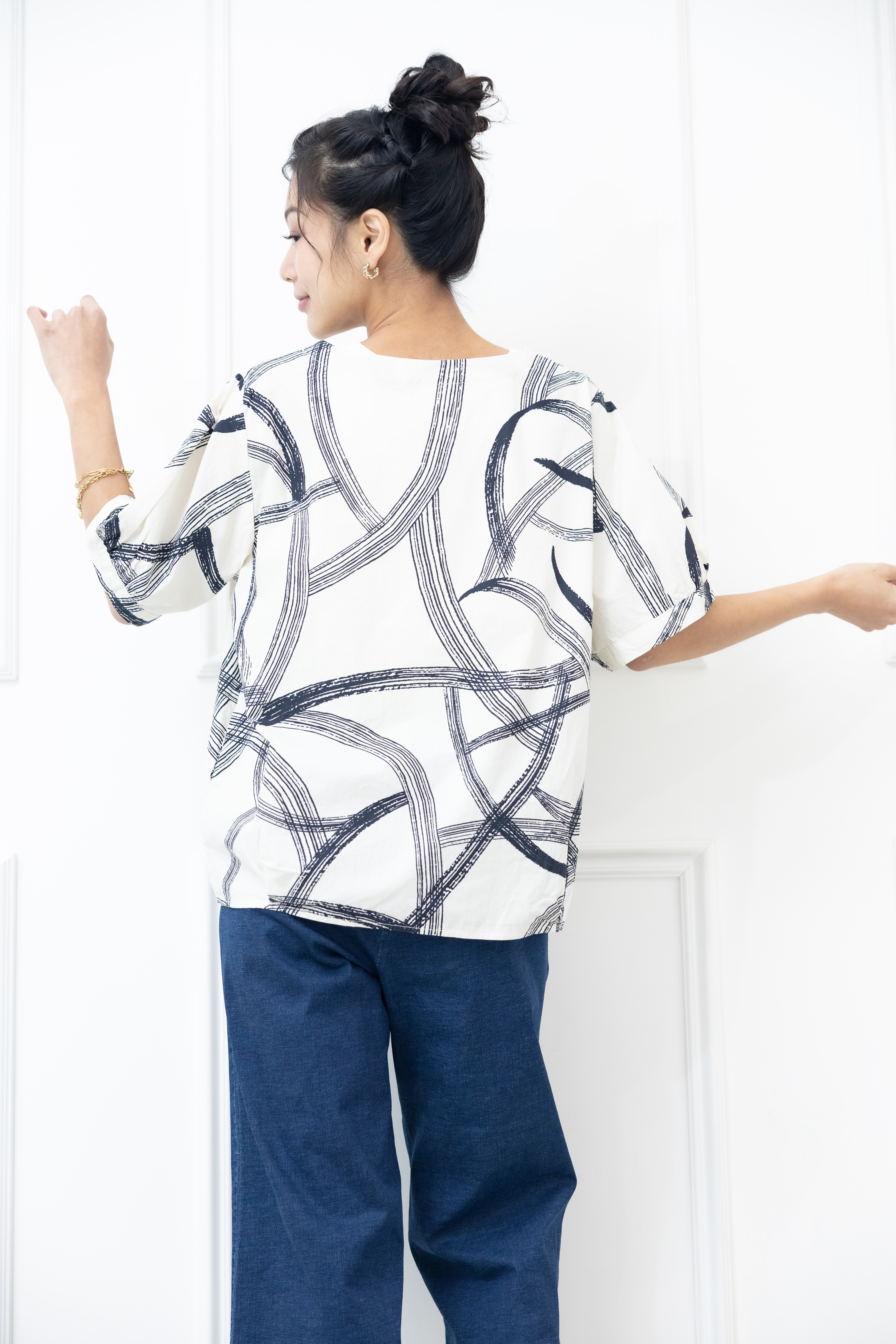 반팔 黑色線條寬版上衣 / 白色
