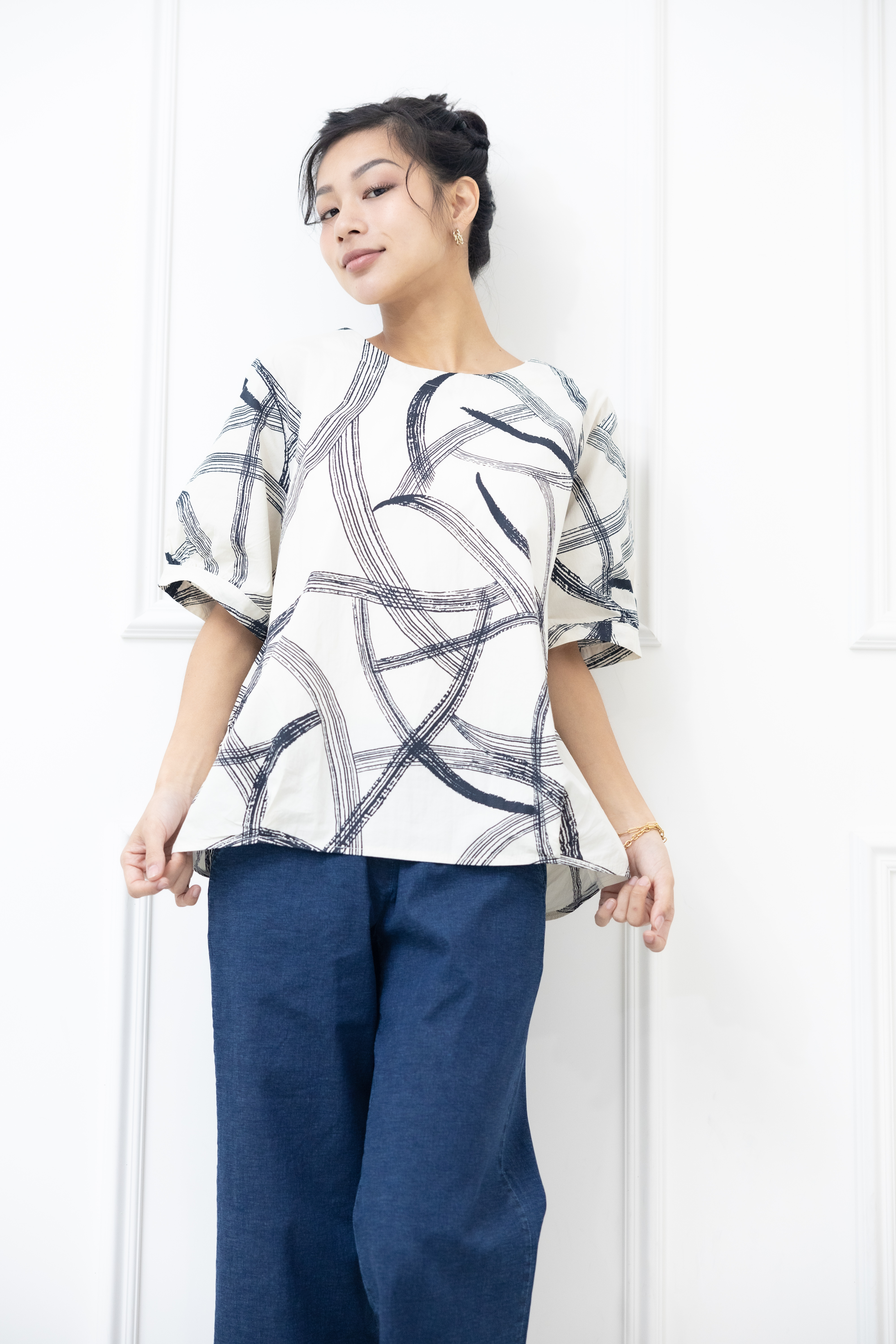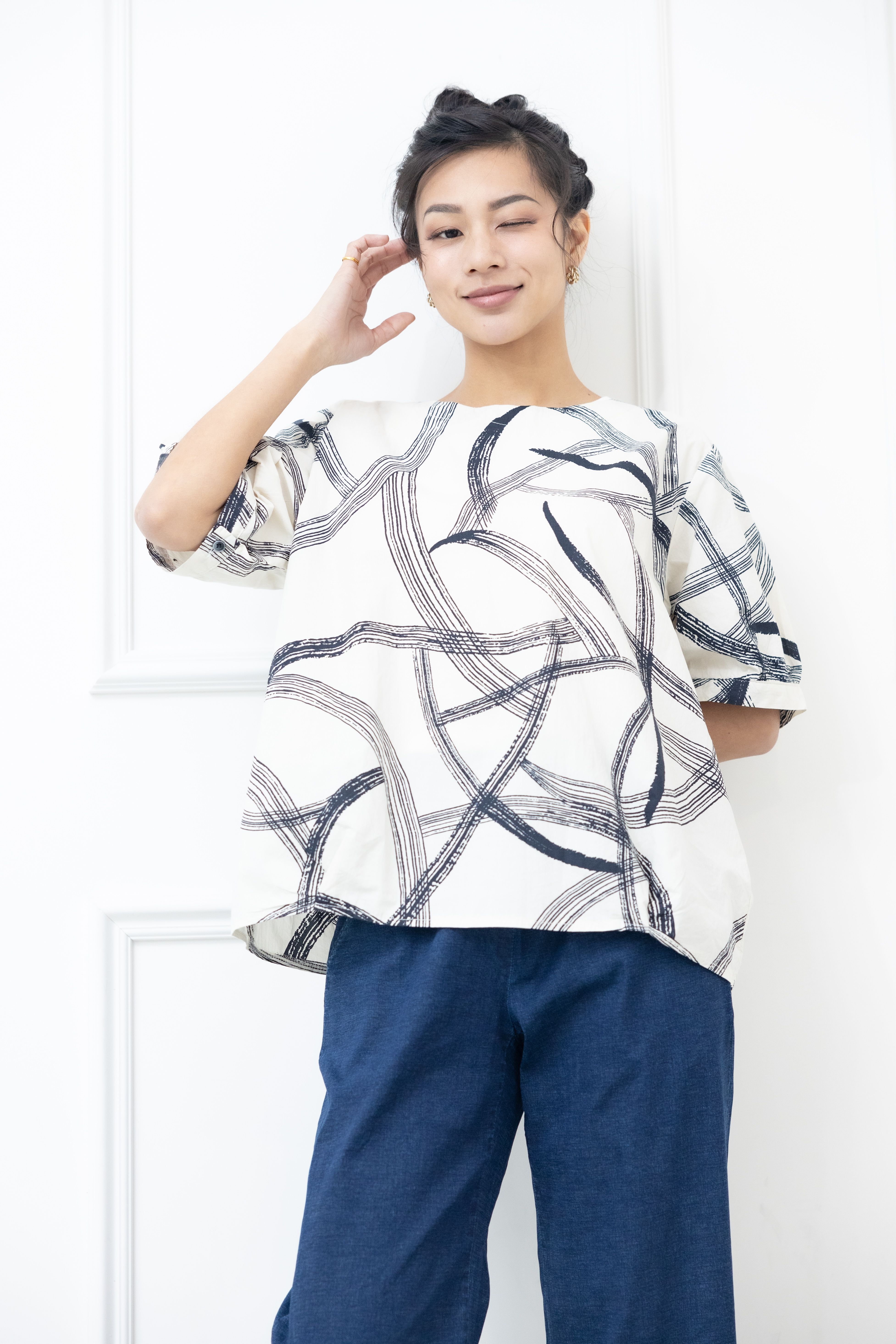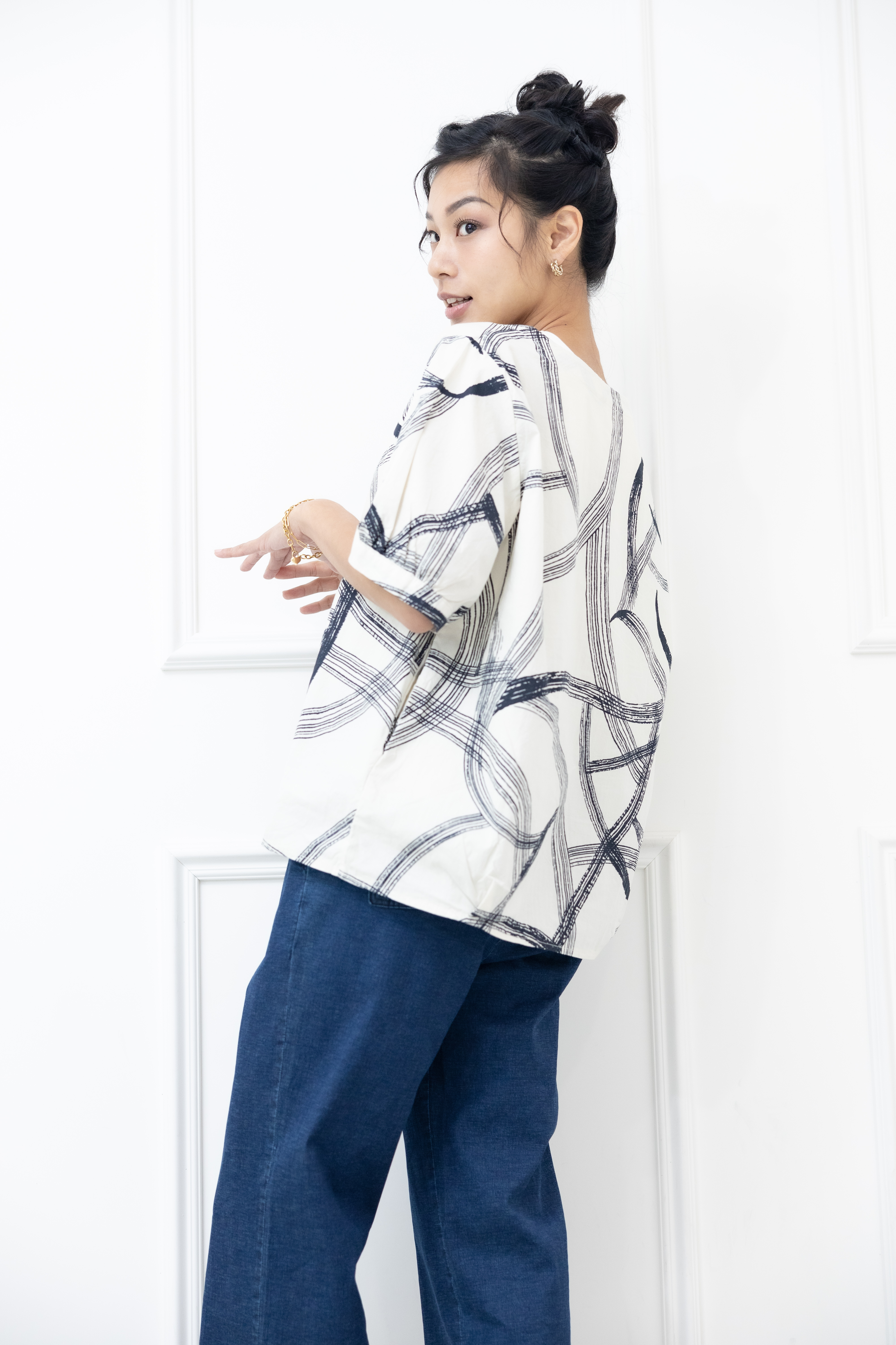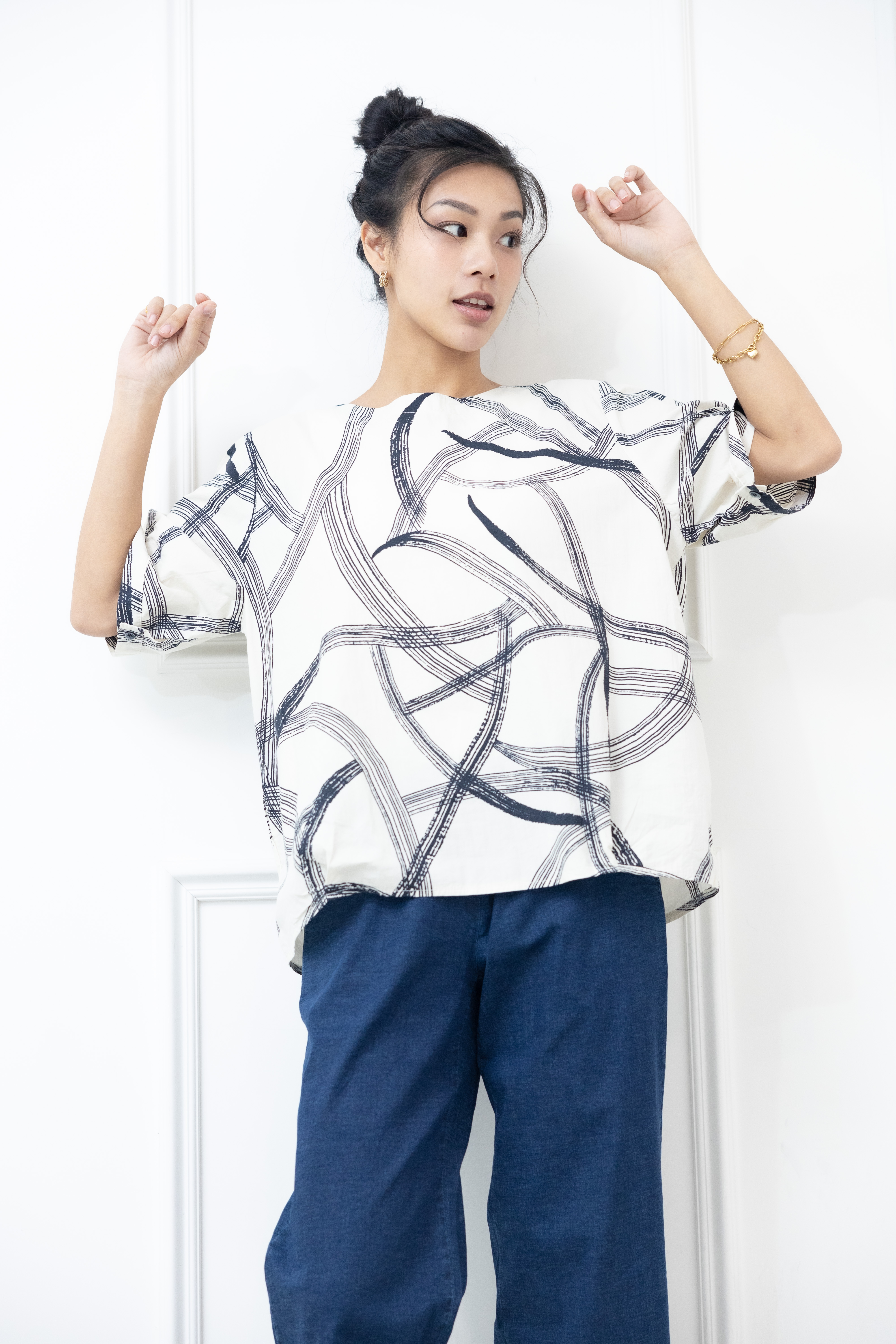반팔 黑色線條寬版上衣 / 白色