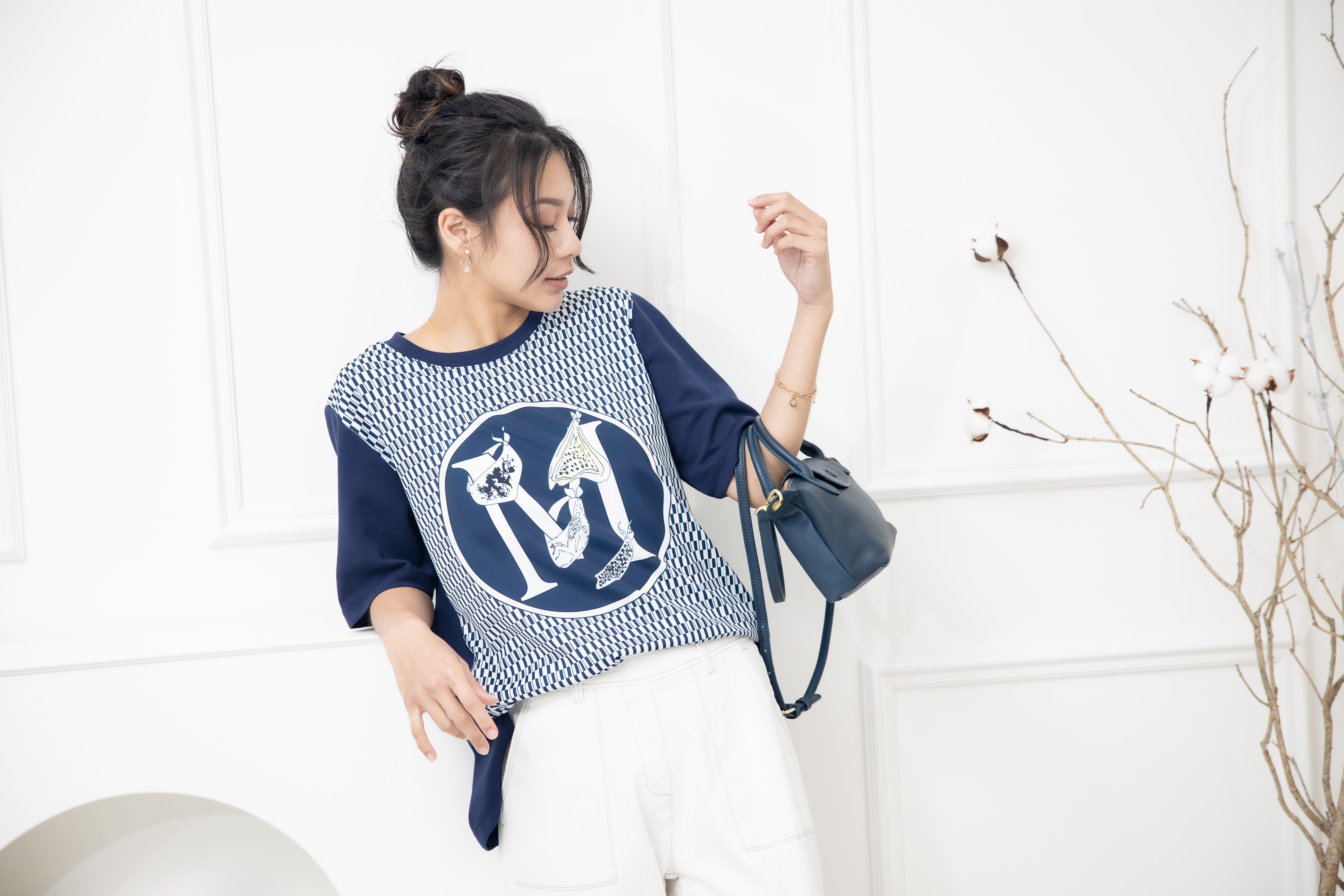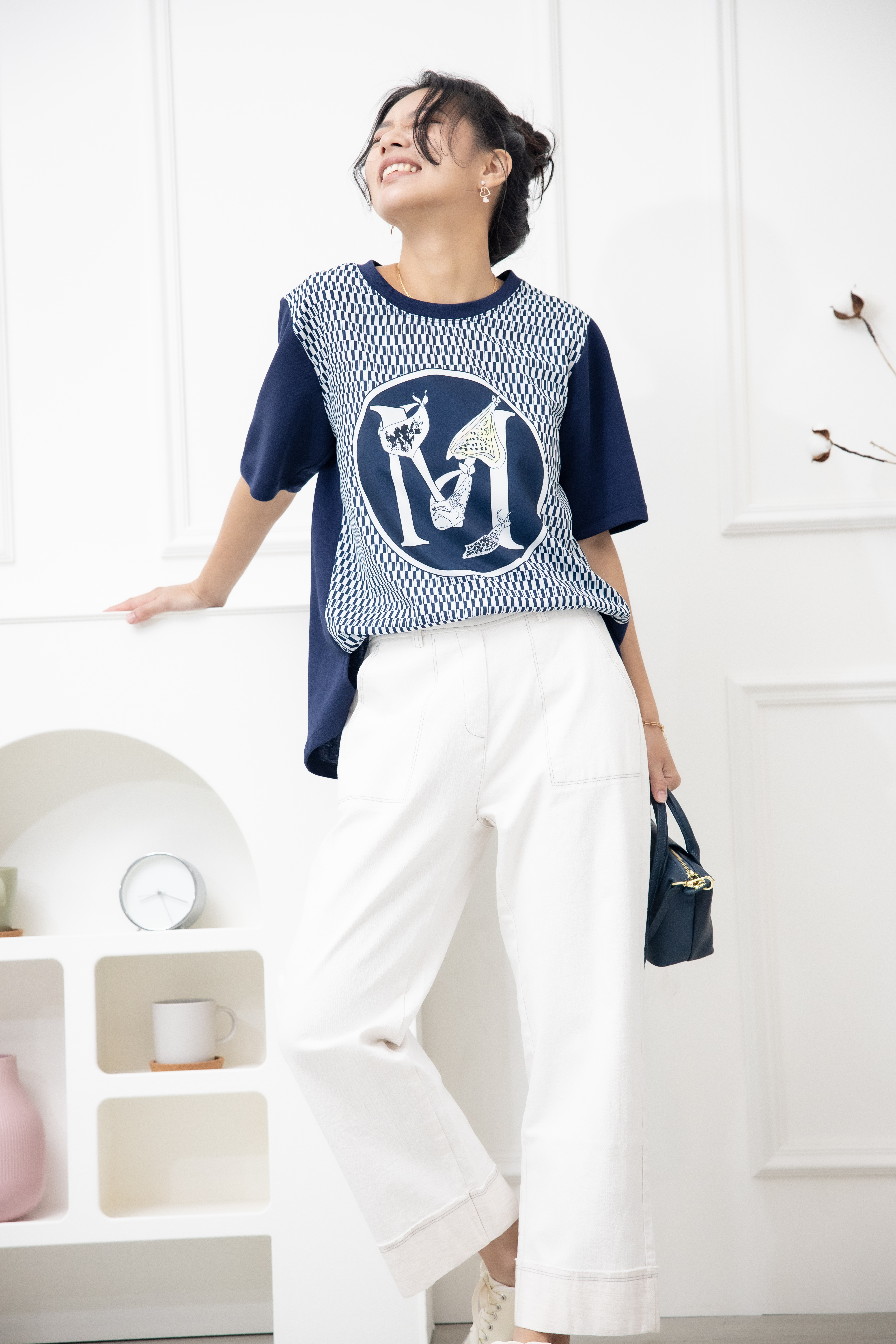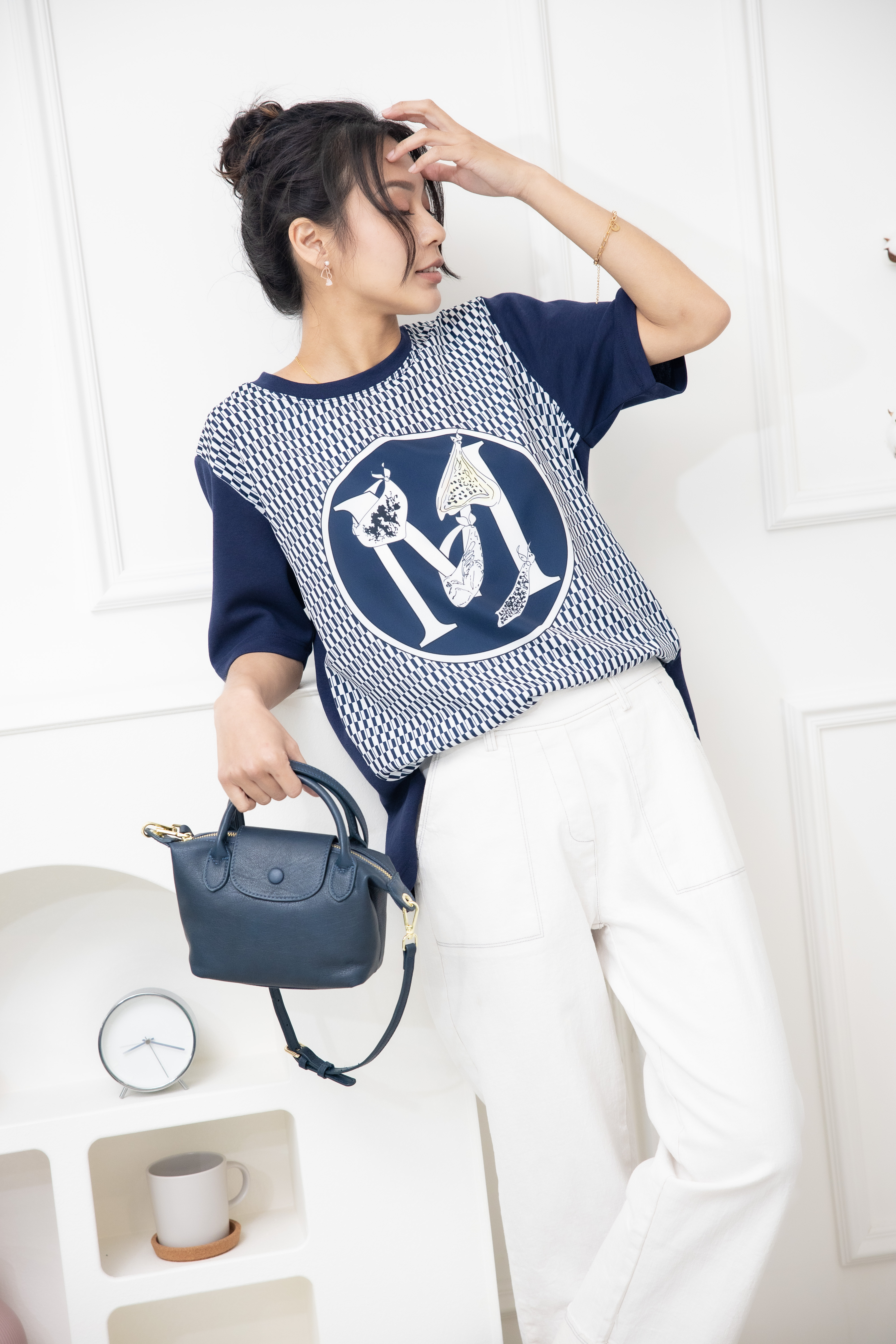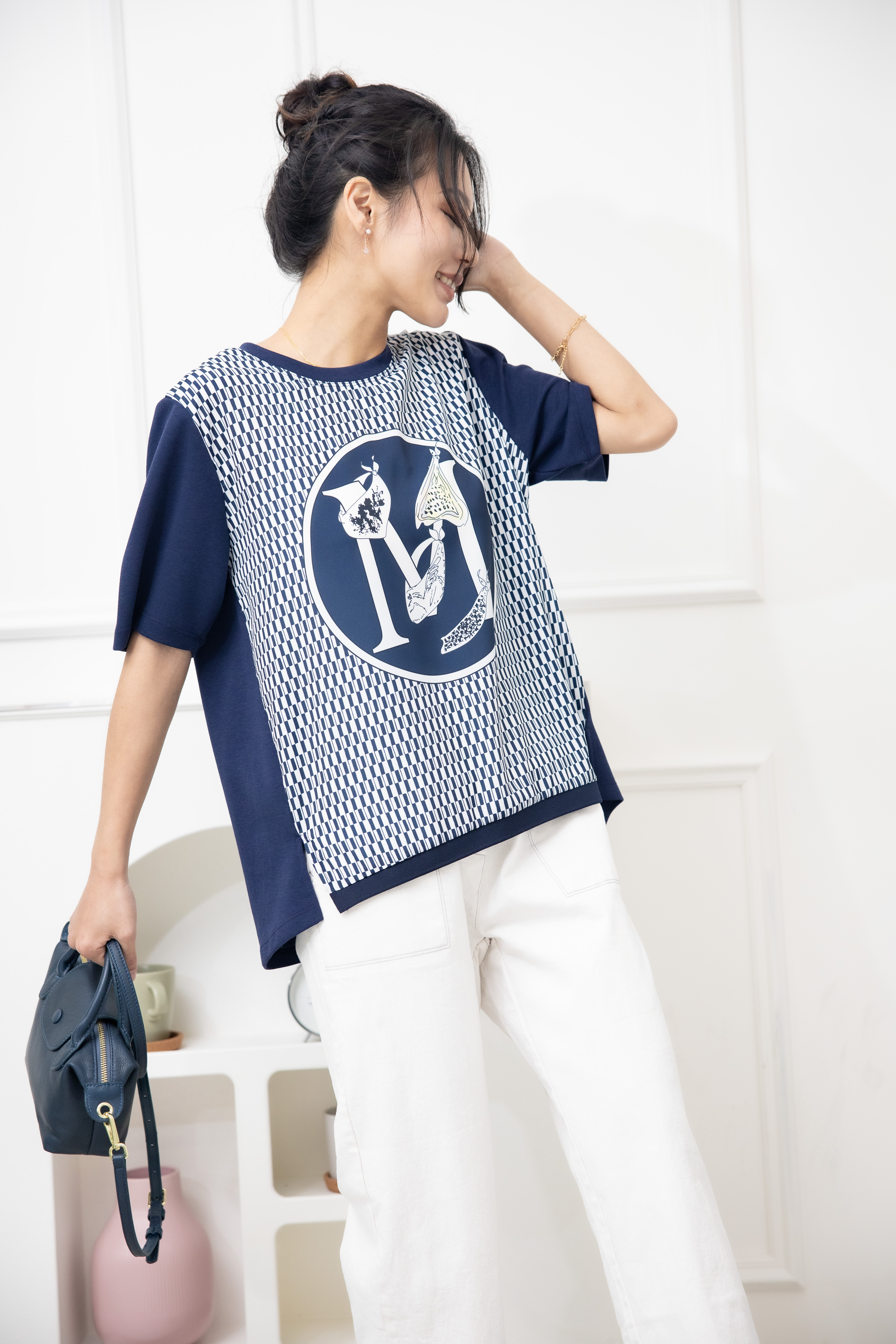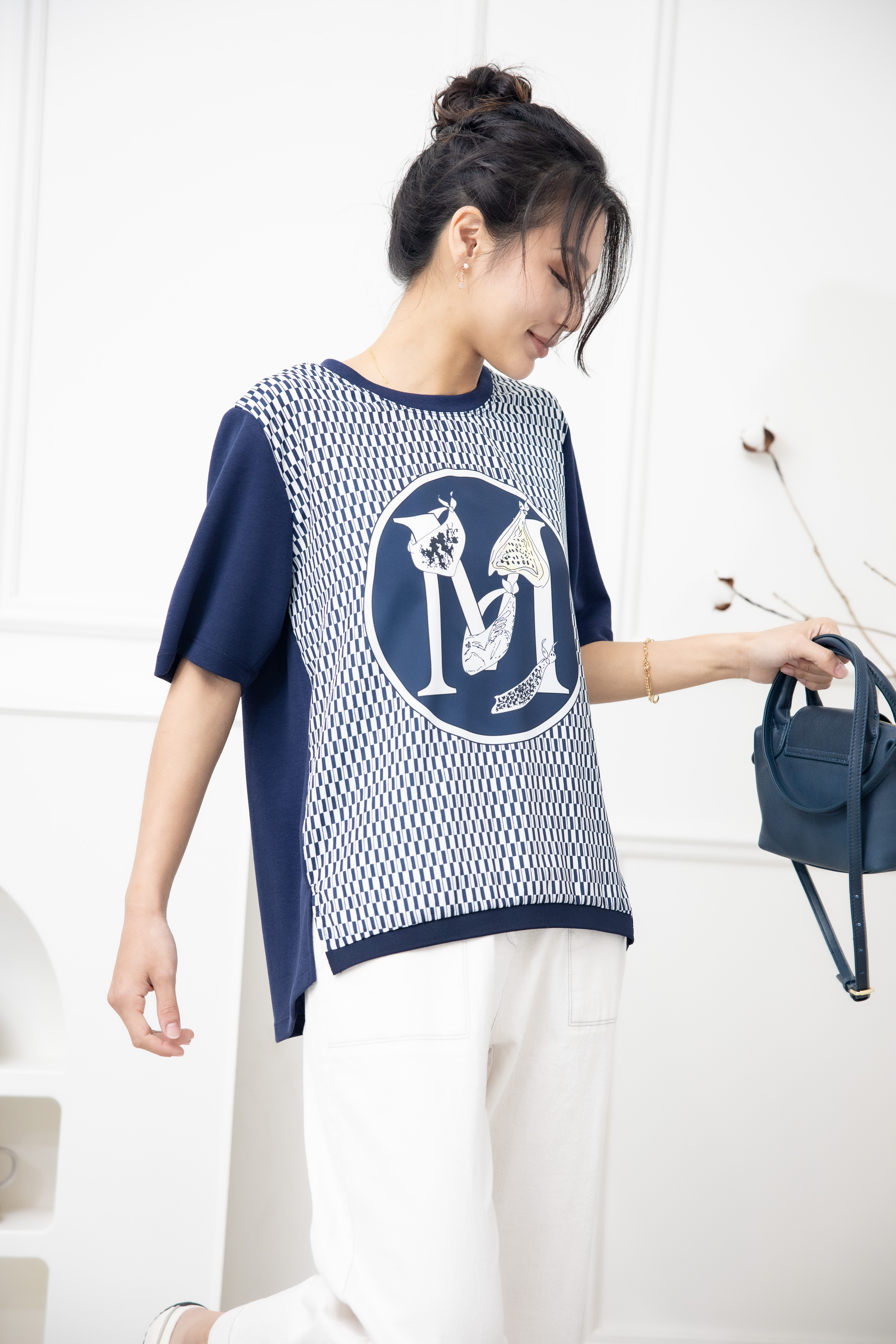 반팔 M字灰色格子短袖上衣 / 深藍色