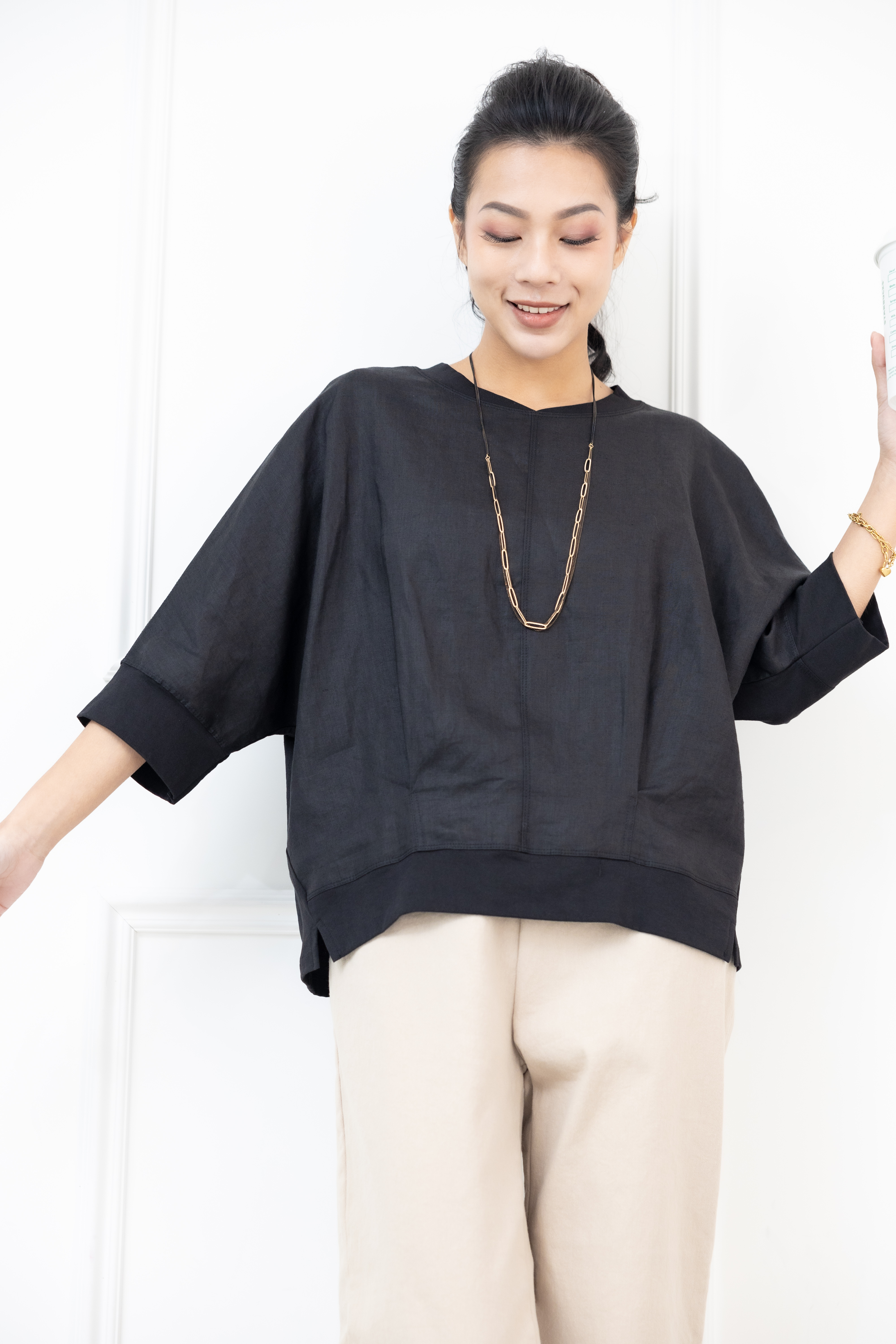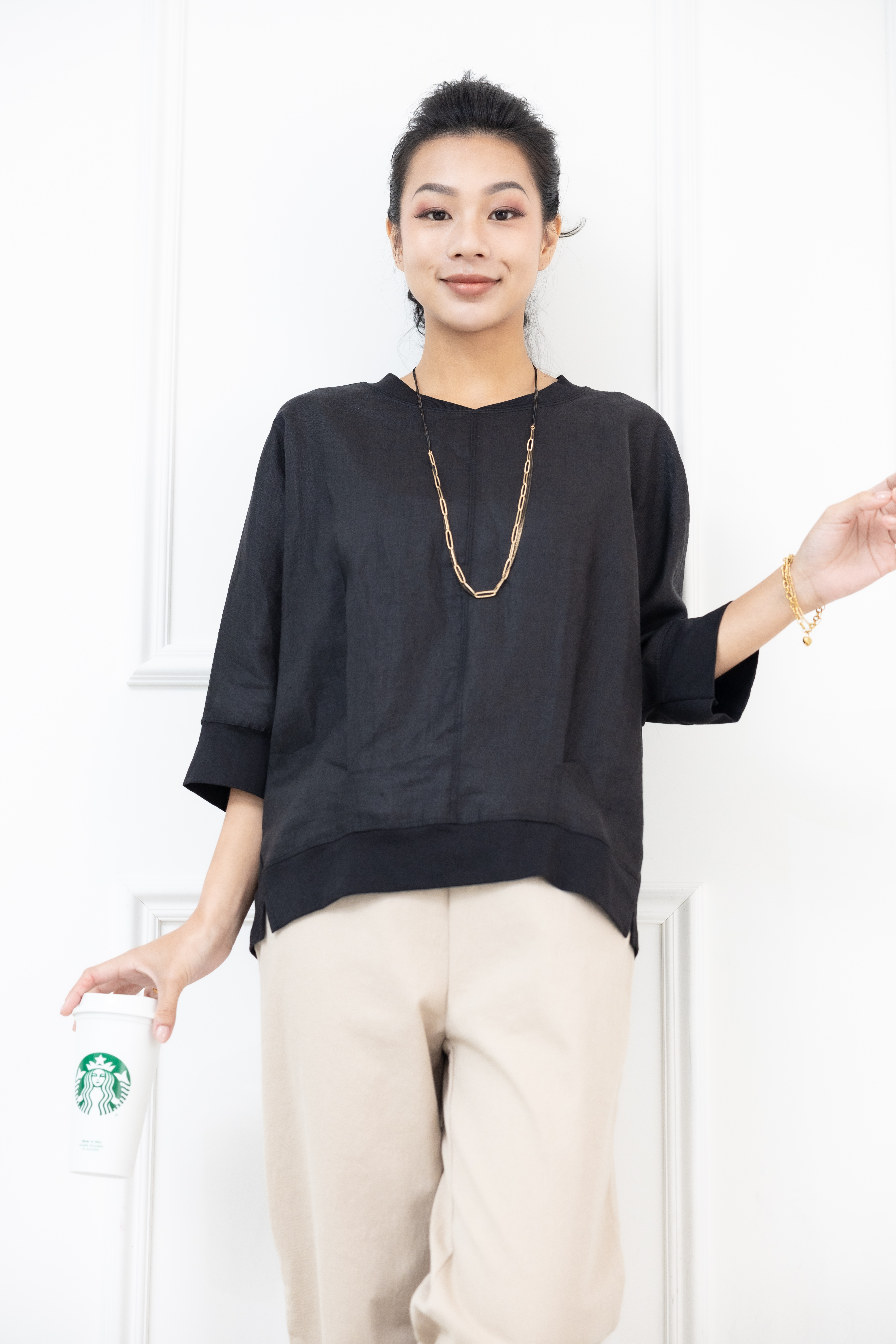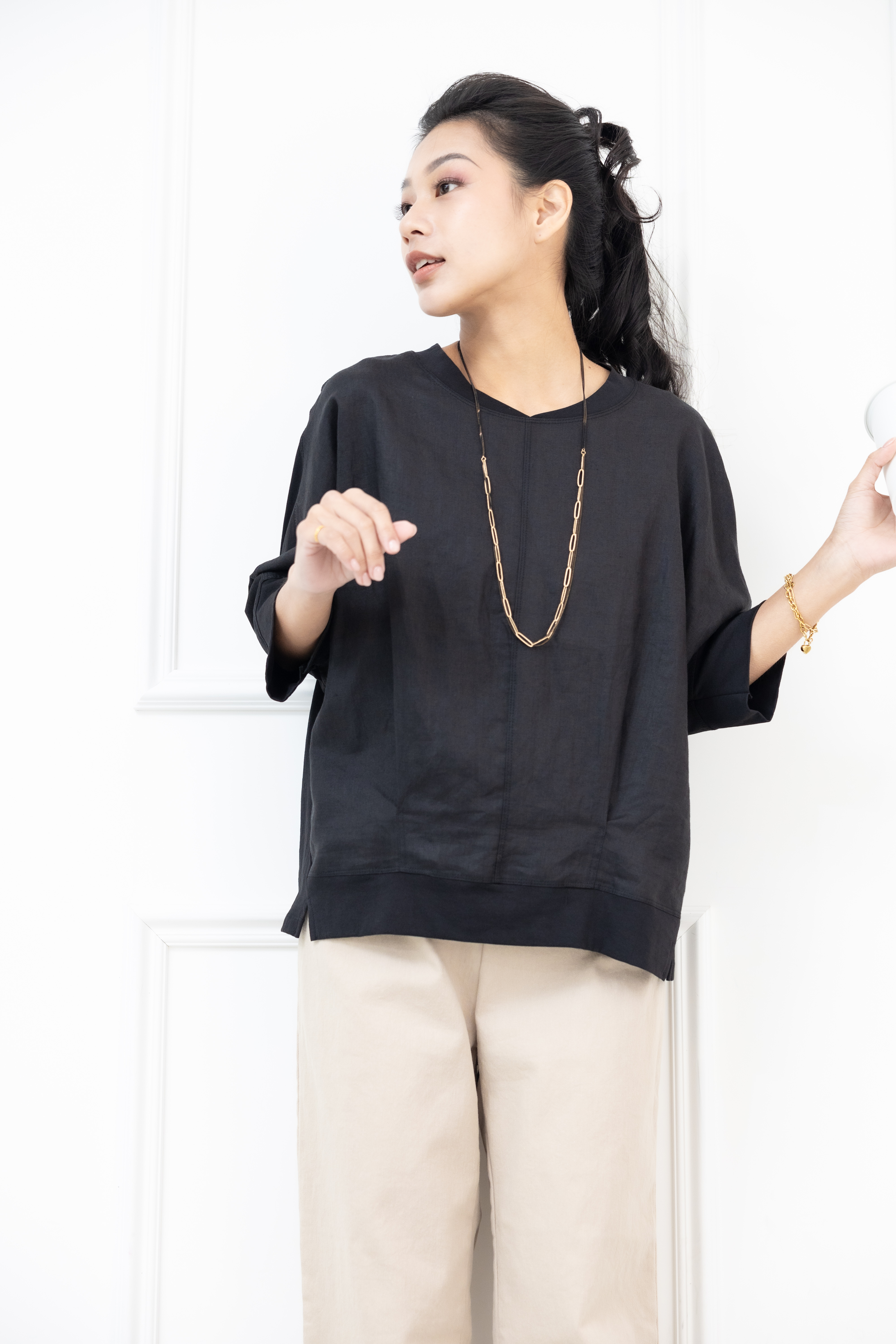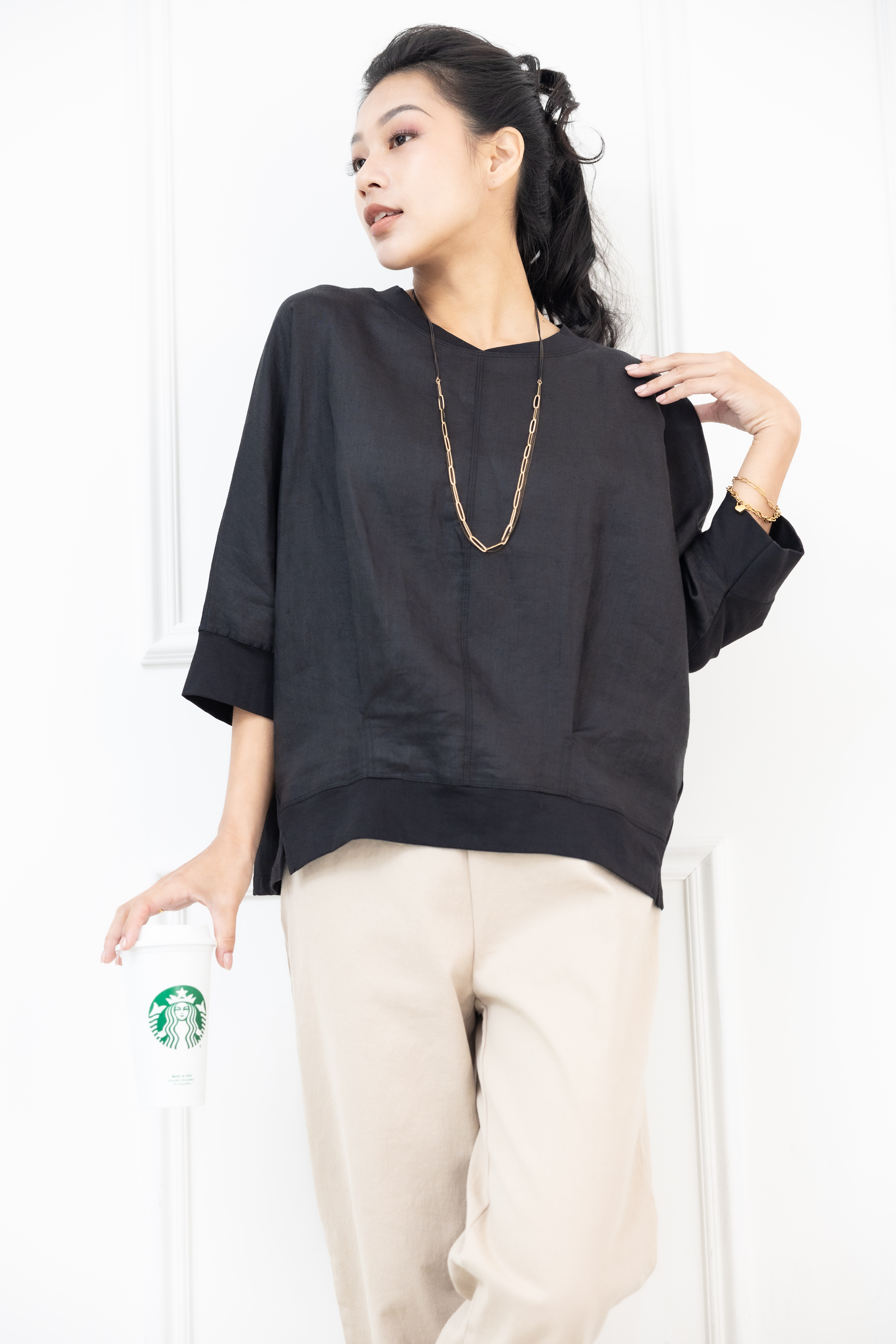 반팔 V領異材質拼接短袖上衣 / 黑色