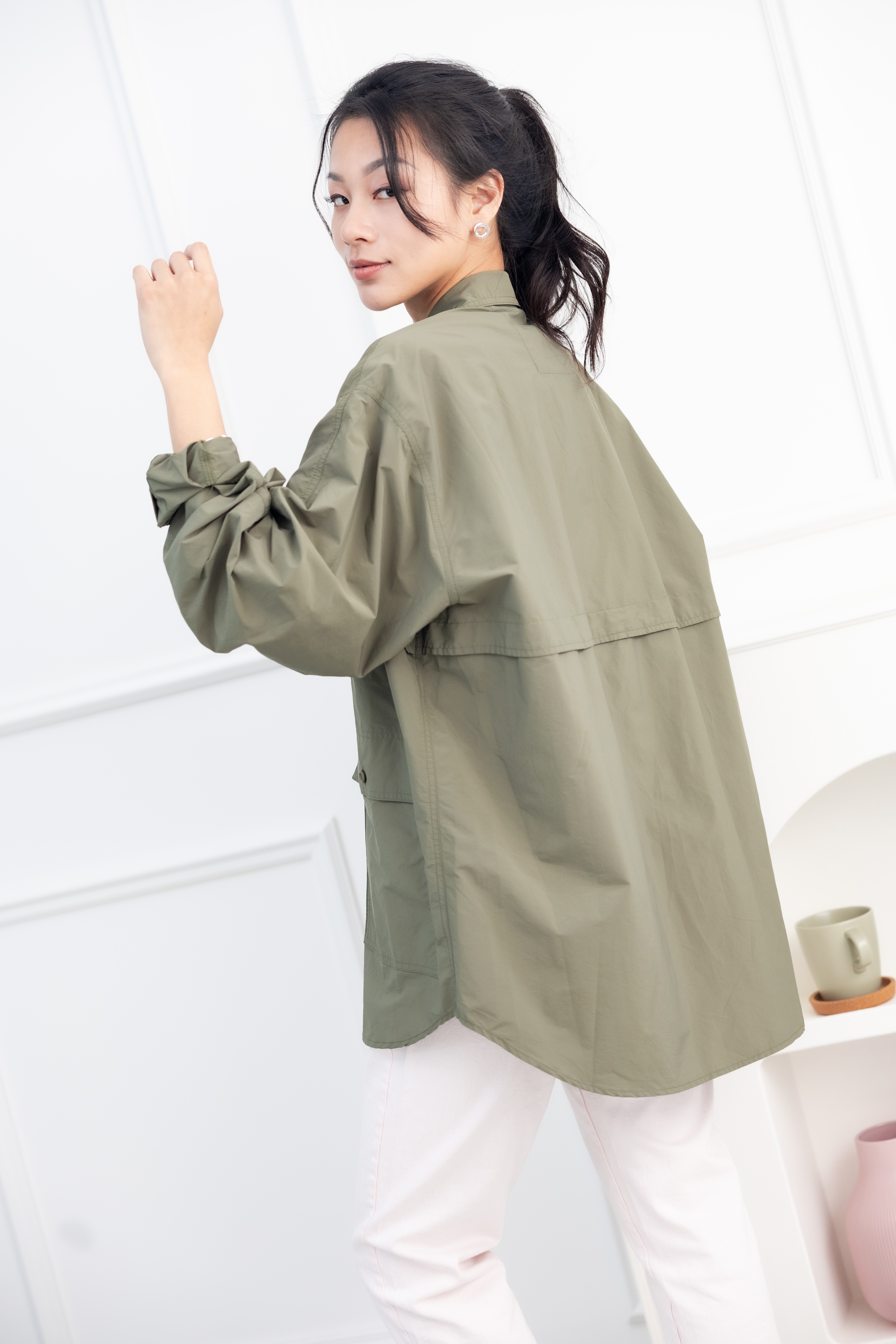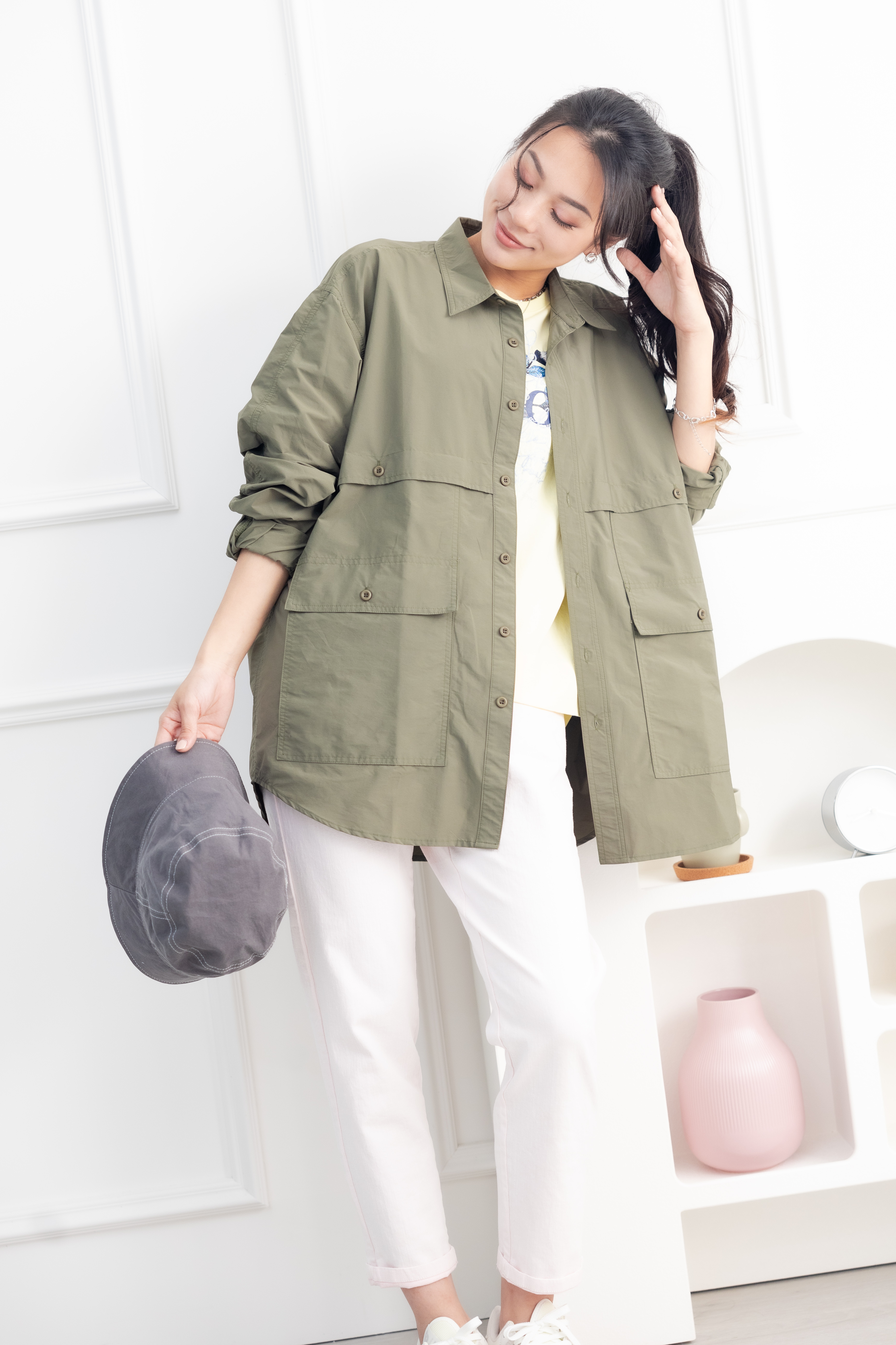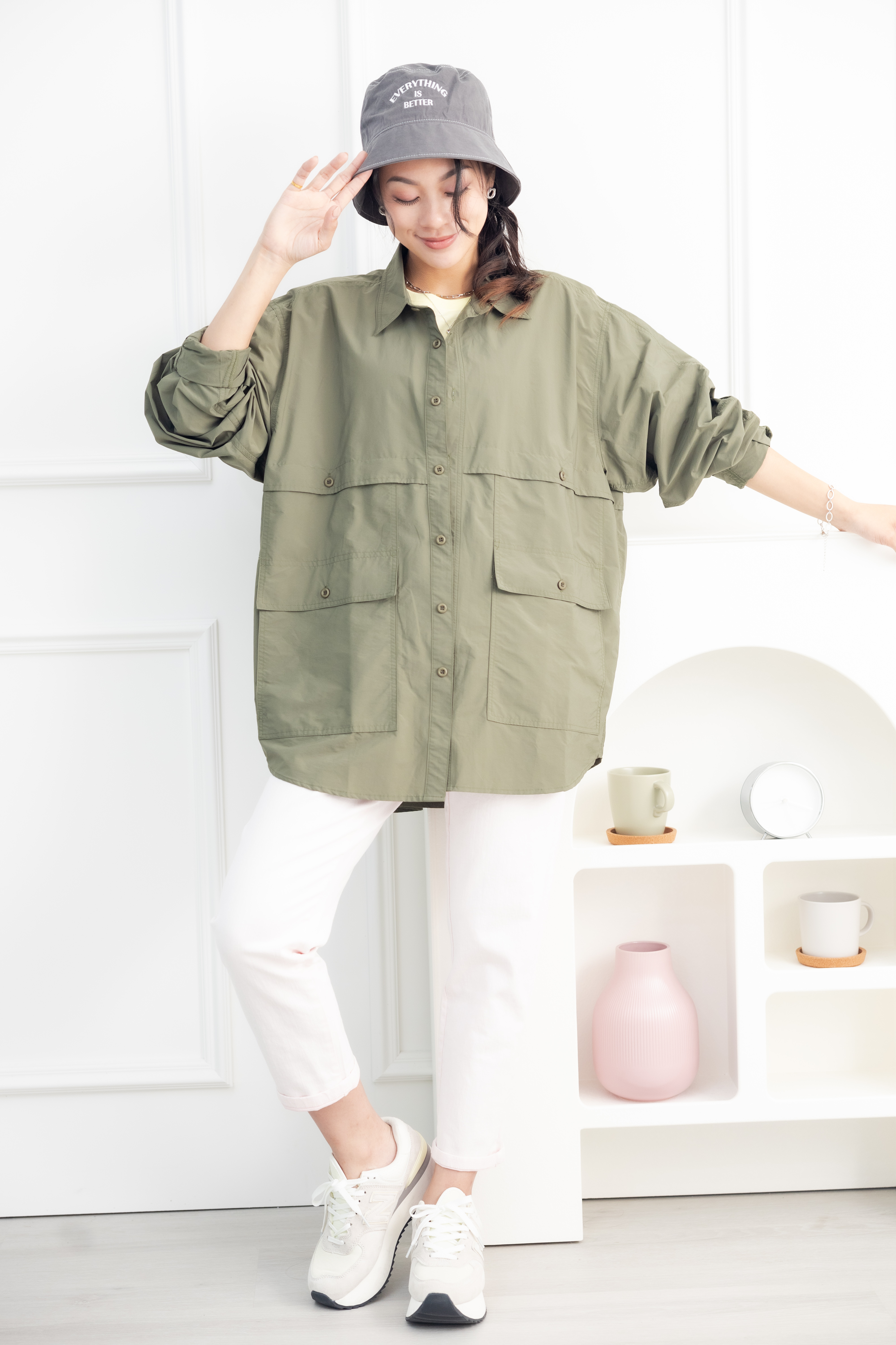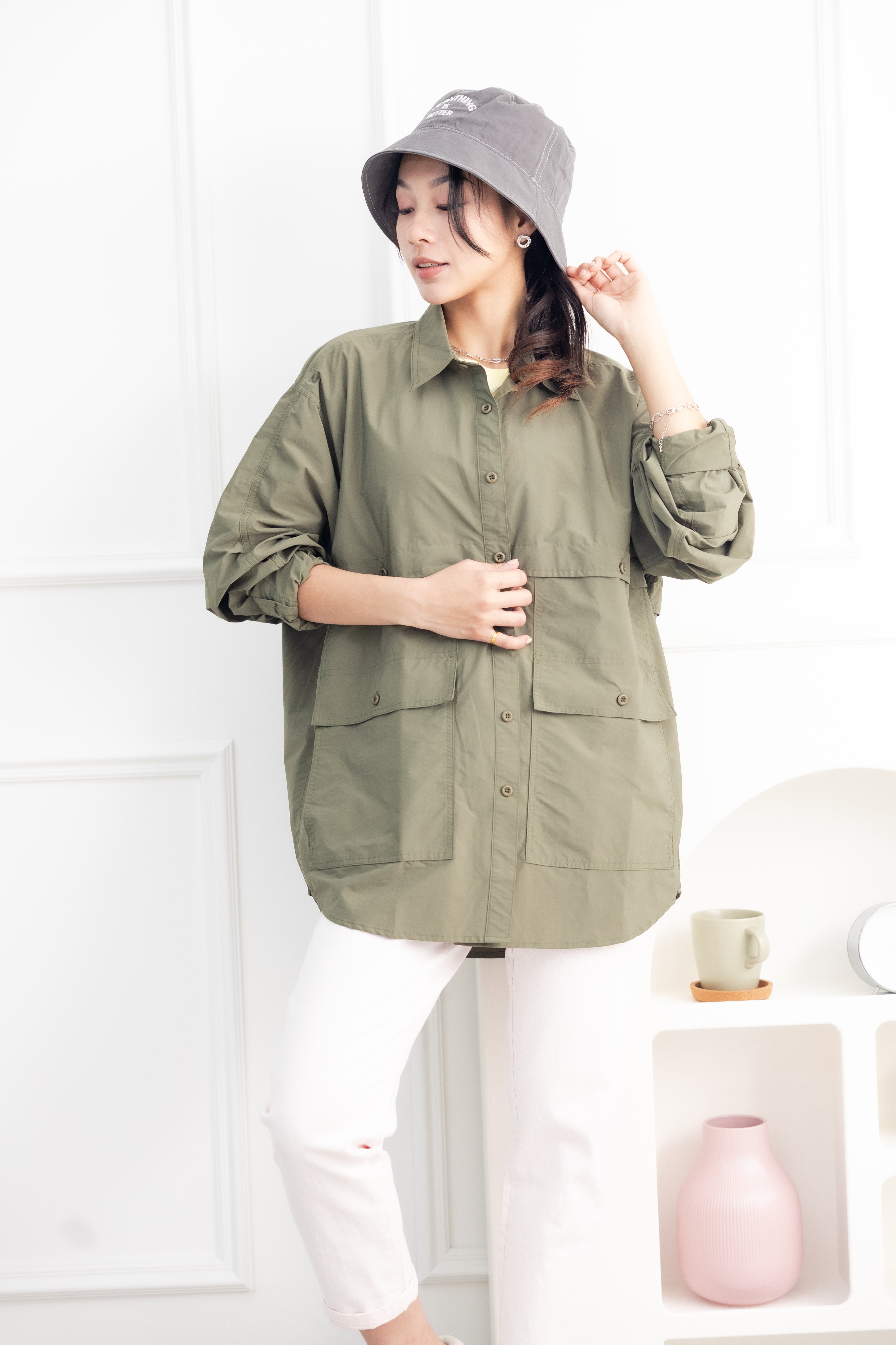 셔츠 多口袋長袖上衣/墨綠色