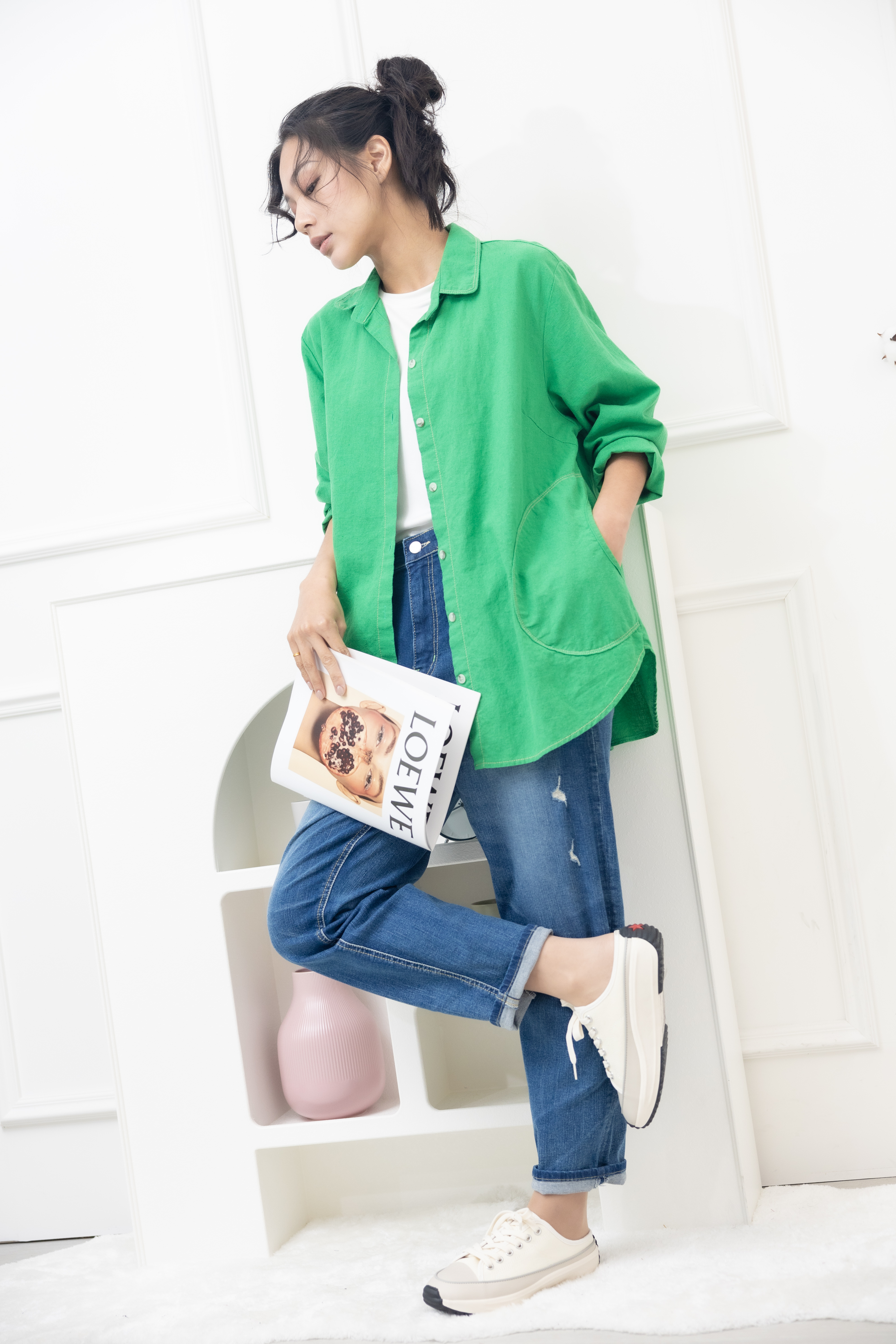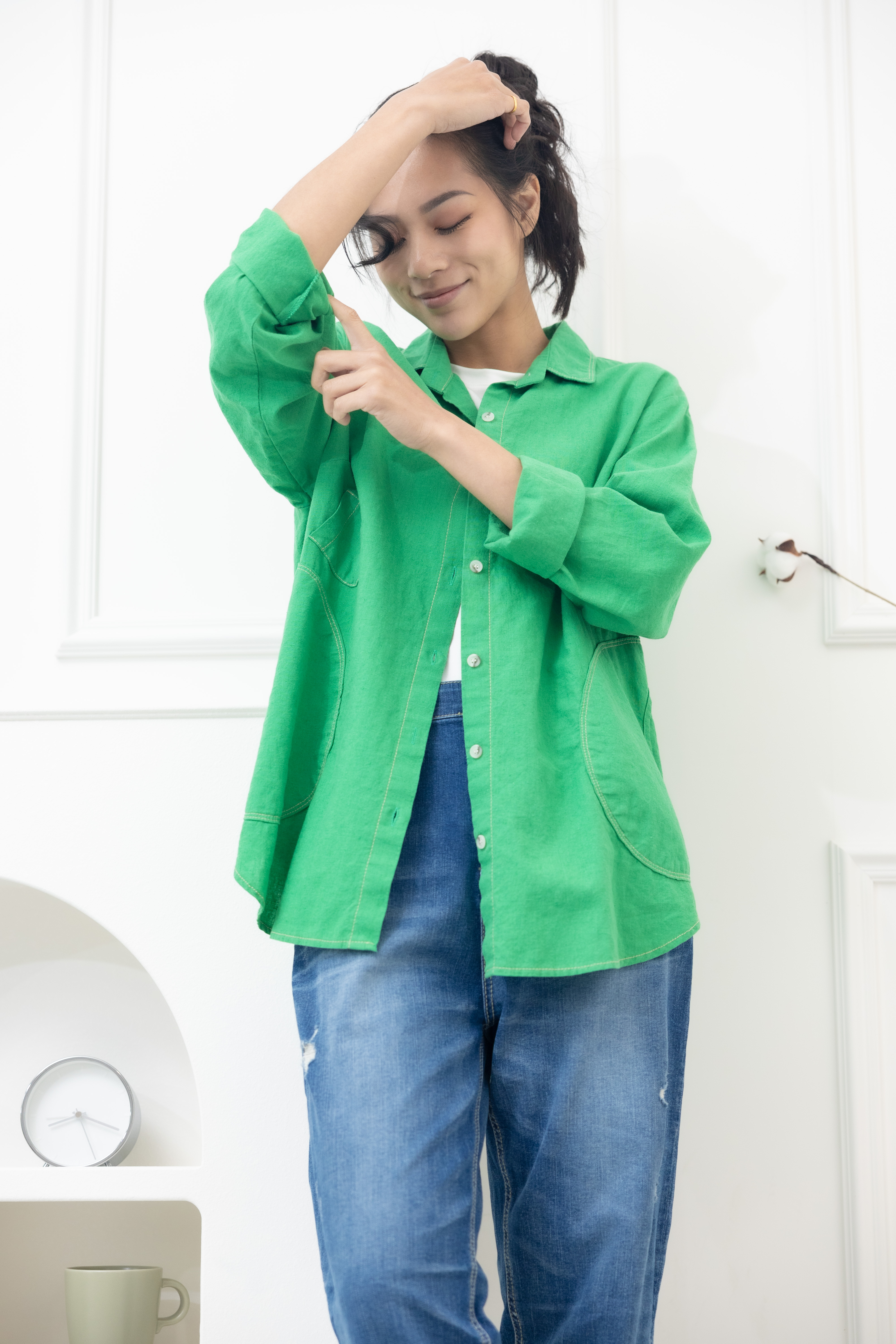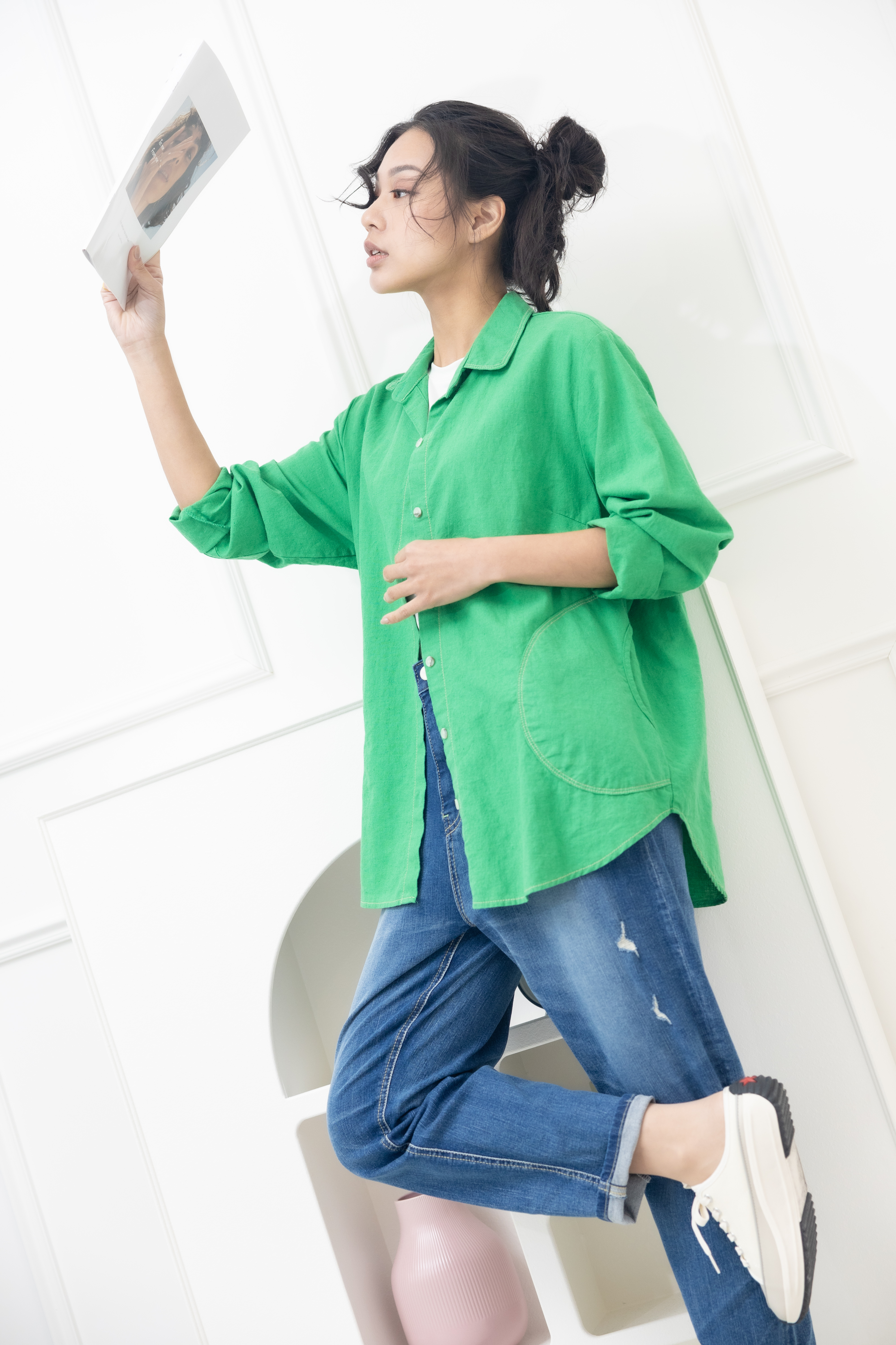 셔츠 小裝飾口袋開襟棉襯衫 / 綠色