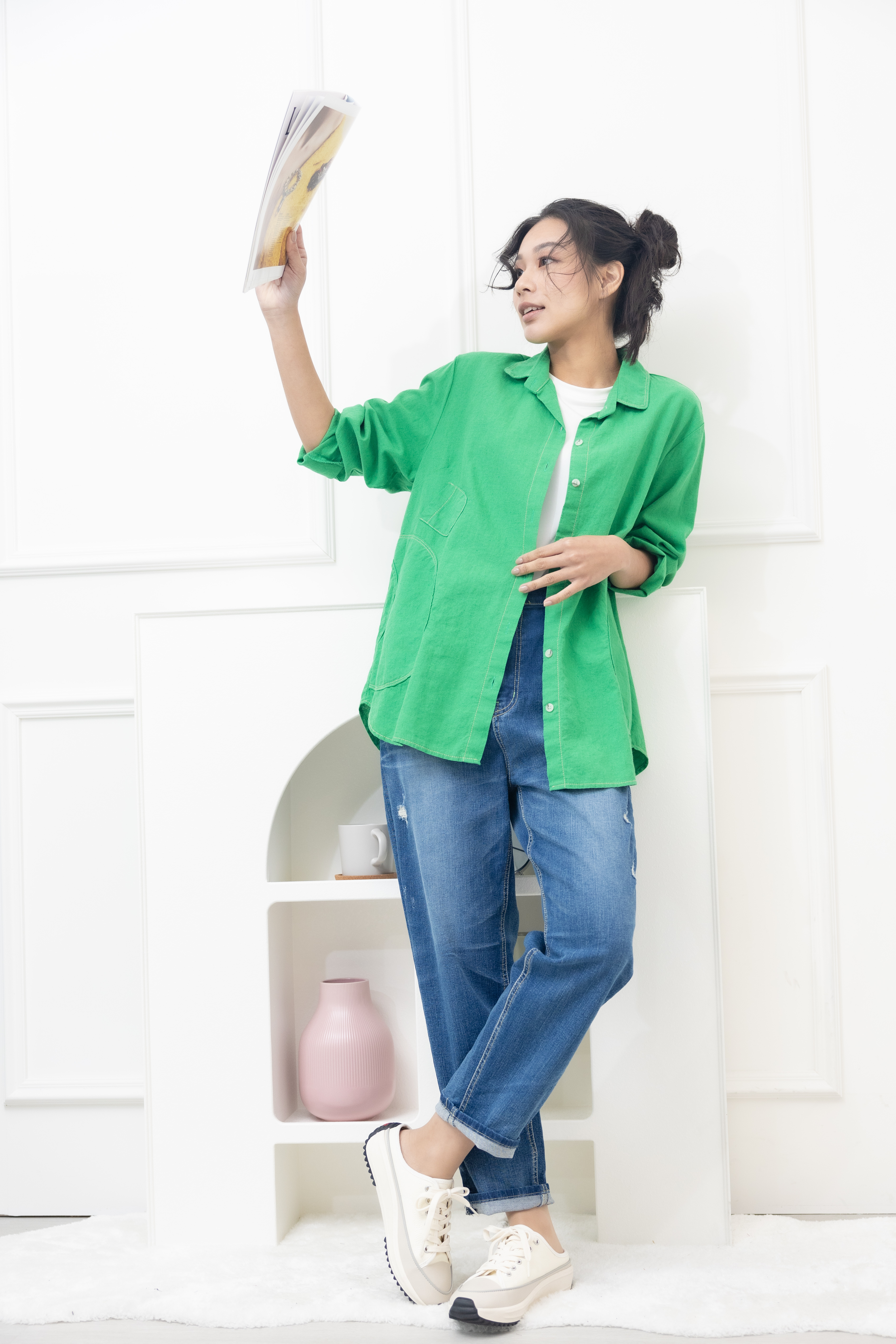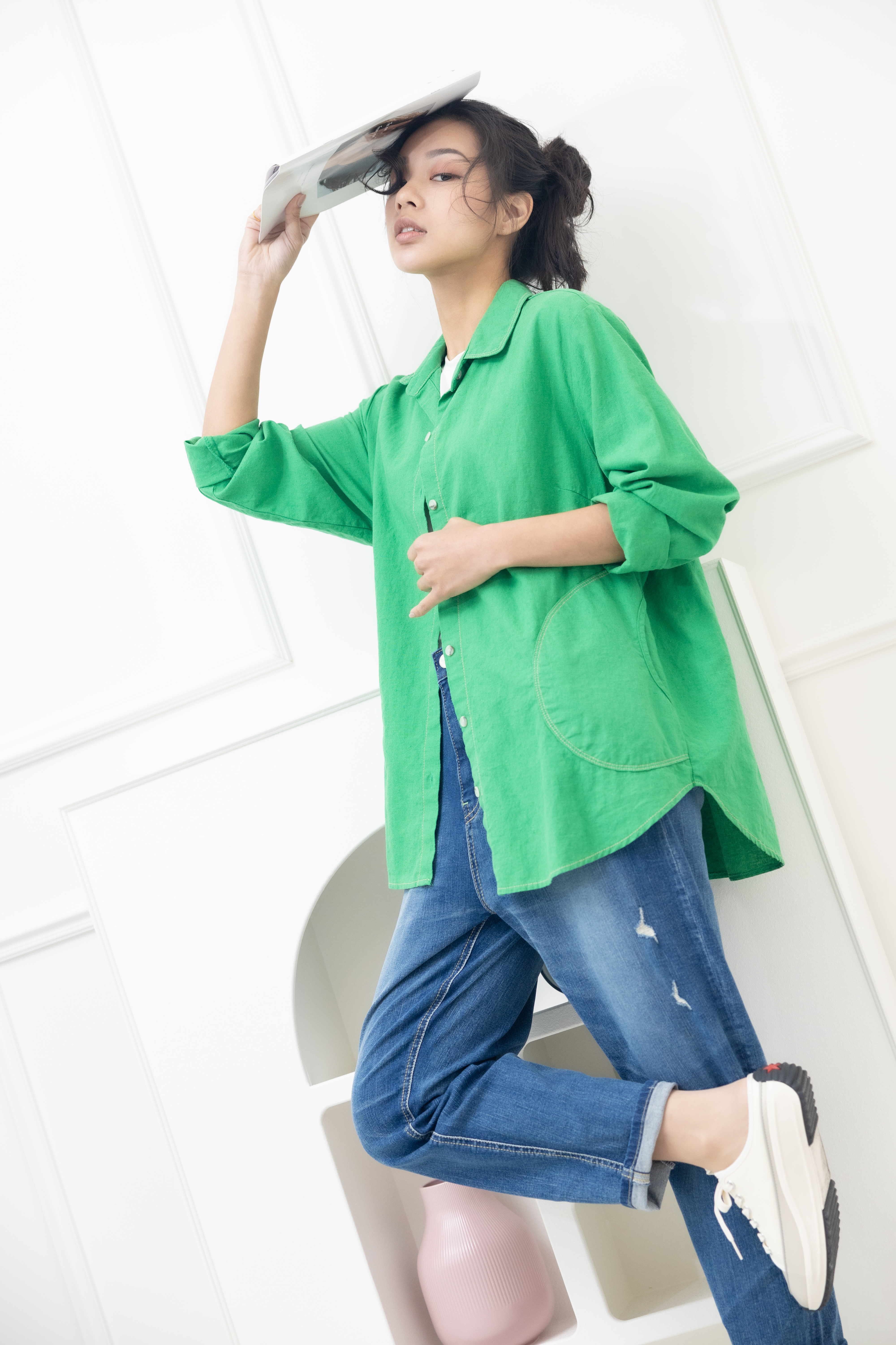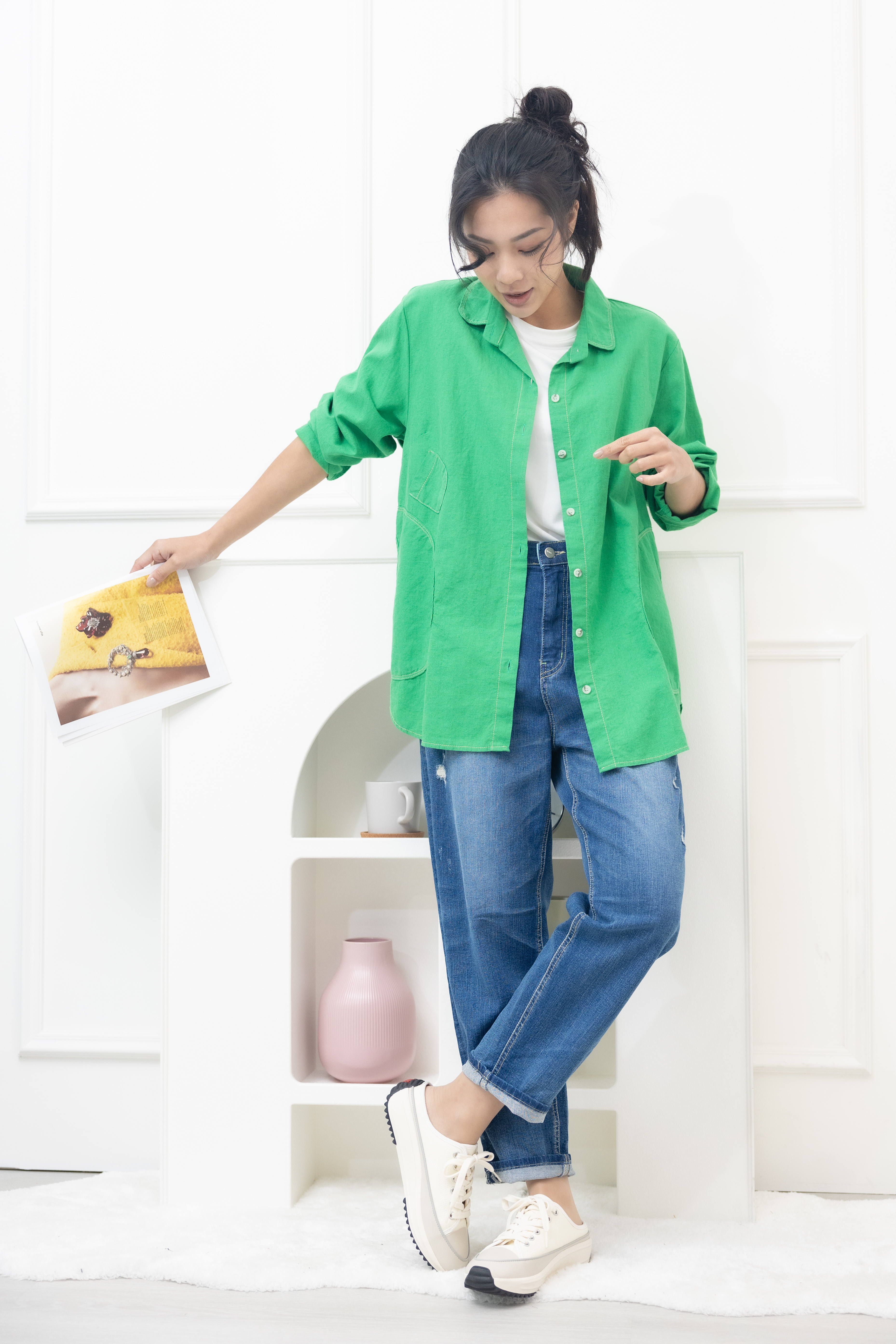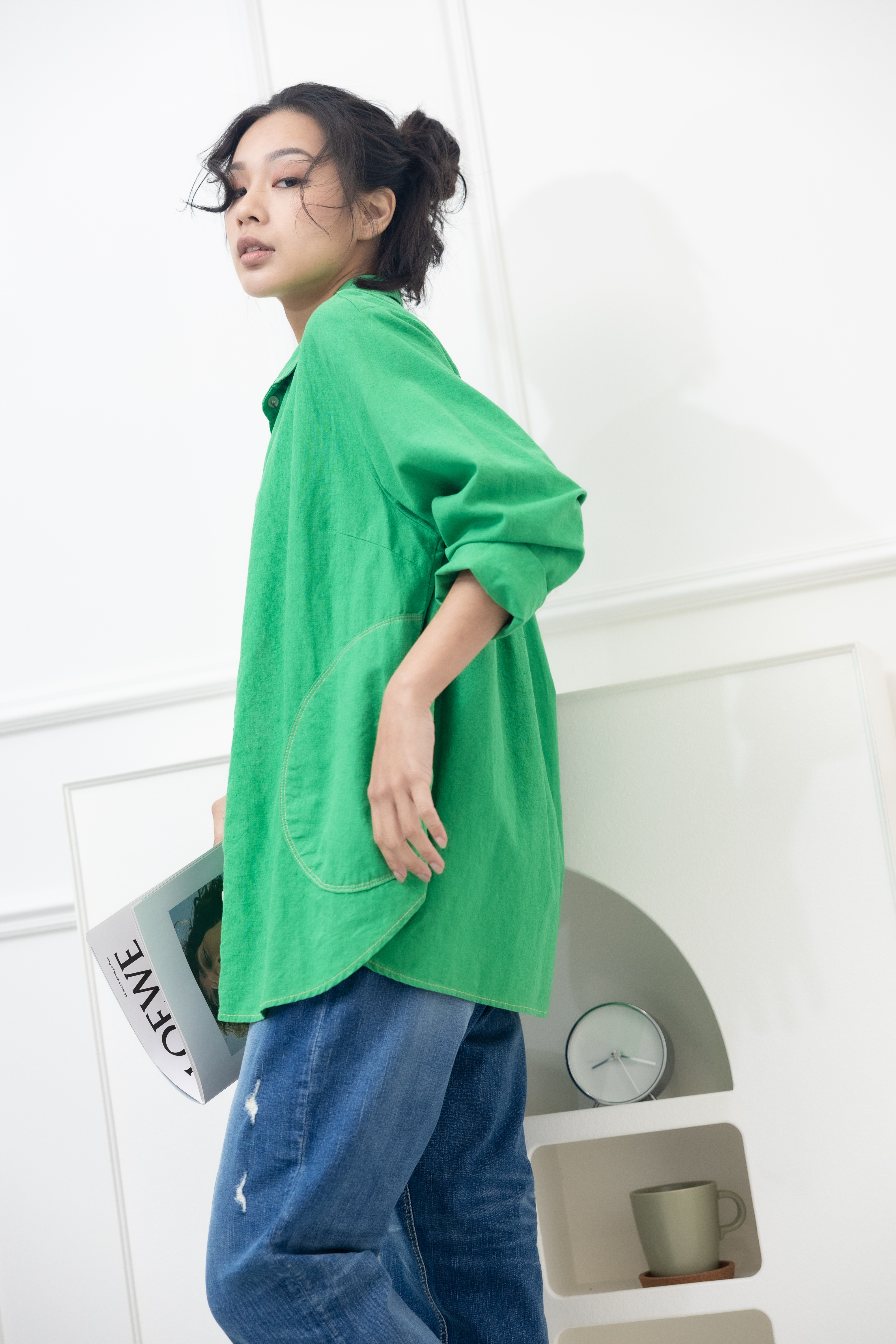 셔츠 小裝飾口袋開襟棉襯衫 / 綠色