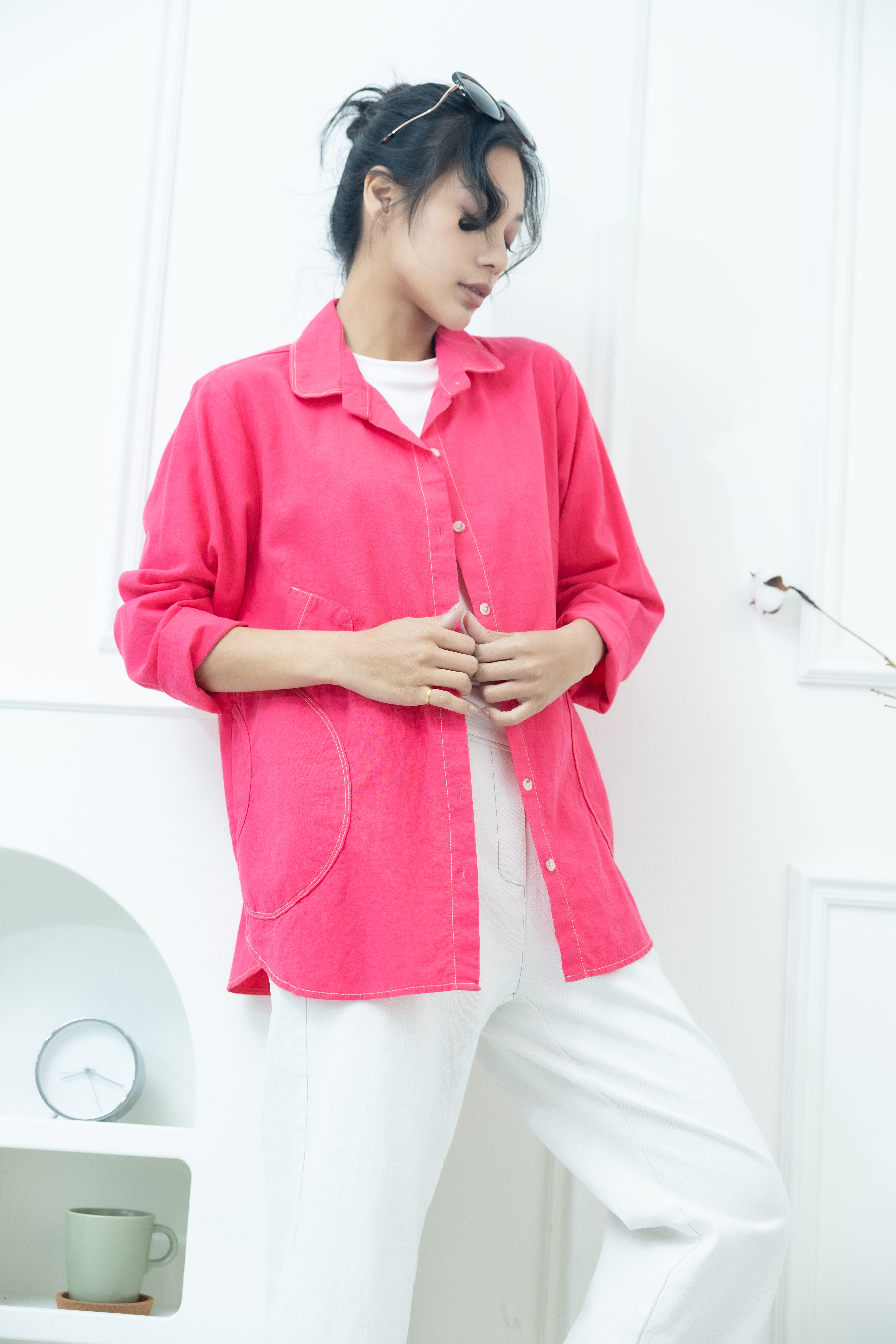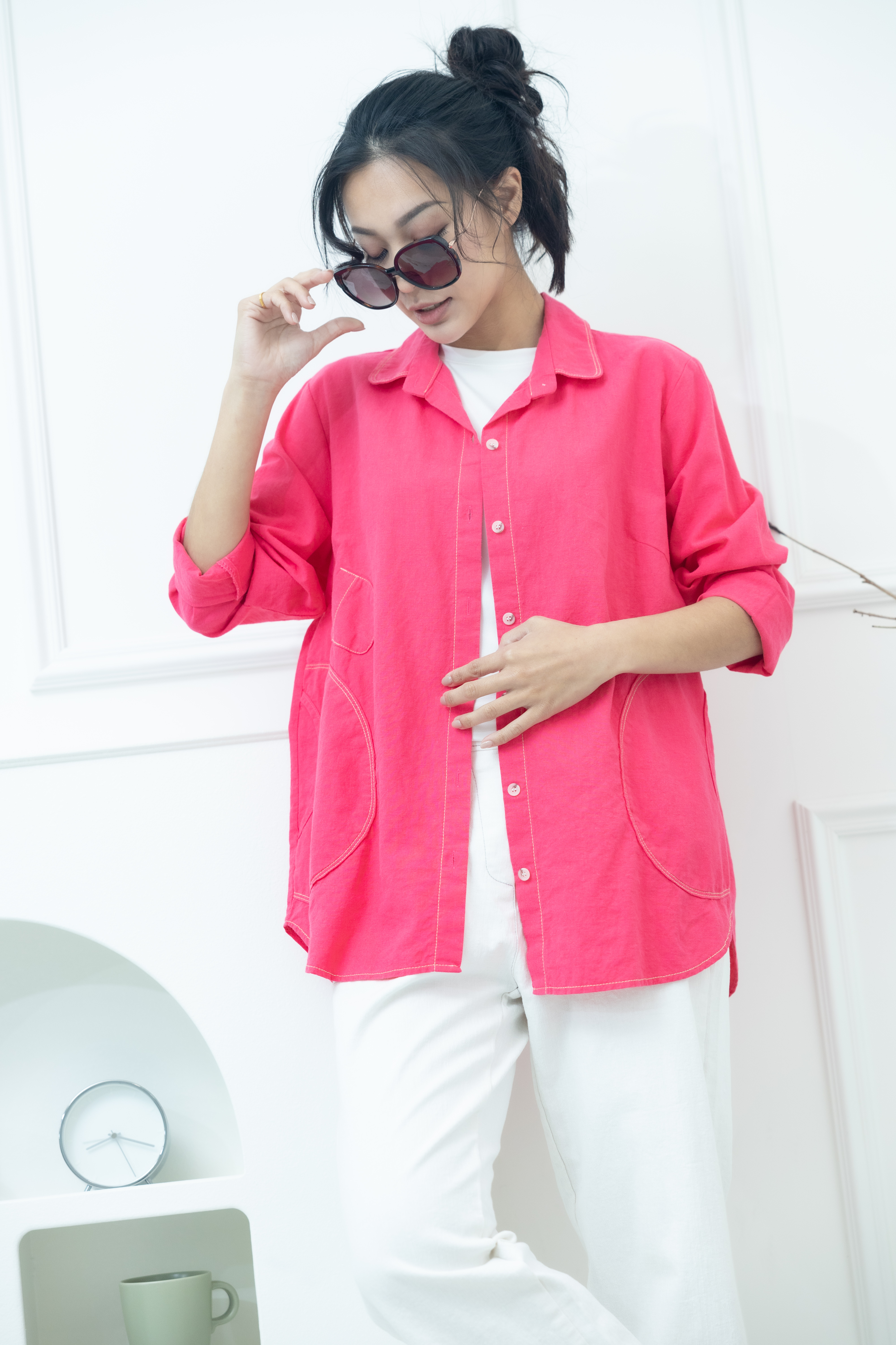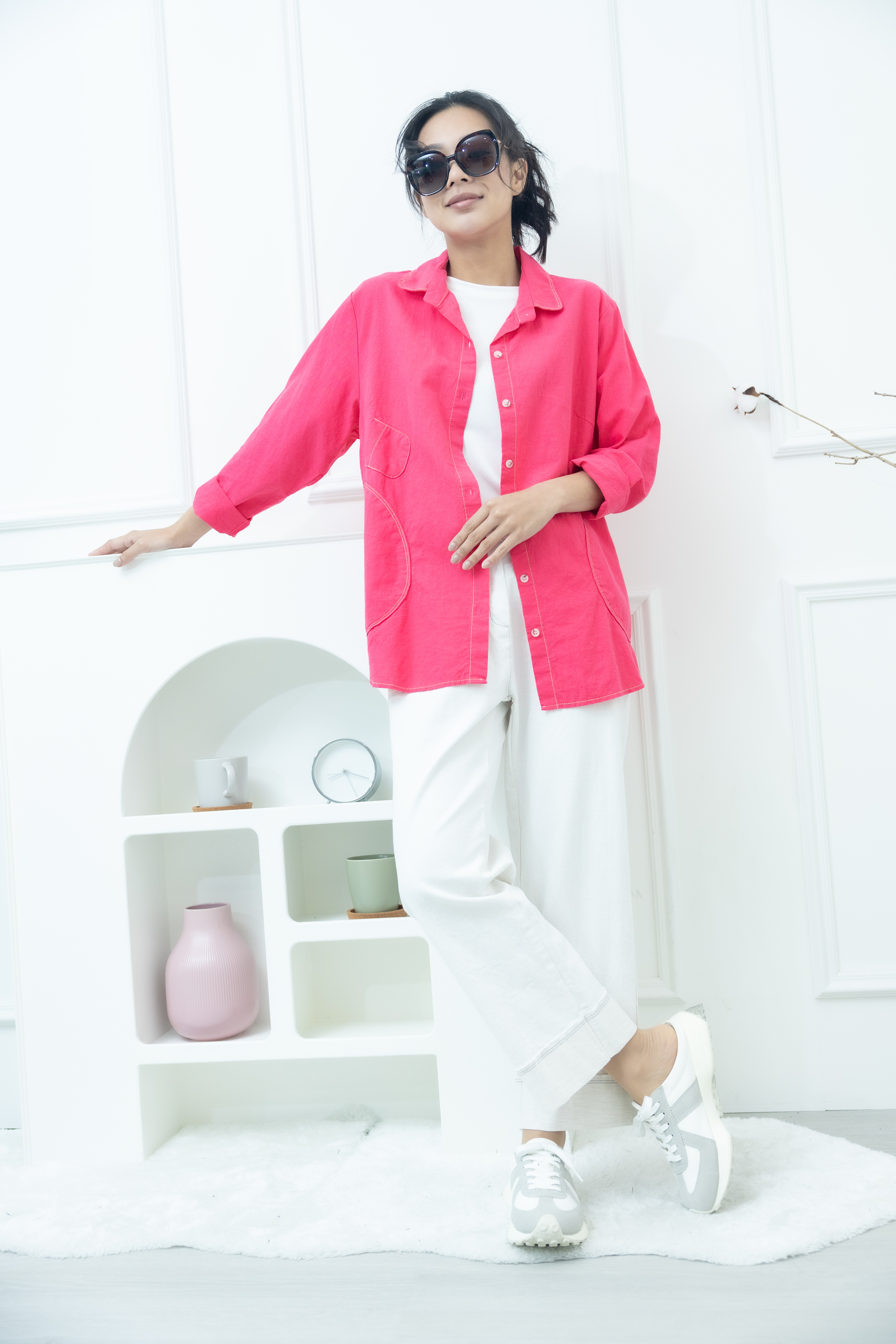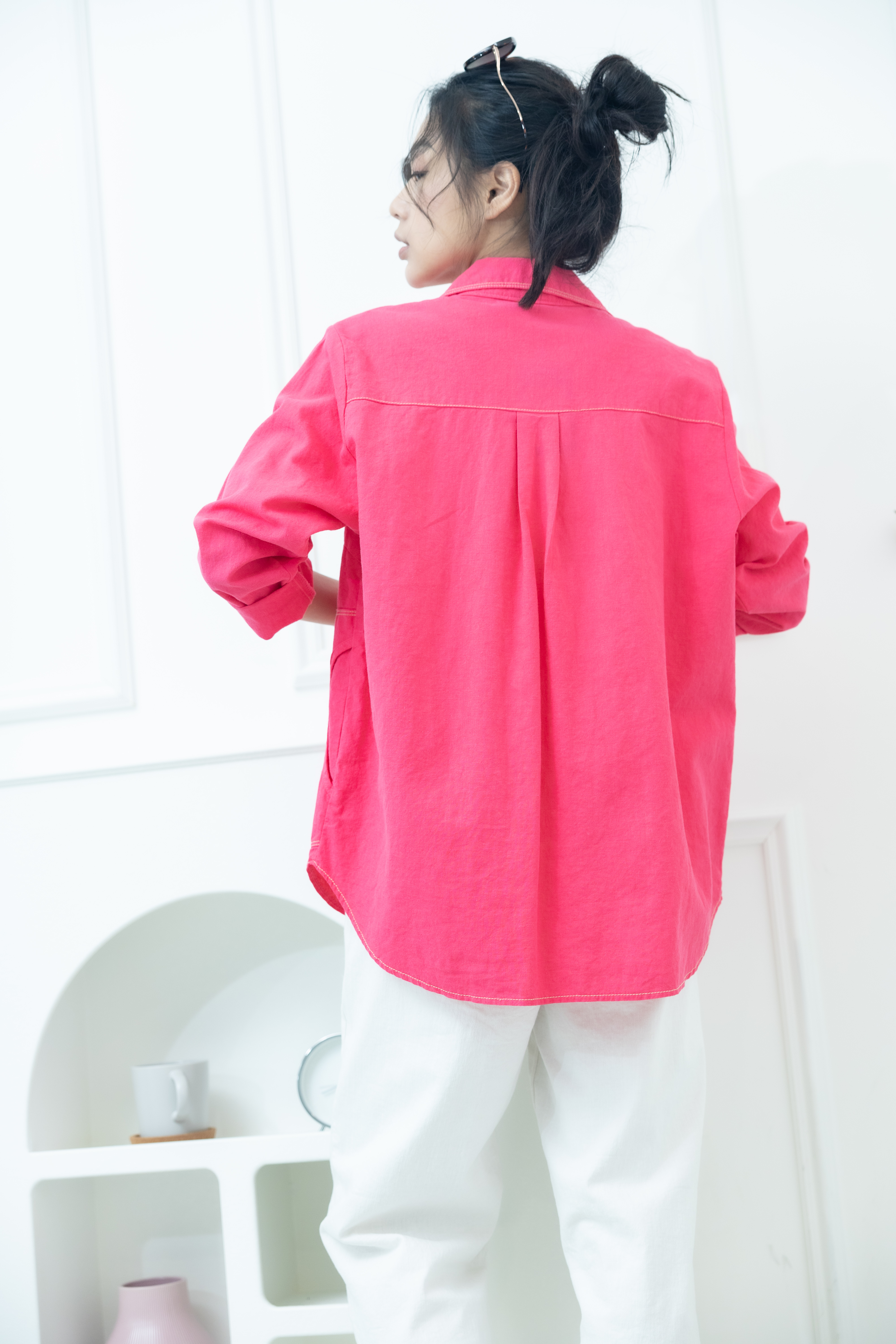 셔츠 小裝飾口袋開襟棉襯衫 / 艷粉色