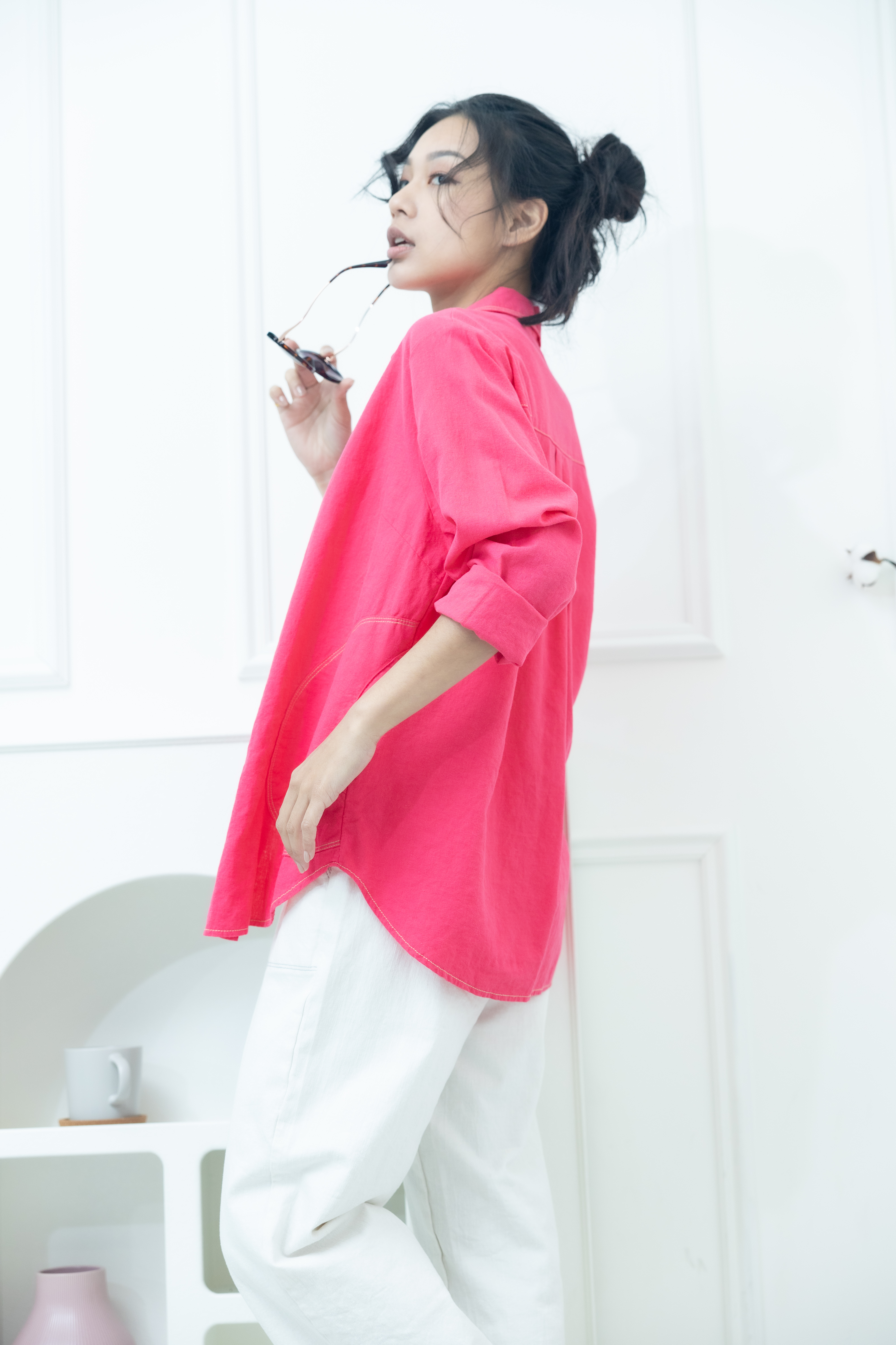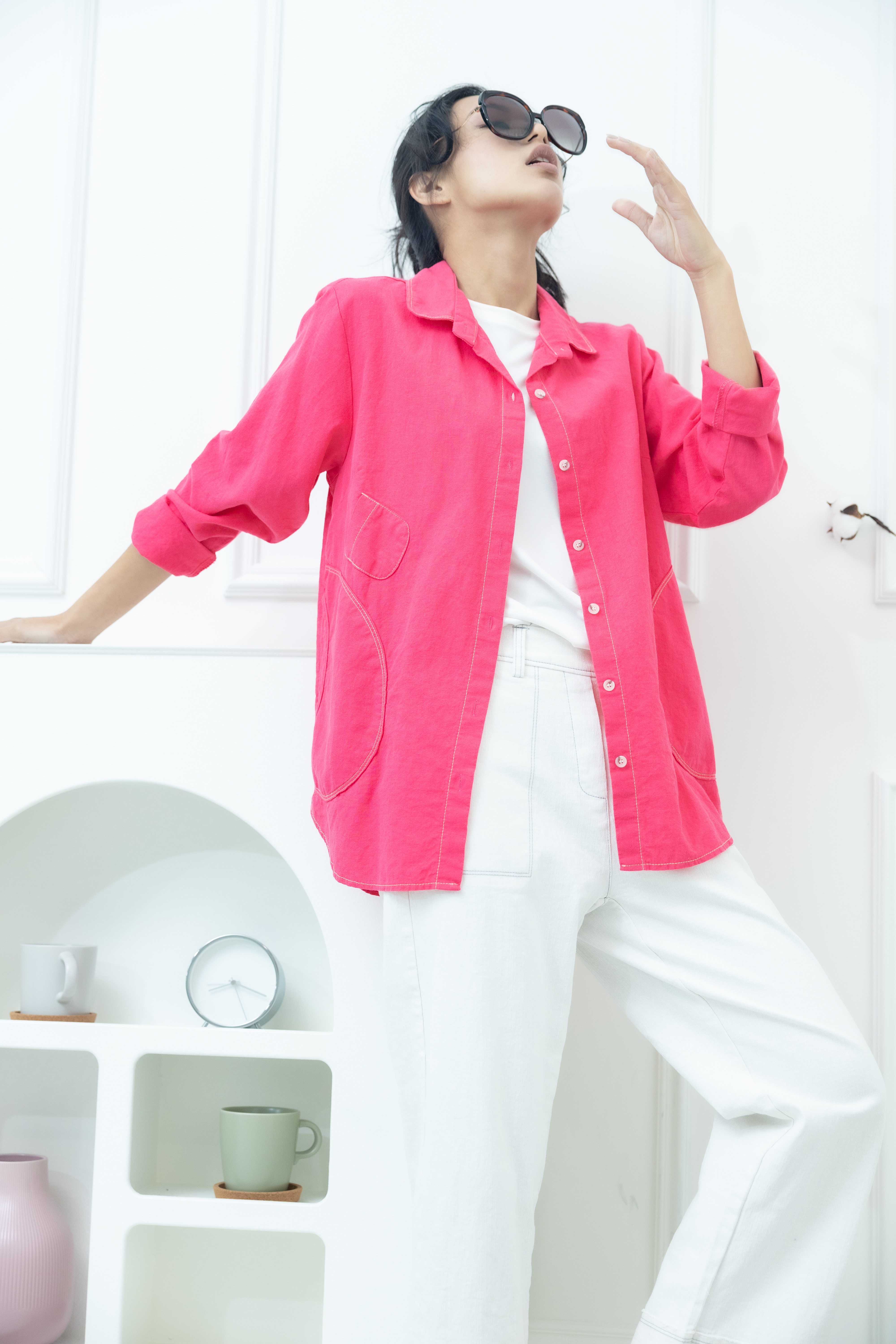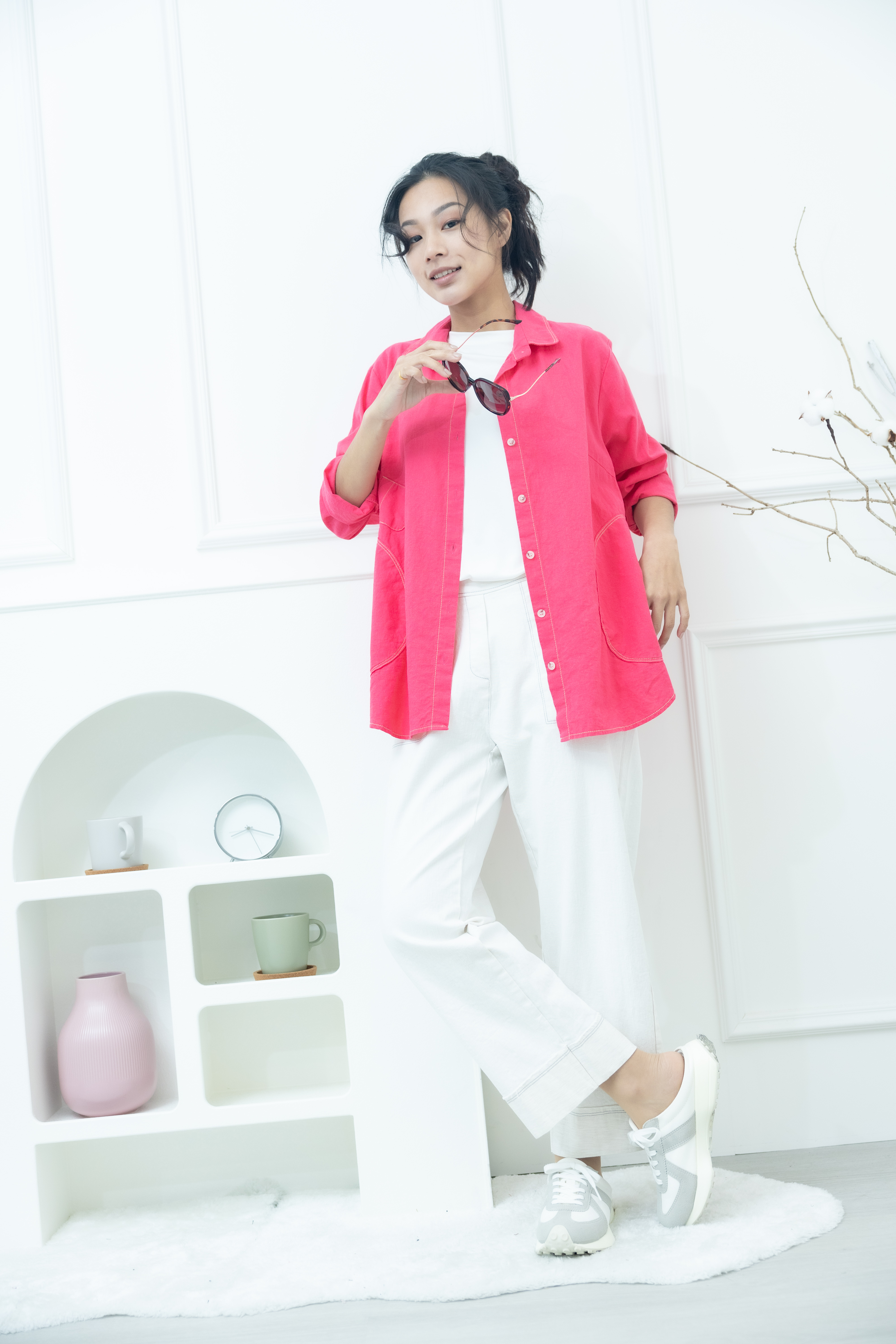 셔츠 小裝飾口袋開襟棉襯衫 / 艷粉色