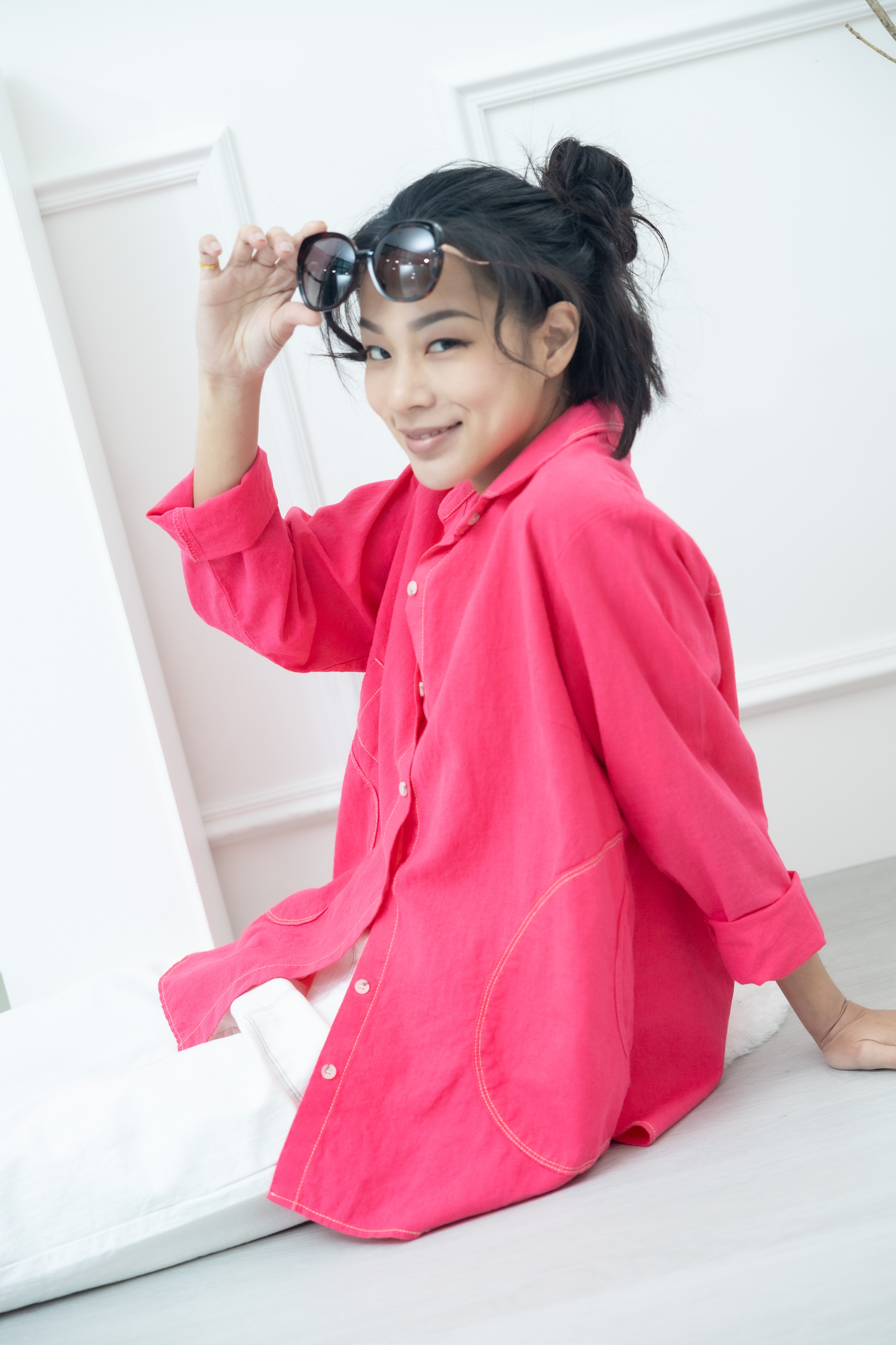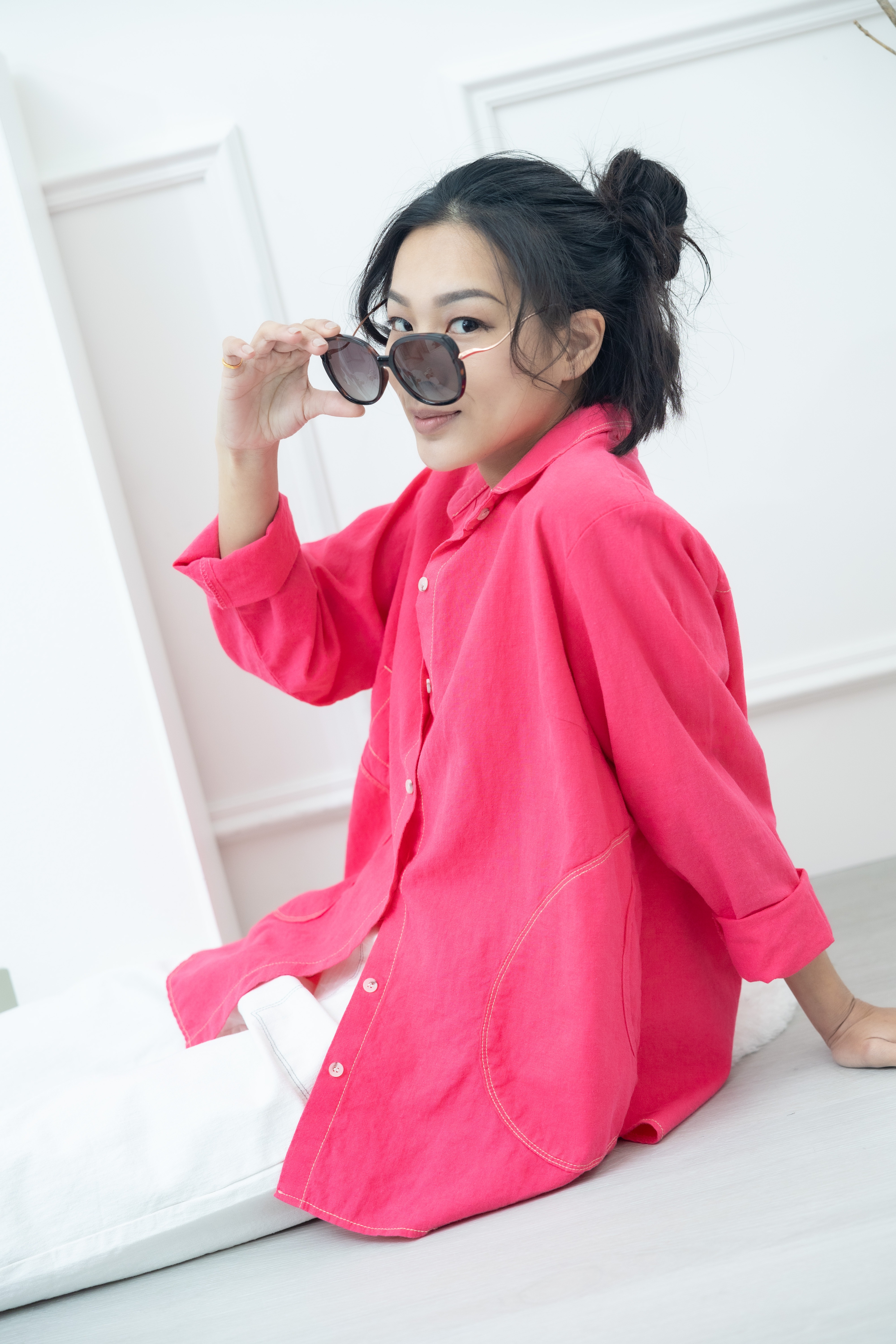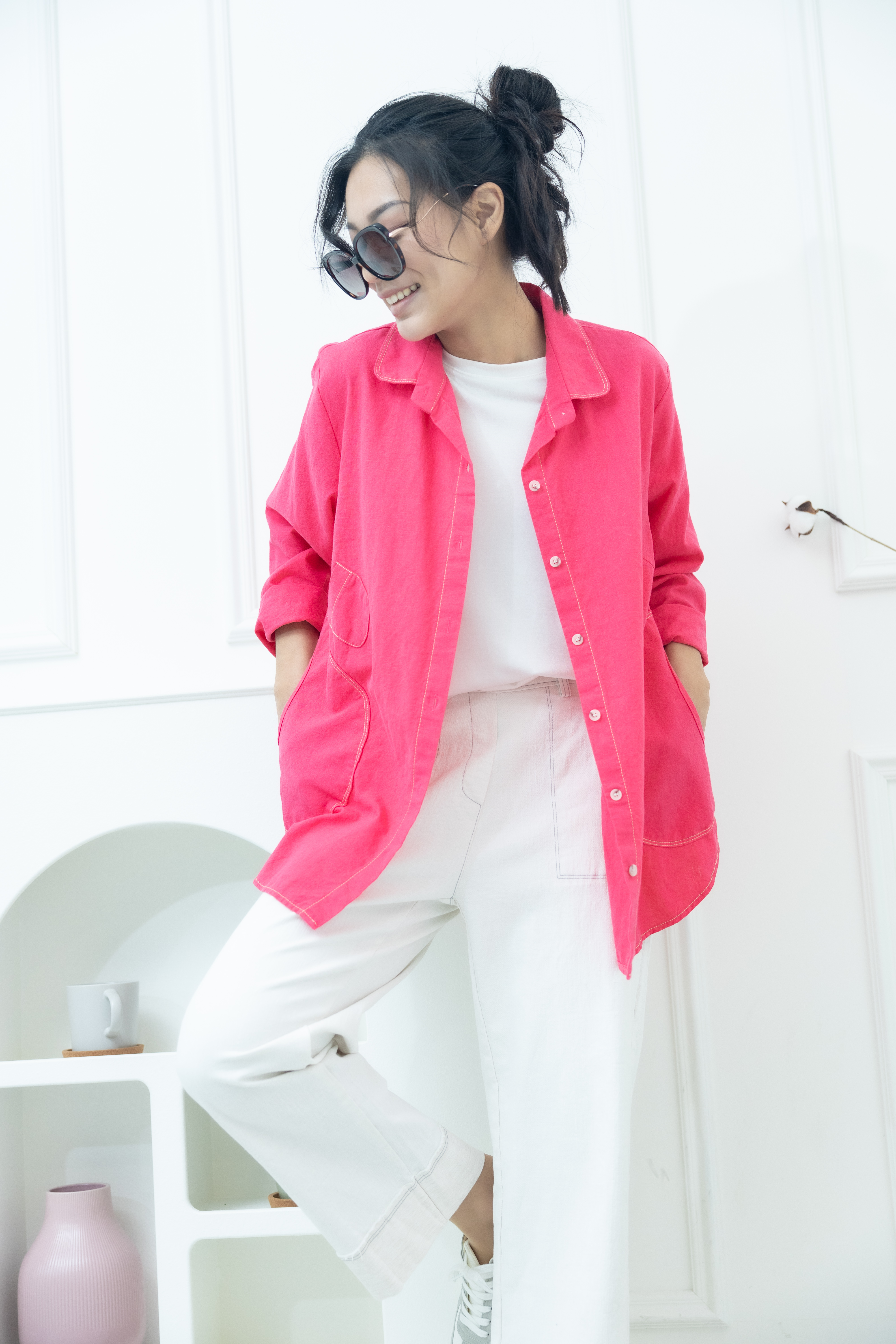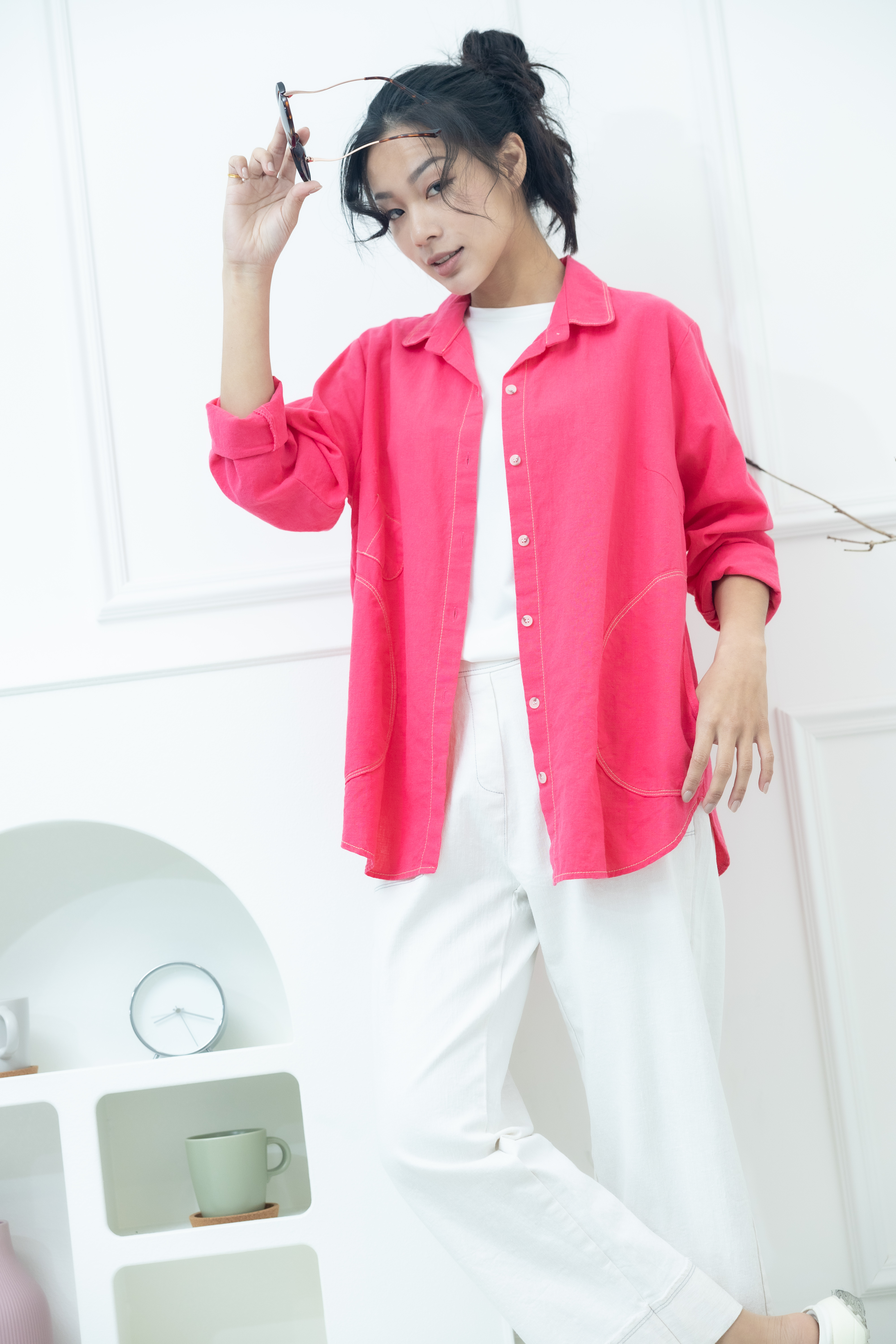 셔츠 小裝飾口袋開襟棉襯衫 / 艷粉色